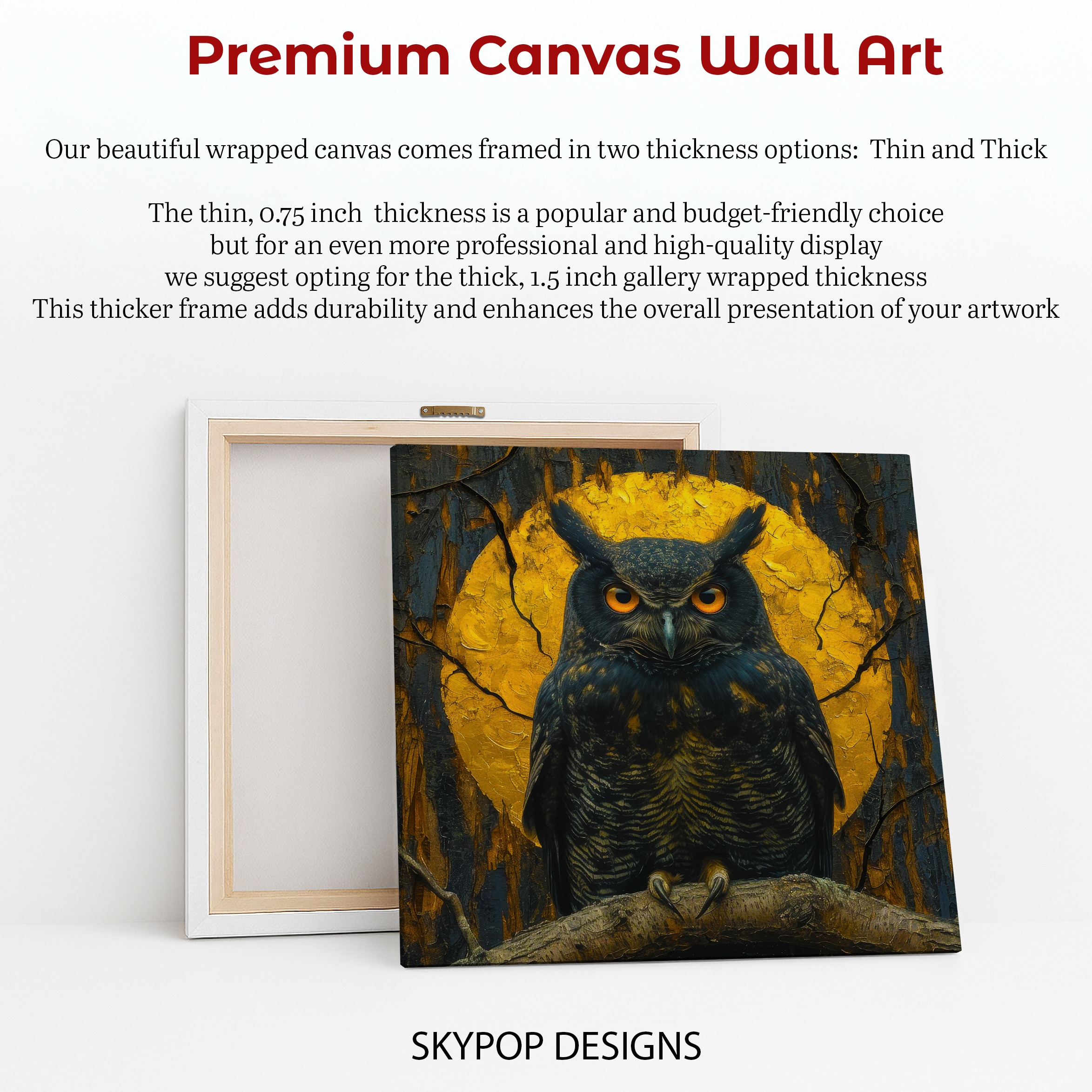 Transform your living room with this stunning owl canvas wall art featuring a majestic owl against a golden moon backdrop. The striking contrast of gold and dark tones creates a captivating focal point that adds a touch of mystique to any space. This high-quality poster and canvas wall art showcase the intricate details of the owl’s feathers and piercing orange eyes, making it a true work of art. Ideal for modern, rustic, or bohemian decor styles, this versatile piece will elevate your bedroom, entryway, or office. The deep, rich colors evoke a sense of wisdom and tranquility, with the golden moon symbolizing aspiration and renewal. This eye-catching canvas art is perfect for nature lovers and those seeking unique wall decor, making it an ideal gift for housewarmings or birthdays. Experience the beauty of nature captured in this exquisite piece, a statement artwork that sparks conversation and enhances your home’s atmosphere. Add a touch of the wild and a hint of magic to your interiors with this captivating owl poster. Elevate your walls with this unique owl artwork, a must-have for any art collector or admirer of exceptional wildlife art. This canvas wall art is a perfect way to bring the serene beauty of the night sky into your home, creating a dramatic yet sophisticated look. Discover the perfect blend of artistry and nature with this beautiful owl canvas wall art.