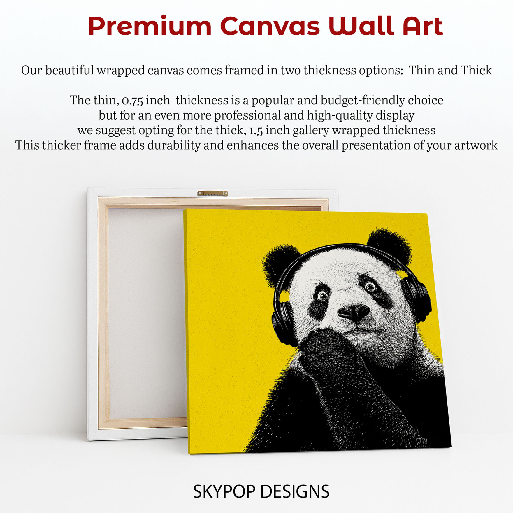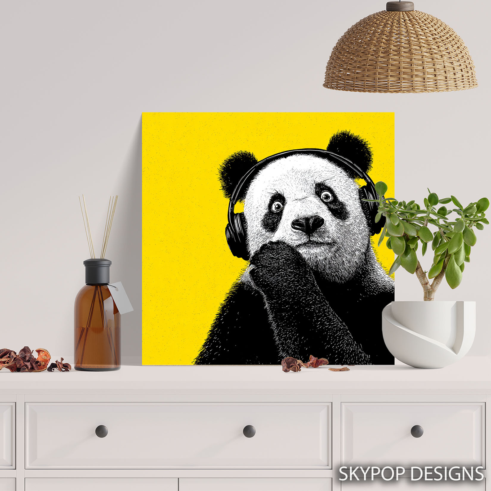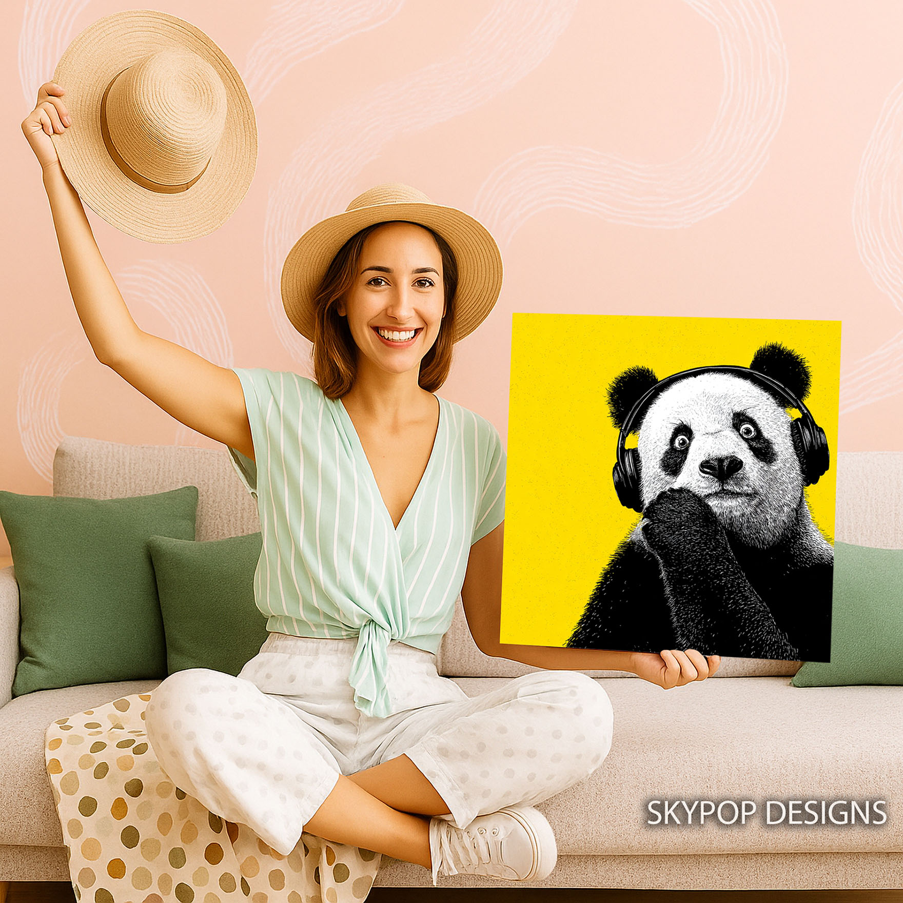 Transform your audio sanctuary with this vibrant panda canvas wall art, featuring a cool panda grooving to music with stylish headphones. This eye-catching poster or canvas wall art is perfect for modern living rooms or as a statement piece in your home office or game room. The bold combination of yellow, black, and white creates a striking visual impact, while the detailed linework of the panda adds a touch of contemporary artistry. Ideal for bohemian decor enthusiasts or lovers of pop art, this piece brings energy and personality to any space. The thoughtful pose and expression on the panda’s face evoke a sense of cool contemplation and musical enjoyment, making it an engaging conversation starter. This high-quality canvas wall art captures every nuanced stroke, from the texture of the panda’s fur to the modern design of the headphones. Its versatility allows it to enhance children’s rooms with a playful touch or add a unique flair to a music lover’s den. This poster or canvas wall art makes a fantastic gift for birthdays, holidays, or housewarmings, celebrating individuality and passion for music. Elevate your home decor with this unique animal art that seamlessly blends urban street art influences with timeless panda charm. Bring joy and a vibrant splash of color into your environment with this inspiring piece of wall art that’s sure to turn heads. Make your space a reflection of your personality and love for music today with Panda Beats Art.