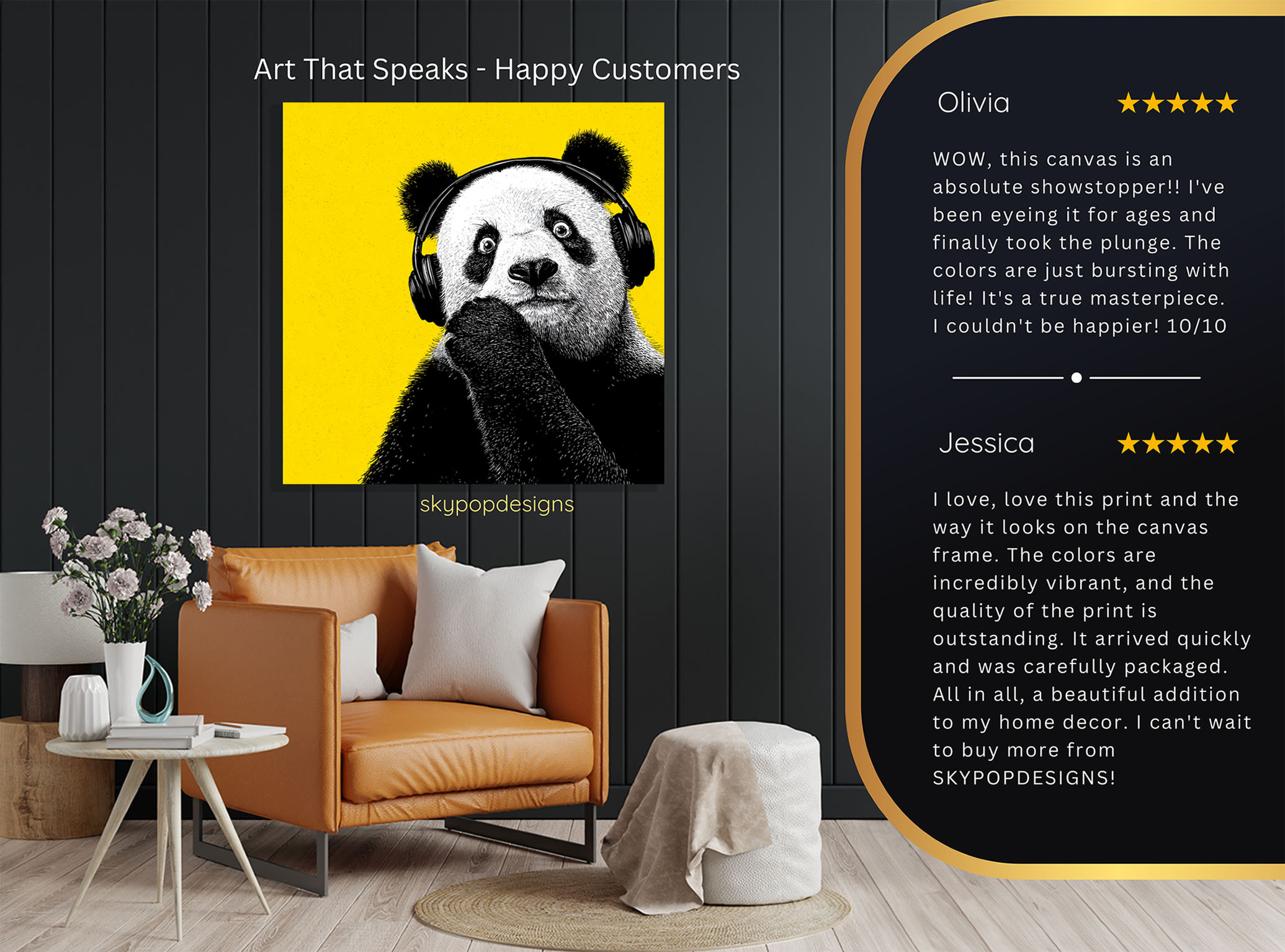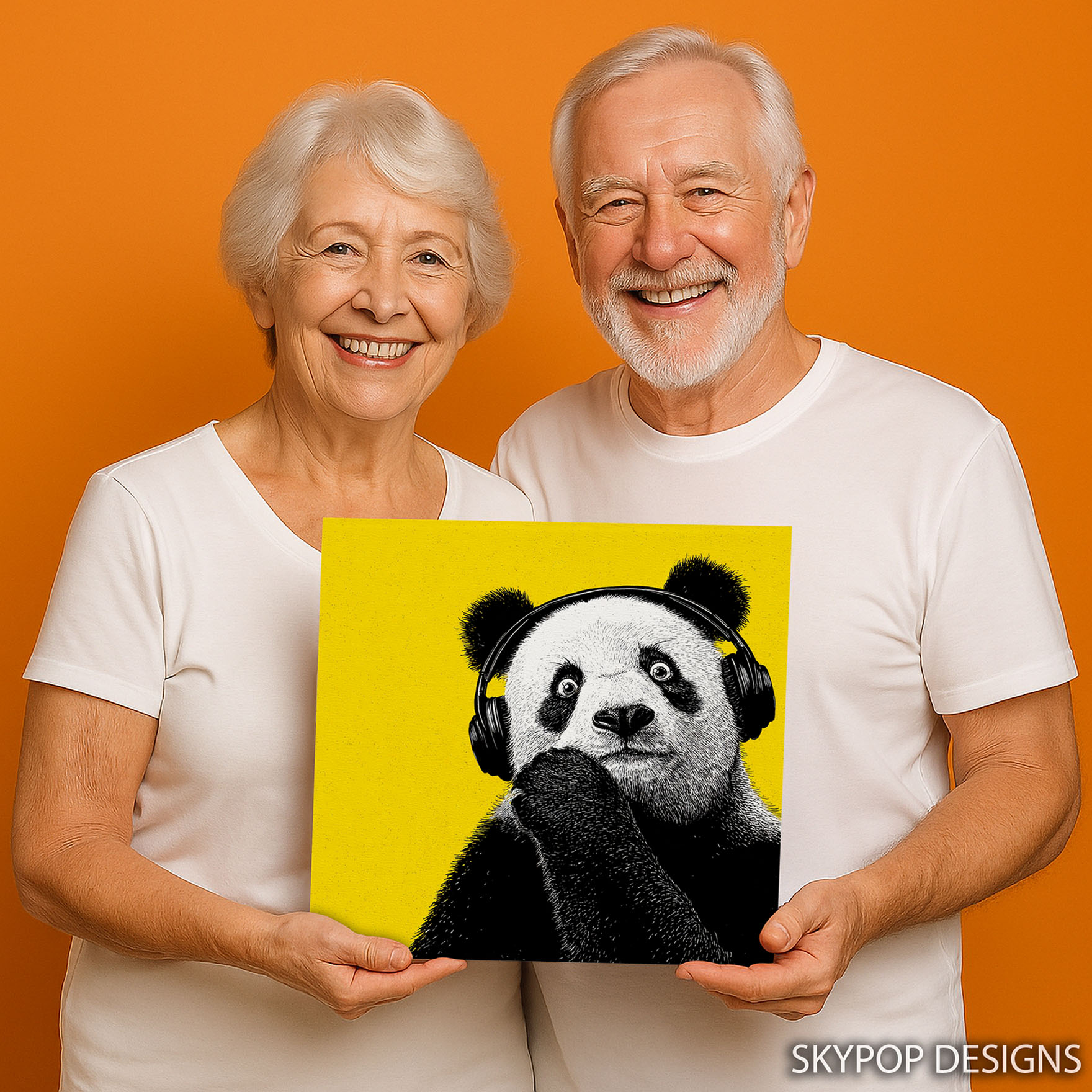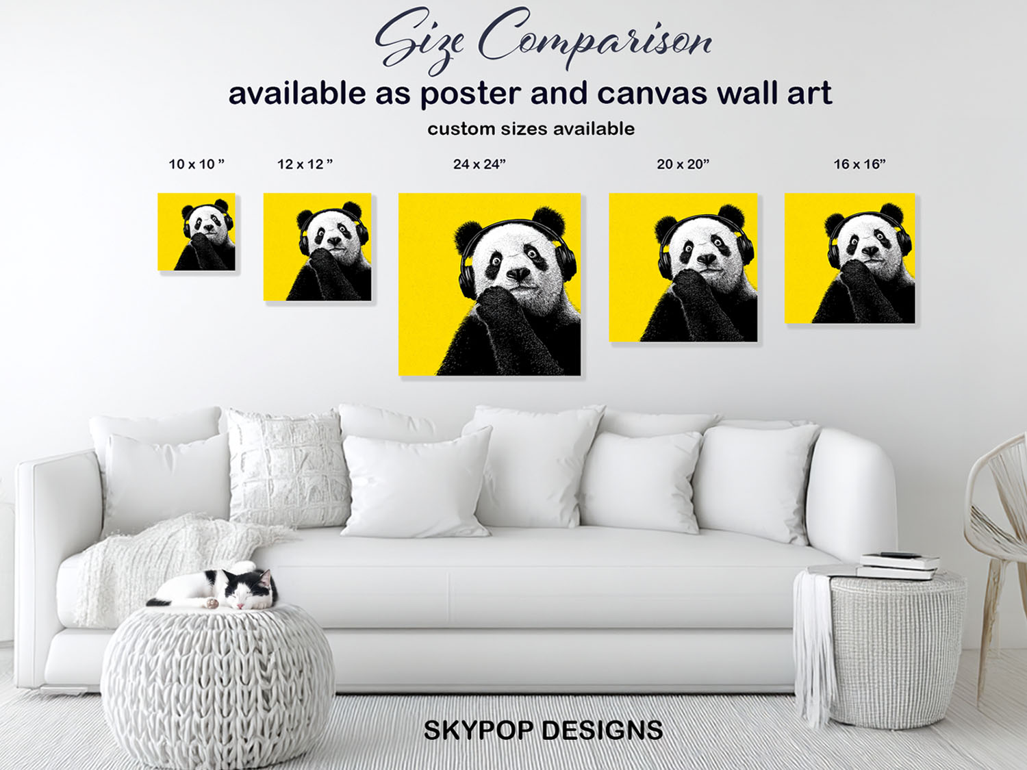 Transform your audio sanctuary with this vibrant panda canvas wall art, featuring a cool panda grooving to music with stylish headphones. This eye-catching poster or canvas wall art is perfect for modern living rooms or as a statement piece in your home office or game room. The bold combination of yellow, black, and white creates a striking visual impact, while the detailed linework of the panda adds a touch of contemporary artistry. Ideal for bohemian decor enthusiasts or lovers of pop art, this piece brings energy and personality to any space. The thoughtful pose and expression on the panda’s face evoke a sense of cool contemplation and musical enjoyment, making it an engaging conversation starter. This high-quality canvas wall art captures every nuanced stroke, from the texture of the panda’s fur to the modern design of the headphones. Its versatility allows it to enhance children’s rooms with a playful touch or add a unique flair to a music lover’s den. This poster or canvas wall art makes a fantastic gift for birthdays, holidays, or housewarmings, celebrating individuality and passion for music. Elevate your home decor with this unique animal art that seamlessly blends urban street art influences with timeless panda charm. Bring joy and a vibrant splash of color into your environment with this inspiring piece of wall art that’s sure to turn heads. Make your space a reflection of your personality and love for music today with Panda Beats Art.
