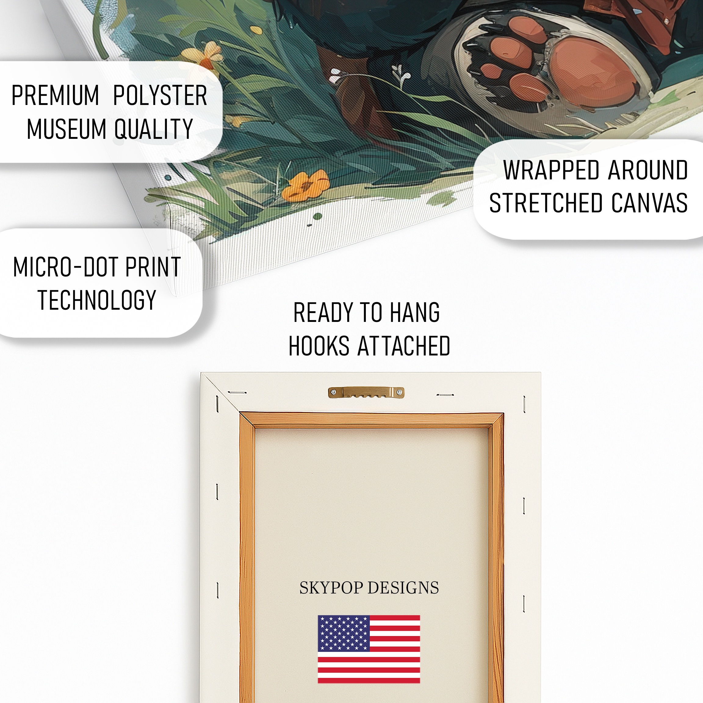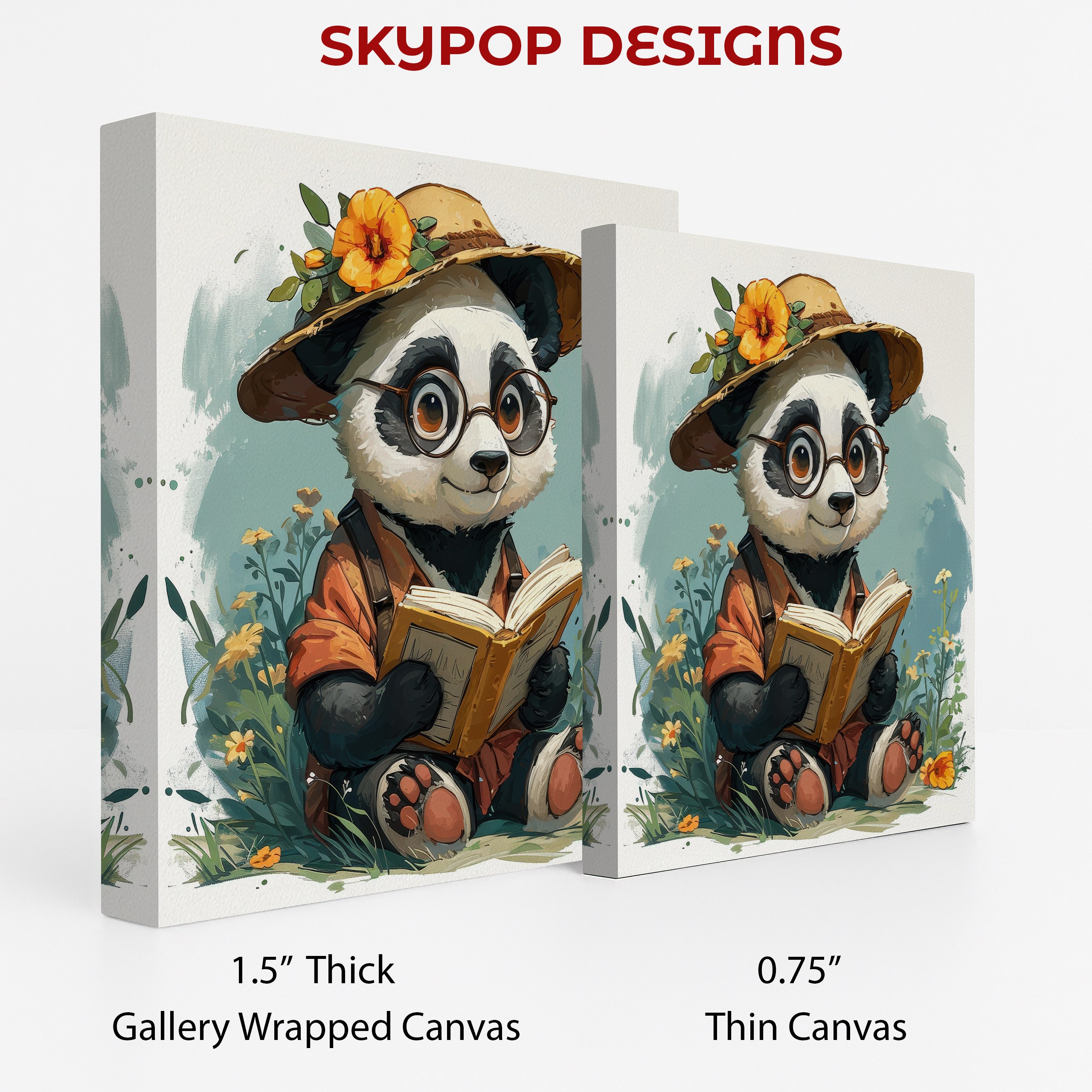 Keywords: Panda art, Animal wall art, Canvas print, Whimsical decor, Nature art, Children’s room decor, Living room art, Bedroom art, Nursery decor, Bohemian style, Country decor, Farmhouse style, Yellow flowers, Green accents, Brown details, Multicolor art, Panda reading, Gift for readers, Birthday gift, Housewarming gift, Holiday gift, Wall decor, Home decor, Art print, Canvas wall art, Panda poster, Bee art, Storytelling art, Relaxing art, Imaginative art