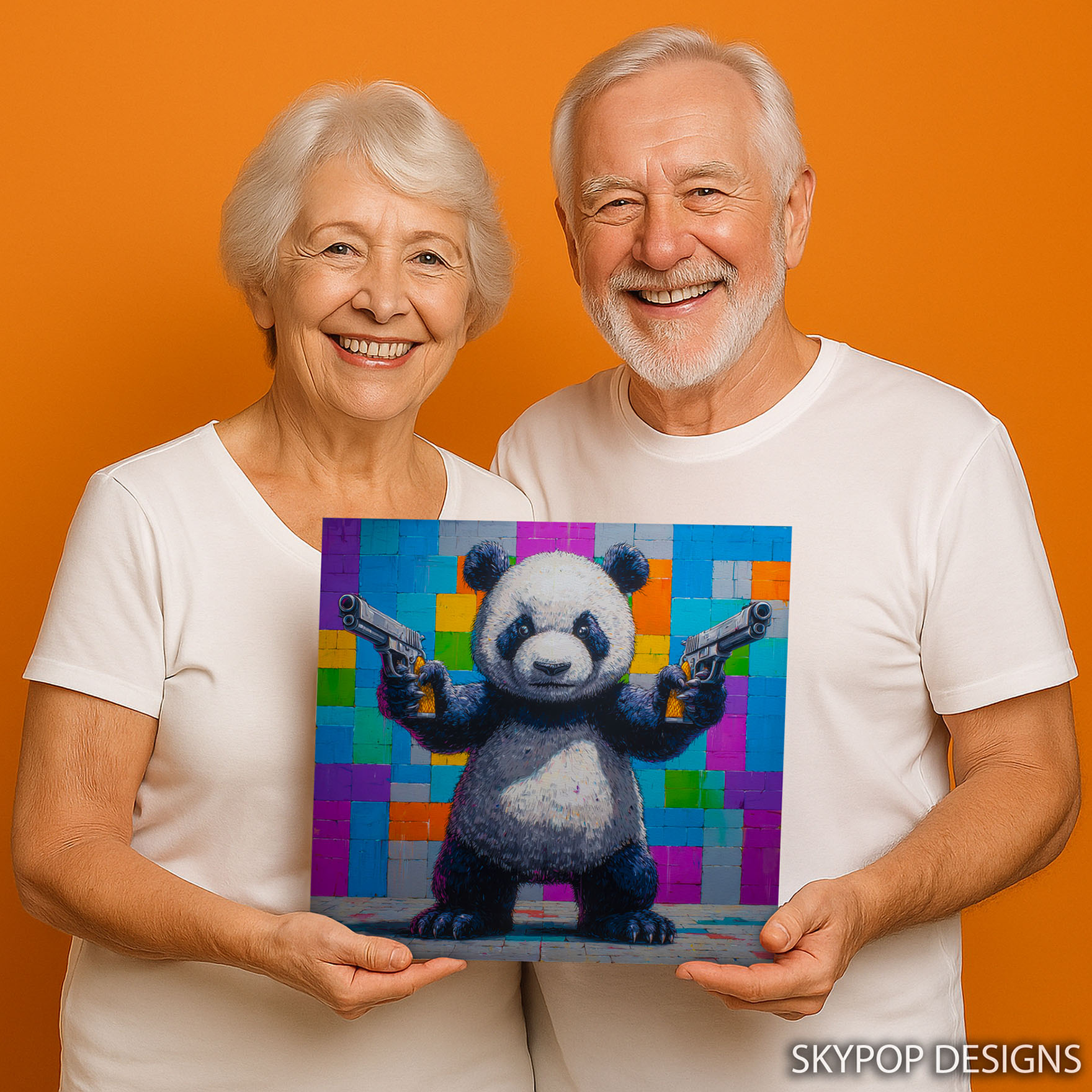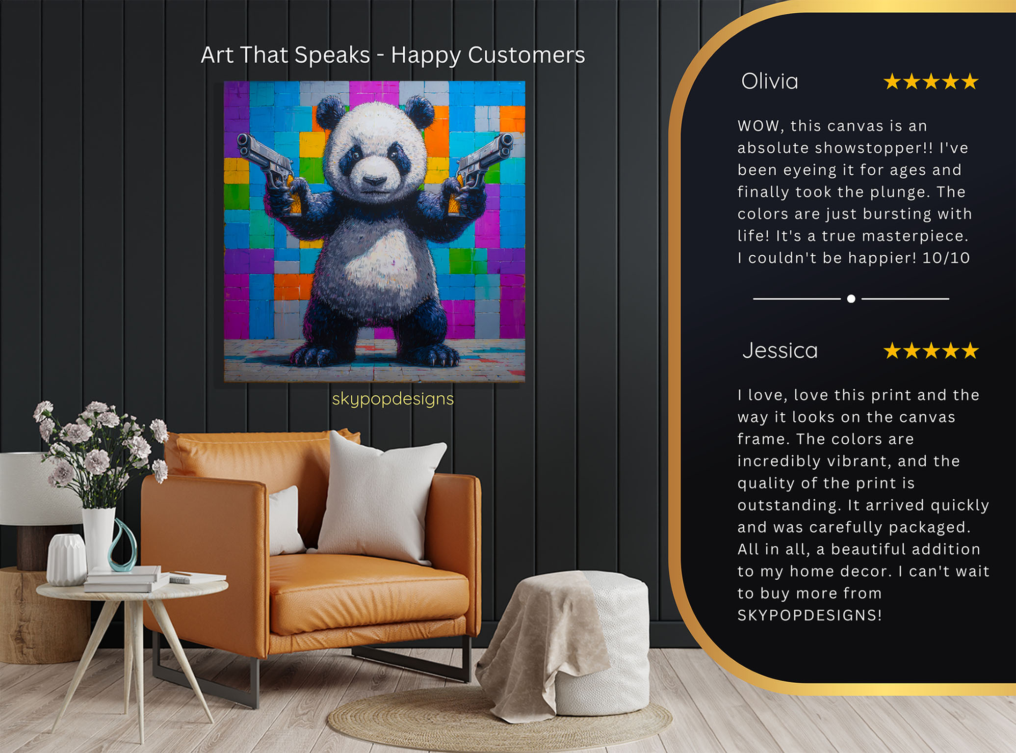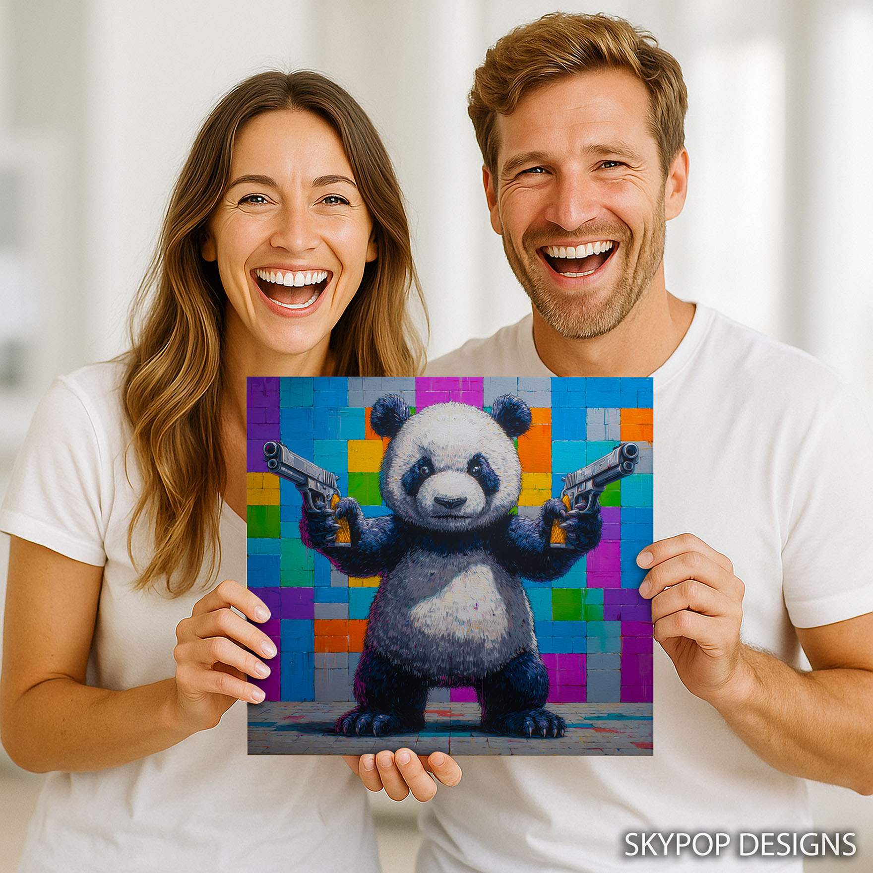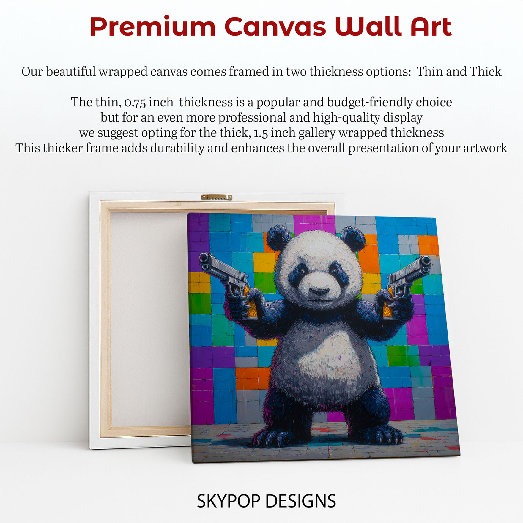 Unleash your walls incredible energy with this dynamic Panda canvas wall art. This vibrant poster or canvas wall art features a cool panda armed with dual handguns against a graffiti-inspired, multi-colored brick background, blending street art with pop culture. The striking juxtaposition of the adorable panda and unexpected intensity makes this a captivating statement piece. Perfect for modern living rooms, game rooms, or offices, this artwork injects personality and edgy flair into your decor. The bold multicolor palette, featuring intense blues, yellows, and oranges, demands attention and sparks conversation. Ideal for bohemian spaces seeking an unconventional touch or contemporary homes desiring unique wall decor. This high-quality canvas print showcases intricate details and vibrant colors, bringing the street art aesthetic directly into your home. It is perfect for adding a playful yet powerful vibe to any space, serving as a fantastic gift for birthdays or housewarming occasions. Elevate your interior design with this unique panda artwork that celebrates urban art and bold character. This versatile poster or canvas wall art is sure to be a focal point and a conversation starter. Transform your environment with this commanding piece and embrace its spirit of unconventional strength. Add this stunning panda canvas wall art to your collection and make a statement today.