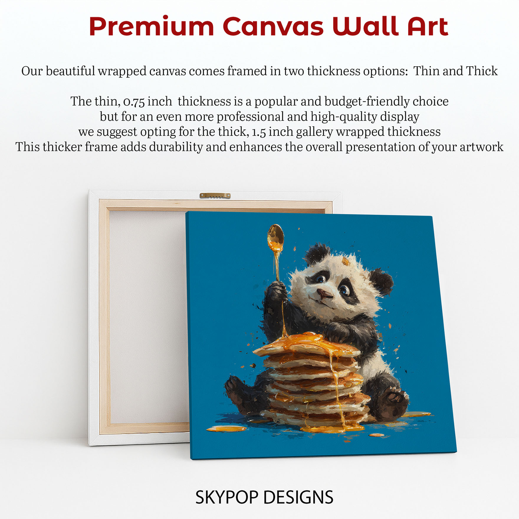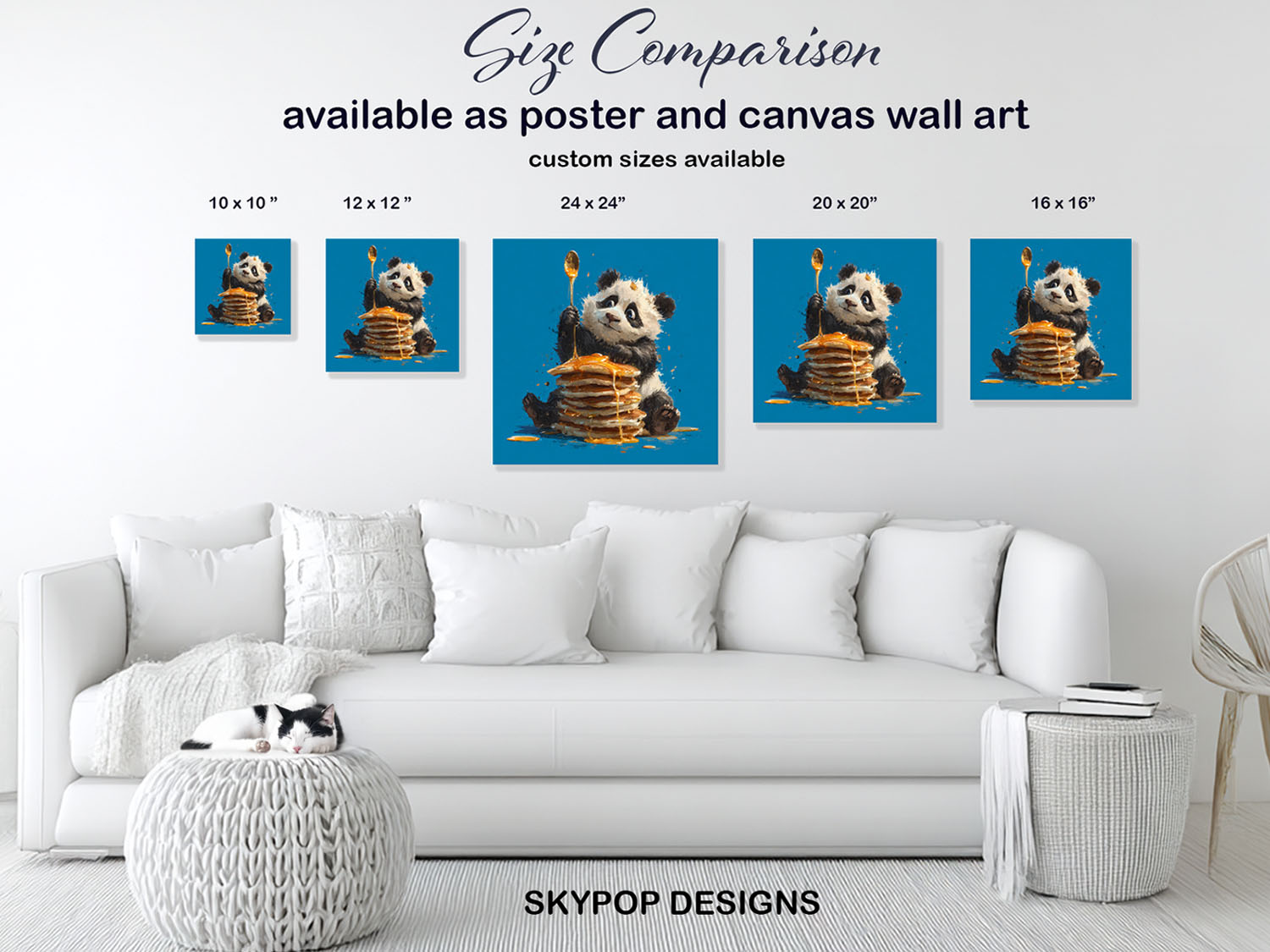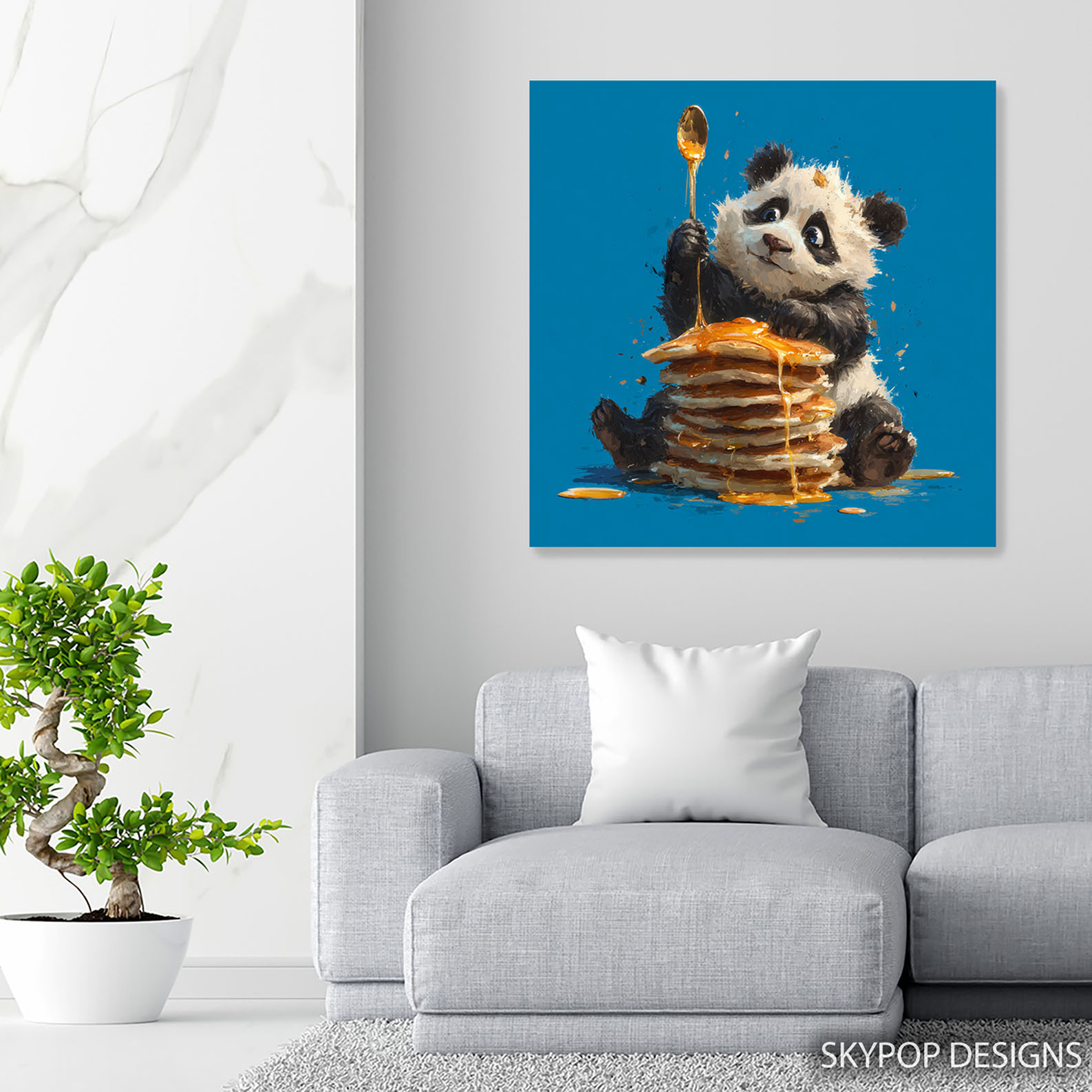 Transform your space with this adorable panda canvas wall art, perfect for adding a touch of sweetness and joy to any room. This charming poster features a playful panda enjoying a stack of golden pancakes drizzled with honey, creating a delightful focal point that will brighten your home. The vibrant colors and whimsical style make this pancake panda artwork ideal for modern living rooms, cheerful children’s rooms, or even a cozy kitchen nook. This canvas wall art is perfect for bohemian decor lovers looking to add a unique and heartwarming piece to their collection. The rich honey tones against the panda’s classic black and white fur and the vibrant blue background evoke feelings of happiness and indulgence. High-quality printing ensures every fluffy detail of the panda and every glossy drop of honey is captured with stunning clarity. This versatile wall art is great for gifting on birthdays, housewarmings, or holidays, bringing smiles to friends and family. Whether you choose it as a poster or a canvas wall art, it’s designed to elevate your home decor with its undeniable charm. Celebrate the simple joys of life with this captivating panda artwork that inspires warmth and happiness. Add this sweet and engaging piece to your wall art collection and bring a dose of playful delight into your everyday life. Elevate your interiors with this eye-catching panda and pancakes canvas art today.