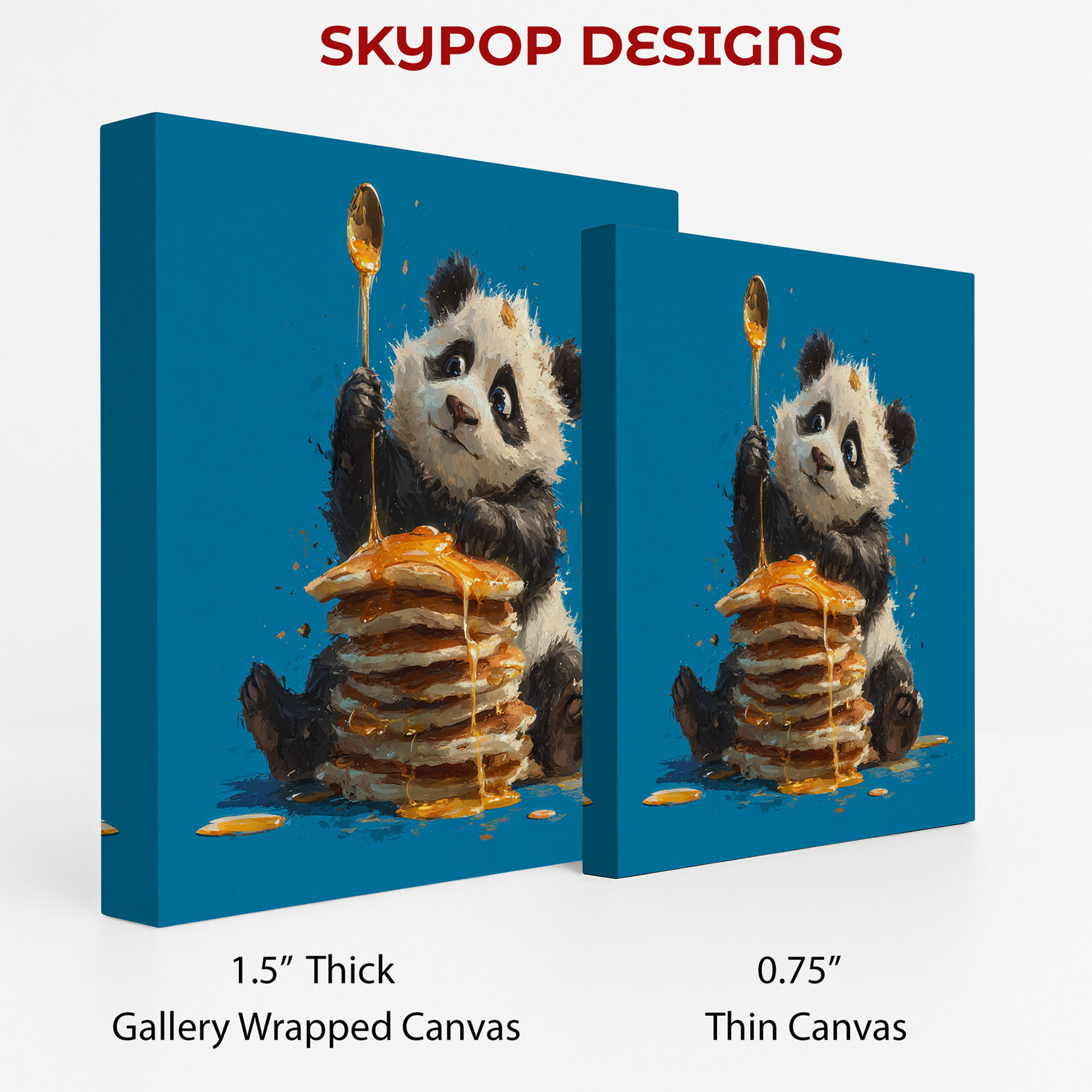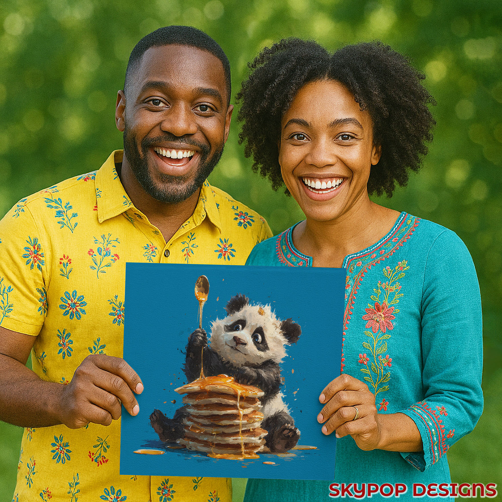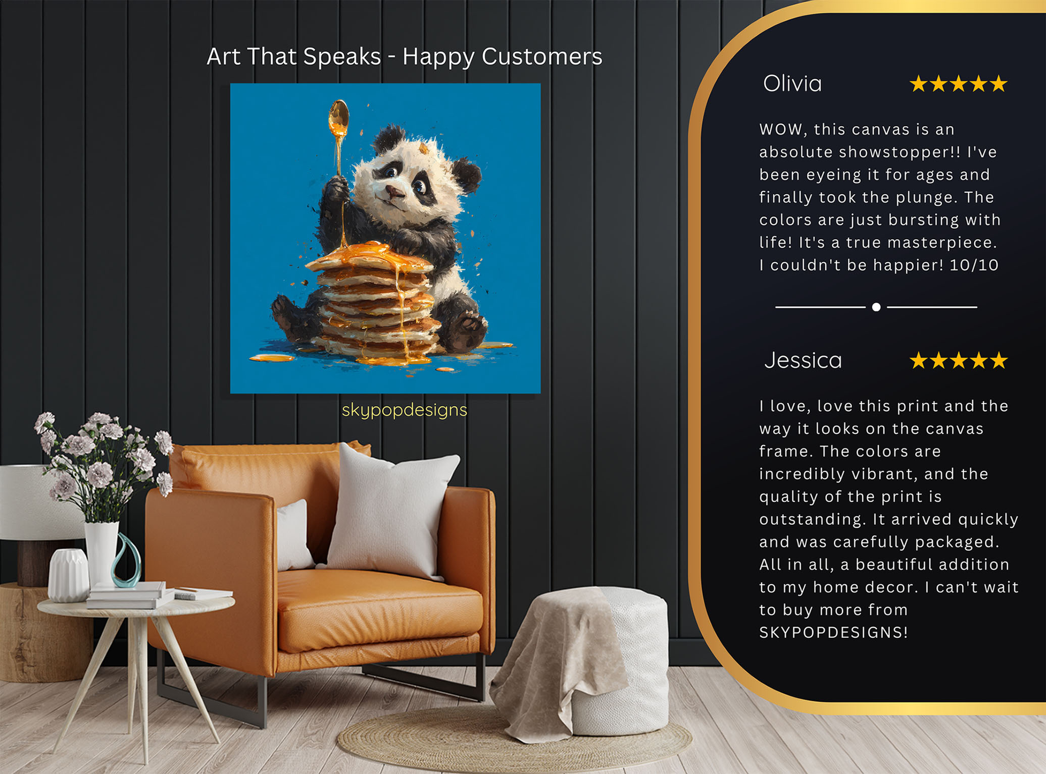 Transform your space with this adorable panda canvas wall art, perfect for adding a touch of sweetness and joy to any room. This charming poster features a playful panda enjoying a stack of golden pancakes drizzled with honey, creating a delightful focal point that will brighten your home. The vibrant colors and whimsical style make this pancake panda artwork ideal for modern living rooms, cheerful children’s rooms, or even a cozy kitchen nook. This canvas wall art is perfect for bohemian decor lovers looking to add a unique and heartwarming piece to their collection. The rich honey tones against the panda’s classic black and white fur and the vibrant blue background evoke feelings of happiness and indulgence. High-quality printing ensures every fluffy detail of the panda and every glossy drop of honey is captured with stunning clarity. This versatile wall art is great for gifting on birthdays, housewarmings, or holidays, bringing smiles to friends and family. Whether you choose it as a poster or a canvas wall art, it’s designed to elevate your home decor with its undeniable charm. Celebrate the simple joys of life with this captivating panda artwork that inspires warmth and happiness. Add this sweet and engaging piece to your wall art collection and bring a dose of playful delight into your everyday life. Elevate your interiors with this eye-catching panda and pancakes canvas art today.