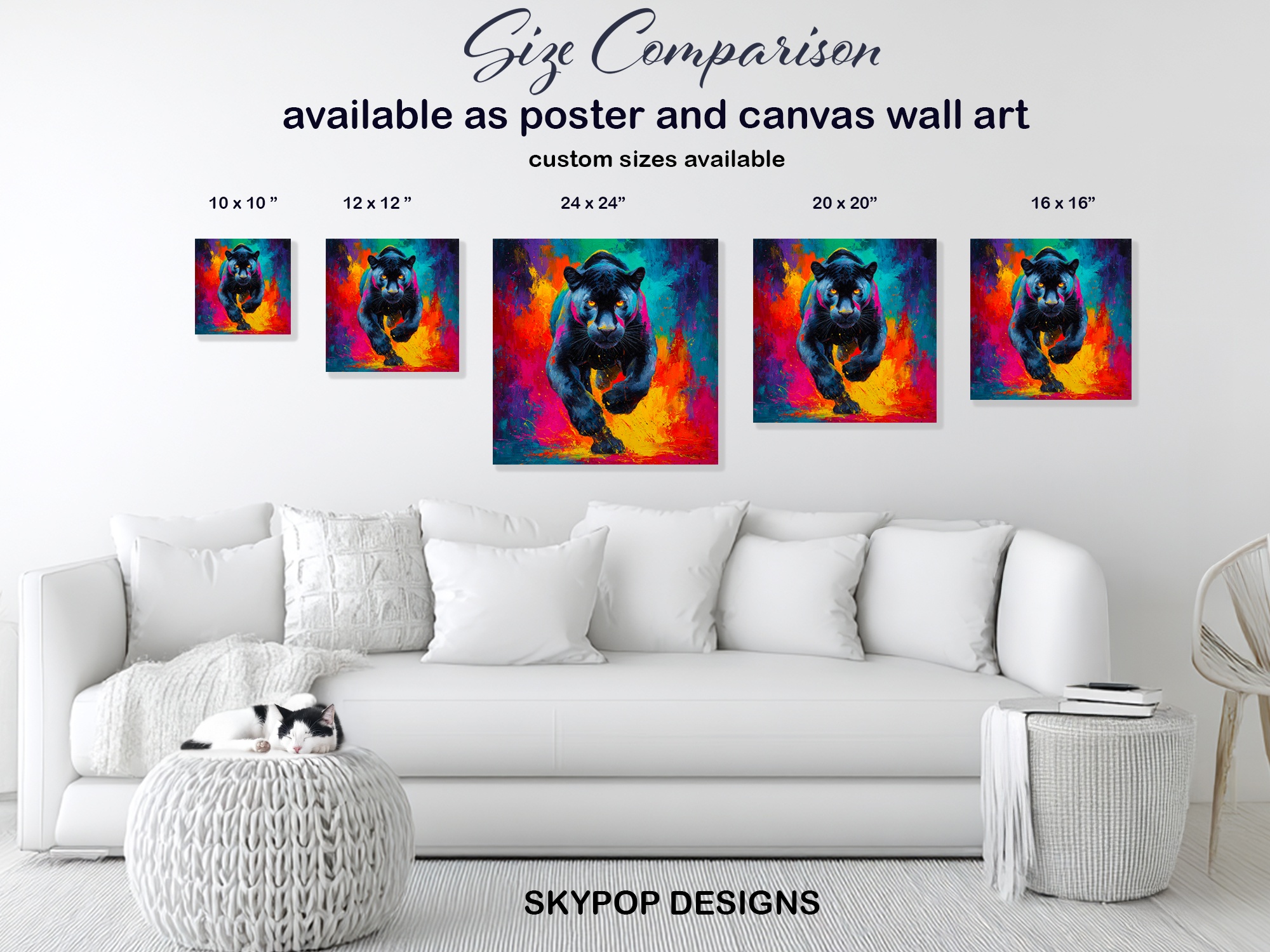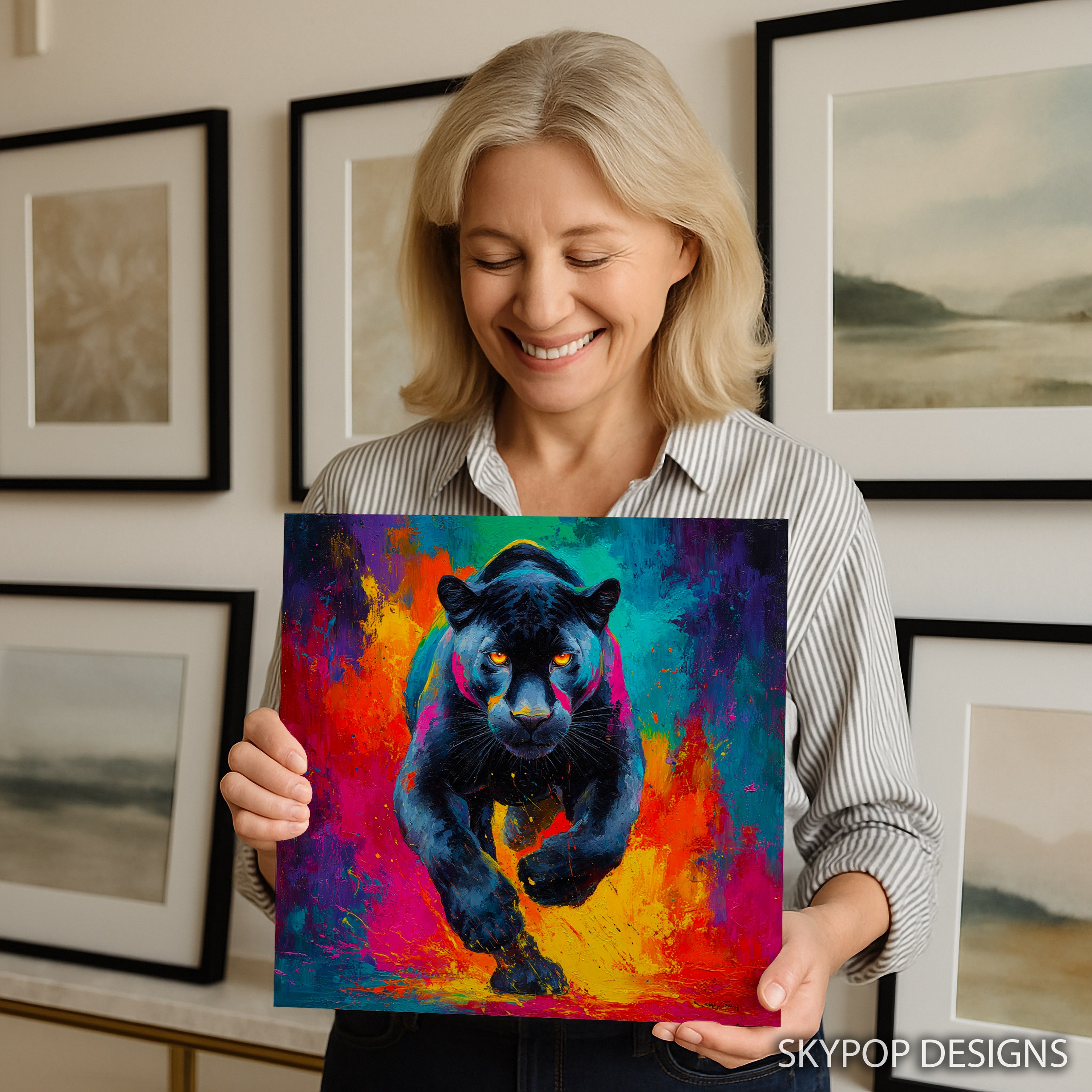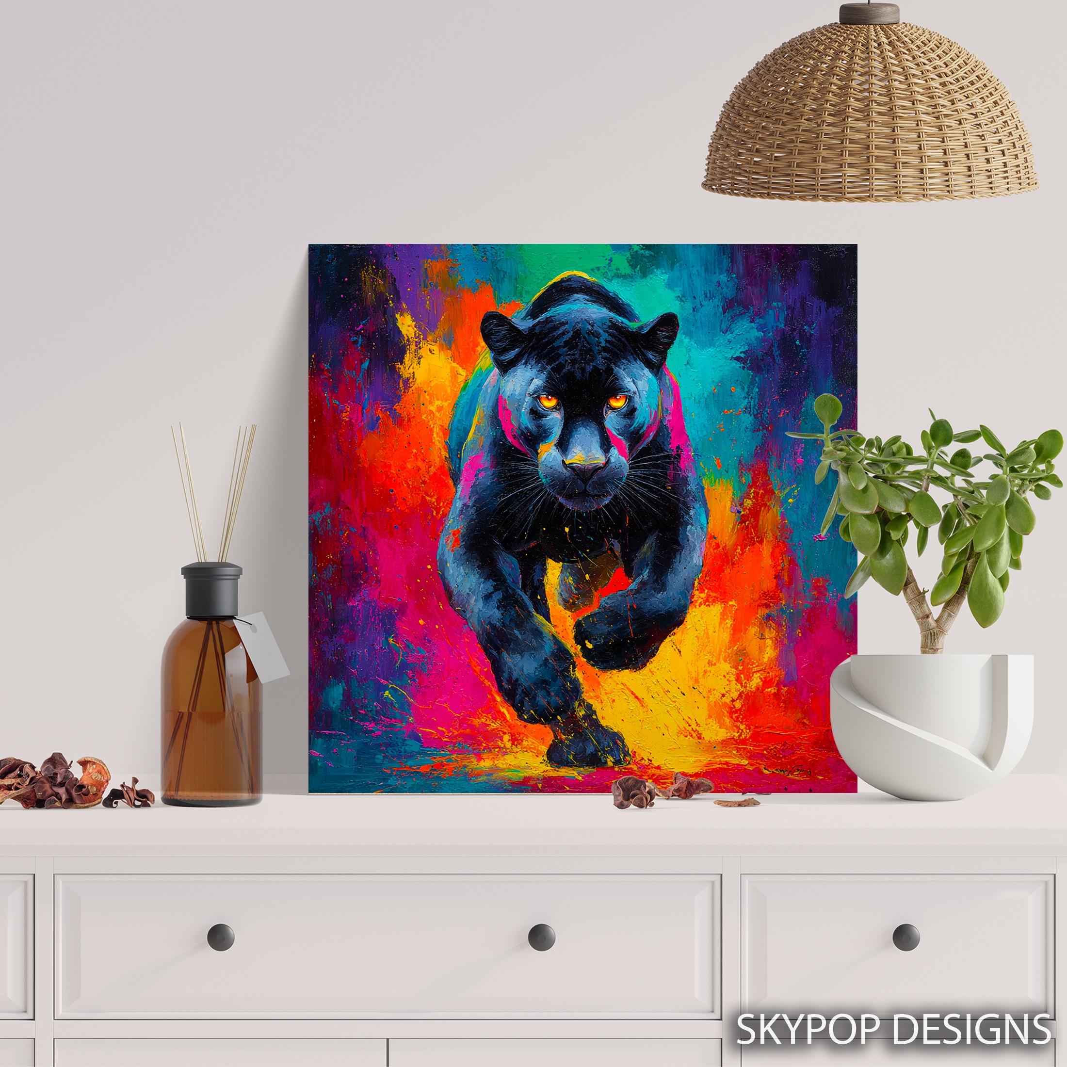 Transform your space with this striking panther canvas wall art that commands attention with its bold colors and dynamic composition. This vibrant poster or canvas print features a powerful black panther set against an explosion of vivid hues, perfect for adding a modern pop of color to any room. The intense gaze of the panther, with its glowing yellow eyes, creates an immediate focal point that draws viewers in and sparks conversation. Ideal for contemporary living rooms or eclectic bedrooms, this piece seamlessly blends animal art with abstract elements, making it a versatile addition to various decor styles. The contrasting palette of deep blacks and electric blues, pinks, and oranges evokes a sense of energy and movement, instantly elevating the mood of your space. Whether you’re looking to make a bold statement in your home office or add a touch of the wild to your game room, this panther wall art delivers impact and style. The high-quality printing captures every brushstroke and color splash, ensuring the artwork remains stunning from every angle. Gift this eye-catching piece to art enthusiasts or animal lovers for birthdays or housewarmings. Available in multiple sizes, this canvas art adapts to different wall spaces, from cozy corners to grand feature walls. Embrace the spirit of the wild and the vibrancy of contemporary design with this captivating panther artwork. Elevate your interior decor today with this unforgettable blend of nature and artistic expression.