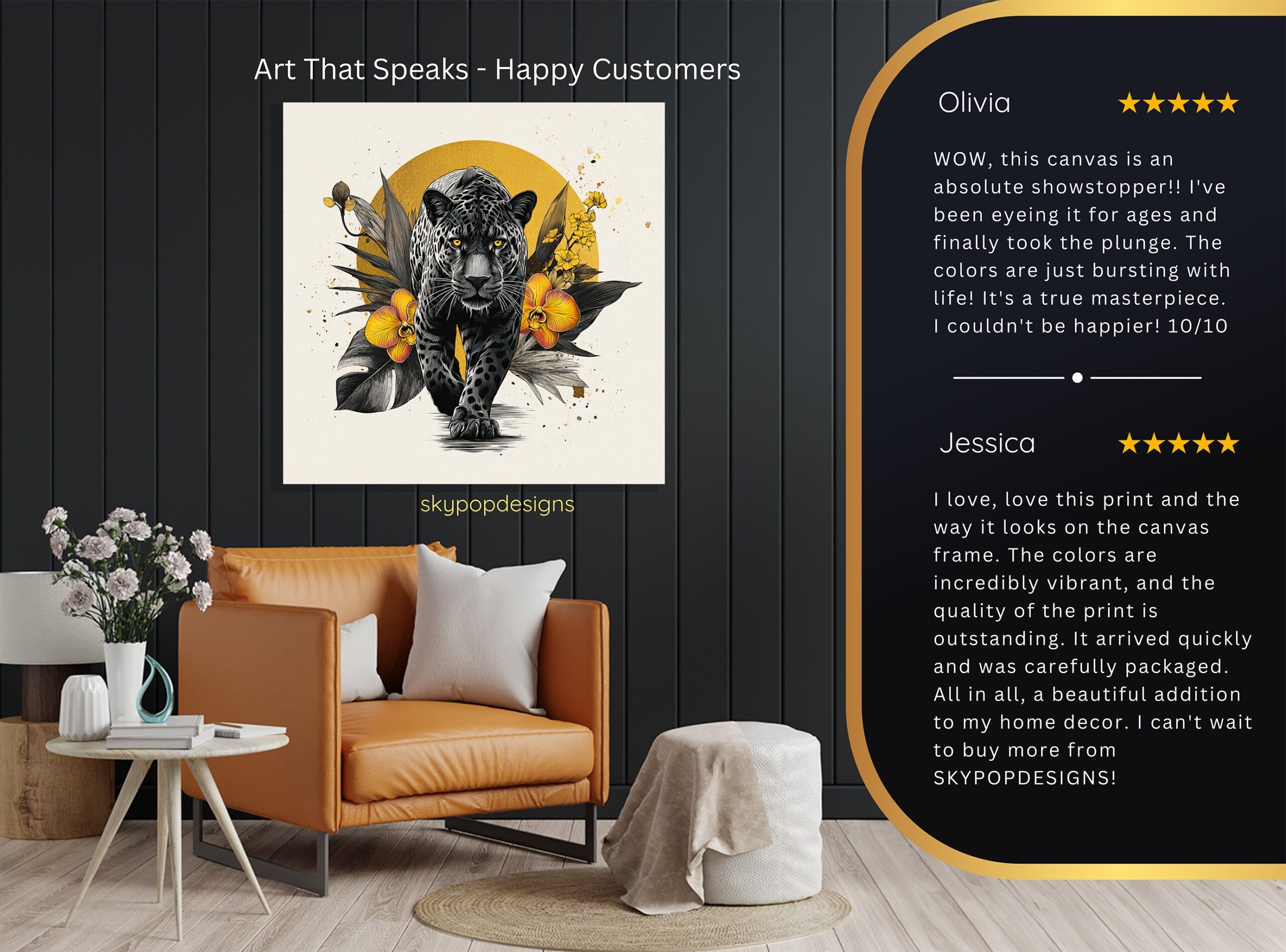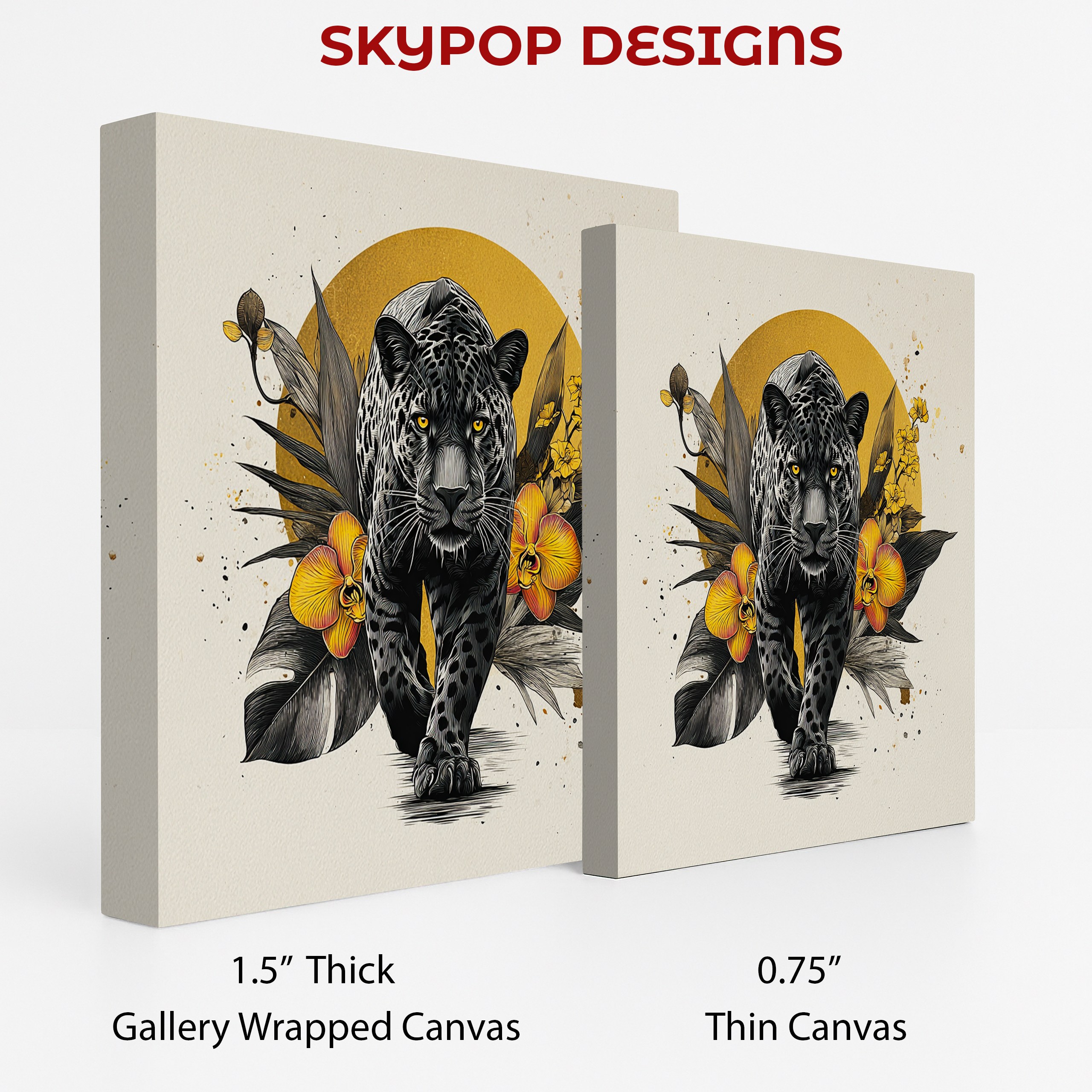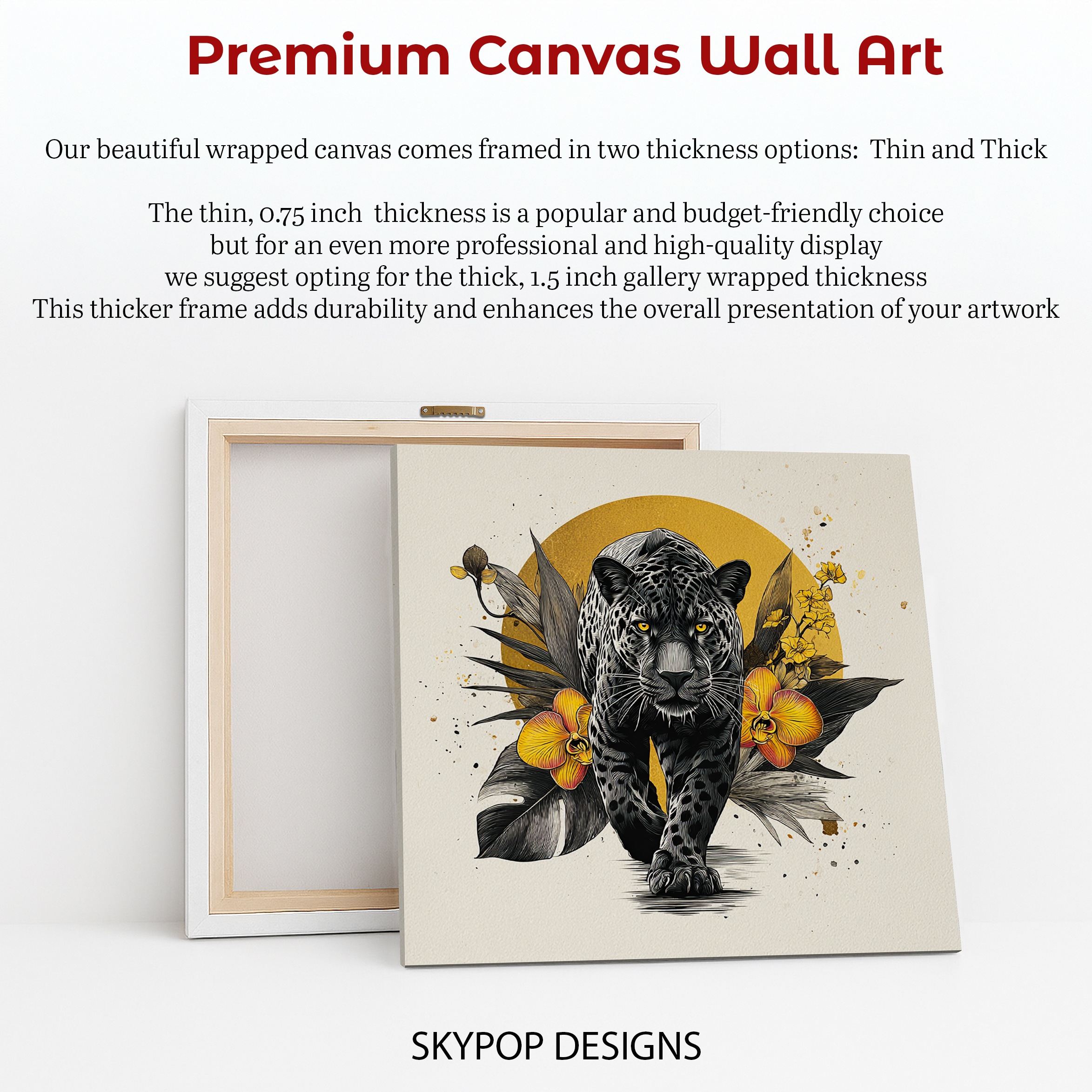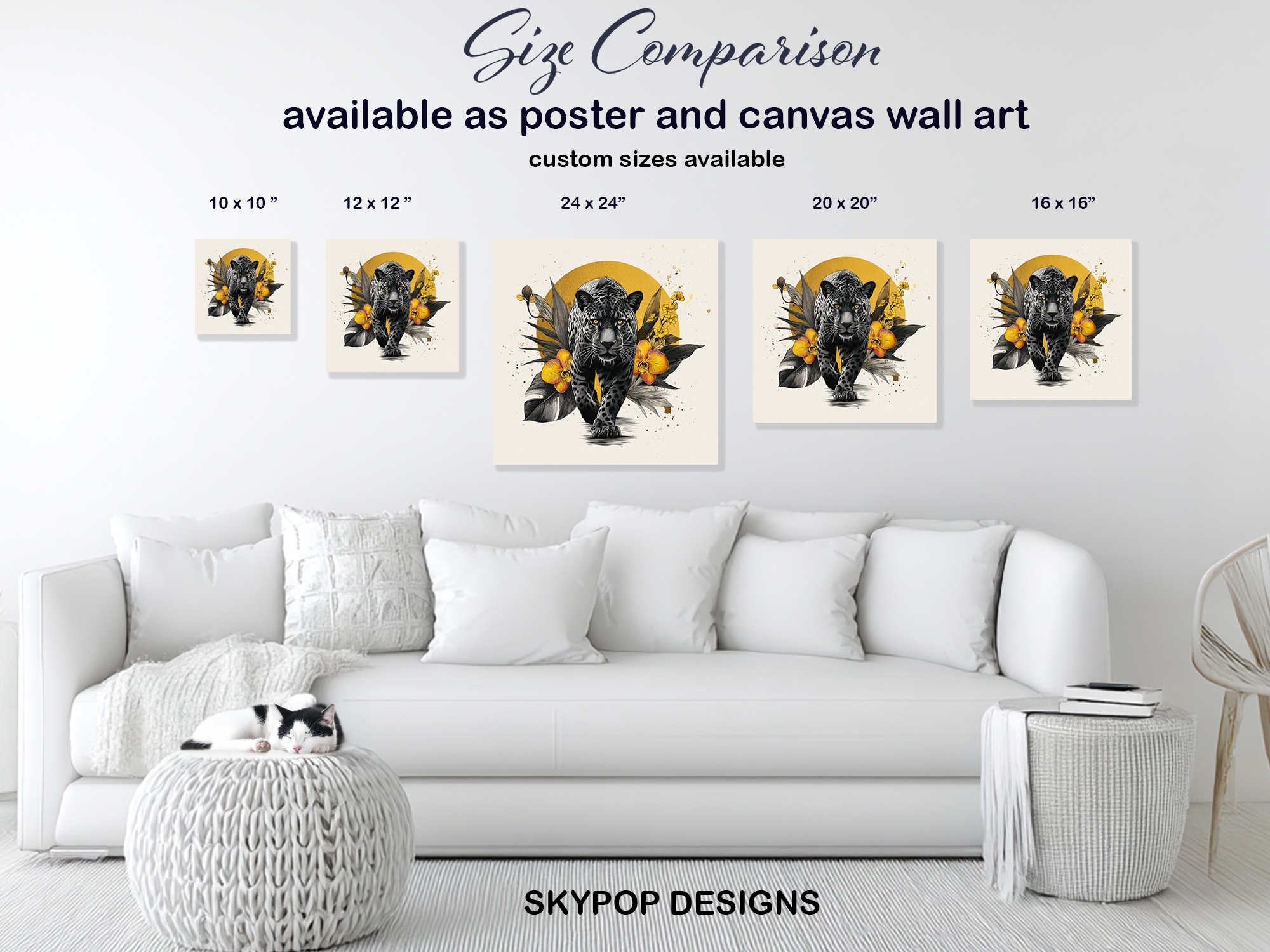 Bring the wild beauty of the jungle into your home with this striking panther canvas wall art. This captivating piece showcases a majestic black panther emerging from lush tropical foliage, set against a vibrant golden sun backdrop. Perfect for modern living room wall decor or as a bold statement in a bohemian bedroom, this poster transforms any space with its powerful presence. The panther’s piercing yellow eyes draw you in, while the contrasting orange orchids add a pop of exotic color. Ideal for nature lovers and those who appreciate contemporary animal art, this canvas celebrates the raw power and grace of big cats. The intricate details of the panther’s fur and the surrounding leaves create a textured, lifelike effect that brings depth to your walls. Whether you’re looking to create a tropical-inspired office or add a touch of the wild to your dining room, this versatile piece adapts beautifully to various decor styles. The high-quality printing ensures every detail shines, from the delicate flower petals to the panther’s muscular form. Make a lasting impression on guests and elevate your home’s ambiance with this stunning blend of nature and artistry. Transform your space today with this eye-catching panther wall art that’s sure to become the focal point of any room.