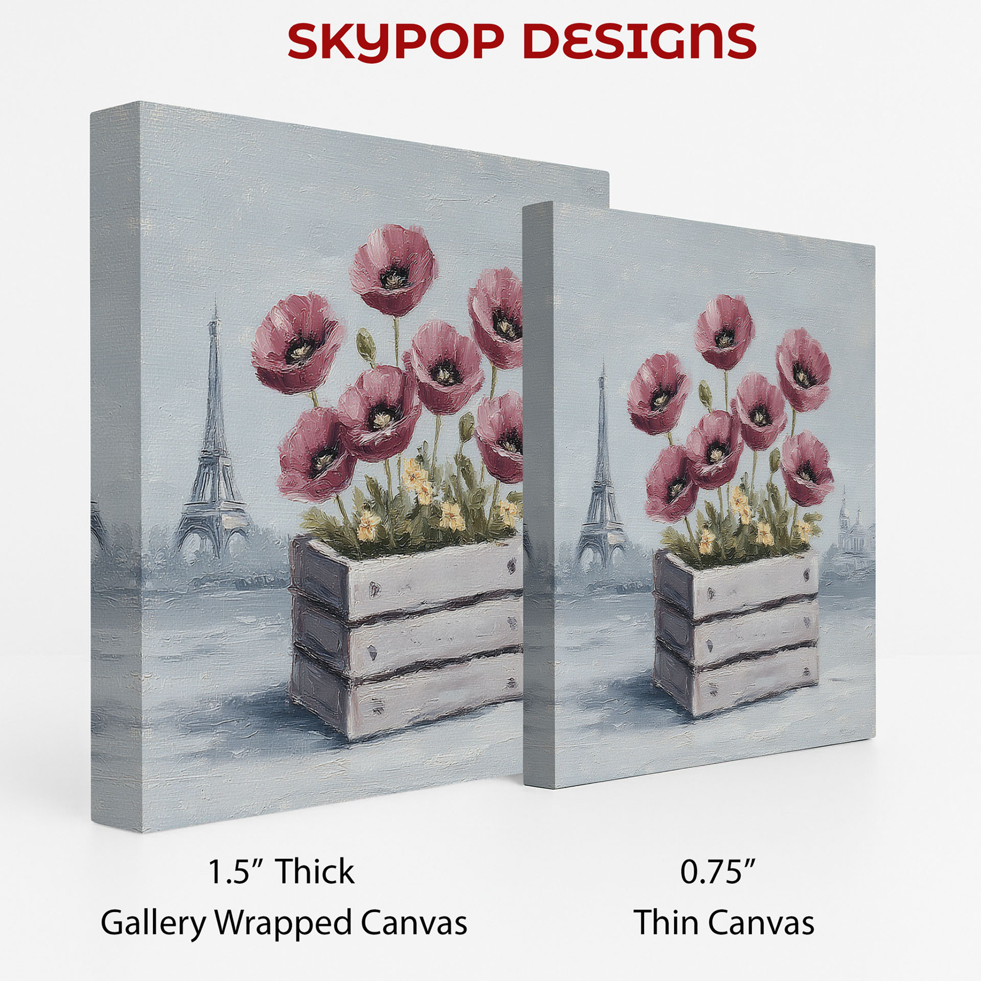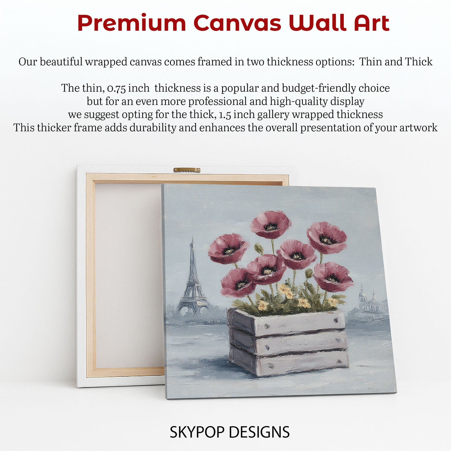 Capture the charm of Paris with this beautiful poppy canvas wall art, showcasing vibrant pink poppies in full bloom with the iconic Eiffel Tower in the background.