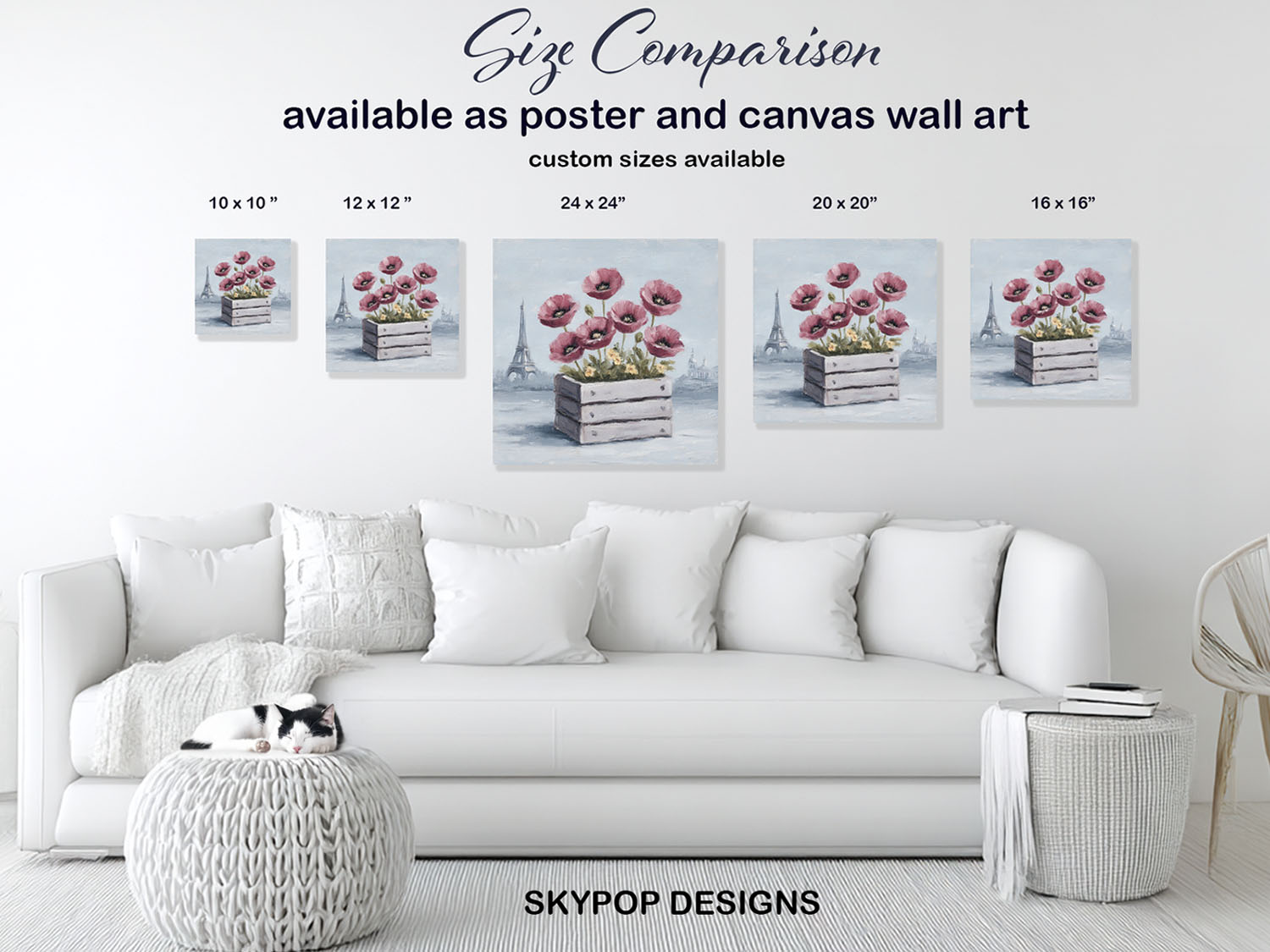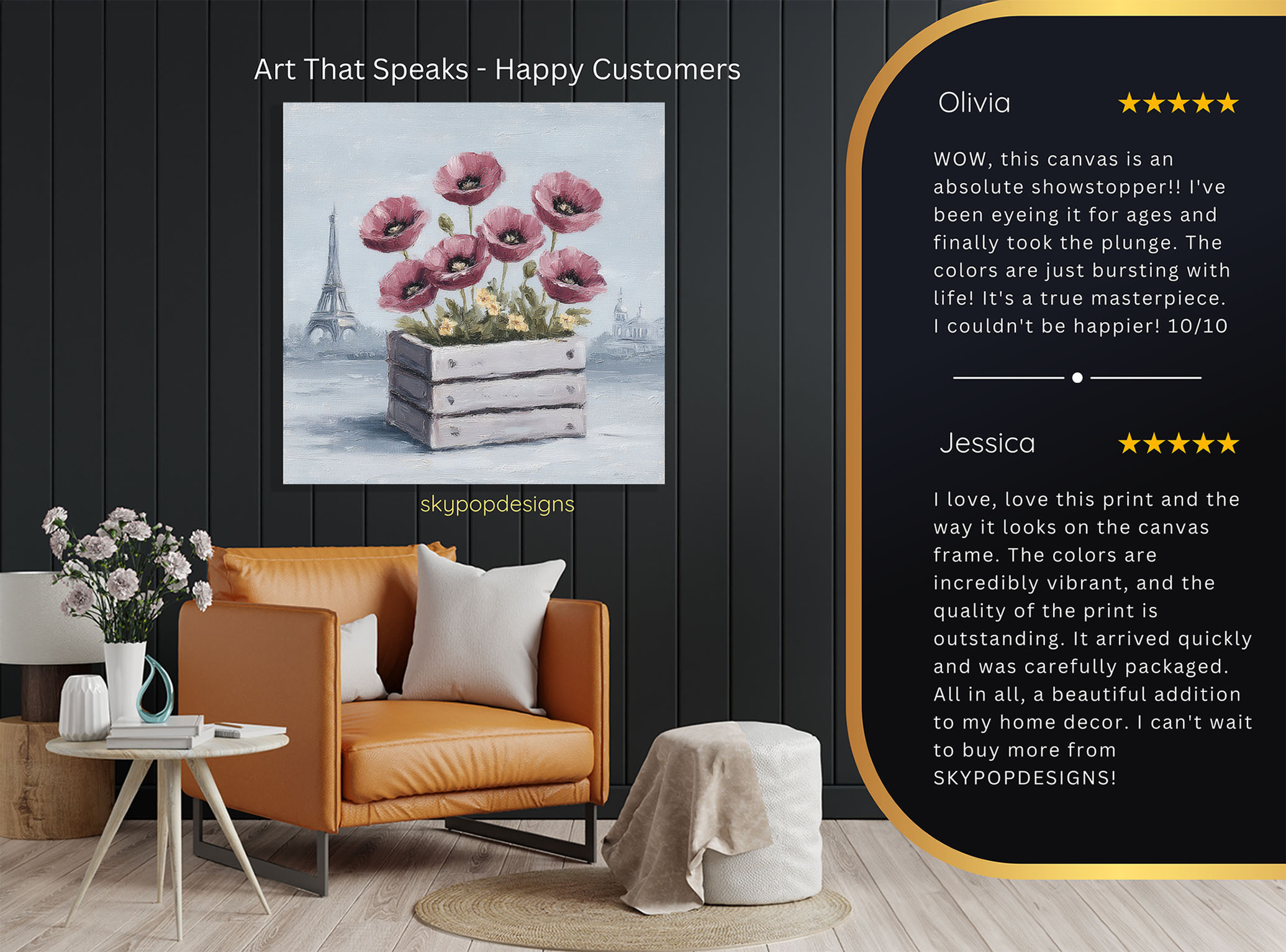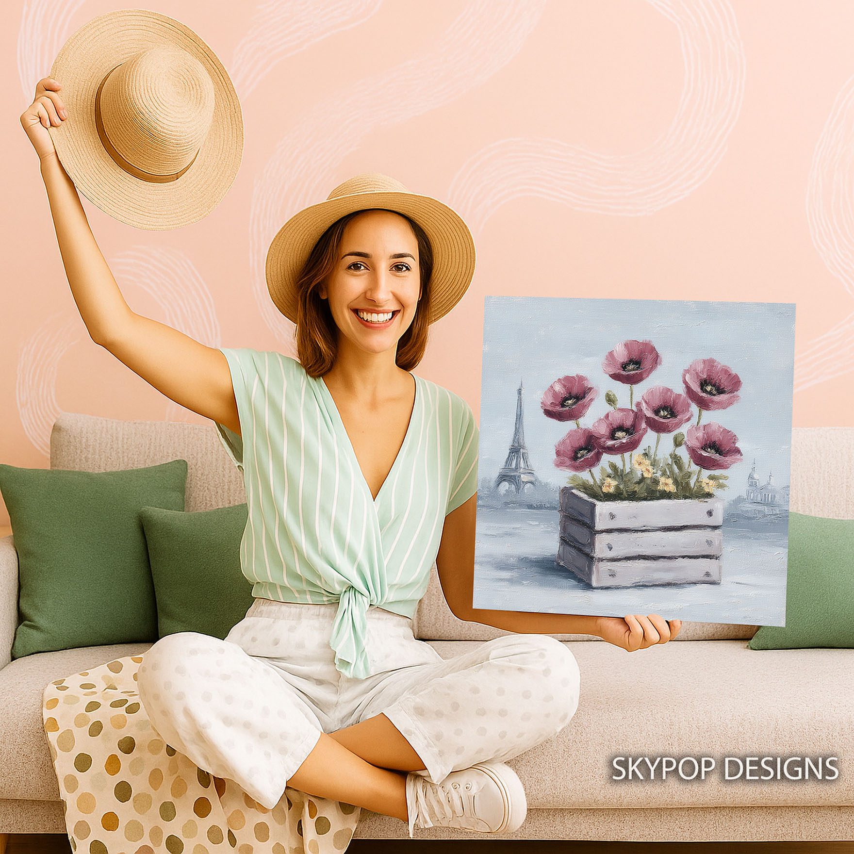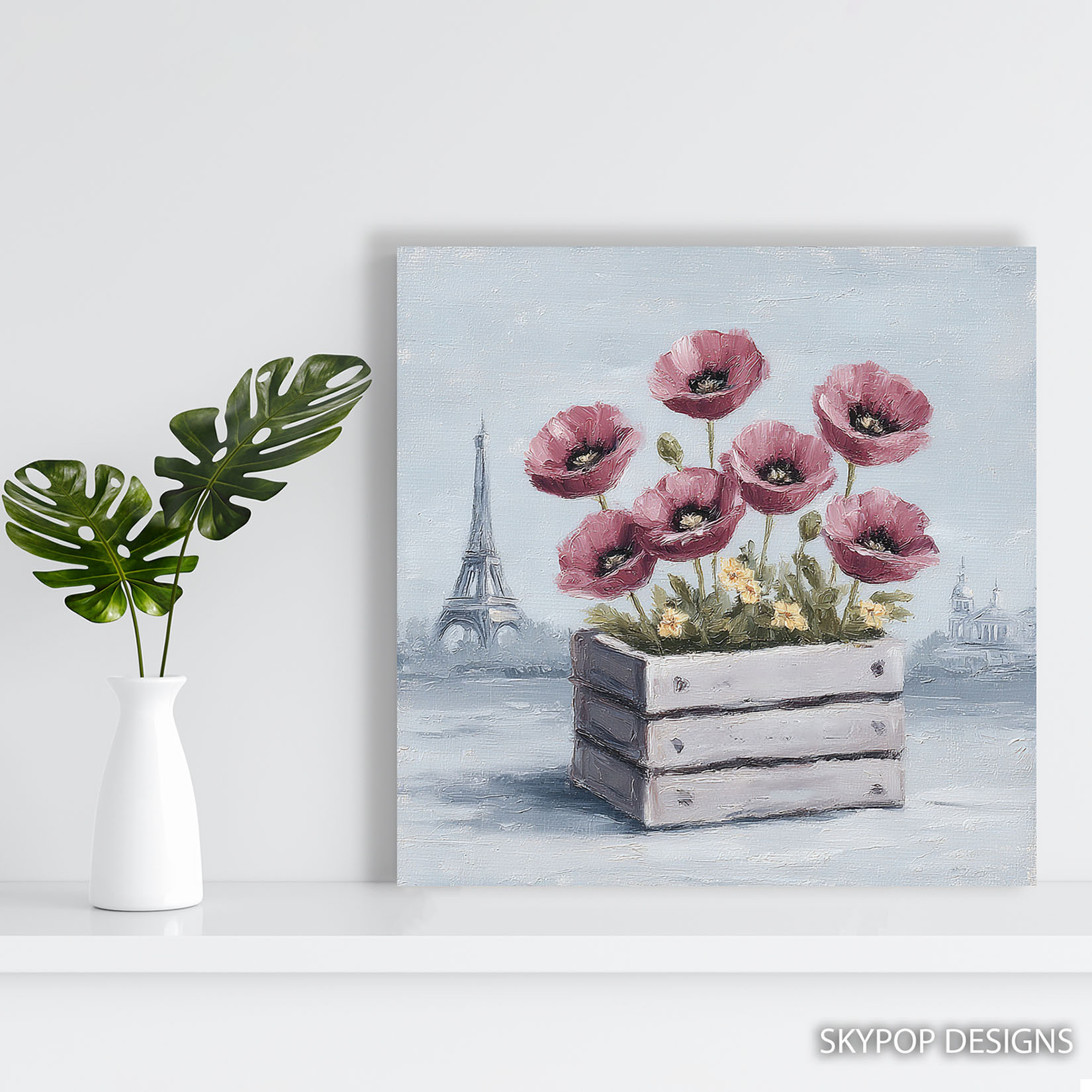 Capture the charm of Paris with this beautiful poppy canvas wall art, showcasing vibrant pink poppies in full bloom with the iconic Eiffel Tower in the background. This poster or canvas wall art instantly transports you to a Parisian scene, perfect for adding a touch of romantic elegance to your living room decor. The impressionistic style and soft color palette of pink, green, and grey create a captivating and serene atmosphere, ideal for a tranquil bedroom or an inviting entryway. This floral artwork is perfect for French Country and bohemian decor styles, bringing a rustic yet sophisticated charm to any space. The detailed brushstrokes give depth to the poppies and the distant Parisian landmarks, making this canvas wall art a stunning focal point. Whether displayed in a dining room for a delightful ambiance or as a statement piece in your living room, this poster brings sophistication and beauty. High-quality printing ensures every petal and distant architectural detail is rendered with precision, making this wall art a treasured addition. This versatile artwork serves as an ideal housewarming gift or holiday present for anyone who loves Parisian aesthetics and timeless floral designs. Elevate your home with the romantic charm and artistic beauty of this Parisian Poppies canvas art. Transform your walls with this inspiring piece that celebrates the beauty of nature and the allure of Paris today. Your guests will be enchanted by this visually striking poster or canvas wall art.
