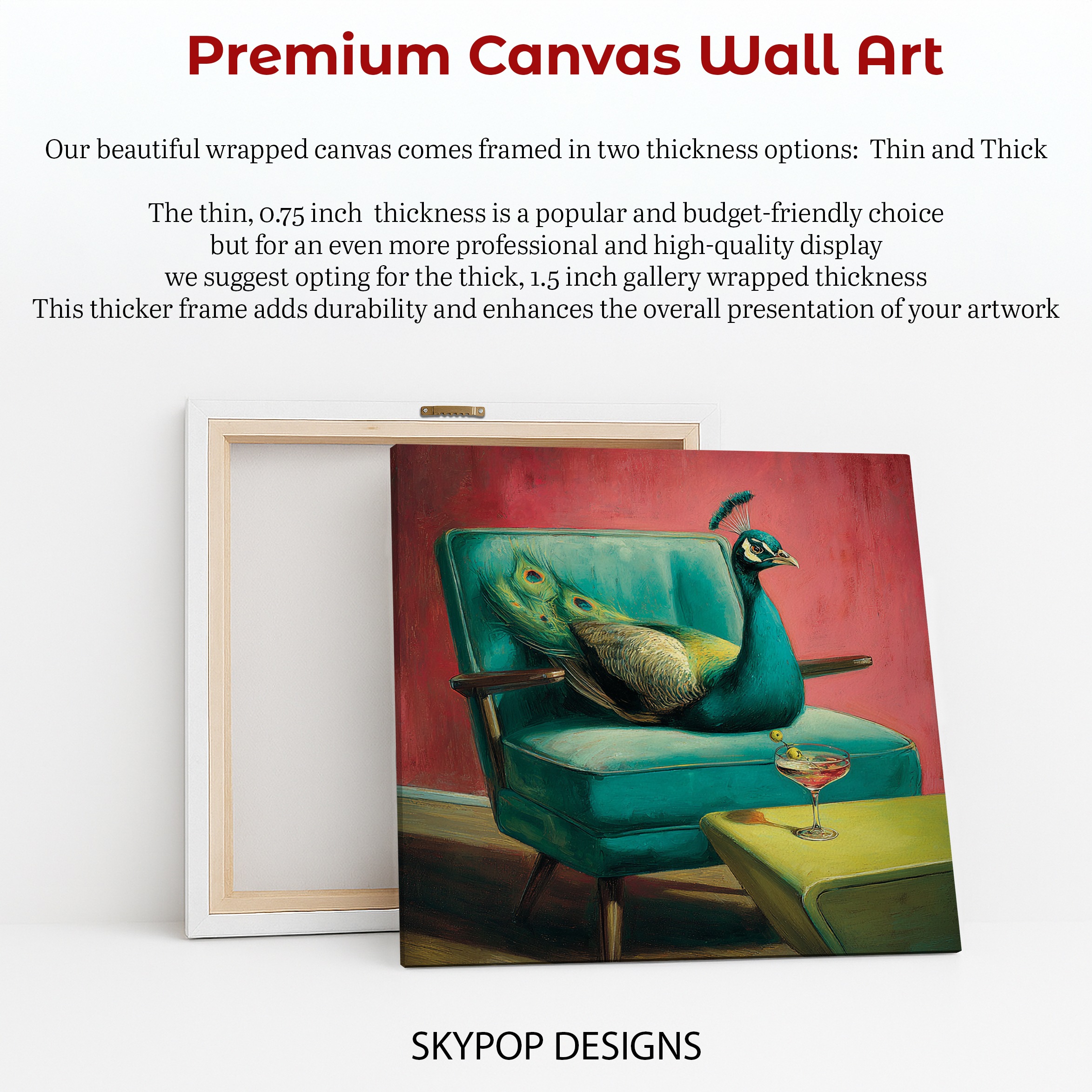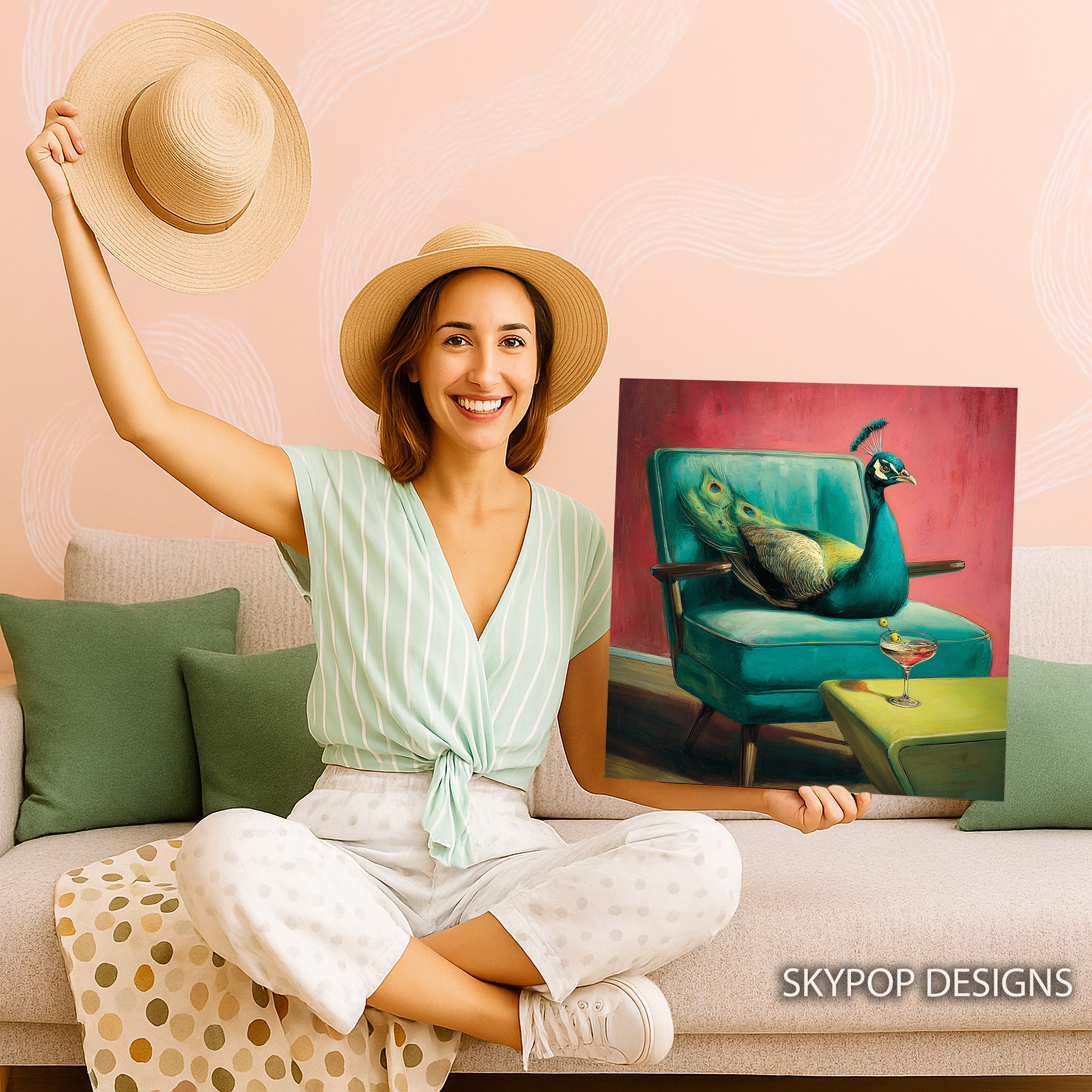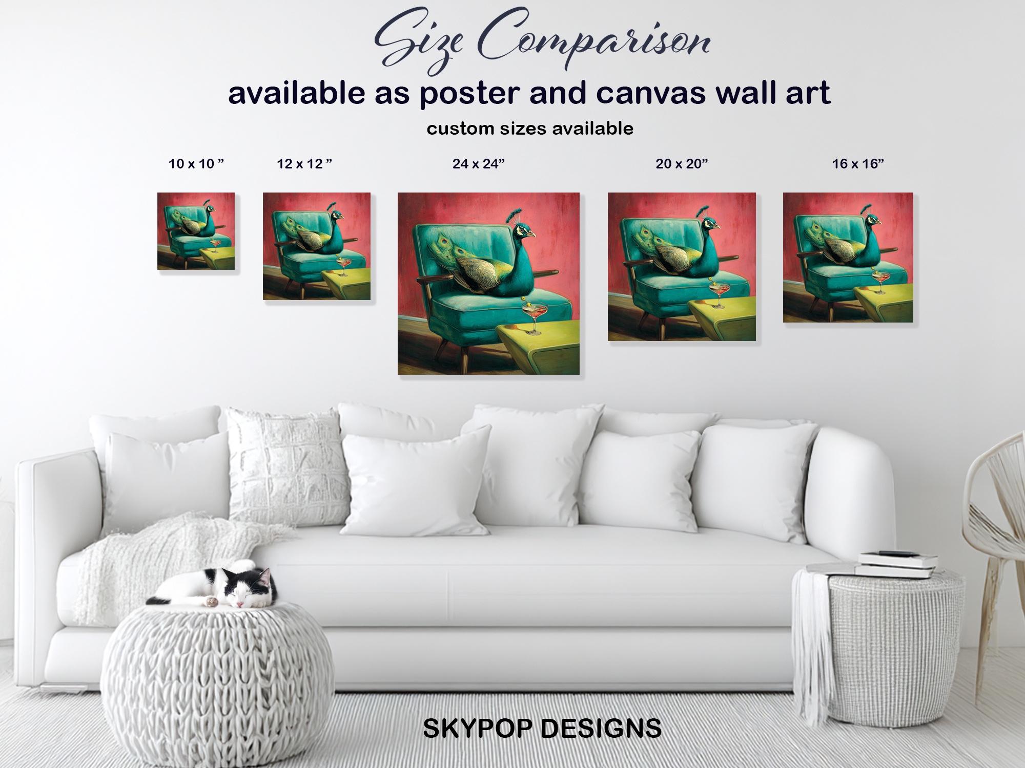 Elevate your space with this striking peacock canvas wall art that brings a touch of whimsy and glamour to any room. This eye-catching poster features a vibrant peacock perched on a mid-century modern teal armchair, complete with a martini glass nearby. Perfect for contemporary living rooms or chic home bars, this unique piece combines animal art with retro flair. The bold color palette of teal, red, and yellow creates a visually stunning contrast that instantly draws the eye. Ideal for those who love to make a statement, this canvas wall art adds personality and elegance to your decor. The detailed brushwork brings the peacock’s feathers to life, while the sleek lines of the furniture echo mid-century design. This versatile artwork works beautifully in dining rooms, offices, or as a focal point in open-concept spaces. The quirky subject matter makes it a great conversation starter and a perfect gift for the cocktail enthusiast or animal lover in your life. High-quality printing ensures every detail pops, from the peacock’s regal posture to the olives in the martini glass. Whether you’re creating a retro-inspired lounge or adding a pop of color to a neutral space, this peacock wall art delivers style and personality. Transform your home with this blend of nature and nostalgia that celebrates both the beauty of wildlife and the charm of vintage design. Make a bold statement in your space with this unique peacock artwork today.