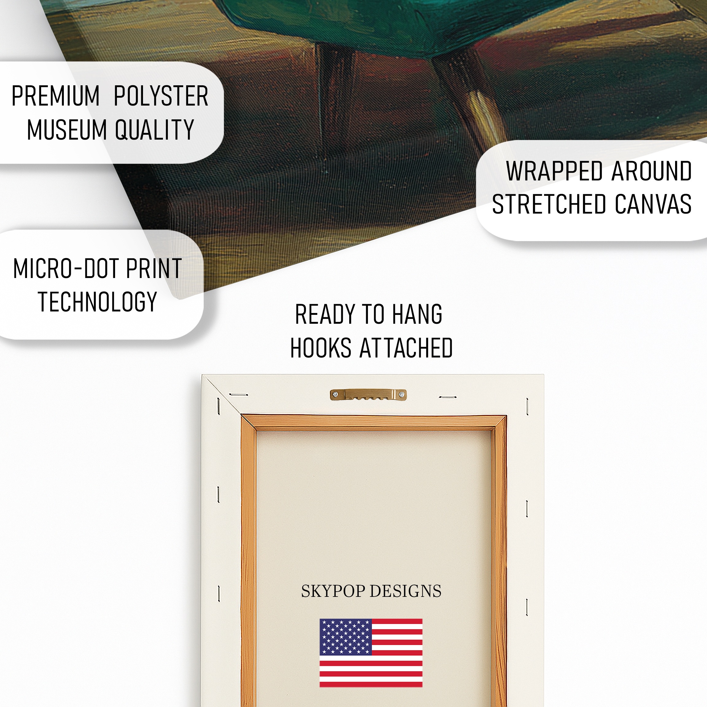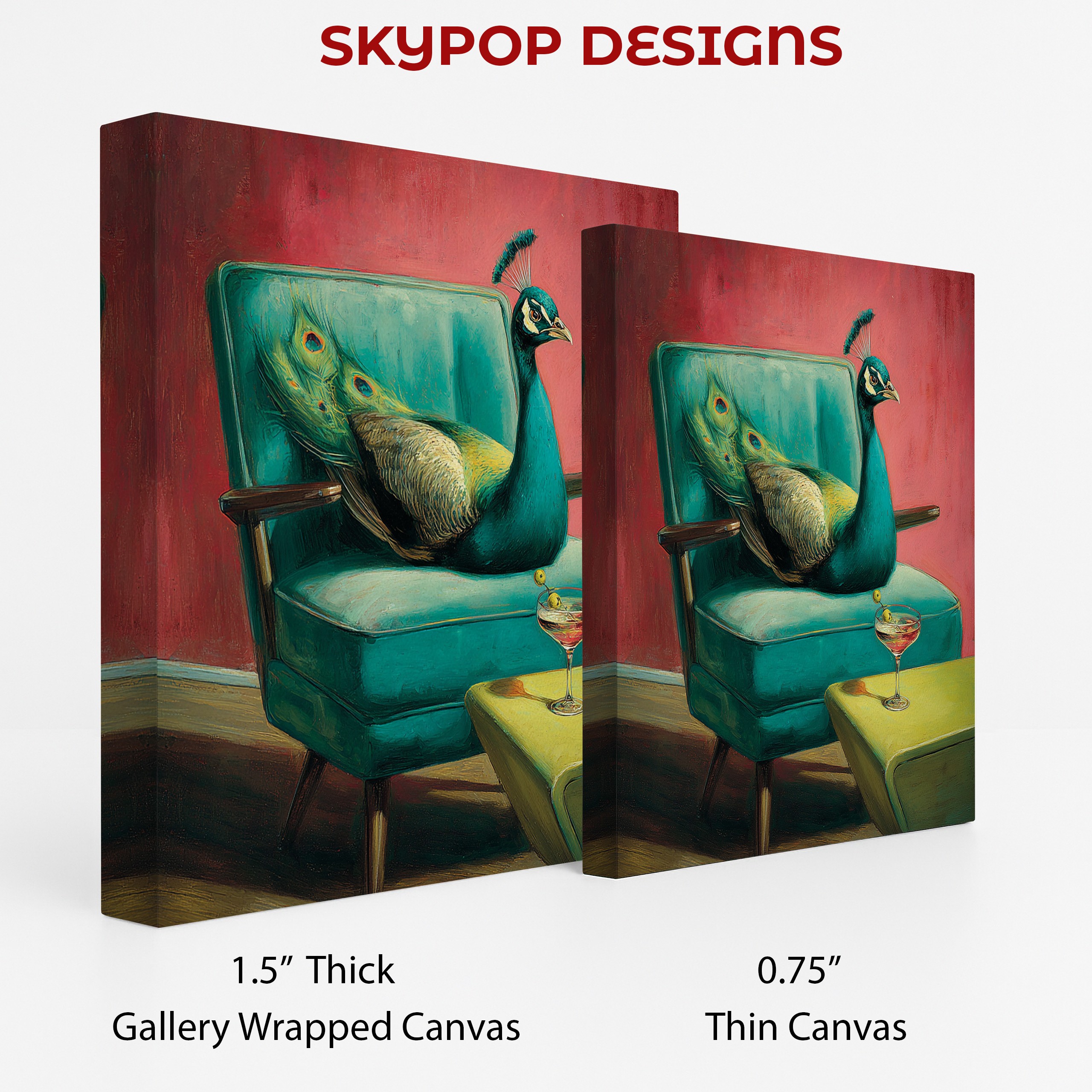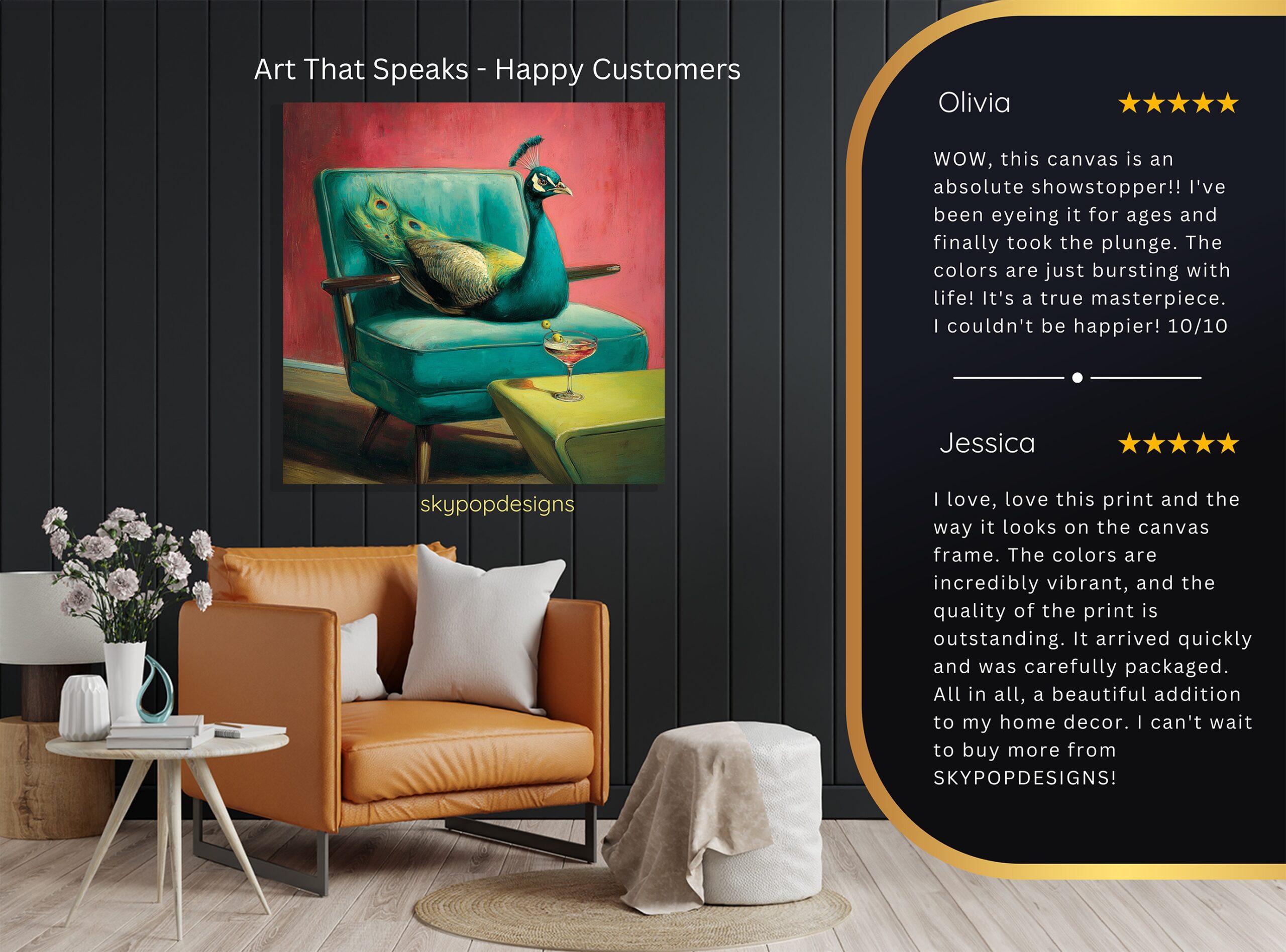 Elevate your space with this striking peacock canvas wall art that brings a touch of whimsy and glamour to any room. This eye-catching poster features a vibrant peacock perched on a mid-century modern teal armchair, complete with a martini glass nearby. Perfect for contemporary living rooms or chic home bars, this unique piece combines animal art with retro flair. The bold color palette of teal, red, and yellow creates a visually stunning contrast that instantly draws the eye. Ideal for those who love to make a statement, this canvas wall art adds personality and elegance to your decor. The detailed brushwork brings the peacock’s feathers to life, while the sleek lines of the furniture echo mid-century design. This versatile artwork works beautifully in dining rooms, offices, or as a focal point in open-concept spaces. The quirky subject matter makes it a great conversation starter and a perfect gift for the cocktail enthusiast or animal lover in your life. High-quality printing ensures every detail pops, from the peacock’s regal posture to the olives in the martini glass. Whether you’re creating a retro-inspired lounge or adding a pop of color to a neutral space, this peacock wall art delivers style and personality. Transform your home with this blend of nature and nostalgia that celebrates both the beauty of wildlife and the charm of vintage design. Make a bold statement in your space with this unique peacock artwork today.
