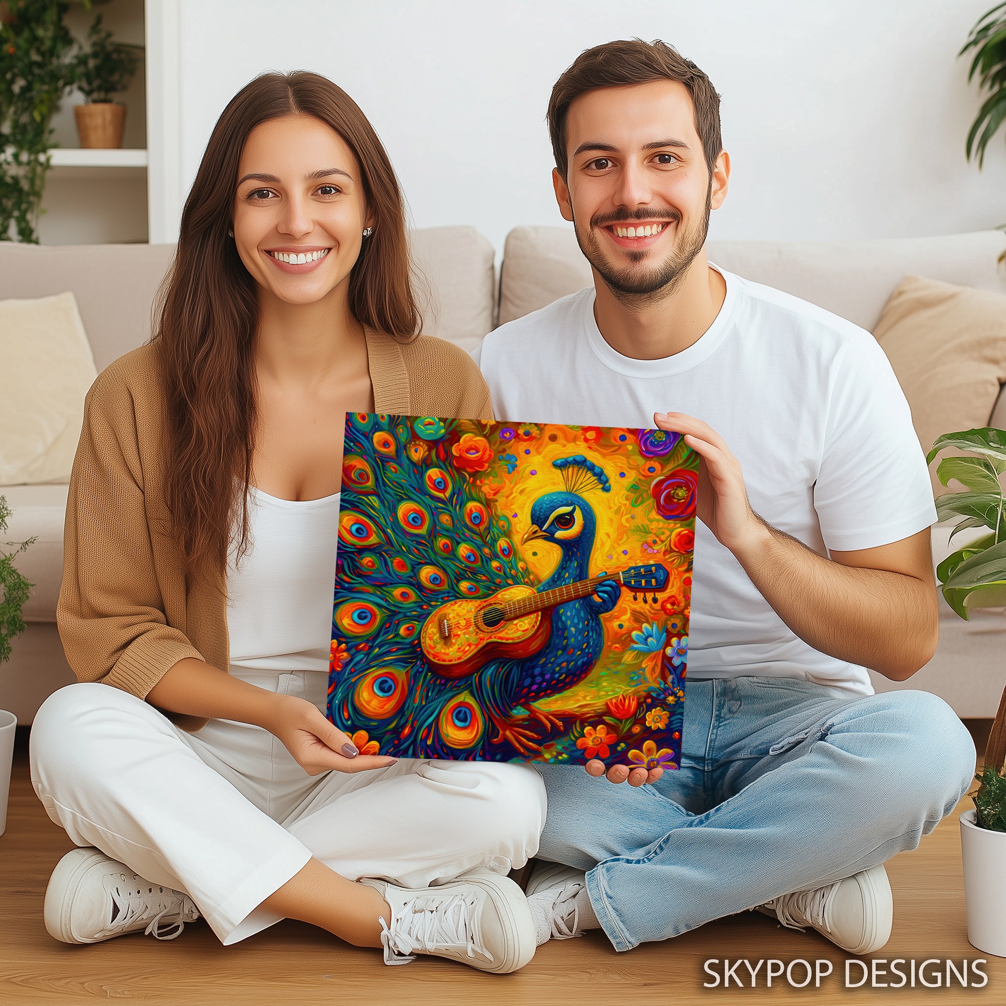 Keywords: Peacock Art, Peacock Canvas Art, Musical Peacock, Guitar Art, Nature Art, Whimsical Art, Animal Art, Multicolor Art, Yellow Art, Blue Art, Orange Art, Bohemian Decor, Contemporary Decor, Modern Decor, Living Room Art, Bedroom Art, Entryway Decor, Office Art, Vibrant Wall Art, Canvas Print, Wall Decor, Home Decor, Unique Gift, Music Lover Gift, Birthday Gift, Holiday Gift, Housewarming Gift, Colorful Flowers Art, Joyful Atmosphere, Creative Decor