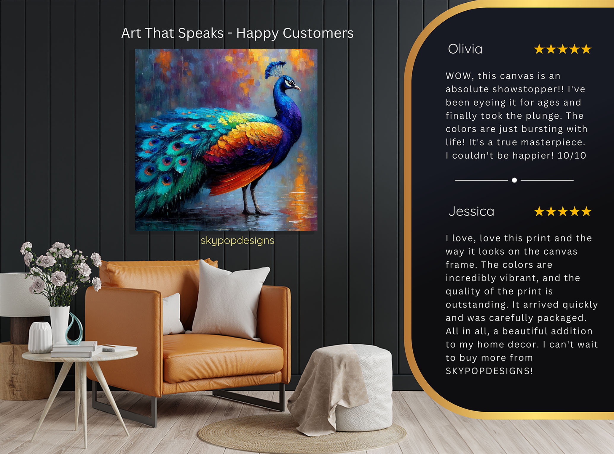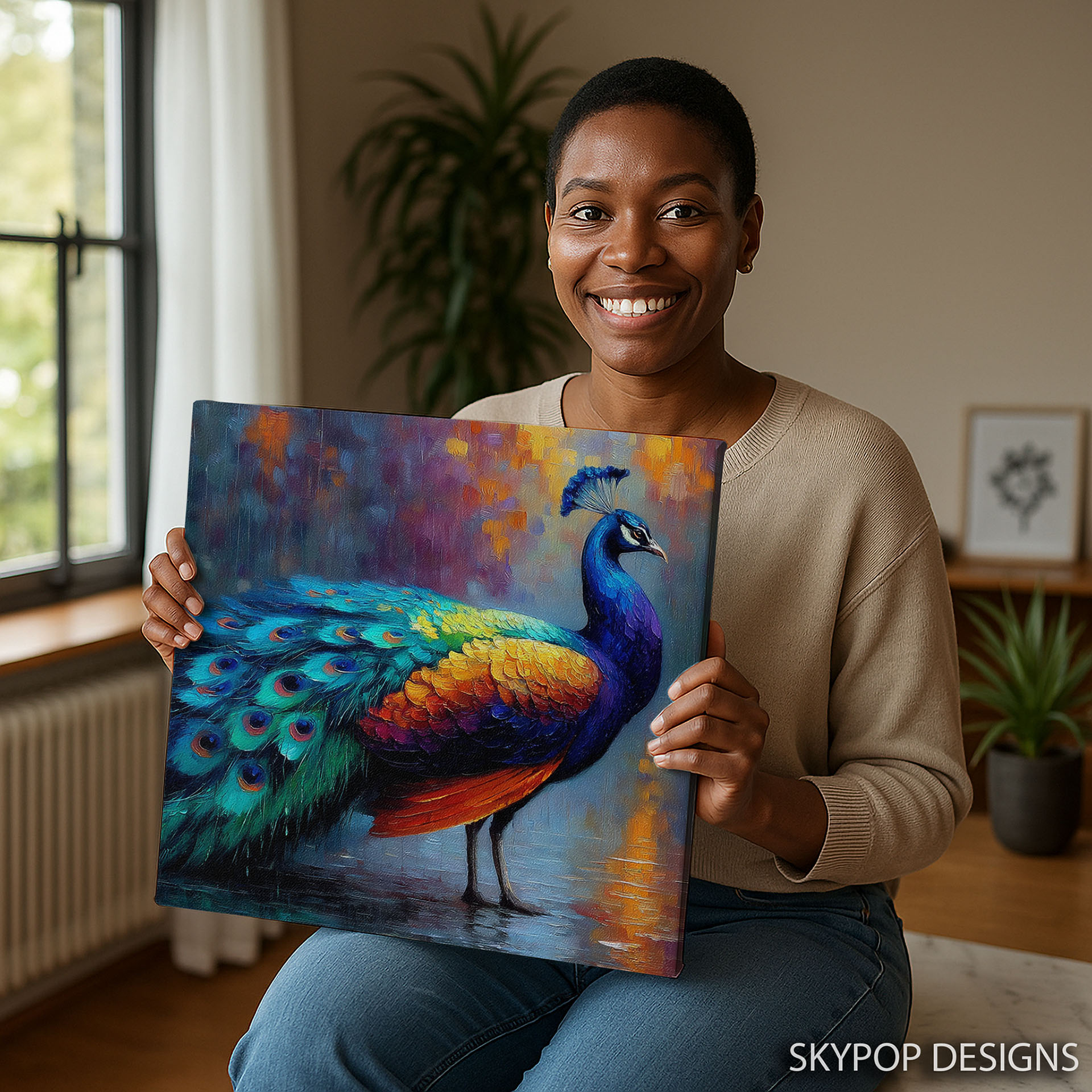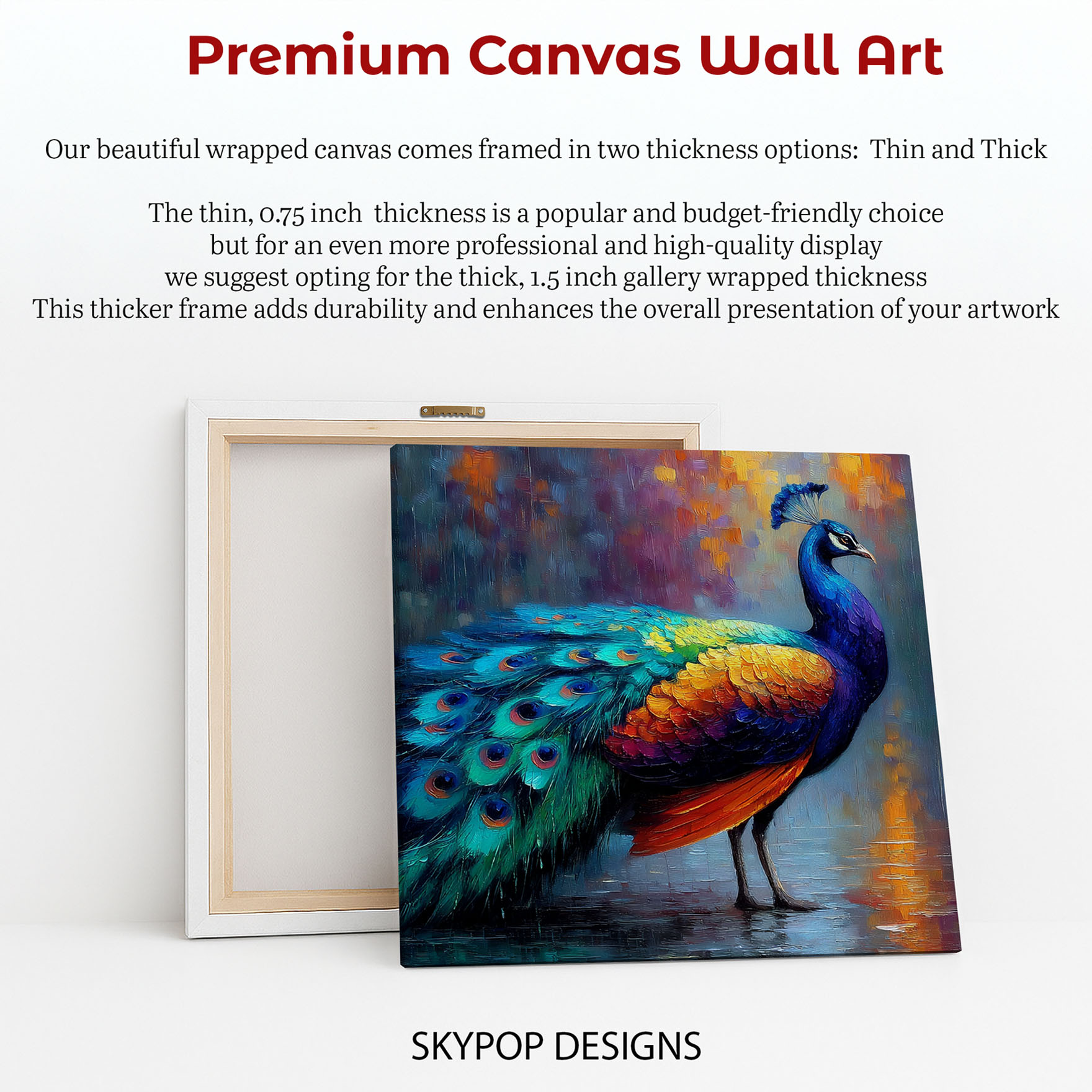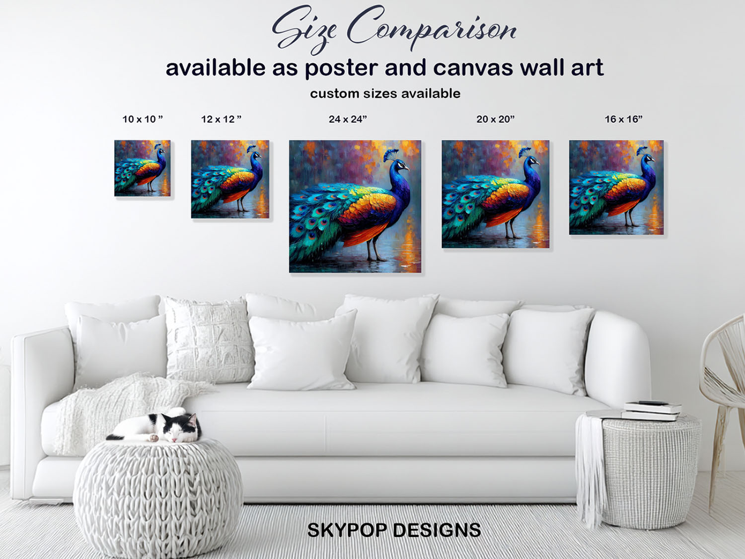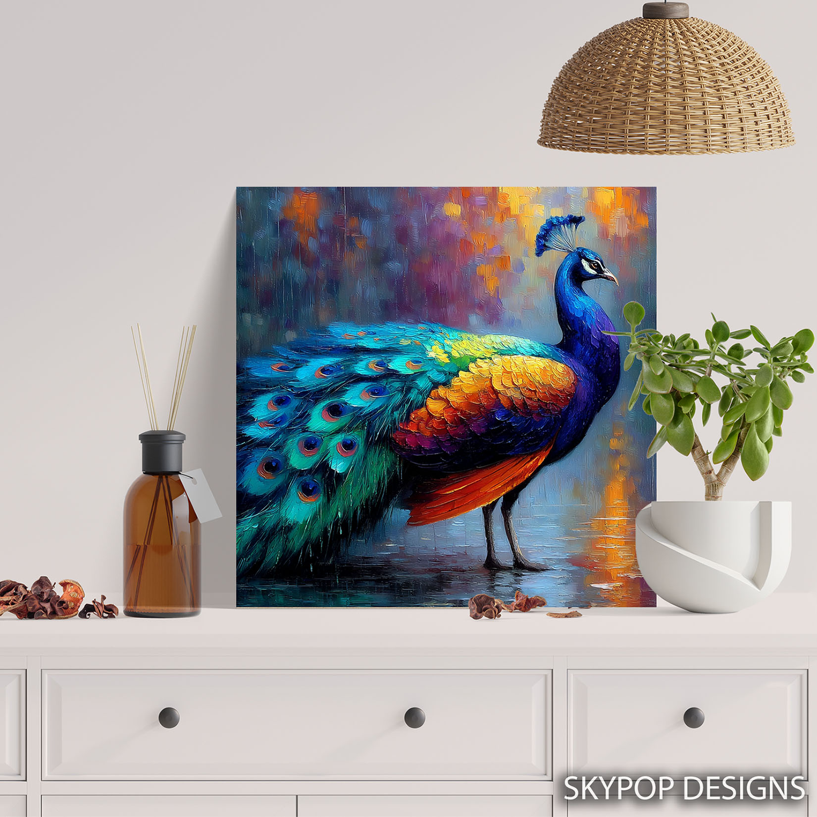 Transform your favorite space with this breathtaking peacock canvas wall art, showcasing a majestic peacock in vibrant, contemporary style. This stunning poster or canvas wall art is perfect for enhancing modern living room decor or adding a striking focal point to your bedroom. The vivid blues, greens, and golds in the artwork evoke a sense of opulence and natural beauty, creating a captivating atmosphere. Ideal for bohemian spaces, this piece also complements contemporary and modern design trends, bringing life and color to any room. The detailed brushwork on this canvas wall art captures the iridescent shimmer of the peacock’s feathers, making each viewing a discovery. This animal art piece is a perfect gift for bird lovers, housewarmings, or birthdays, celebrating the elegance and symbolism of the peacock. Its versatility allows it to elevate entryways or dining rooms, setting a sophisticated tone. The rich, multicolor palette of this poster promises to inspire and delight, adding a luxurious touch to your home decor. Experience the exquisite beauty of nature captured in high-quality canvas art, designed to transform your wall decor. Elevate your home’s aesthetic with this striking peacock artwork today and embrace its vibrant energy. This stunning canvas wall art is sure to be a conversation starter and a timeless addition to your collection. Make a statement with this captivating peacock piece that brings the wild’s beauty indoors.