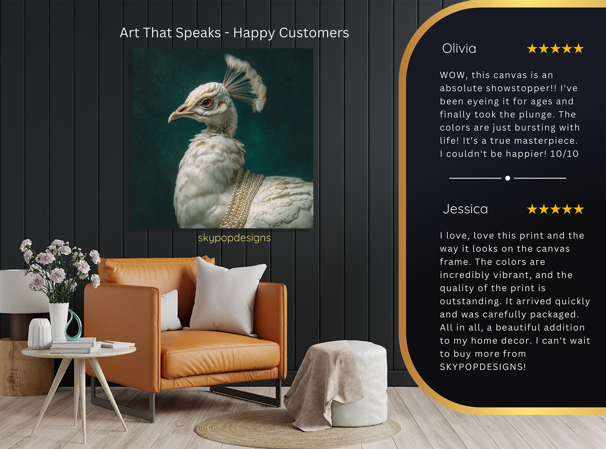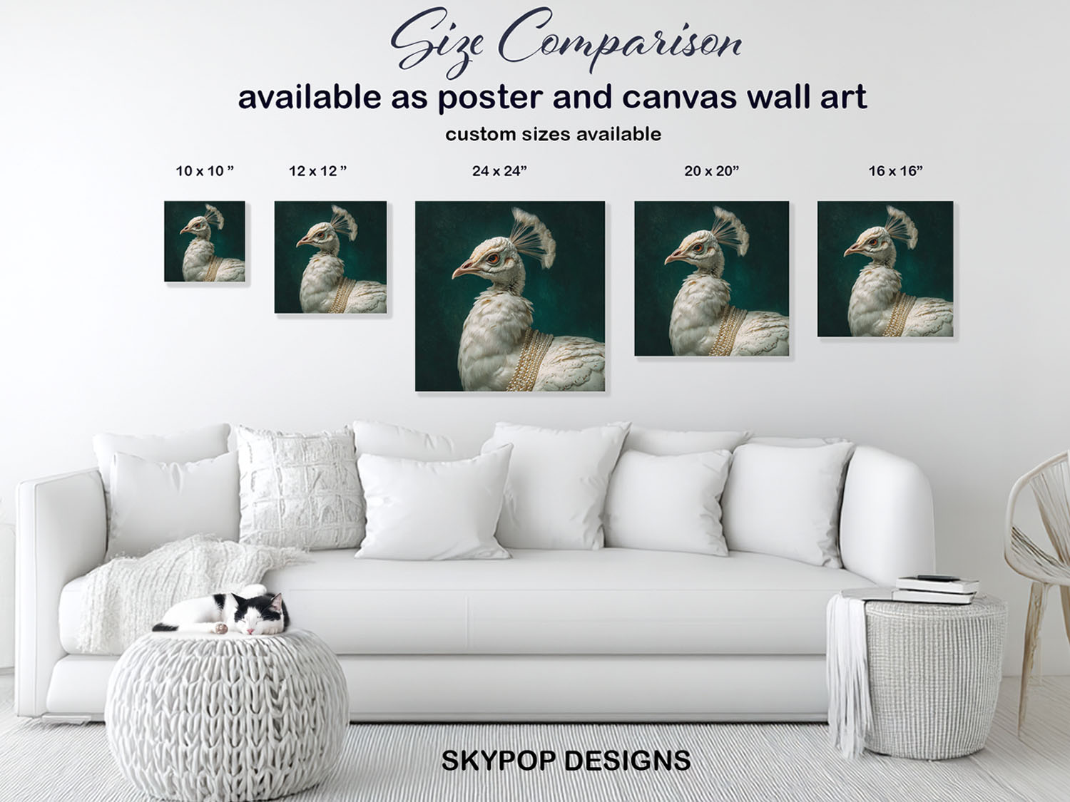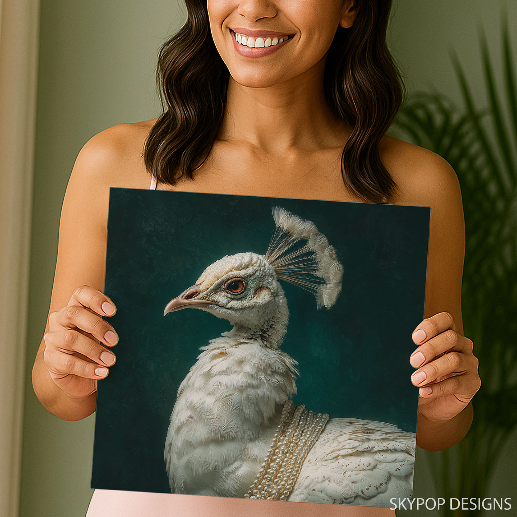 Elevate your home with this stunning peacock canvas wall art that showcases a regal white peacock adorned with lustrous pearls. This captivating poster or canvas wall art is perfect for adding a sophisticated touch to modern living room wall decor or creating an opulent bedroom sanctuary. The striking contrast between the crisp white feathers and the deep teal background, accented by the shimmering gold of the pearls, creates a visually arresting piece. Ideal for glam and contemporary interiors, this animal art piece enhances modern spaces with its striking elegance. The peacock, a symbol of beauty and grace, makes a magnificent focal point in any room. High-quality printing ensures every feather detail and pearl’s subtle shine is beautifully captured, bringing this canvas wall art to life. This versatile artwork also works beautifully in entryways or dining rooms, setting a tone of refined luxury. It makes a perfect housewarming gift or a glamorous addition to holiday decor. The color palette offers a sophisticated blend that complements both bold and minimalist design schemes. Transform your living space with this luxurious animal canvas wall art that celebrates natural beauty and timeless style. Add a touch of refined artistry to your home decor today with this elegant peacock pearl portrait. Make this unique wall art the centerpiece of your collection and inspire awe in all who see it.