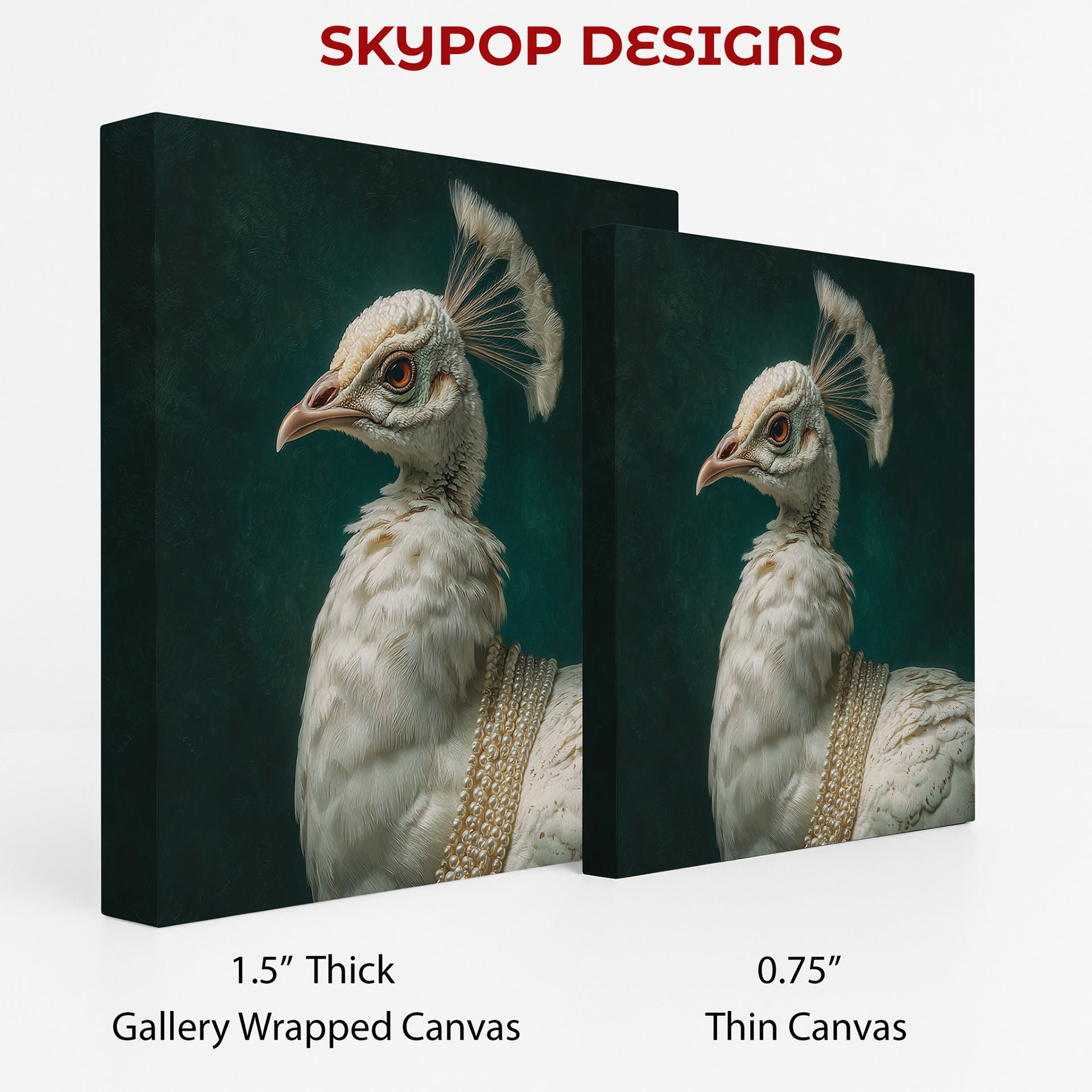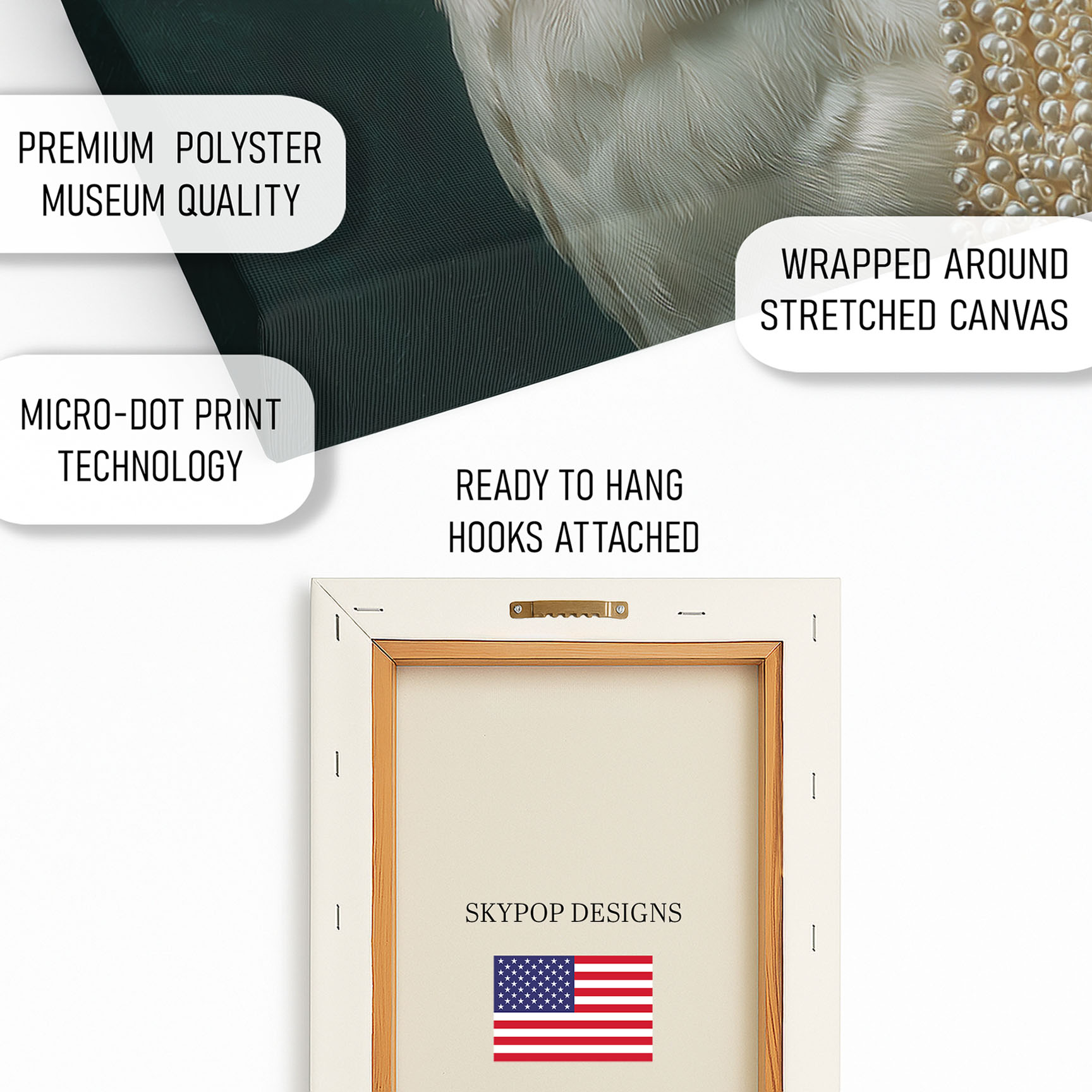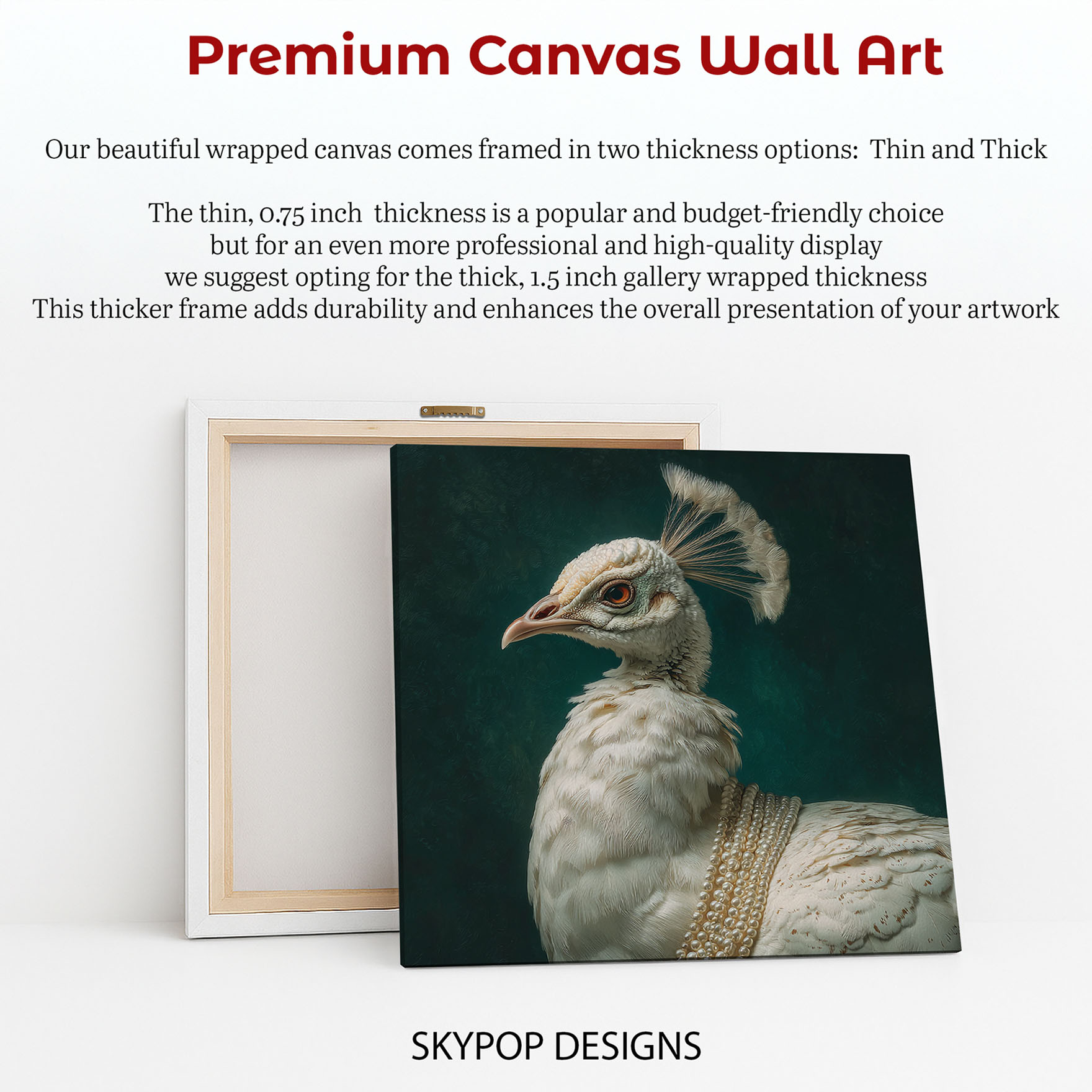 Elevate your home with this stunning peacock canvas wall art that showcases a regal white peacock adorned with lustrous pearls. This captivating poster or canvas wall art is perfect for adding a sophisticated touch to modern living room wall decor or creating an opulent bedroom sanctuary. The striking contrast between the crisp white feathers and the deep teal background, accented by the shimmering gold of the pearls, creates a visually arresting piece. Ideal for glam and contemporary interiors, this animal art piece enhances modern spaces with its striking elegance. The peacock, a symbol of beauty and grace, makes a magnificent focal point in any room. High-quality printing ensures every feather detail and pearl’s subtle shine is beautifully captured, bringing this canvas wall art to life. This versatile artwork also works beautifully in entryways or dining rooms, setting a tone of refined luxury. It makes a perfect housewarming gift or a glamorous addition to holiday decor. The color palette offers a sophisticated blend that complements both bold and minimalist design schemes. Transform your living space with this luxurious animal canvas wall art that celebrates natural beauty and timeless style. Add a touch of refined artistry to your home decor today with this elegant peacock pearl portrait. Make this unique wall art the centerpiece of your collection and inspire awe in all who see it.