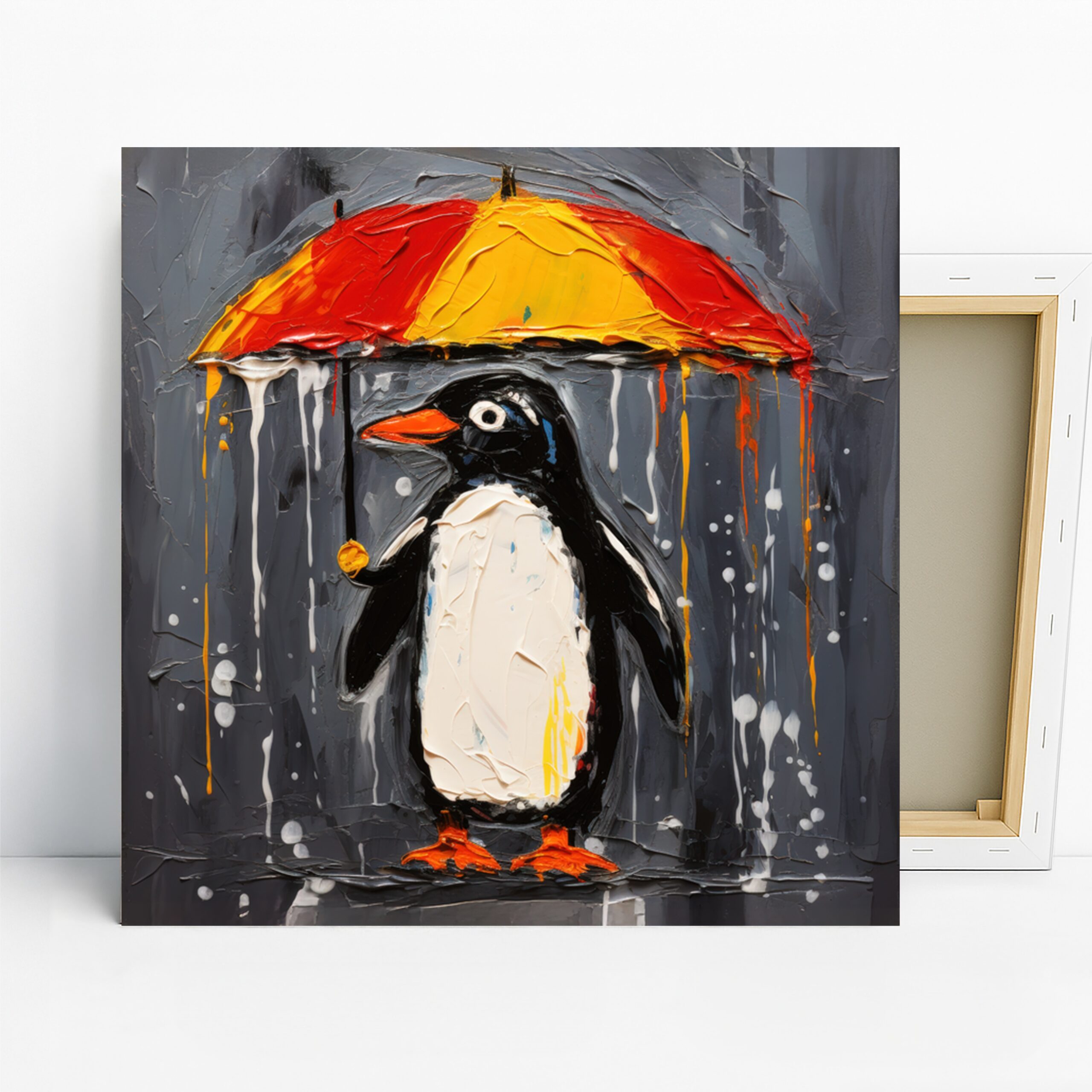 Brighten your home with this charming penguin canvas wall art, featuring a delightful penguin under a vibrant umbrella. This eye-catching poster or canvas wall art uses a bold, textured style that creates a captivating focal point in any space. The striking combination of multicolor reds and yellows on the umbrella pops against the cool grey background and the penguin’s classic black and white coloring, evoking a sense of playful resilience. Perfect for modern living rooms or as cheerful Scandinavian decor in a bedroom, this artwork brings personality and warmth to your walls. It’s an ideal piece for adding a touch of whimsy to children’s rooms, making it a wonderful gift for birthdays or housewarmings. The thick, impasto-like application of paint gives this canvas wall art a unique, tactile quality that adds depth and character. This versatile poster works beautifully in entryways or guest rooms, welcoming visitors with its cheerful appeal. The contrast between the bright umbrella and the stormy background can inspire a feeling of optimism and comfort. Elevate your home’s interior with this stunning piece that celebrates the joy found even on a rainy day. Transform your space with this unique artwork that’s sure to spark conversations and bring smiles. Add this playful penguin canvas art to your collection for an instant mood boost.