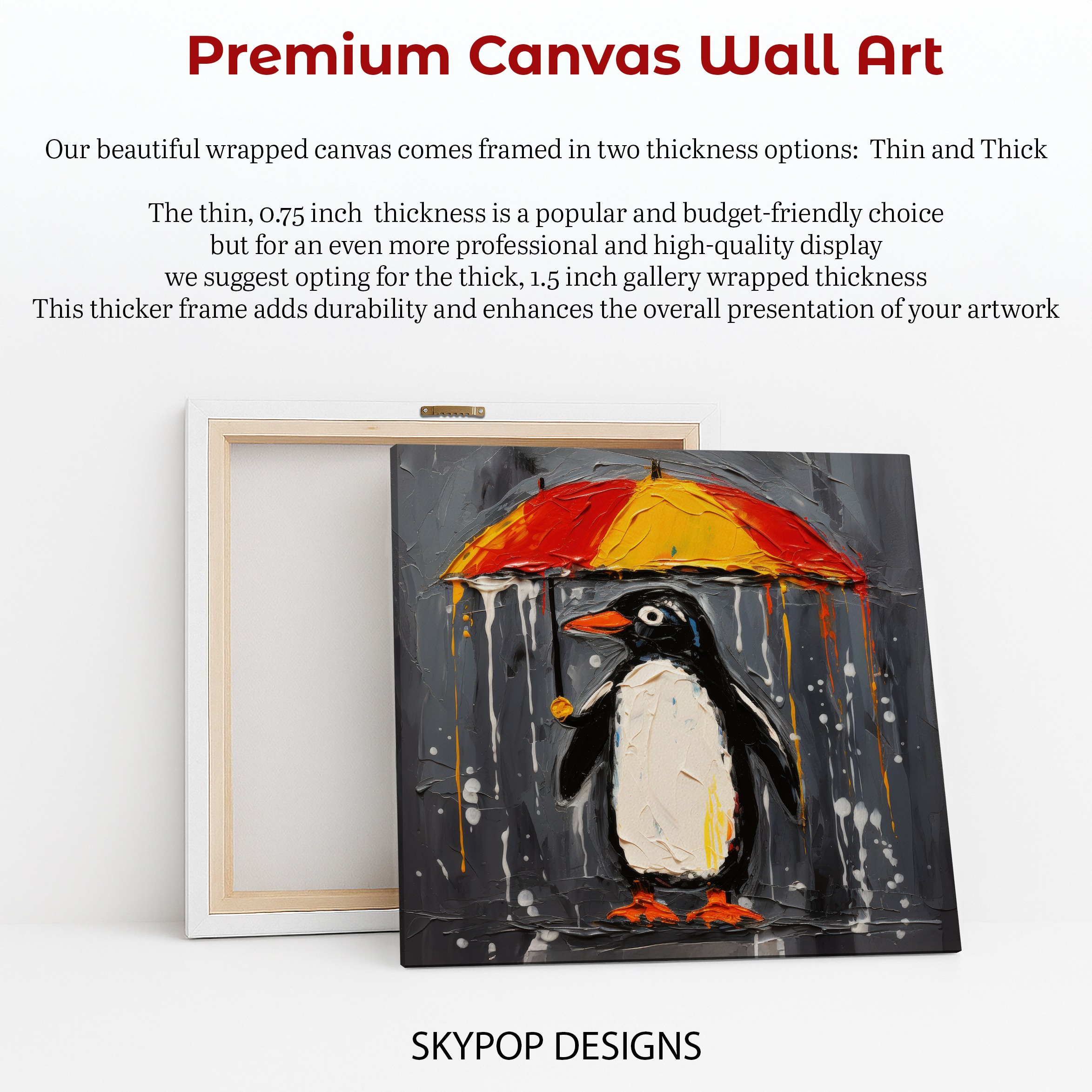 Keywords: penguin art,canvas wall art,animal art,whimsical art,contemporary art,modern decor,scandinavian decor,bohemian decor,living room art,bedroom decor,kids room art,entryway art,multicolor art,grey art,yellow art,red art,penguin poster,rainy day art,bold art,textured art,impasto art,wall decor,home decor,gift ideas,birthday gift,housewarming gift,playful art,optimism art,comfort art,unique artwork