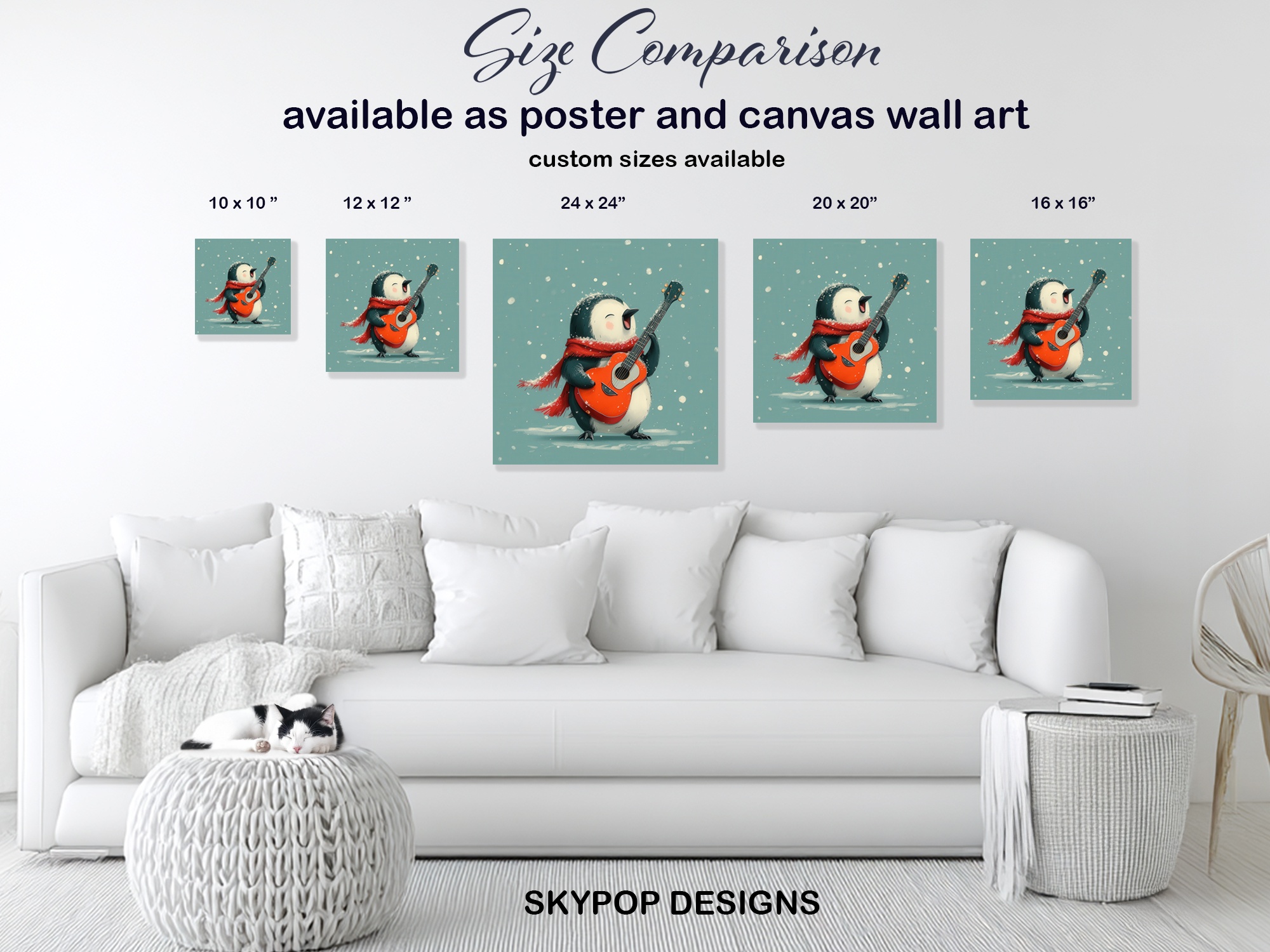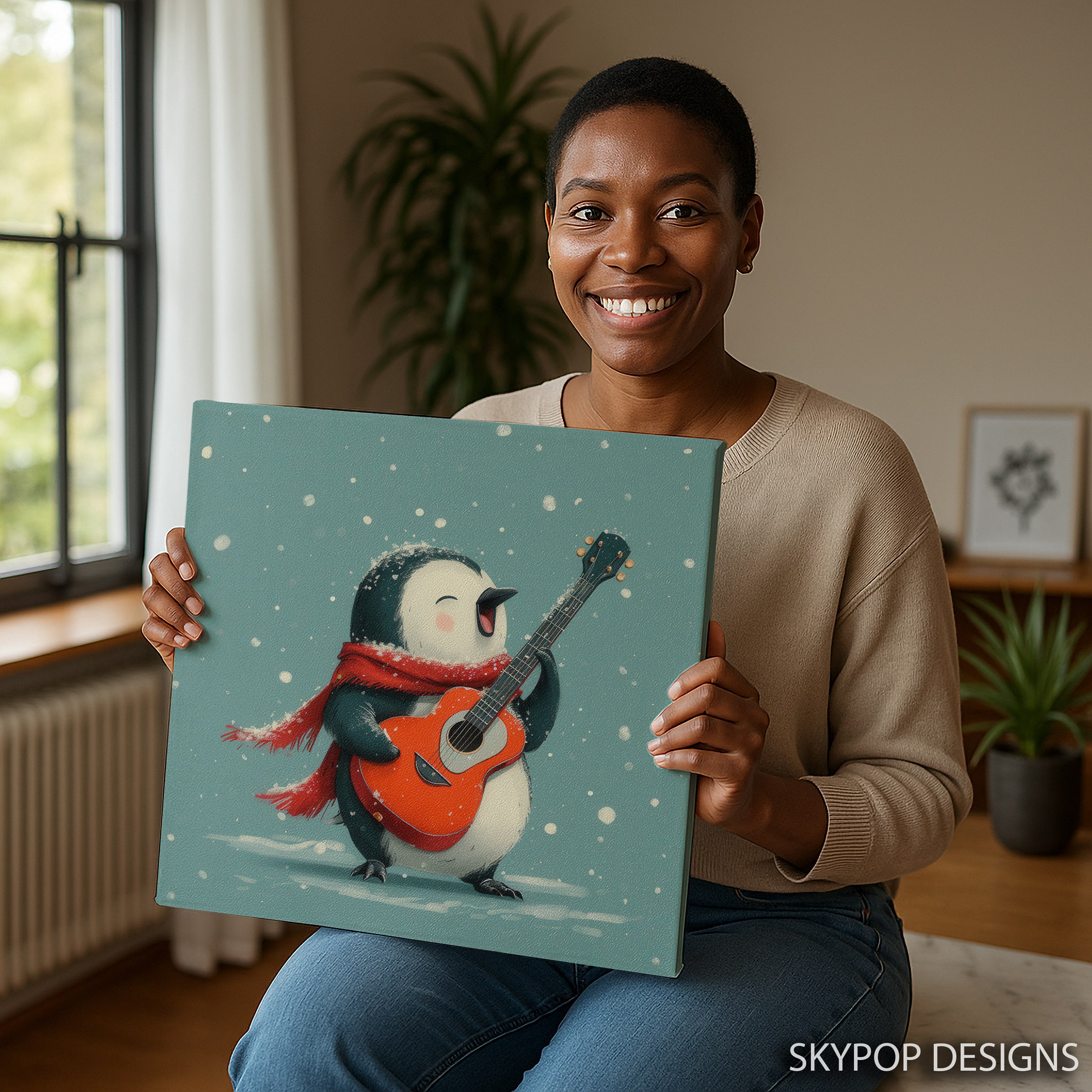 Bring joy and vibrant energy to your home with this playful penguin canvas wall art. Featuring a cheerful penguin strumming a bright red guitar amidst falling snow, this piece is sure to spark smiles and conversation. This charming poster or canvas wall art is perfect for transforming any living room, children’s room, or bedroom into a cozy and uplifting space. The striking teal background with playful white accents creates a captivating visual contrast with the penguin’s red scarf and guitar, infusing your home with warmth and personality. Ideal for contemporary or bohemian decor, this unique artwork also makes a fantastic housewarming gift or holiday present. The stylized brushstrokes and dynamic composition offer a modern yet whimsical feel, making this a standout piece in our animal art collection. Enhance your walls with this high-quality canvas print that captures a moment of pure, unadulterated fun. The happy mood and festive theme celebrate the simple joys of music and winter. Elevate your home decor with this eye-catching penguin poster, a delightful addition that brings a touch of personality and cheer to any wall. Discover the uplifting impact of this unique wall art, bringing a sense of lightheartedness and artistic flair into your everyday life. Make a statement with this vibrant piece of penguin wall art today.