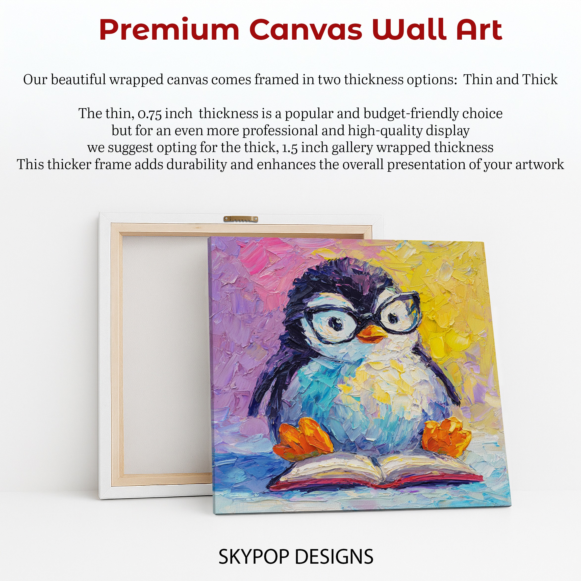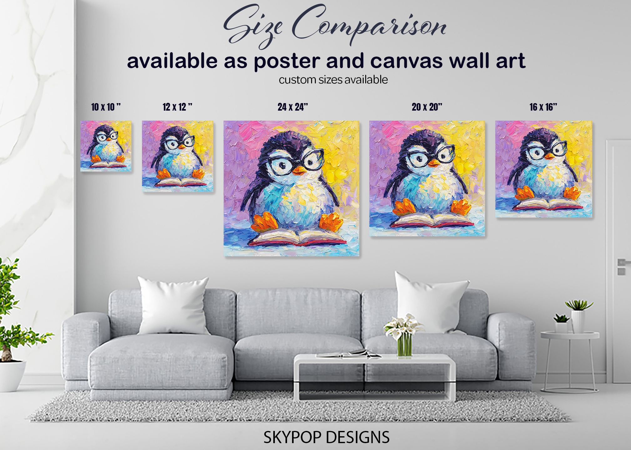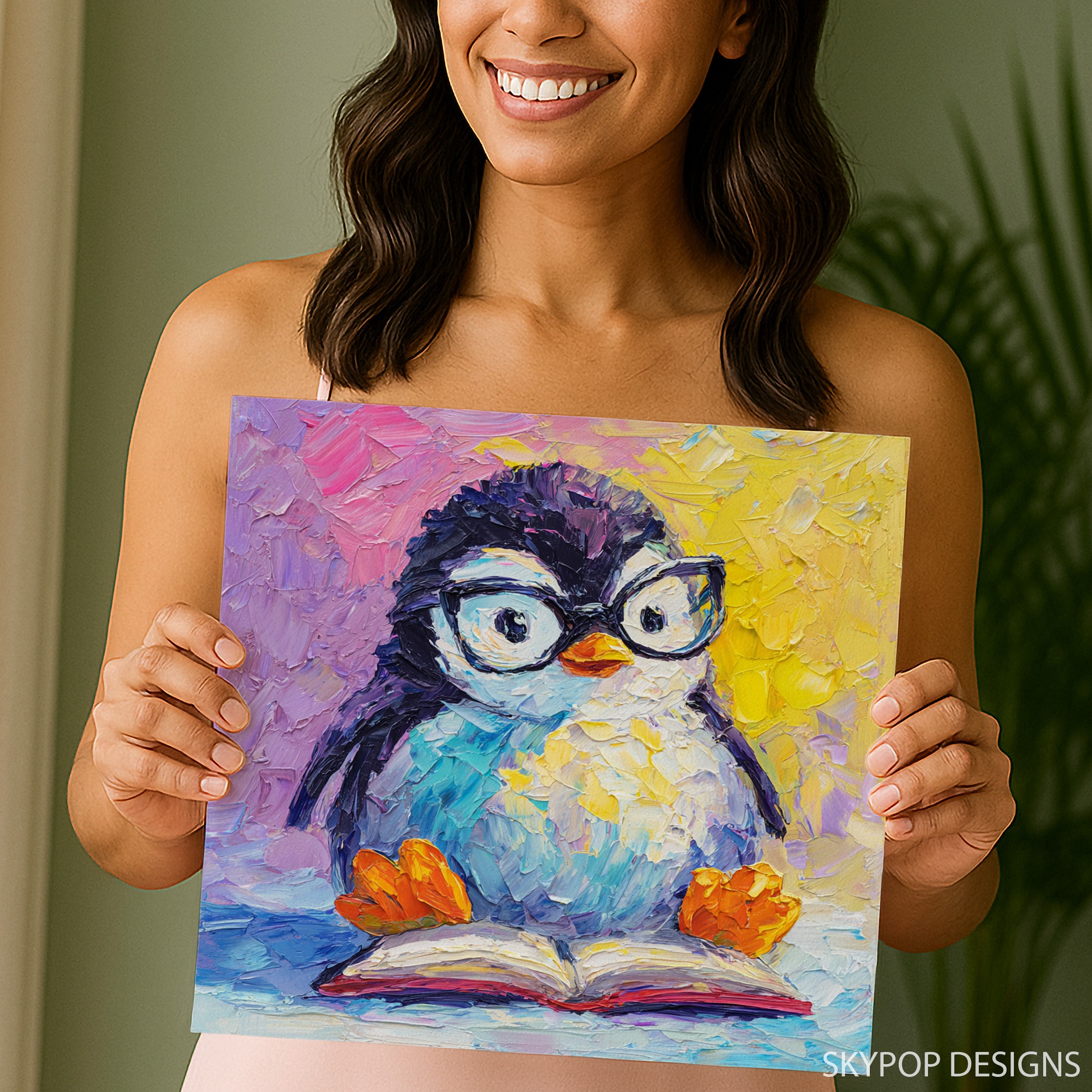 Bring a touch of whimsy to your space with this adorable penguin canvas wall art. This charming poster features a bespectacled penguin perched atop an open book, perfect for book lovers and animal enthusiasts alike. The vibrant impasto technique creates a striking texture that adds depth and character to any room. Ideal for a modern children’s bedroom, cozy reading nook, or playful home office, this canvas art injects personality and color into your decor. The bold color palette of blues, yellows, and purples against a multicolored background creates a lively atmosphere that sparks joy and creativity. This penguin wall art is a versatile piece that complements both minimalist and Scandinavian design styles, adding a pop of fun to clean, contemporary spaces. The thick brushstrokes and expressive style make this poster a conversation starter, whether displayed in a living room or library. Perfect as a thoughtful gift for book lovers or as inspirational decor for a study area, this unique artwork celebrates the love of reading in a playful, artistic way. High-quality printing ensures every detail of the penguin’s quirky expression and the vivid background is captured beautifully. Transform your walls with this delightful blend of animal art and literary charm. Add this eye-catching penguin canvas to your wall art collection and infuse your space with personality and warmth today.