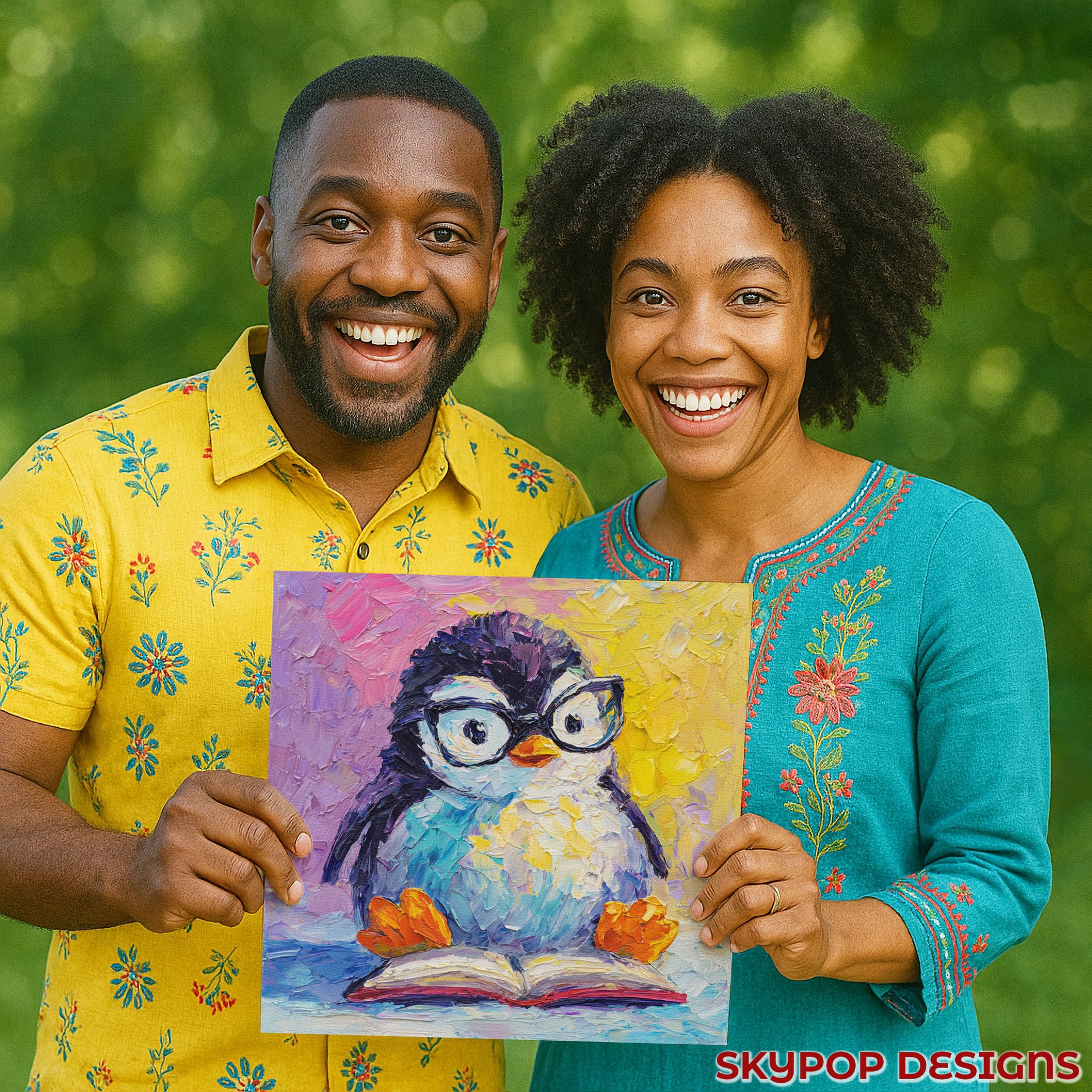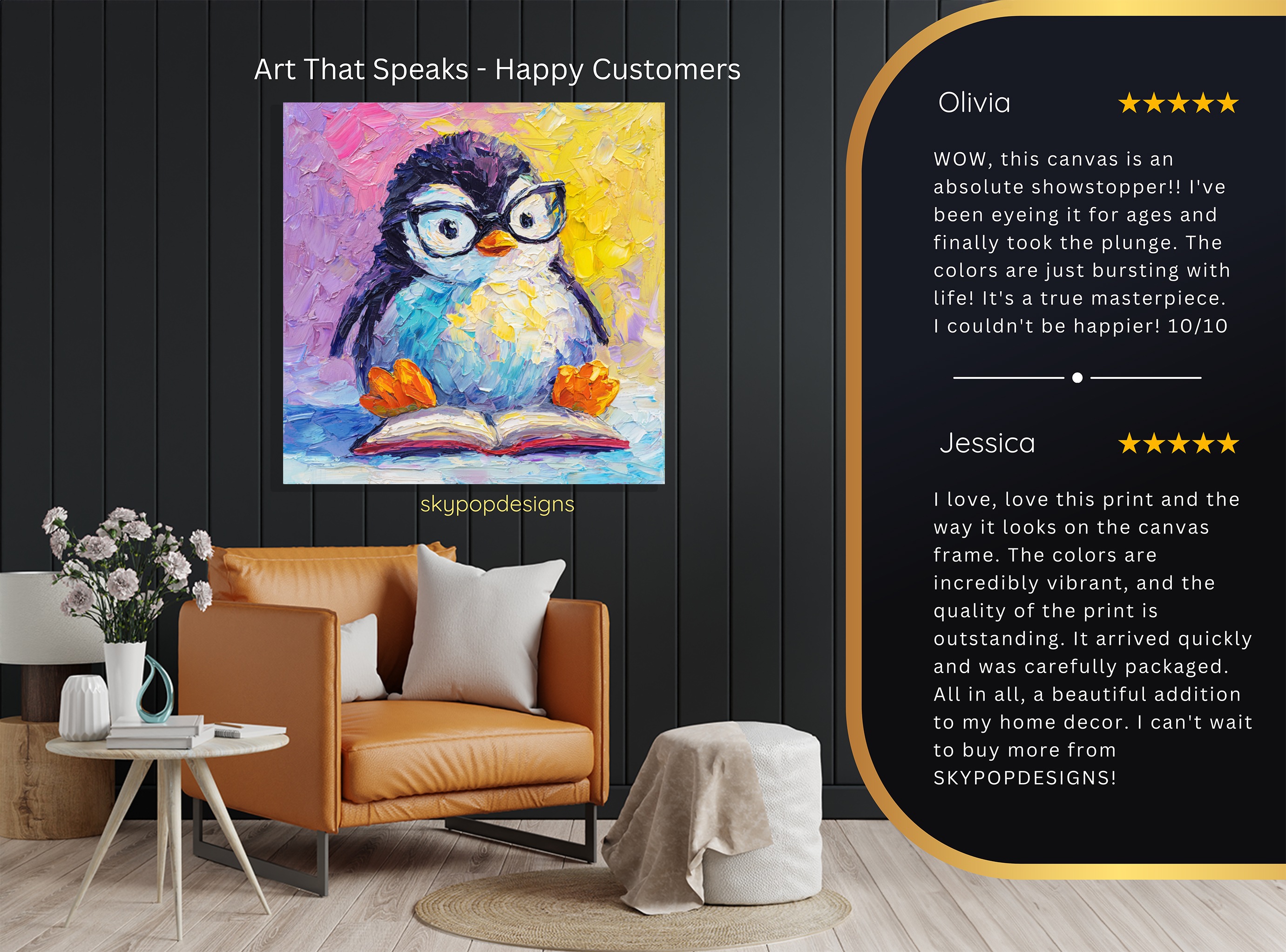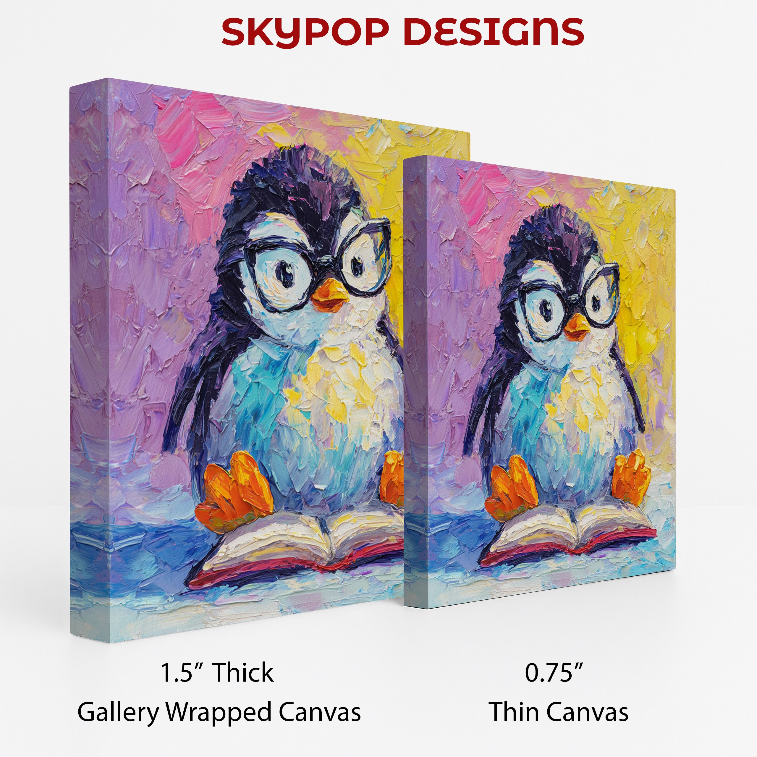 Bring a touch of whimsy to your space with this adorable penguin canvas wall art. This charming poster features a bespectacled penguin perched atop an open book, perfect for book lovers and animal enthusiasts alike. The vibrant impasto technique creates a striking texture that adds depth and character to any room. Ideal for a modern children’s bedroom, cozy reading nook, or playful home office, this canvas art injects personality and color into your decor. The bold color palette of blues, yellows, and purples against a multicolored background creates a lively atmosphere that sparks joy and creativity. This penguin wall art is a versatile piece that complements both minimalist and Scandinavian design styles, adding a pop of fun to clean, contemporary spaces. The thick brushstrokes and expressive style make this poster a conversation starter, whether displayed in a living room or library. Perfect as a thoughtful gift for book lovers or as inspirational decor for a study area, this unique artwork celebrates the love of reading in a playful, artistic way. High-quality printing ensures every detail of the penguin’s quirky expression and the vivid background is captured beautifully. Transform your walls with this delightful blend of animal art and literary charm. Add this eye-catching penguin canvas to your wall art collection and infuse your space with personality and warmth today.