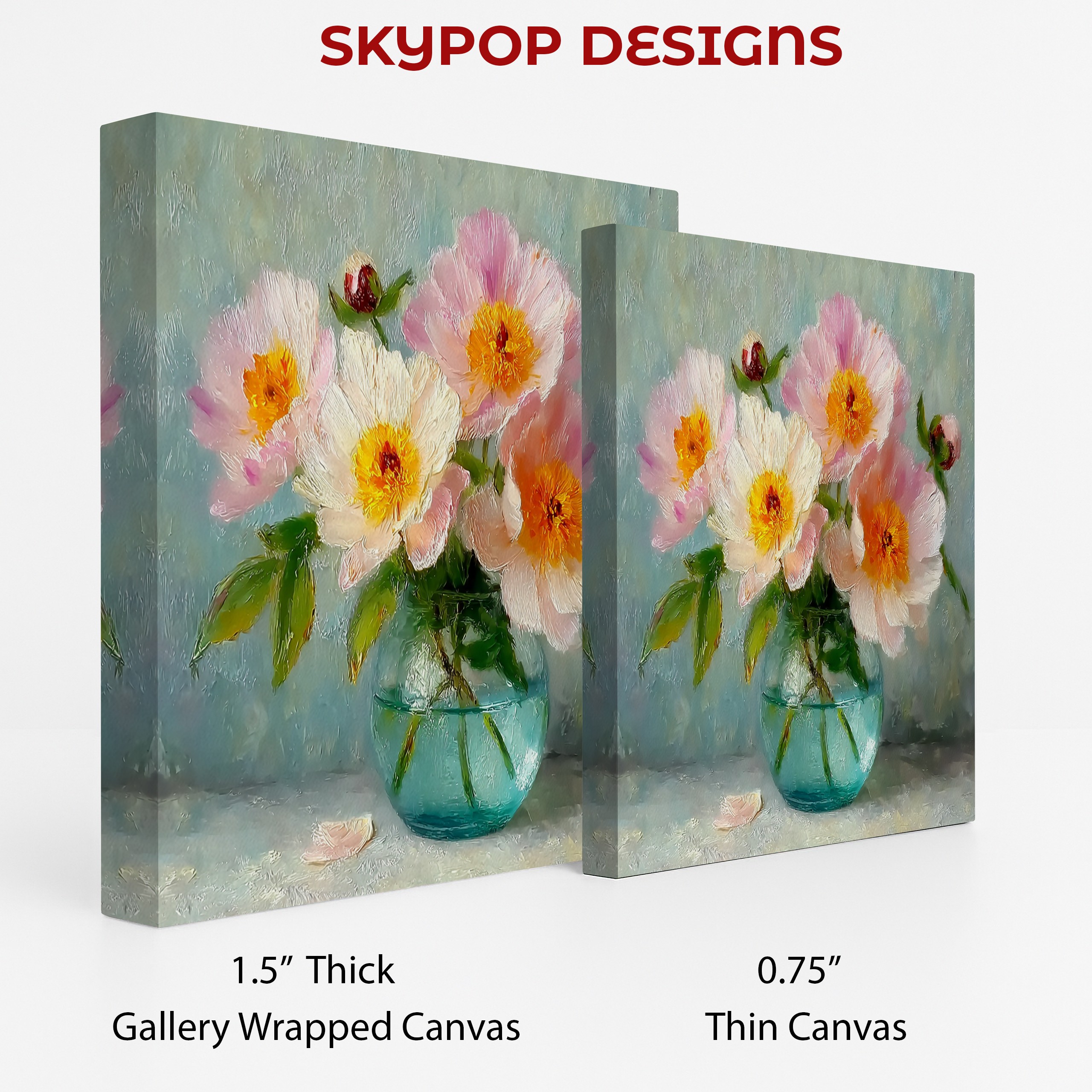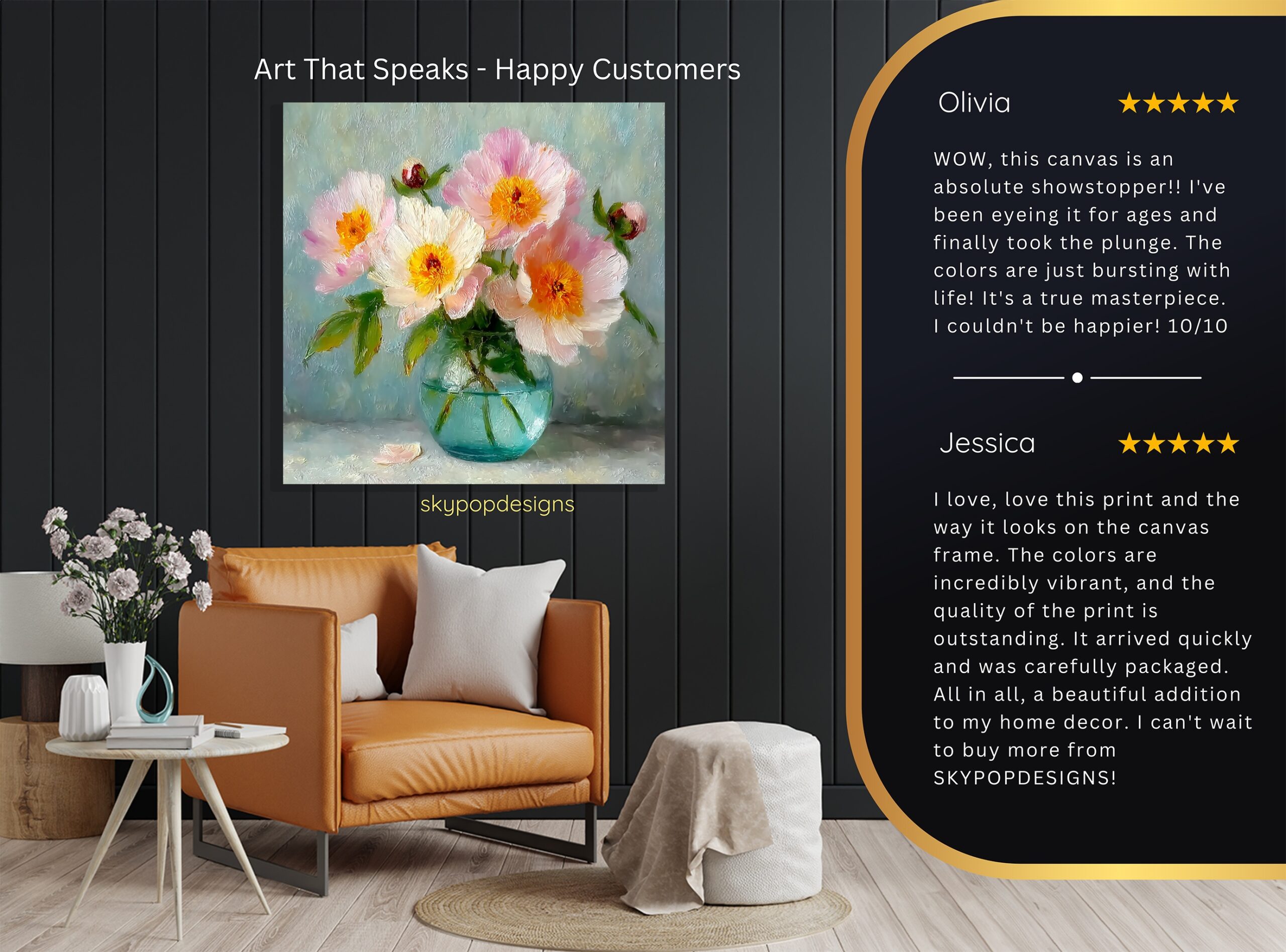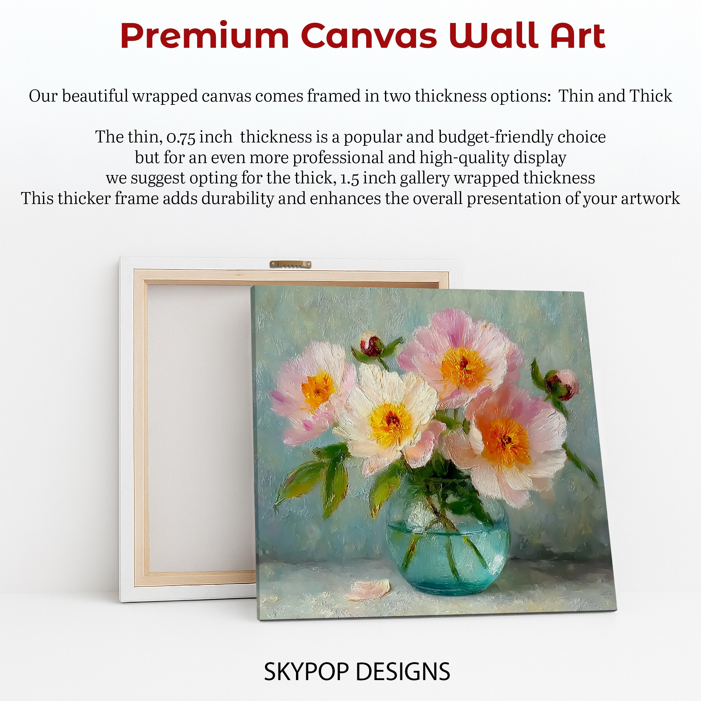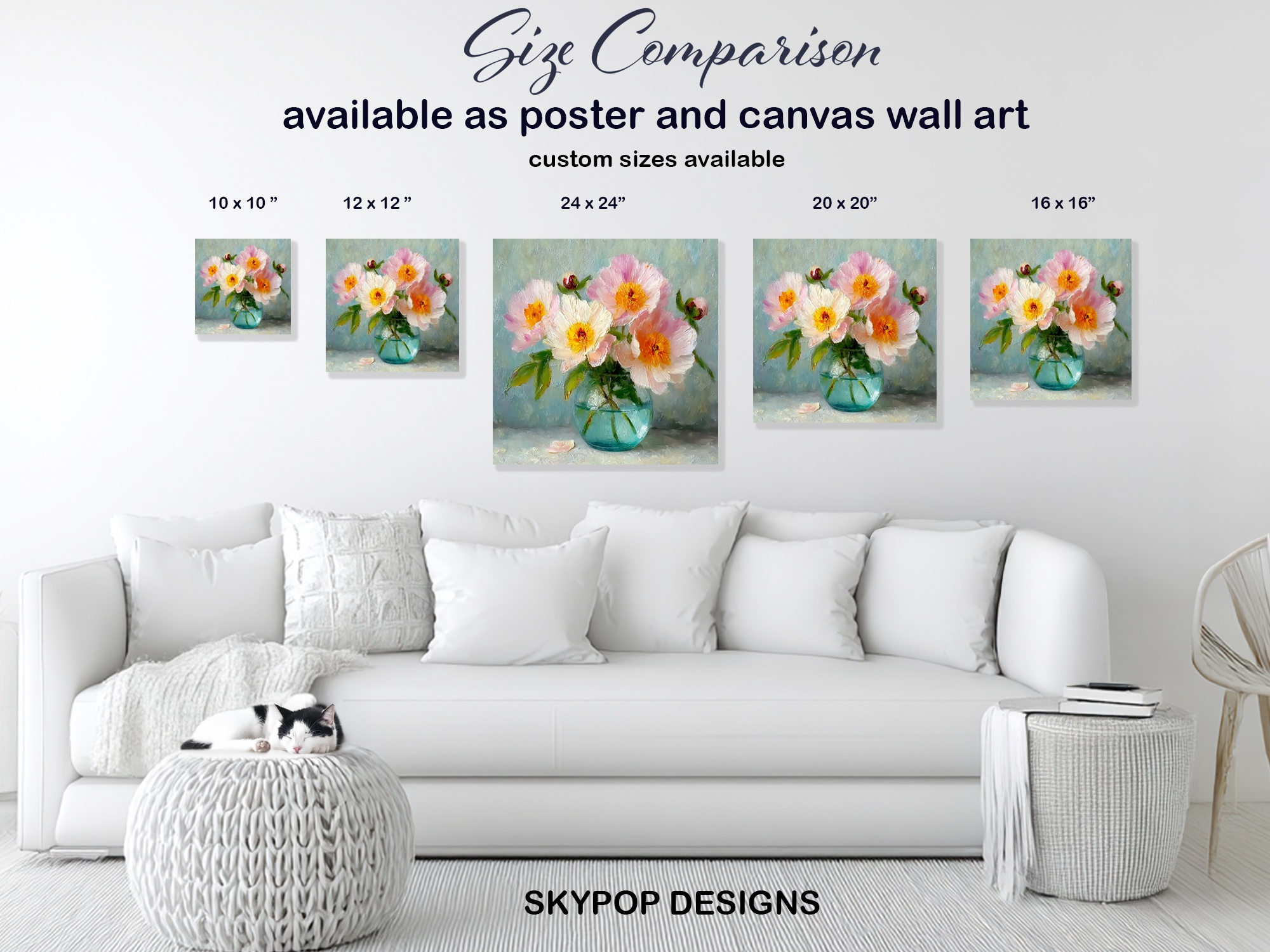 Bring the beauty of a spring garden into your home with this stunning peony bouquet canvas wall art. The delicate pink and white blooms burst with life against a soft, textured background, creating an instant focal point for any room. Perfect for shabby chic or French country interiors, this floral poster adds a touch of romance and elegance to living rooms, bedrooms, or dining areas. The impressionistic style captures the soft, dreamy quality of peonies in full bloom, with vibrant yellow centers adding a pop of sunshine to the composition. Ideal for those who love nature-inspired decor, this canvas art brings the outdoors in, creating a serene and uplifting atmosphere. The green leaves and stems provide a natural contrast, enhancing the overall freshness of the piece. Whether you’re looking to refresh your space for spring or add a timeless floral element to your year-round decor, this peony art is versatile enough to complement various color schemes. The high-quality printing ensures every brushstroke and petal is captured in vivid detail, making it a lasting addition to your wall art collection. Gift this beautiful canvas to a flower lover or use it to transform your own space into a blooming sanctuary. With its soft colors and romantic appeal, this peony bouquet art is sure to become a cherished centerpiece in any home.