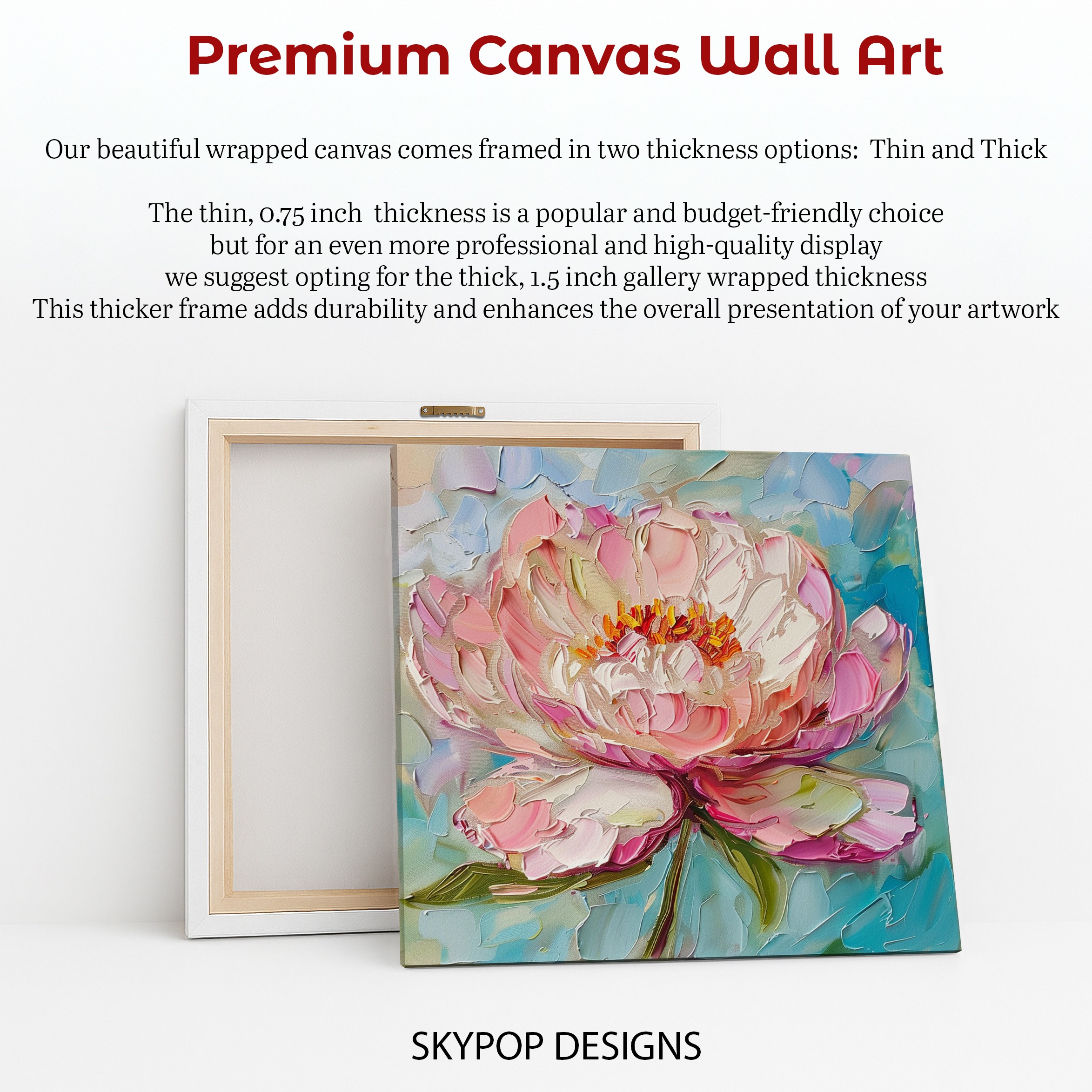 Celebrate the beauty of nature with this vibrant pink peony canvas wall art, a stunning piece that will transform your home decor. This poster or canvas wall art is perfect for adding a touch of floral elegance to modern living room wall decor or creating a serene bedroom atmosphere. The rich multicolor palette, dominated by soft pinks and energetic teals, evokes a sense of joy and tranquility, making it ideal for bohemian and contemporary settings. The thick, impressionistic brushstrokes give this peony artwork a captivating texture and depth, bringing the flower to life on your wall. This striking floral art piece is perfect for entryways or sunrooms, creating a welcoming and visually appealing space. The peony, symbolizing romance and prosperity, adds a touch of natural luxury to any room. High-quality printing ensures every detail of this peony flower poster is captured with incredible clarity, making it a true work of art. It’s a wonderful addition to any collection of wall art, adding a fresh and lively element. This canvas wall art is also an ideal gift for housewarmings, birthdays, or holidays, bringing lasting beauty to any recipient’s home. The combination of pink and teal colors creates a mood-lifting effect, enhancing the positive vibes in your living space. Elevate your interior design with this breathtaking pink peony canvas wall art that blends contemporary style with timeless floral beauty. Add a touch of nature’s artistry to your walls today with this exquisite peony artwork.