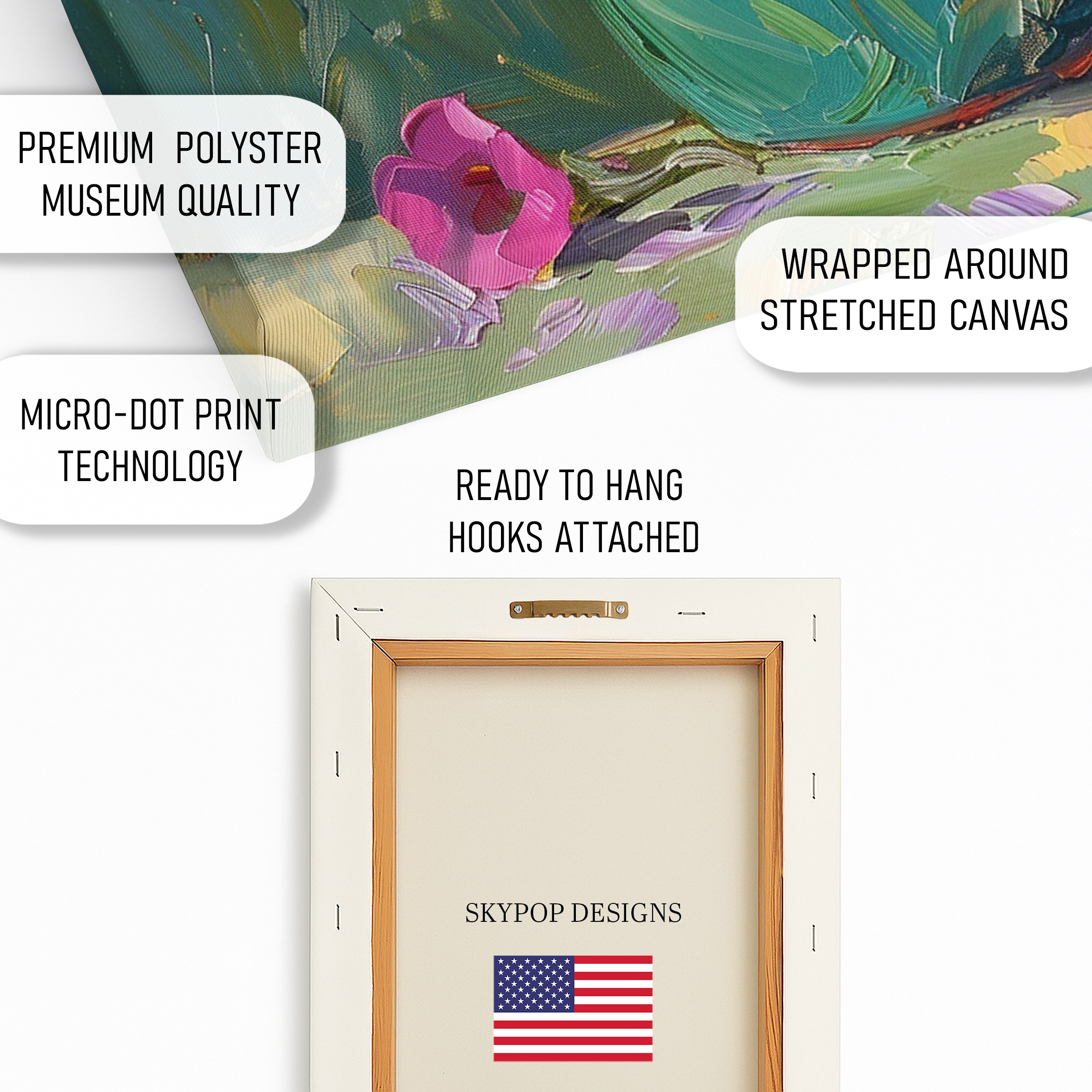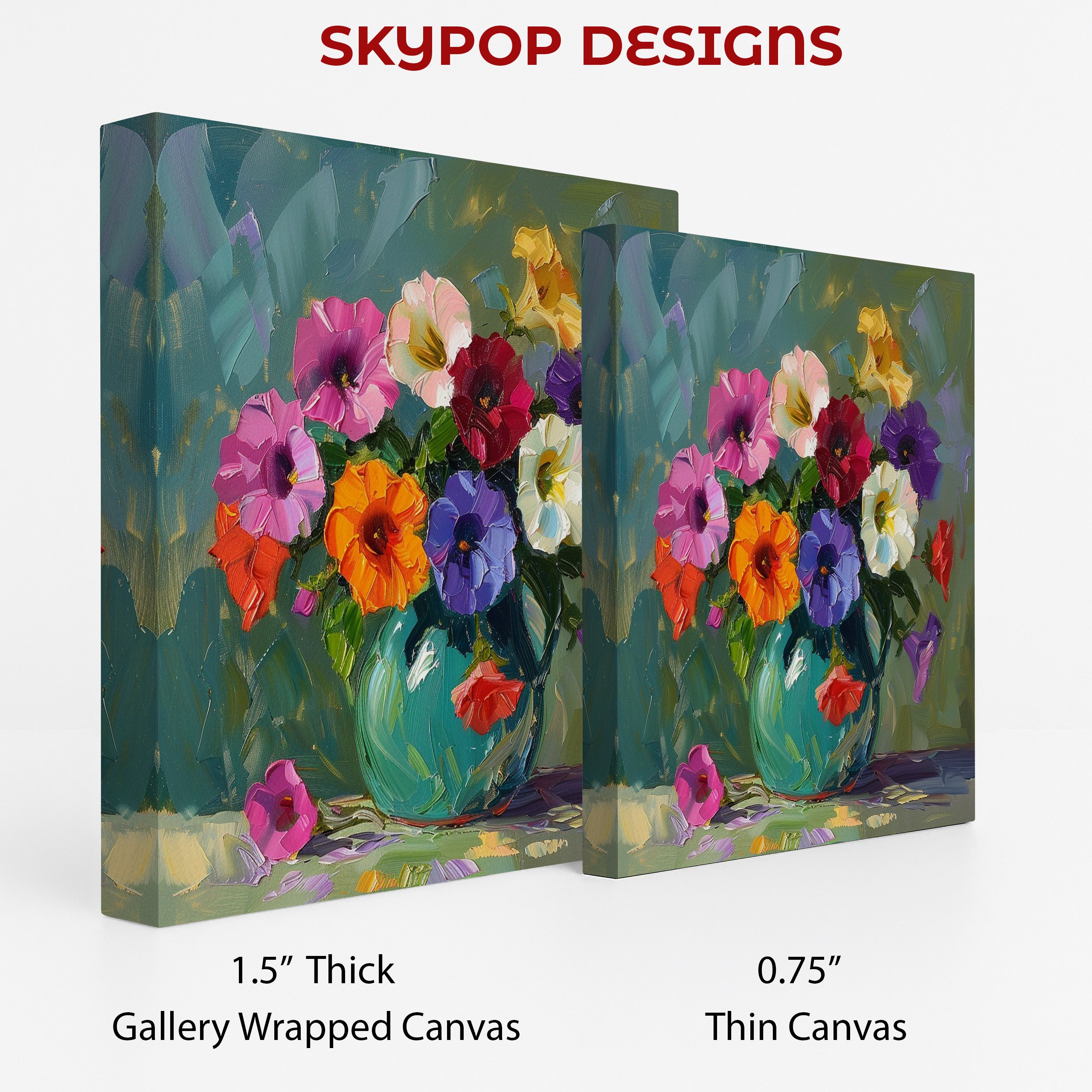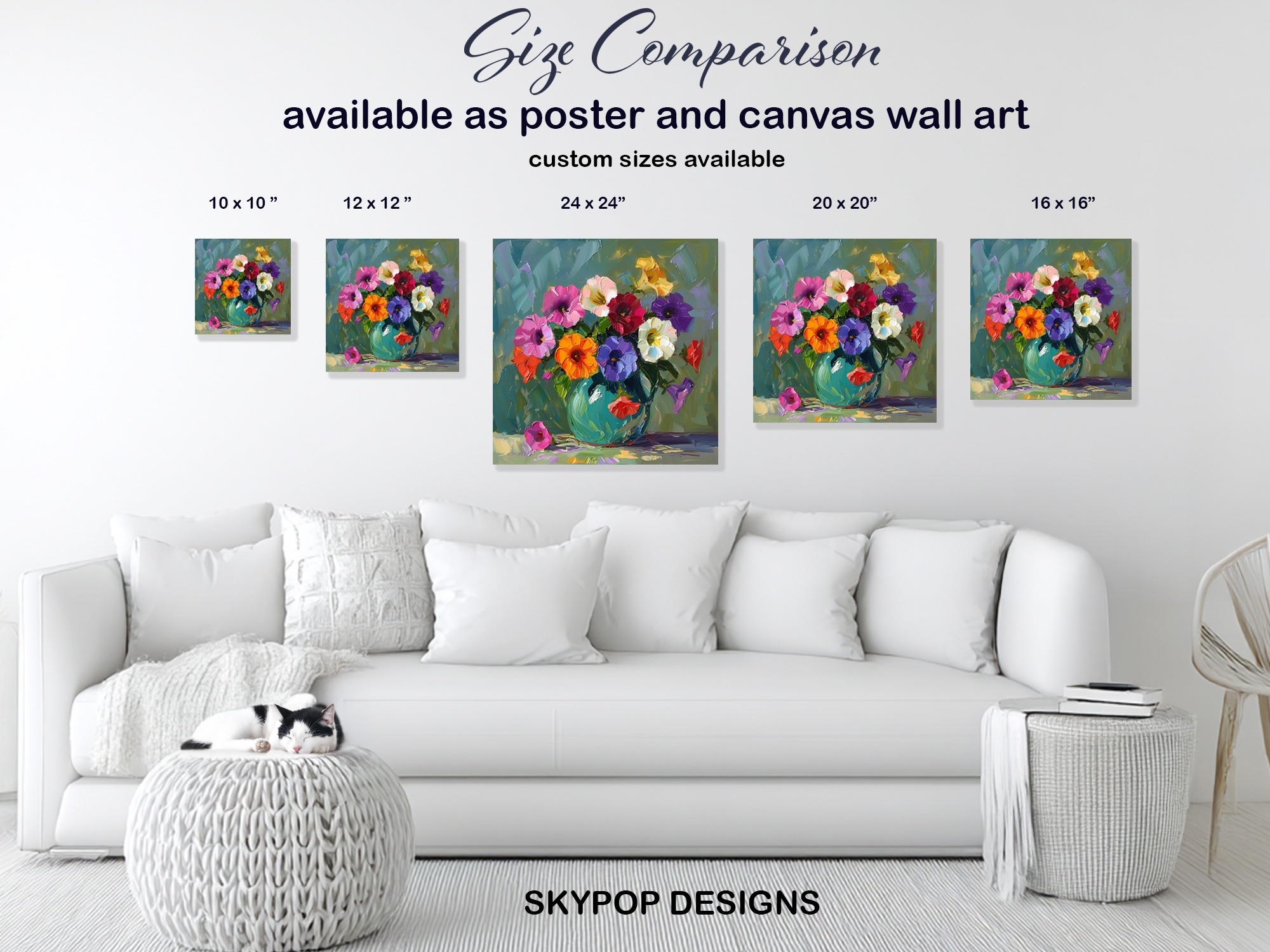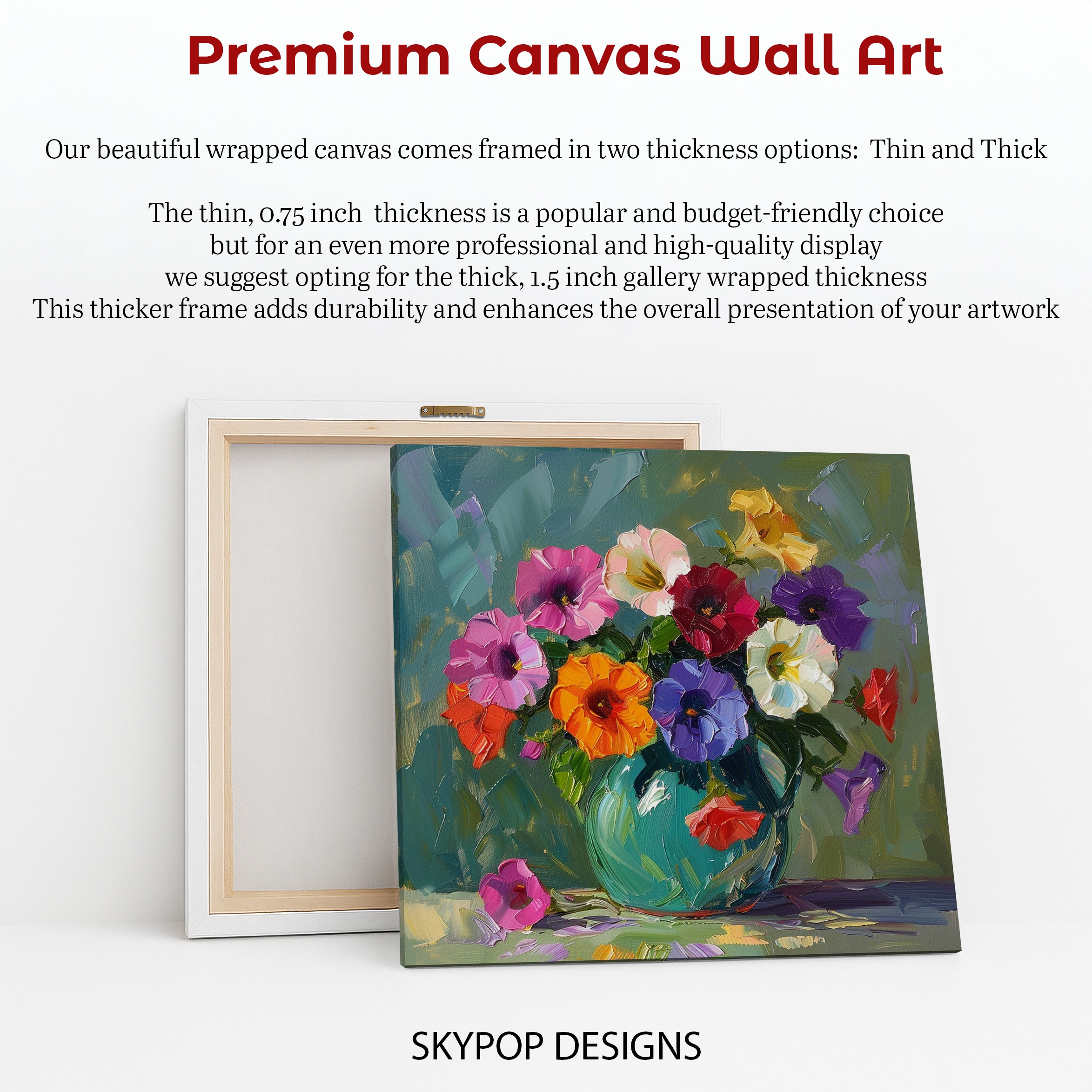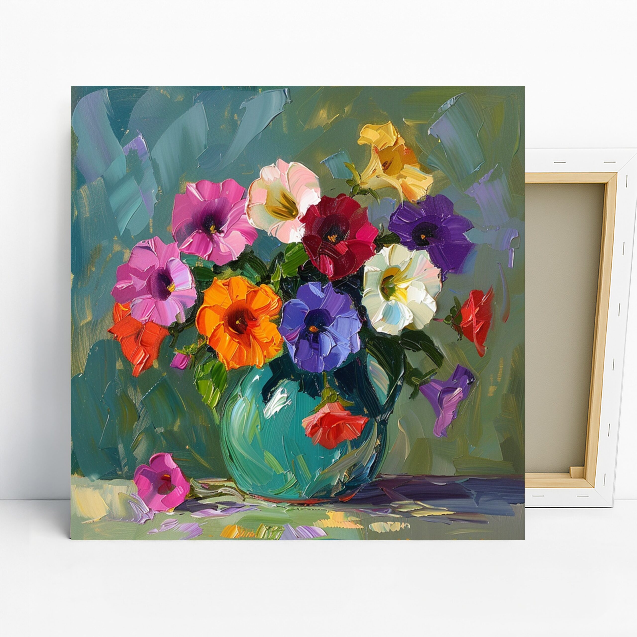 Brighten your home with this stunning Petunia canvas wall art, showcasing a lively bouquet of colorful petunias in a textured, impressionistic style. This eye-catching poster or canvas wall art is perfect for instantly enhancing modern living room decor and adding a cheerful focal point to any bedroom. The vibrant multicolor palette, featuring rich purples, oranges, pinks, and reds, bursts with energy against a teal and green backdrop, creating a captivating visual experience. Ideal for bohemian or coastal decor schemes, this floral artwork brings a touch of natural beauty and artistic flair to your walls. The thick, impasto brushstrokes give this canvas wall art a dynamic, almost sculptural quality, making each flower petal and leaf come alive. This versatile piece is also perfectly suited for dining rooms or entryways, setting a welcoming and joyful mood for all who enter. It makes a wonderful housewarming gift, birthday present, or holiday surprise for flower lovers and art enthusiasts. The blend of intense colors and the contemporary interpretation of a classic floral still life make this poster a trending home decor item. High-quality printing ensures the vibrant colors and rich textures are faithfully reproduced, delivering a museum-quality piece for your home. Elevate your space with this beautiful floral canvas art that celebrates the simple elegance of nature. Discover the transformative power of art and bring the outdoors in today with this exceptional Petunia Bouquet canvas wall art.
