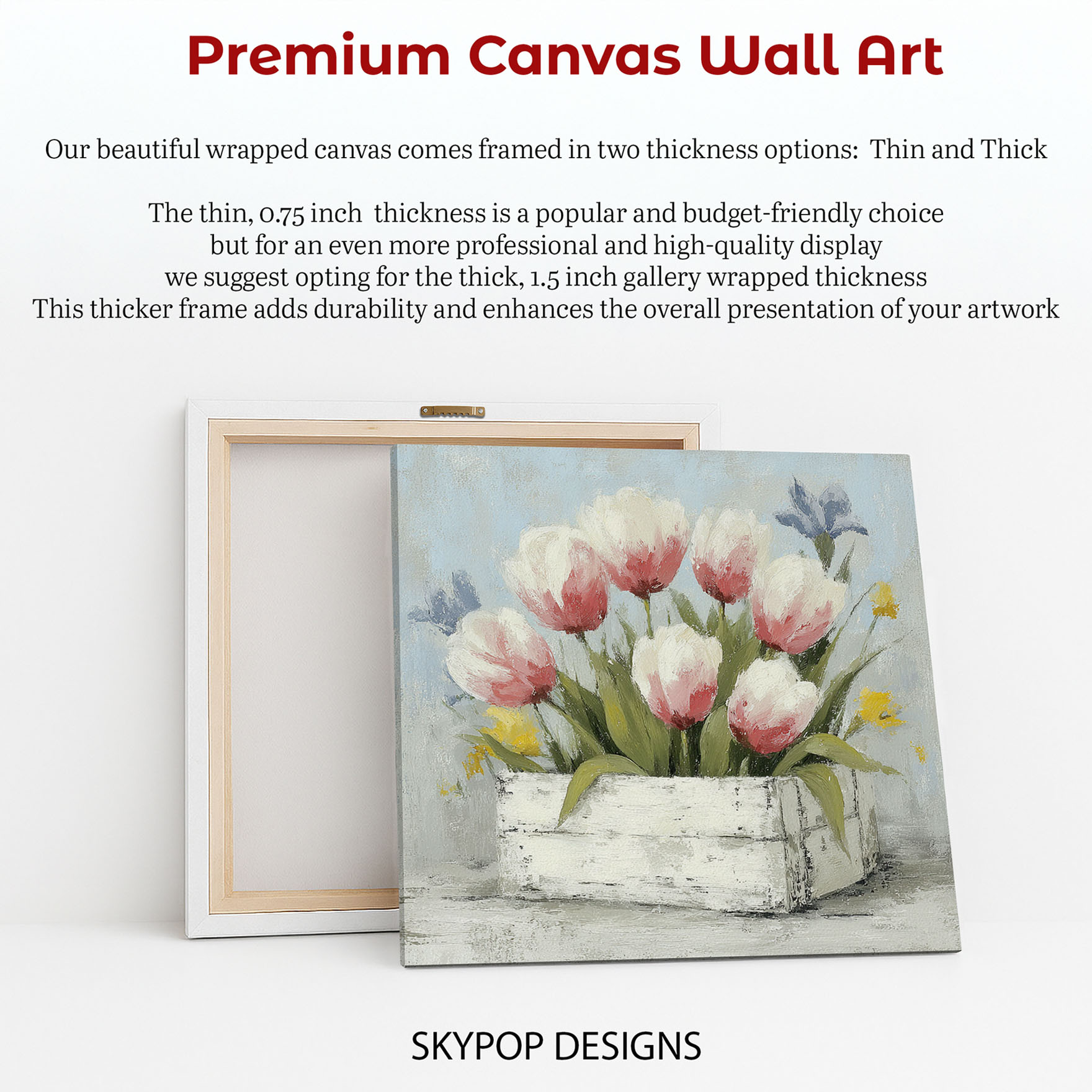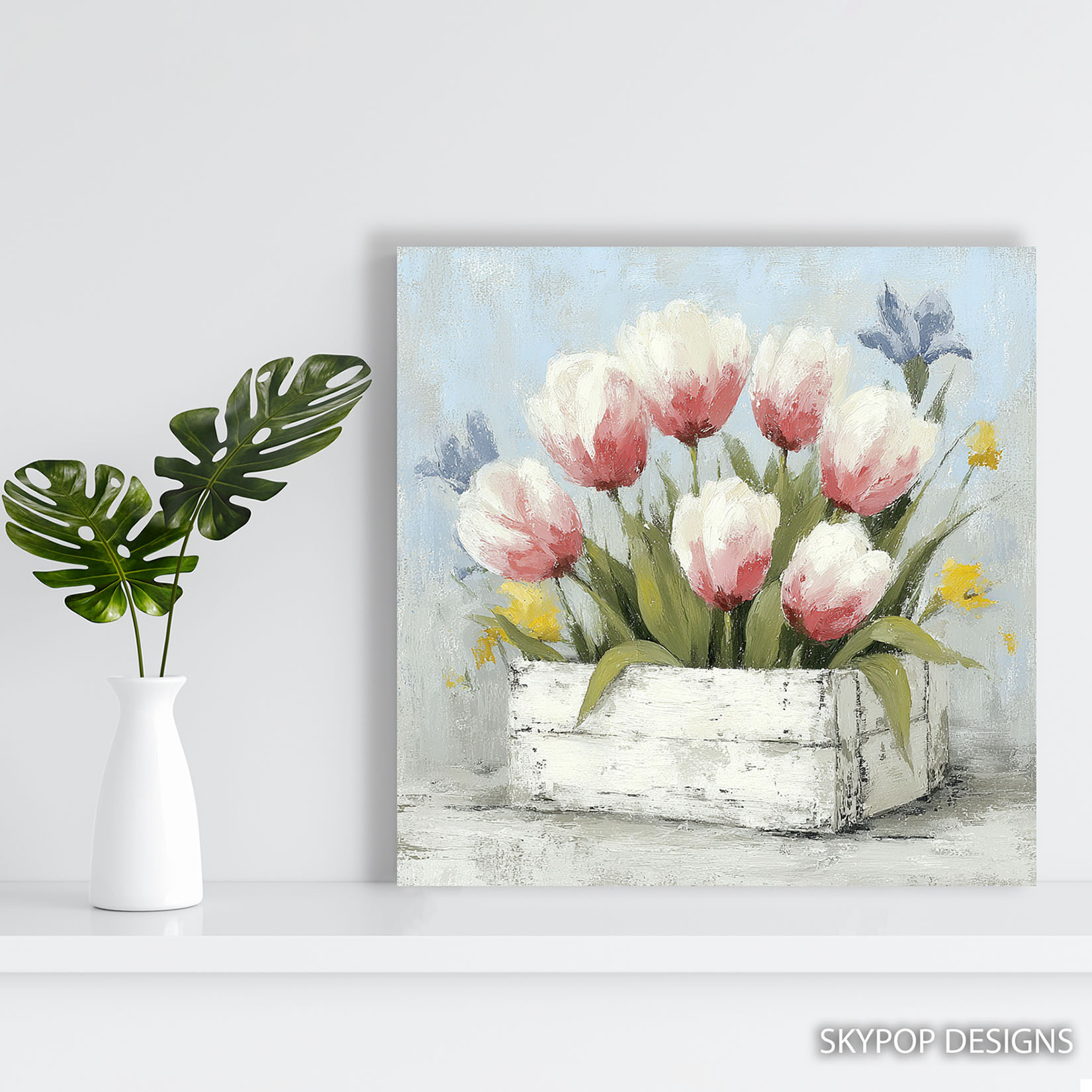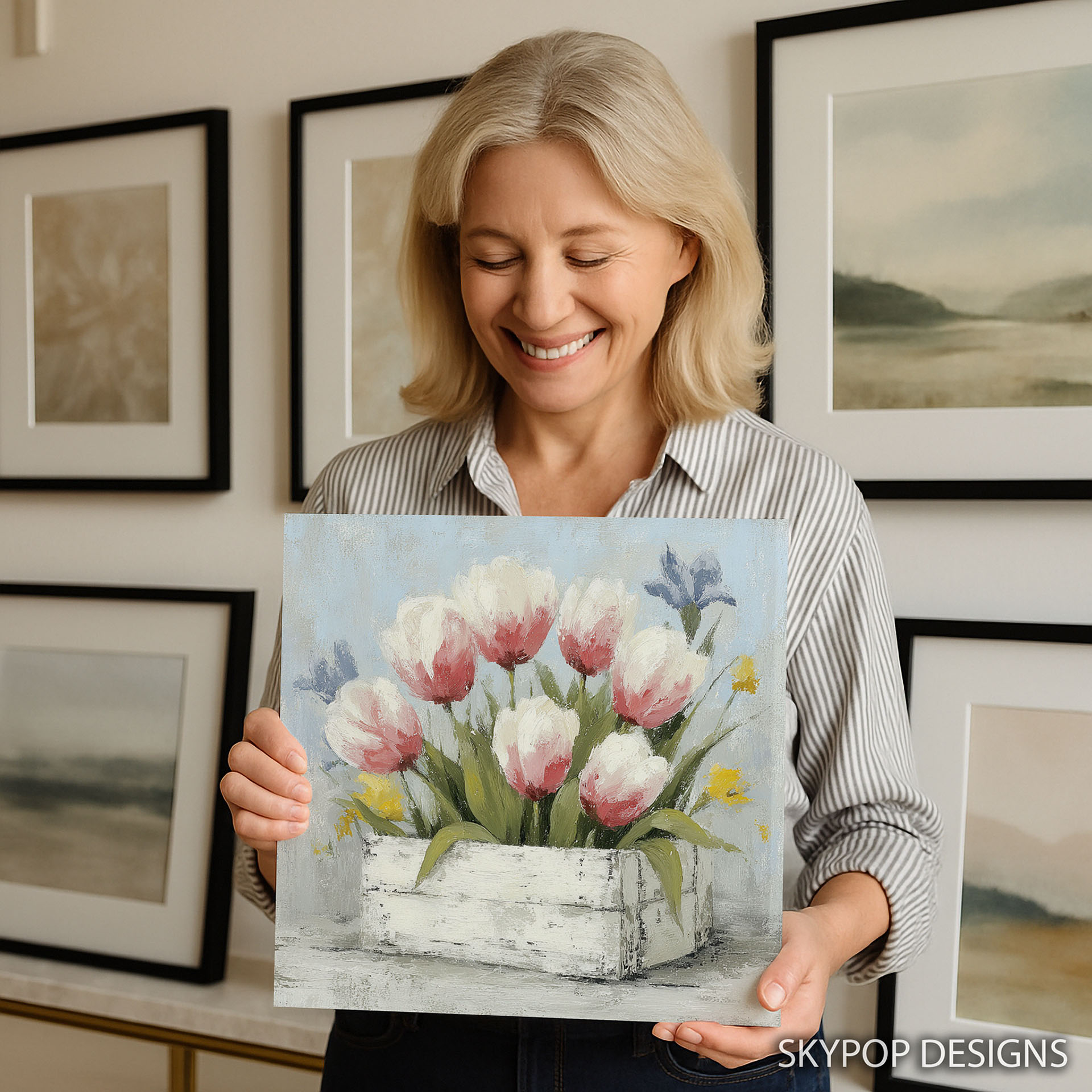 Transform your home with this delightful tulip canvas wall art that evokes the charm of a rustic farmhouse. This beautiful poster or canvas wall art features a vibrant arrangement of pink and white tulips in a distressed wooden crate, bringing a touch of nature indoors. The impressionistic style adds a soft, artistic feel, making it a perfect addition to living room decor or a cozy bedroom sanctuary. The gentle blues and yellows complement the dominant pinks and greens, creating a cheerful and inviting atmosphere. Ideal for country and shabby chic interiors, this floral artwork enhances any space with its timeless beauty. This captivating canvas wall art celebrates the simple elegance of spring blooms, perfect for bringing a sense of freshness to your kitchen or dining room. The textured brushstrokes of the impressionist style create depth and visual interest, ensuring this poster or canvas wall art is a stunning focal point. Whether displayed as a statement piece or part of a curated gallery wall, this artwork adds a warm and welcoming touch. It’s also a wonderful gift for housewarmings, birthdays, or any occasion, bringing lasting joy to loved ones. Elevate your home decor with this exquisite floral art that perfectly captures the spirit of a blooming garden. Discover the joy of beautiful wall art that transforms your everyday living. Add this charming tulip canvas art to your collection and embrace the beauty of nature today.