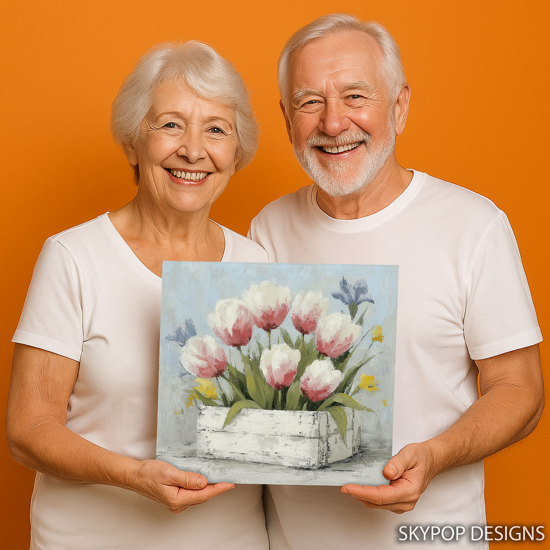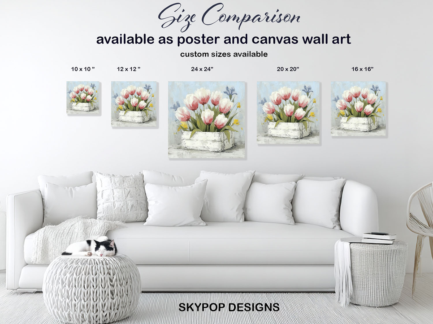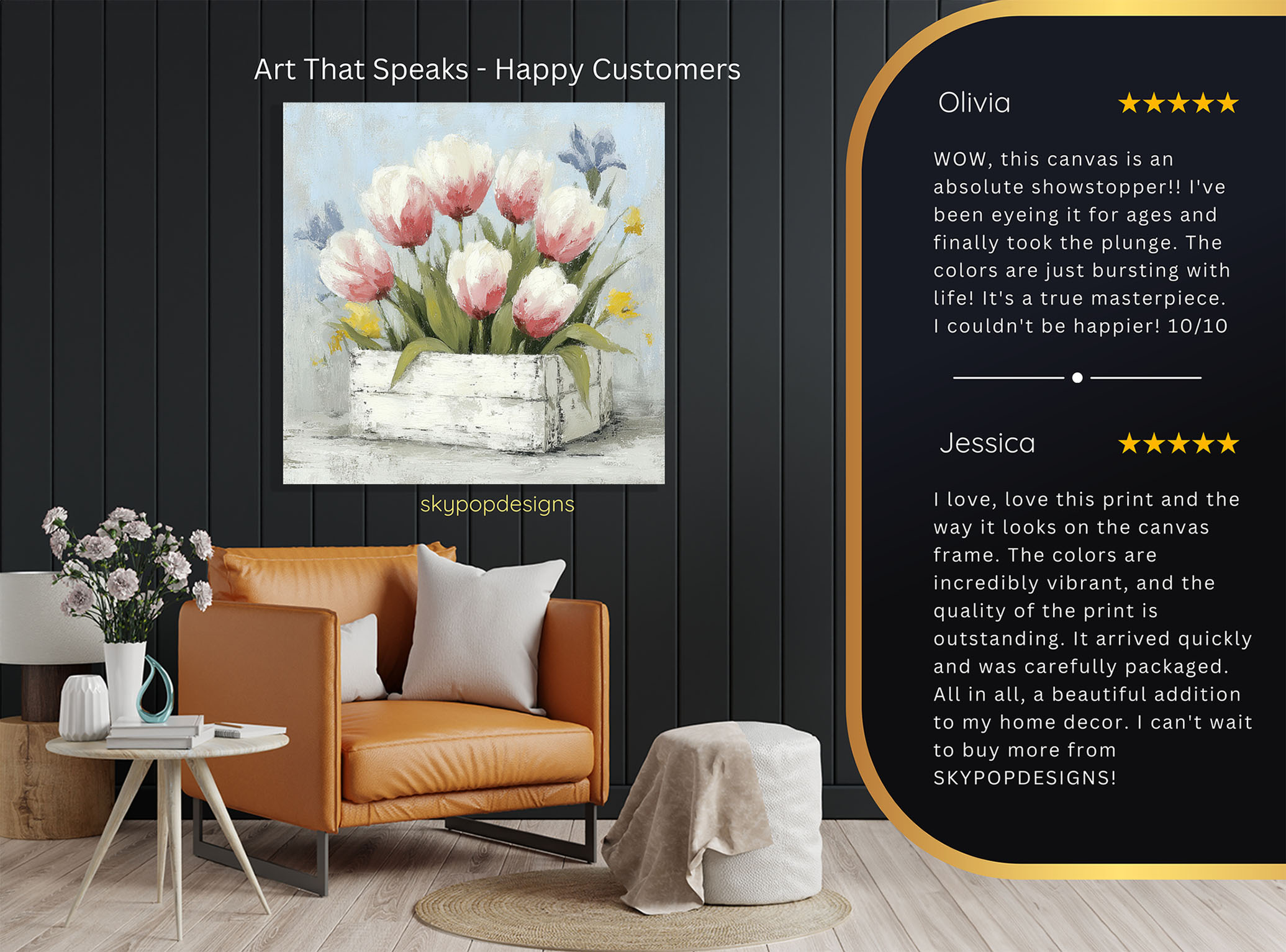 Transform your home with this delightful tulip canvas wall art that evokes the charm of a rustic farmhouse. This beautiful poster or canvas wall art features a vibrant arrangement of pink and white tulips in a distressed wooden crate, bringing a touch of nature indoors. The impressionistic style adds a soft, artistic feel, making it a perfect addition to living room decor or a cozy bedroom sanctuary. The gentle blues and yellows complement the dominant pinks and greens, creating a cheerful and inviting atmosphere. Ideal for country and shabby chic interiors, this floral artwork enhances any space with its timeless beauty. This captivating canvas wall art celebrates the simple elegance of spring blooms, perfect for bringing a sense of freshness to your kitchen or dining room. The textured brushstrokes of the impressionist style create depth and visual interest, ensuring this poster or canvas wall art is a stunning focal point. Whether displayed as a statement piece or part of a curated gallery wall, this artwork adds a warm and welcoming touch. It’s also a wonderful gift for housewarmings, birthdays, or any occasion, bringing lasting joy to loved ones. Elevate your home decor with this exquisite floral art that perfectly captures the spirit of a blooming garden. Discover the joy of beautiful wall art that transforms your everyday living. Add this charming tulip canvas art to your collection and embrace the beauty of nature today.