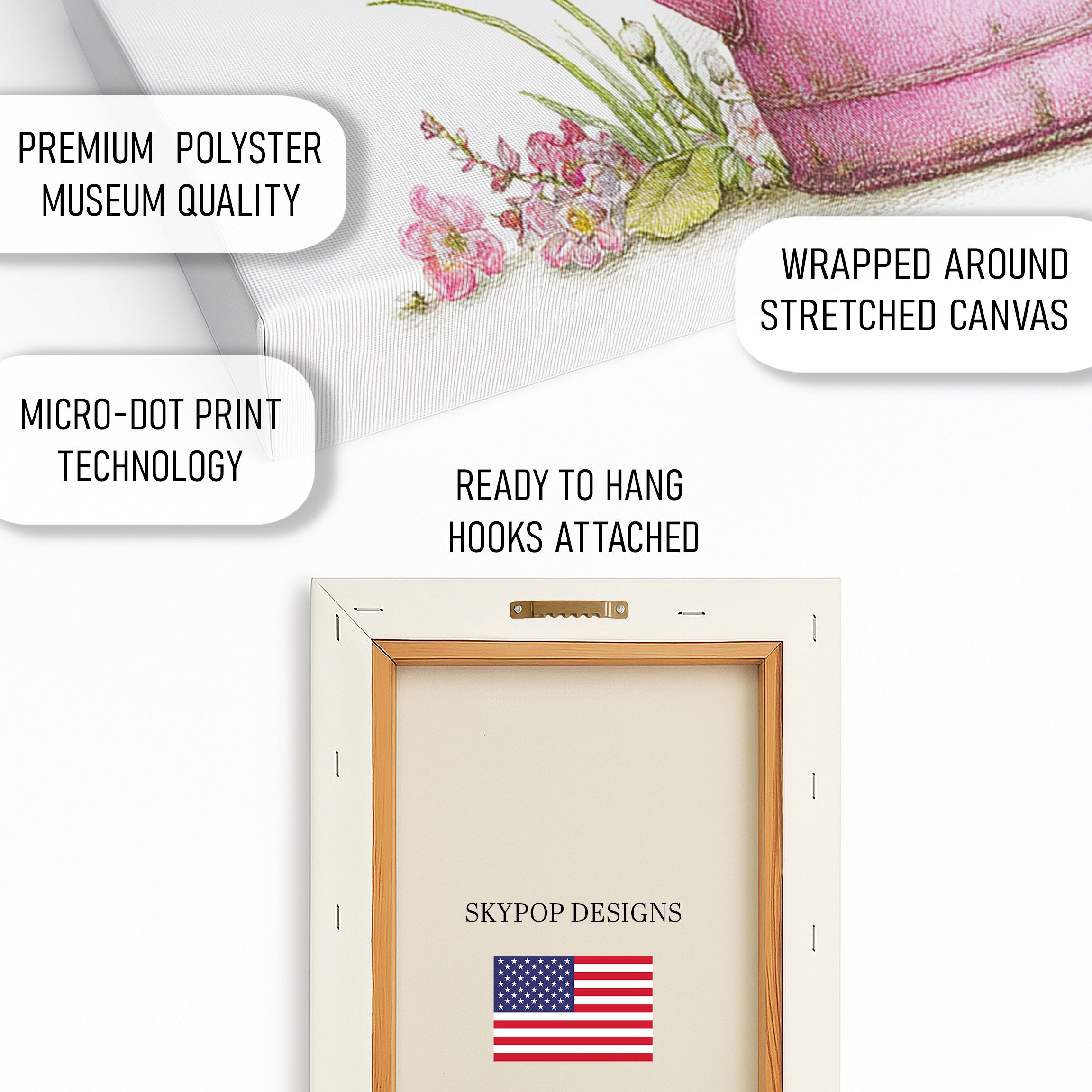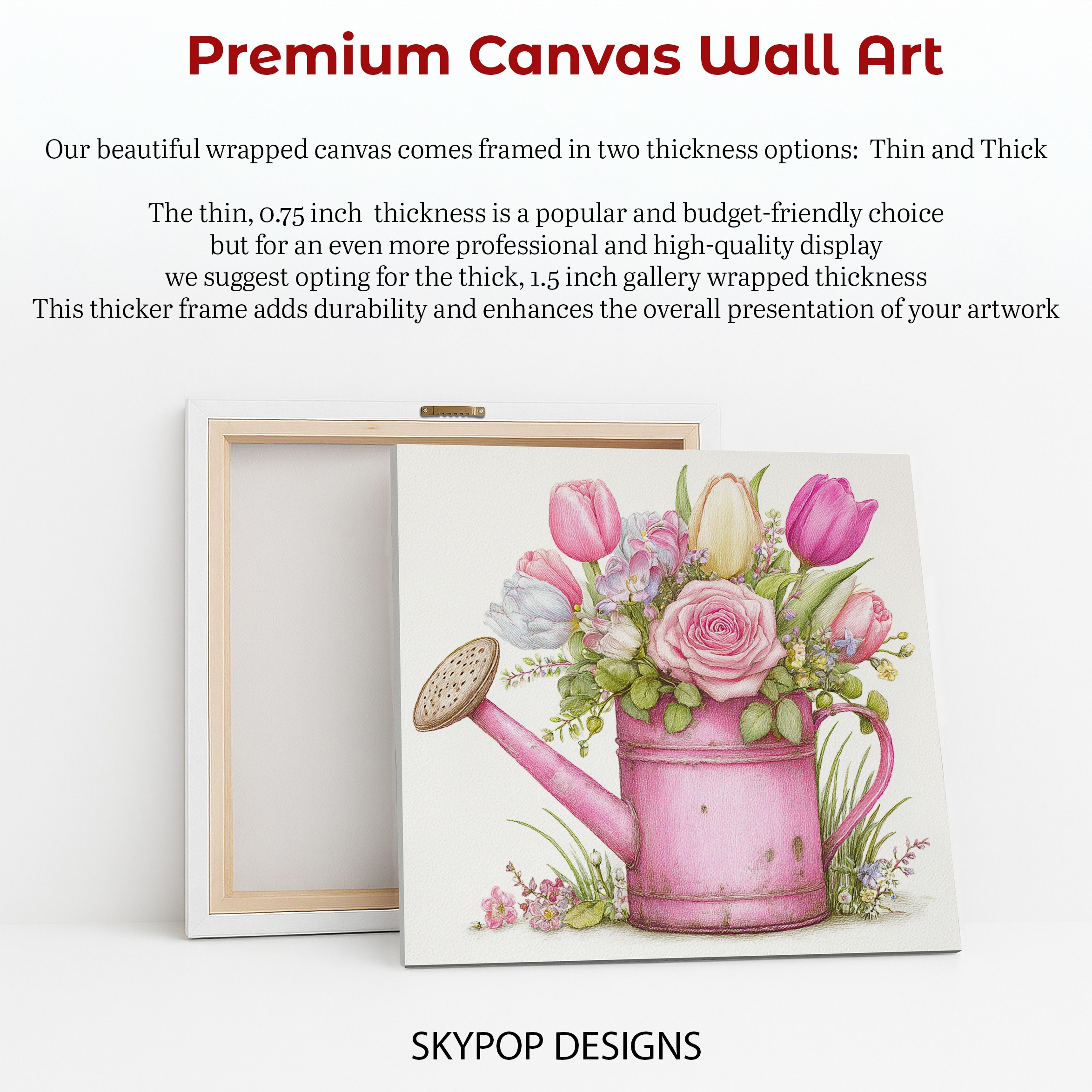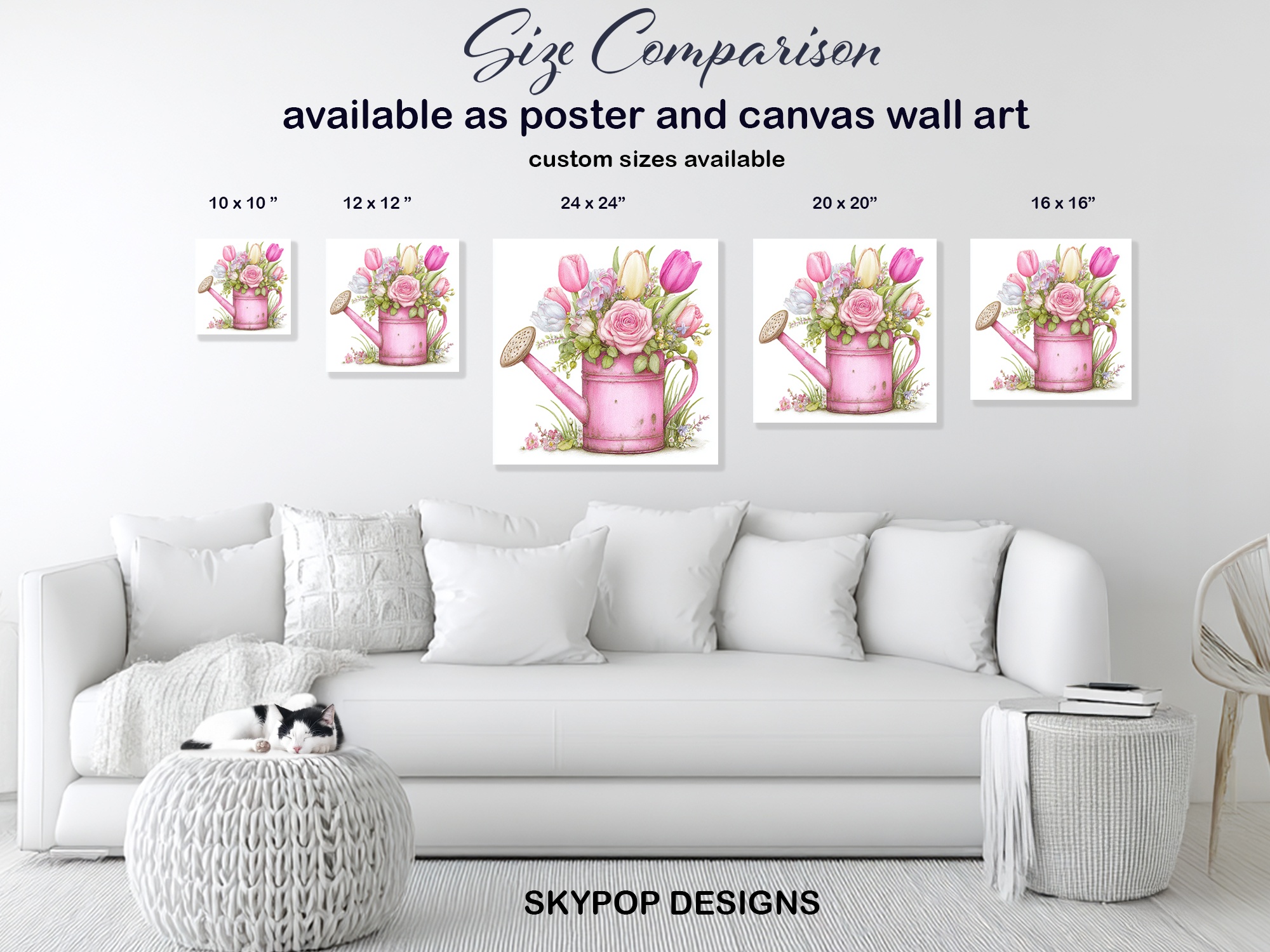 Bring the charm of a spring garden into your home with this delightful pink watering can flower canvas wall art. This captivating poster showcases a vintage-inspired pink watering can overflowing with a lush bouquet of tulips, roses, and wildflowers. Perfect for adding a touch of romance to your shabby chic bedroom or bringing a splash of color to your farmhouse-style living room. The soft, pastel color palette of pinks, purples, and greens creates a soothing atmosphere, ideal for spaces where you want to relax and unwind. This versatile canvas art piece works beautifully as a focal point in a country-style dining room or as a cheerful addition to a cottage-inspired bathroom. The intricate details of the flowers and leaves, rendered in a watercolor-like style, give depth and texture to the artwork, making it a conversation starter. Whether you’re looking for the perfect housewarming gift or wanting to refresh your own space for spring, this floral wall art is sure to delight. The high-quality print captures every delicate petal and leaf, ensuring this piece will be a treasured part of your decor for years to come. Transform your room today with this enchanting blend of vintage charm and natural beauty, celebrating the simple joys of gardening and flowers.