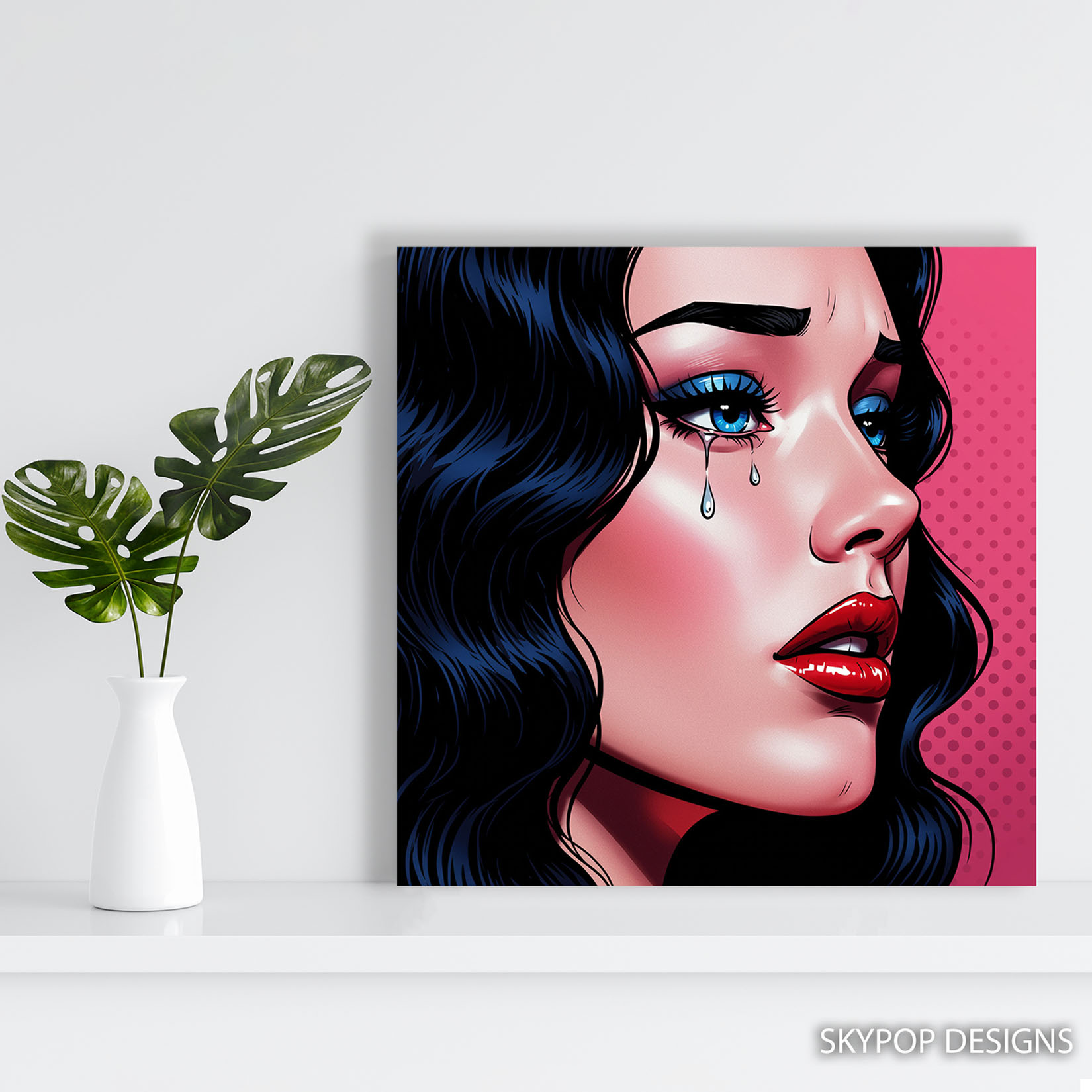 Transform your space with this striking Pop Art canvas wall art featuring a dramatic close-up of a woman’s face with vibrant blue eyes and bold red lips. This captivating poster or canvas wall art instantly elevates any room, creating a focal point with its intense gaze and flowing dark hair. The bright pink background with subtle polka dots adds a playful yet sophisticated touch, embodying contemporary and glam decor styles. Perfect for modern living rooms, stylish bedrooms, or a curated office space, this figurative art piece sparks conversation and evokes emotion. The stark contrast between the blue eyes, red lips, and pink backdrop creates a visually engaging piece that speaks to resilience and strength. This artwork is ideal for those who appreciate bold statement pieces and the iconic aesthetic of Pop Art. High-quality printing ensures the vivid colors and sharp lines of this canvas wall art are preserved, offering a luxurious feel. It serves as a thoughtful gift for birthdays, holidays, or housewarmings, adding a unique flair to any home. Enhance your decor with this emotionally resonant piece that celebrates feminine beauty and modern art trends. Elevate your home’s aesthetic with this versatile poster or canvas wall art, designed to inspire and captivate. Make a bold statement with this unforgettable Pop Art Tears canvas art today.