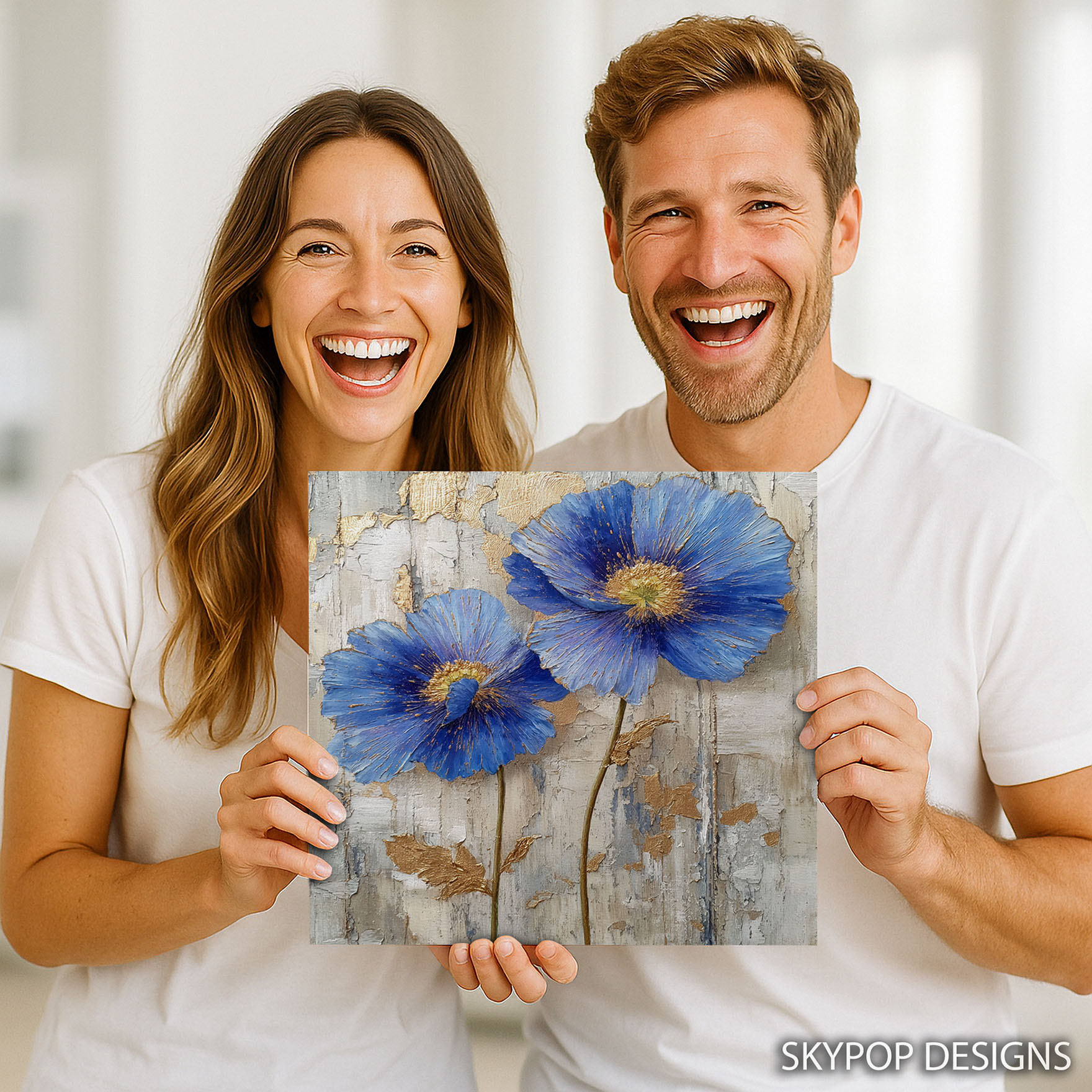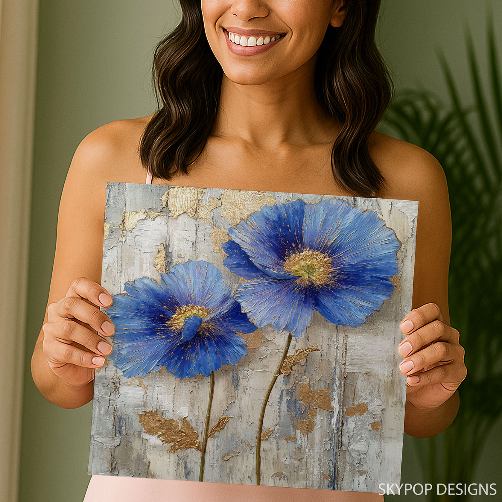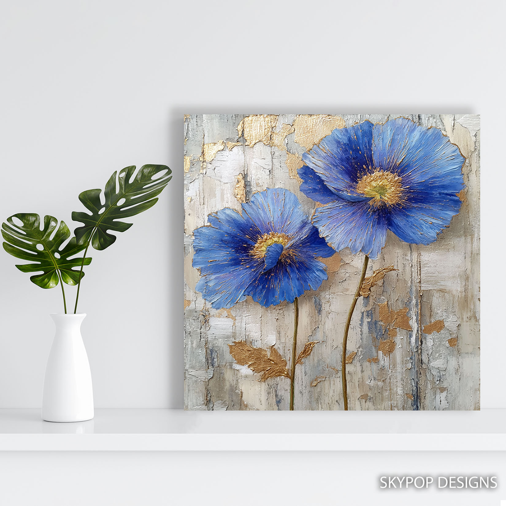 Transform your space with this stunning blue poppy canvas wall art, a piece that radiates vibrant energy and sophisticated charm. This poster or canvas wall art is ideal for enhancing modern living room decor or adding a touch of glamour to your bedroom. The striking blue poppies, accented with shimmering gold details on a textured grey and white background, create a captivating focal point for any room. Perfect for contemporary and glam interiors, this floral artwork brings a sense of luxury and artistic flair. The impressionistic style captures the essence of the flowers with expressive brushstrokes, making this canvas wall art a true statement piece. High-quality printing ensures every intricate detail and textural element of this floral art is vividly represented. This versatile wall art is perfect for dining rooms or entryways, setting an uplifting and elegant mood. It makes a wonderful housewarming, birthday, or holiday gift for anyone who appreciates fine art and statement decor. The bold color palette complements a range of interior styles, adding a pop of vibrant blue and subtle gold to create a memorable aesthetic. Elevate your home with this exquisite poppy canvas wall art, a piece designed to inspire and delight daily. Add timeless beauty and modern elegance to your wall art collection today.