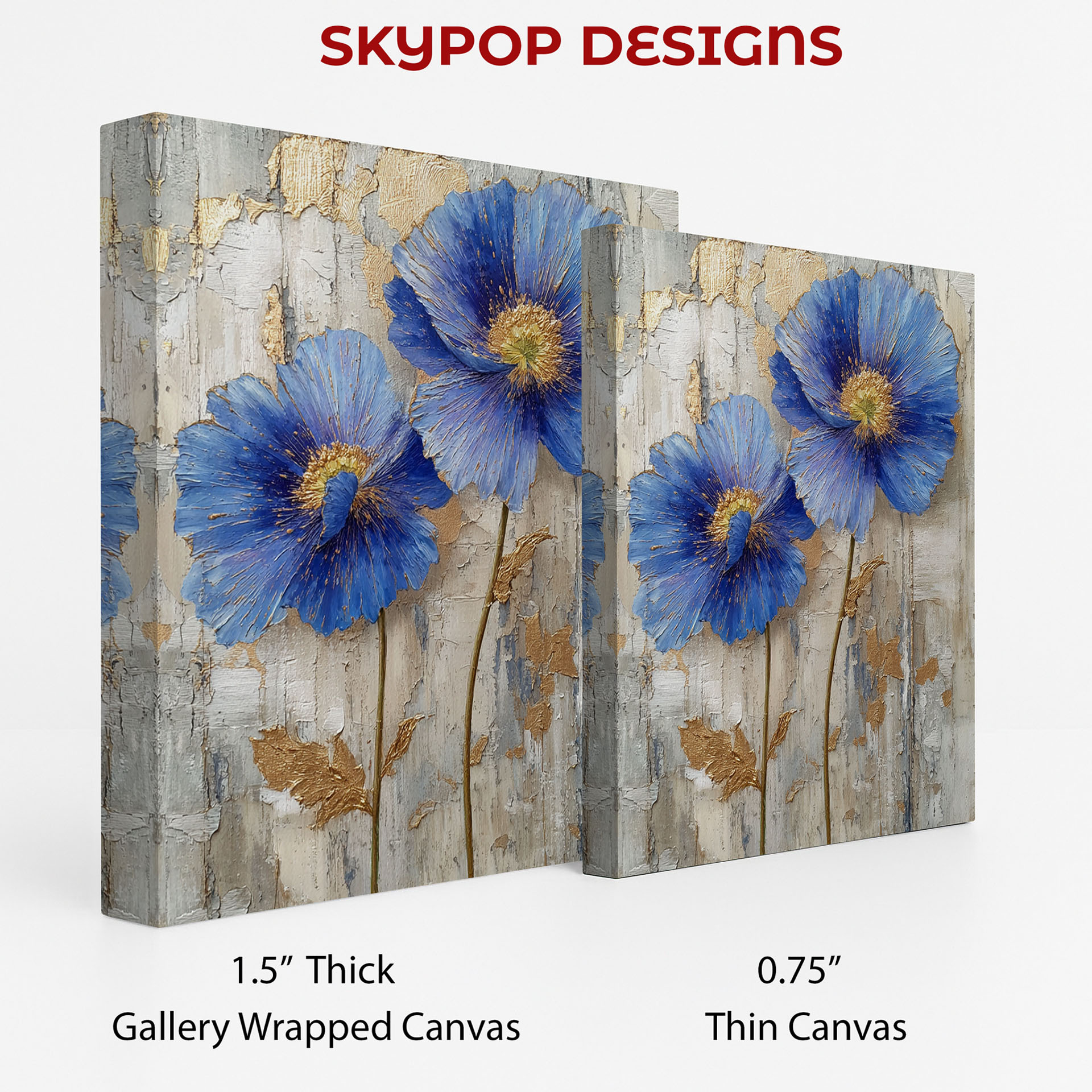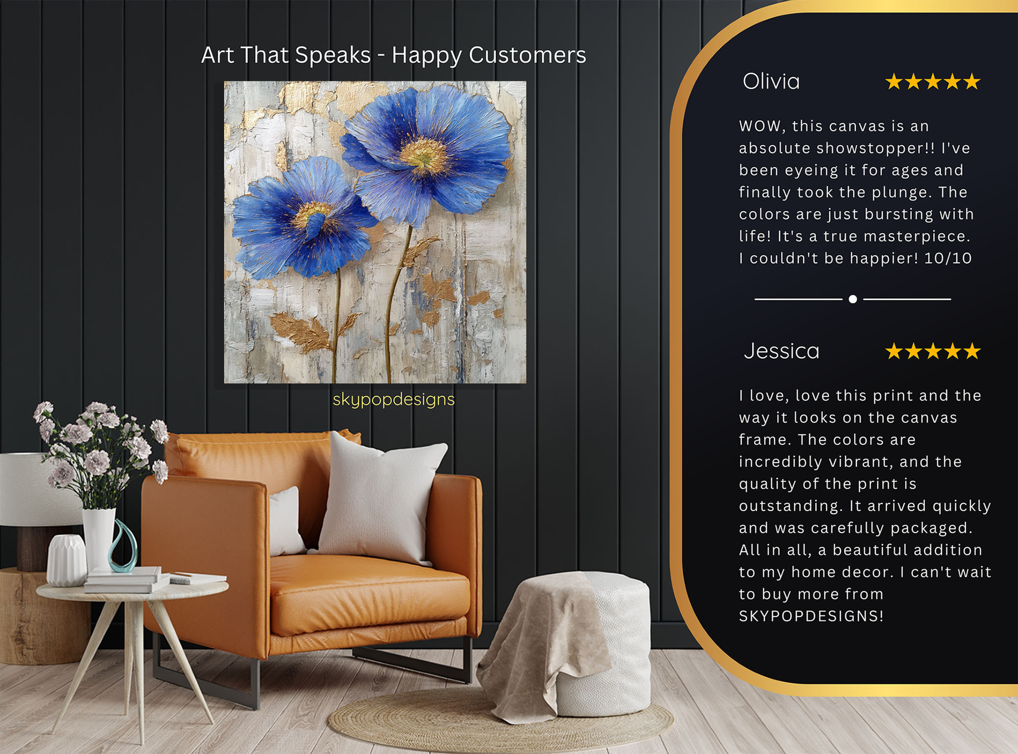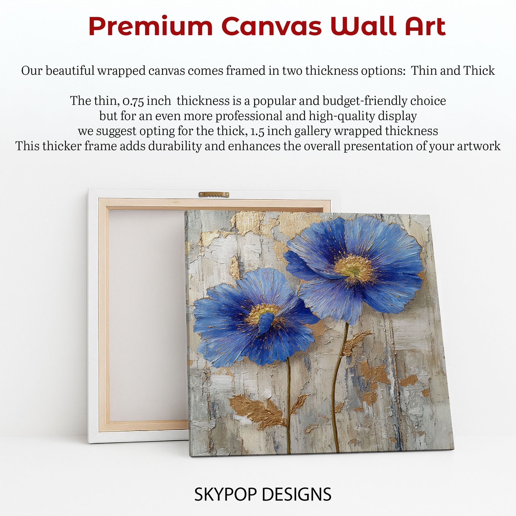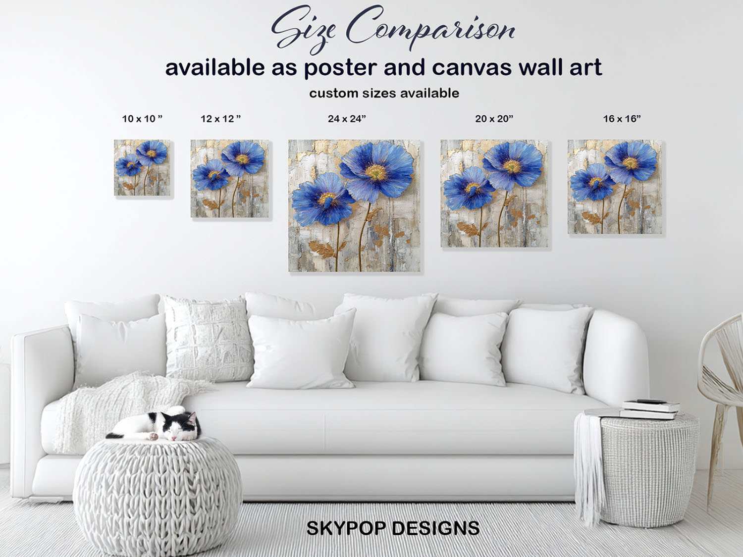 Transform your space with this stunning blue poppy canvas wall art, a piece that radiates vibrant energy and sophisticated charm. This poster or canvas wall art is ideal for enhancing modern living room decor or adding a touch of glamour to your bedroom. The striking blue poppies, accented with shimmering gold details on a textured grey and white background, create a captivating focal point for any room. Perfect for contemporary and glam interiors, this floral artwork brings a sense of luxury and artistic flair. The impressionistic style captures the essence of the flowers with expressive brushstrokes, making this canvas wall art a true statement piece. High-quality printing ensures every intricate detail and textural element of this floral art is vividly represented. This versatile wall art is perfect for dining rooms or entryways, setting an uplifting and elegant mood. It makes a wonderful housewarming, birthday, or holiday gift for anyone who appreciates fine art and statement decor. The bold color palette complements a range of interior styles, adding a pop of vibrant blue and subtle gold to create a memorable aesthetic. Elevate your home with this exquisite poppy canvas wall art, a piece designed to inspire and delight daily. Add timeless beauty and modern elegance to your wall art collection today.