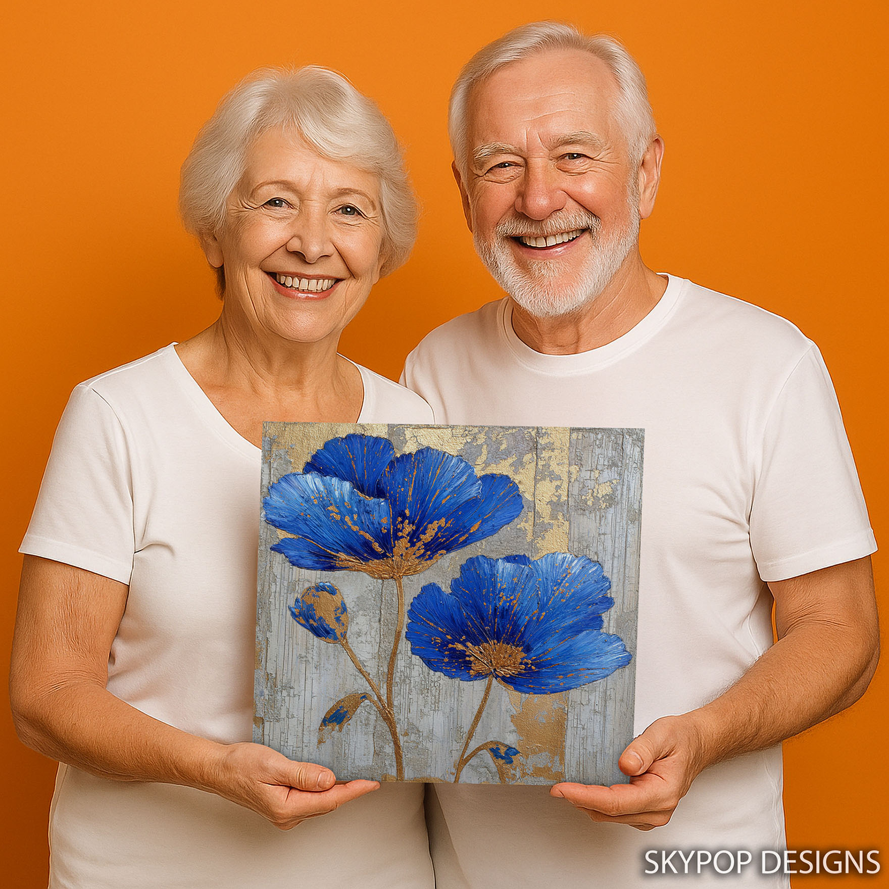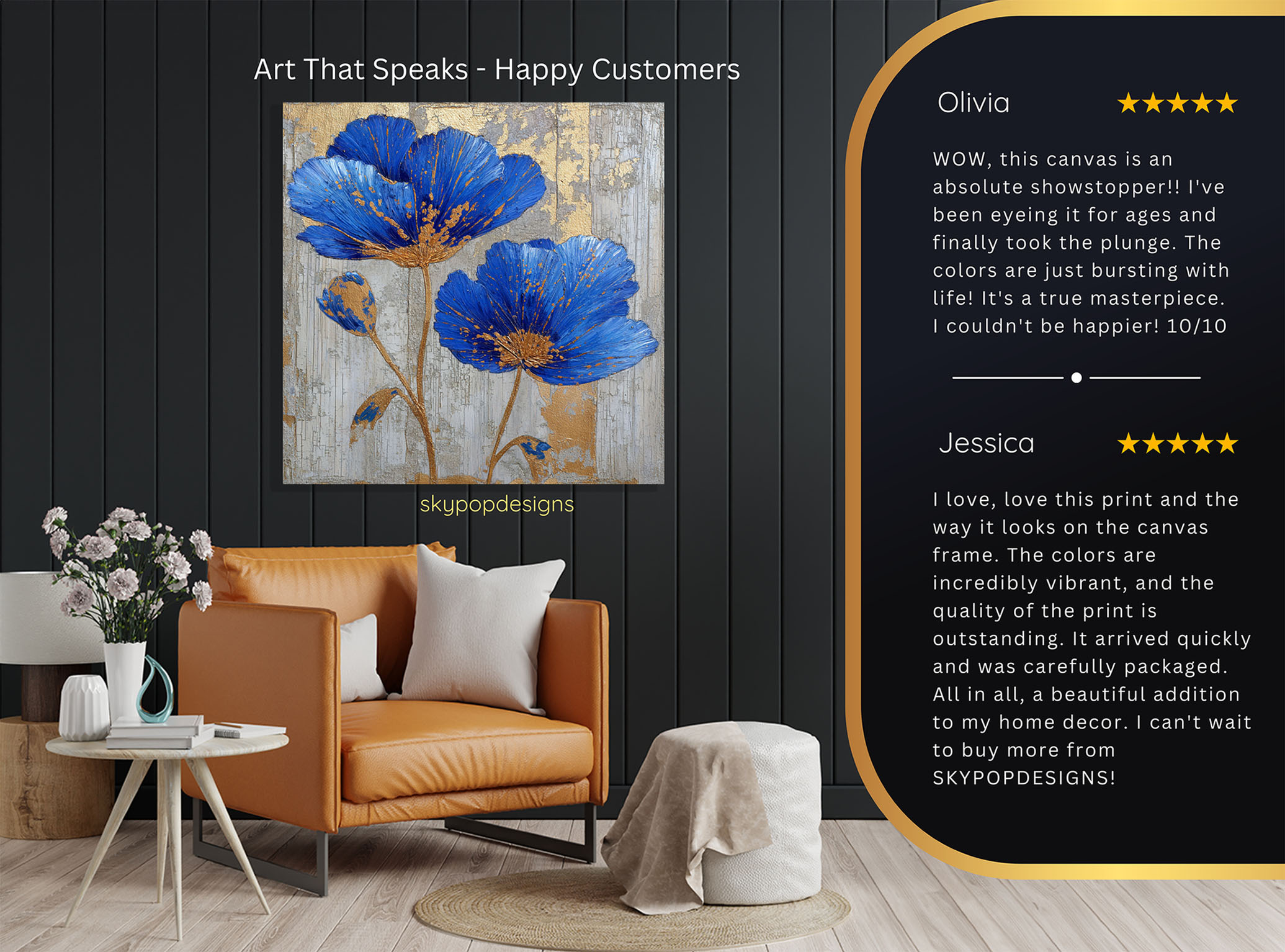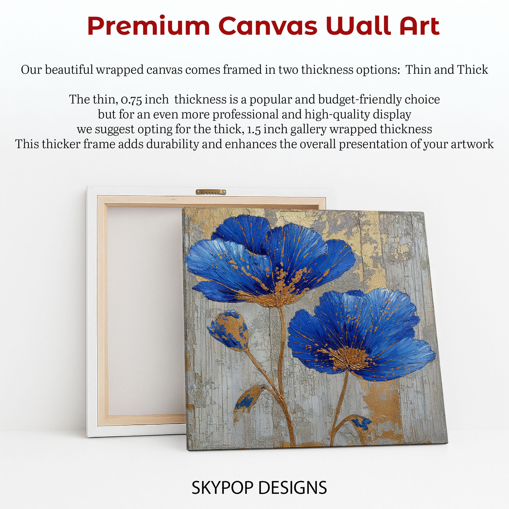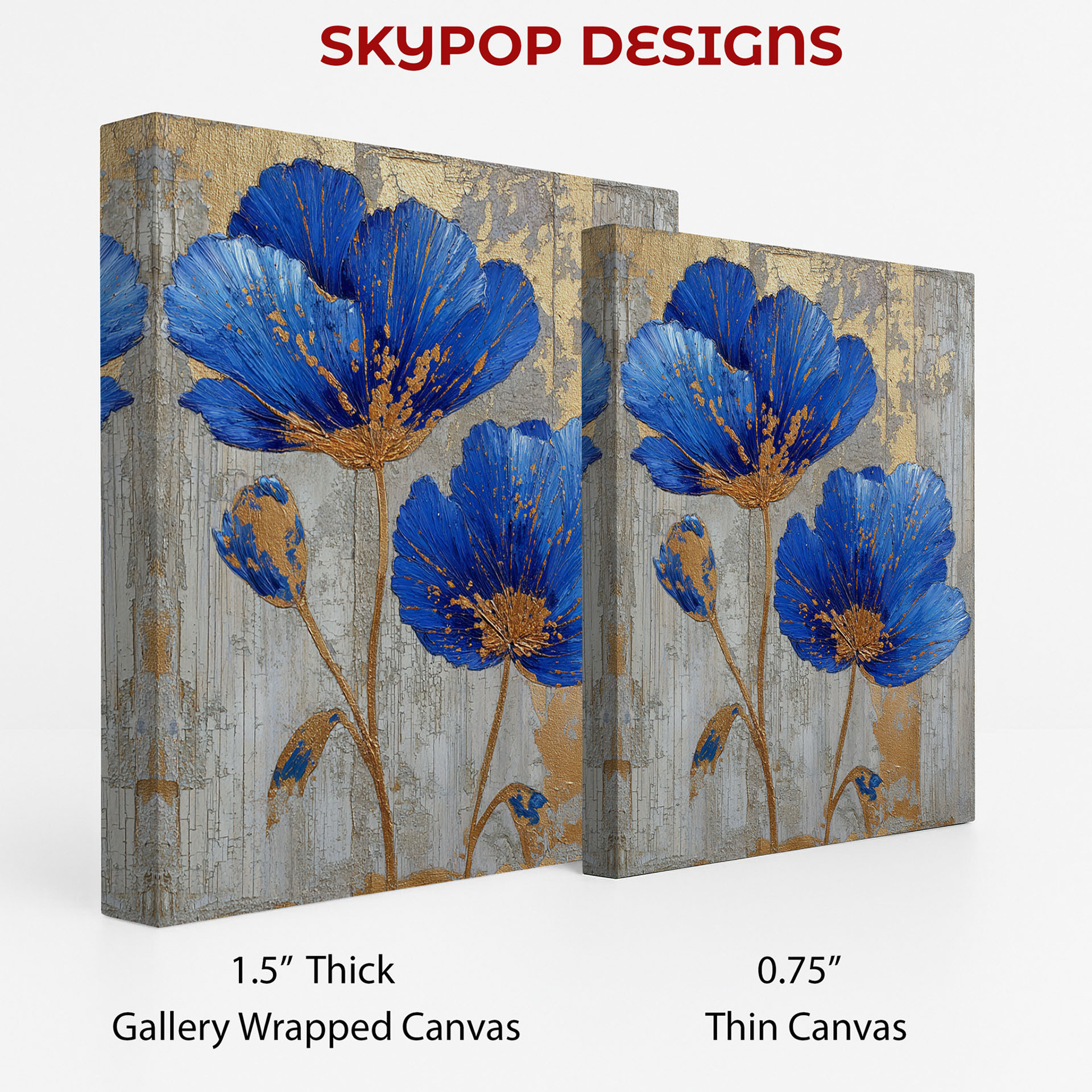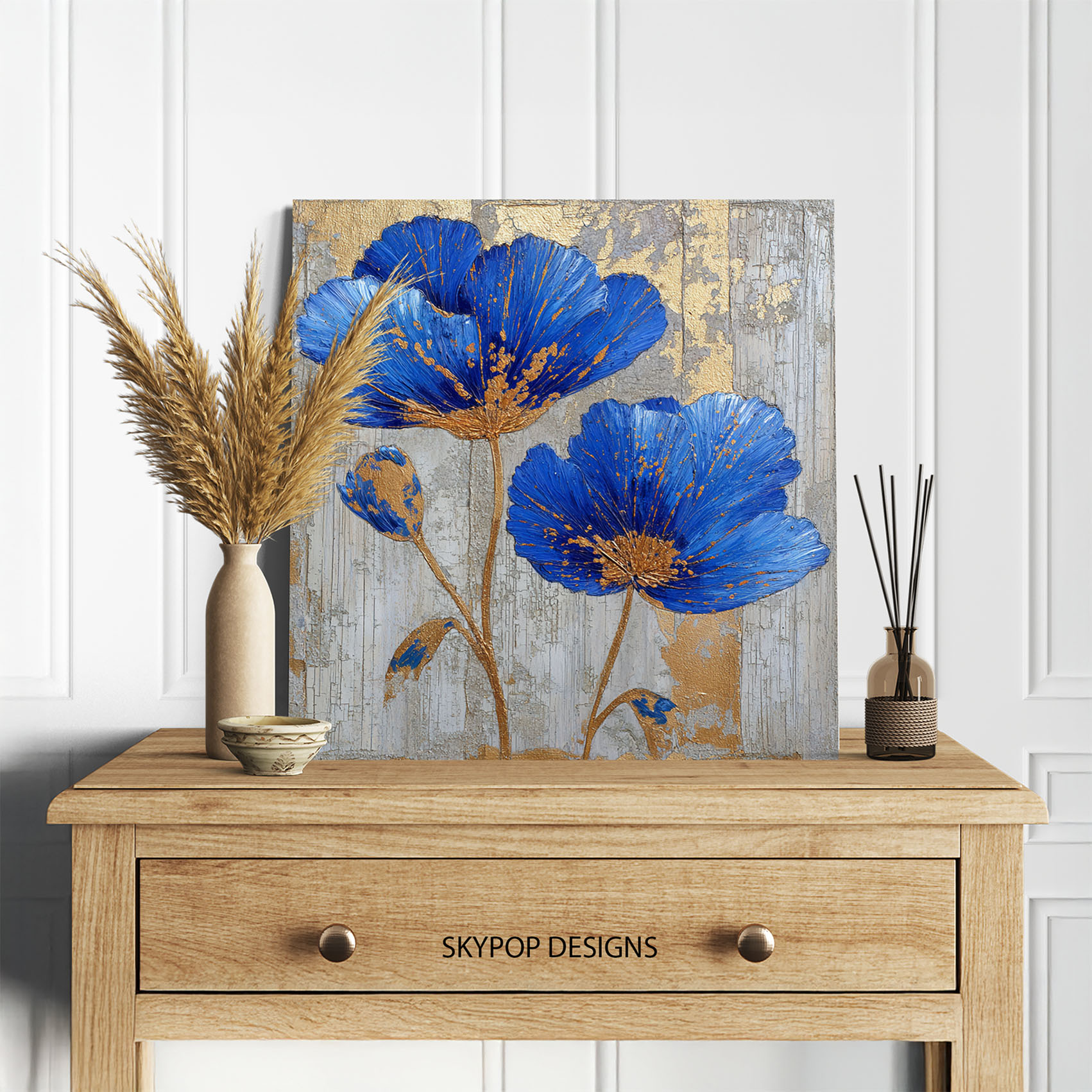 Elevate your home with stunning royal blue poppy canvas wall art that brings vibrant color and luxurious gold accents to any space.