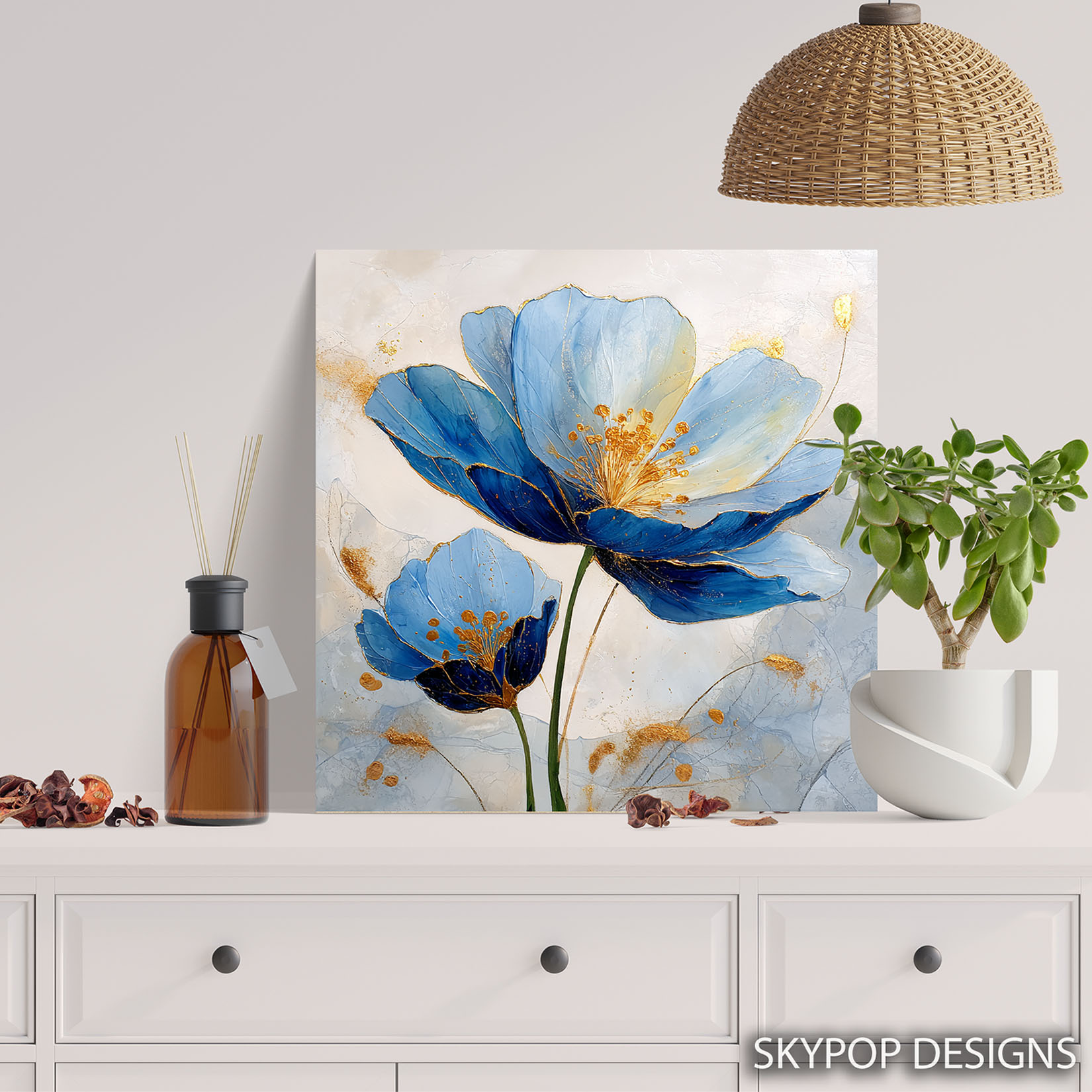 Elevate your living room with this stunning blue poppy canvas wall art that brings a touch of modern elegance to your space. This captivating poster or canvas art showcases vibrant blue poppies accented with shimmering gold details, creating a luxurious and sophisticated focal point. The abstract floral art style blends seamlessly with minimalist and contemporary decor, making it perfect for a chic entryway or a serene bedroom. This striking piece enhances modern living room wall decor and brings a sophisticated feel to any office space. The cool blue tones evoke a sense of calm, while the rich gold accents add a glamorous touch, creating a visually appealing contrast. Ideal for Scandinavian and minimalist interiors, this floral artwork offers a refined aesthetic that complements clean lines and neutral palettes. High-quality canvas printing ensures the intricate details and luminous gold leaf effect are beautifully rendered, making this poster a true statement piece. Whether you’re redecorating or searching for a housewarming gift, this versatile wall art adds personality and charm. Transform your home with this eye-catching floral canvas art that celebrates the beauty of nature with a contemporary, glam twist. Add a touch of luxury and artistic flair to your walls today with this beautiful blue poppy wall art.