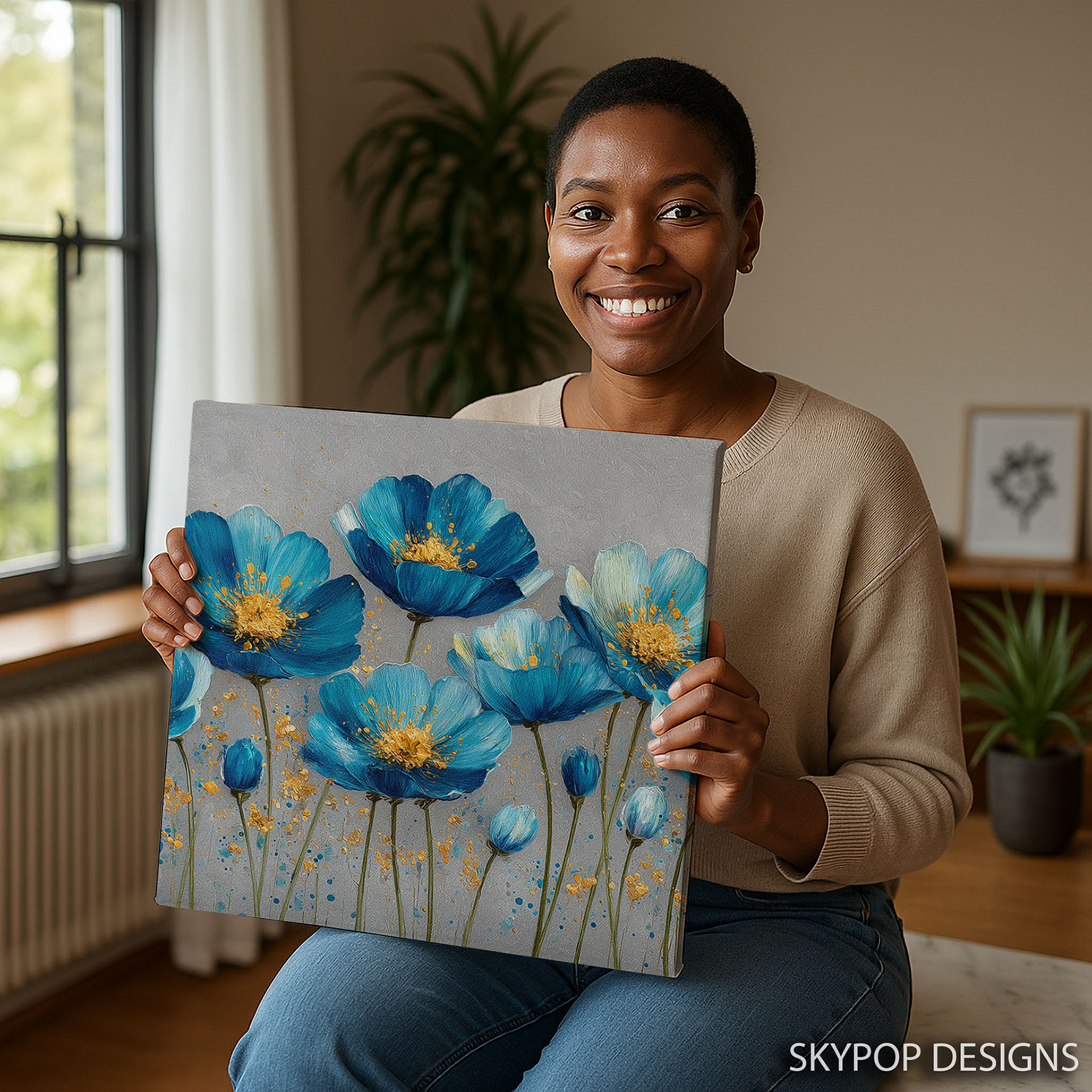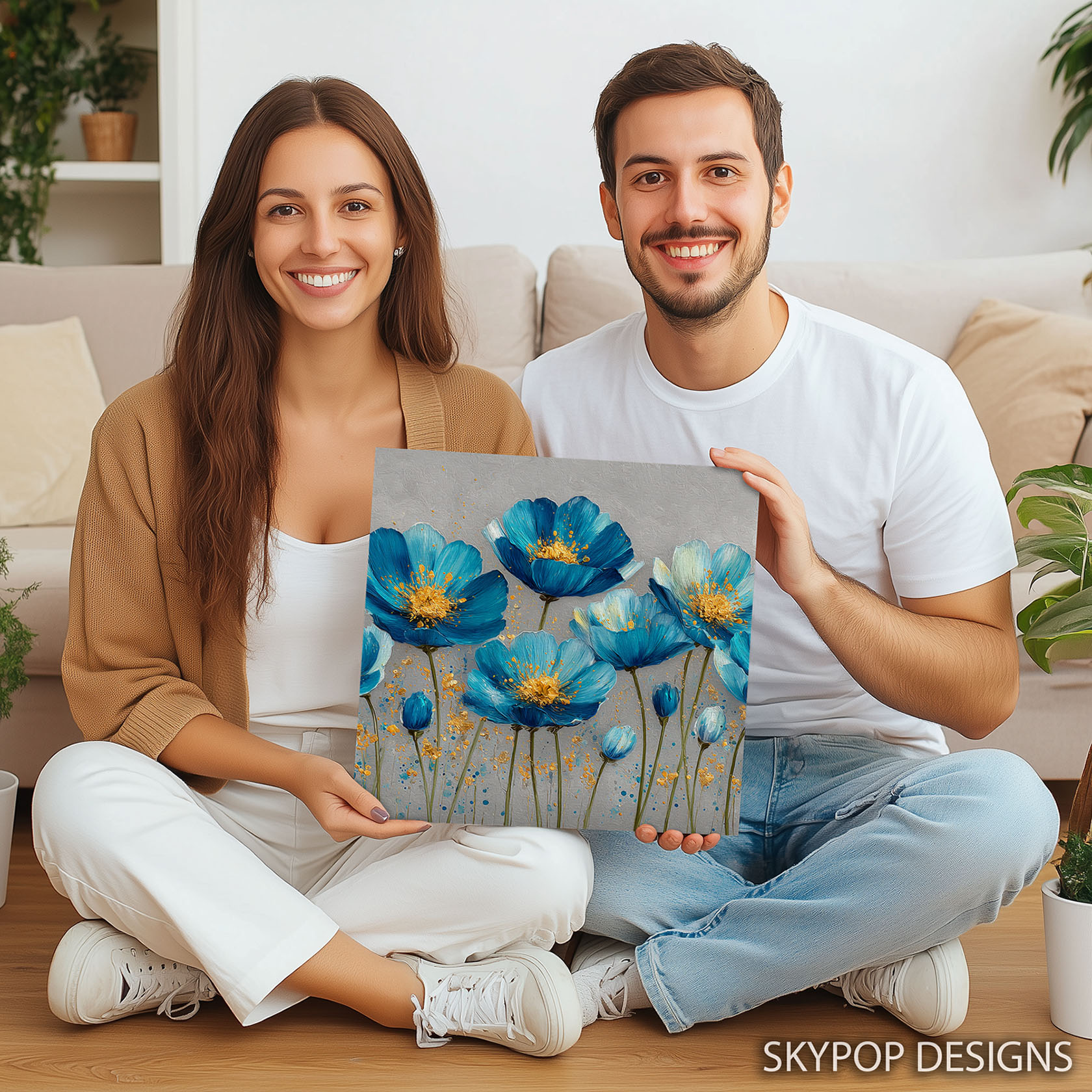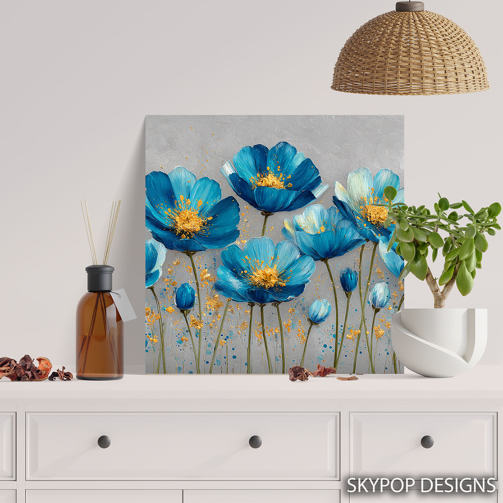 Elevate your home with this stunning blue poppy canvas wall art, a captivating piece that brings the beauty of nature indoors. This poster or canvas wall art features vibrant blue poppies with striking gold accents against a soft grey background, creating a modern and sophisticated look. The contemporary abstract floral art style makes it perfect for adding a pop of color to minimalist living rooms or enhancing Scandinavian decor in a cozy bedroom. The rich blue hues evoke a sense of calm and tranquility, while the golden specks add a touch of luxury and vibrancy, ideal for an office or entryway. This striking floral artwork is expertly printed on high-quality canvas, ensuring brilliant colors and sharp details that will last for years. Its versatile design makes it a fantastic housewarming gift or a thoughtful present for birthdays and holidays. Whether you’re looking to refresh your wall decor or add a statement piece to your collection, this blue poppy canvas art will transform any space. Experience the uplifting energy of nature-inspired art and bring a breath of fresh air to your home today. This elegant poster art offers both visual appeal and emotional resonance, making it a cherished addition to any decor. Add a touch of timeless beauty with this exquisite floral wall art.