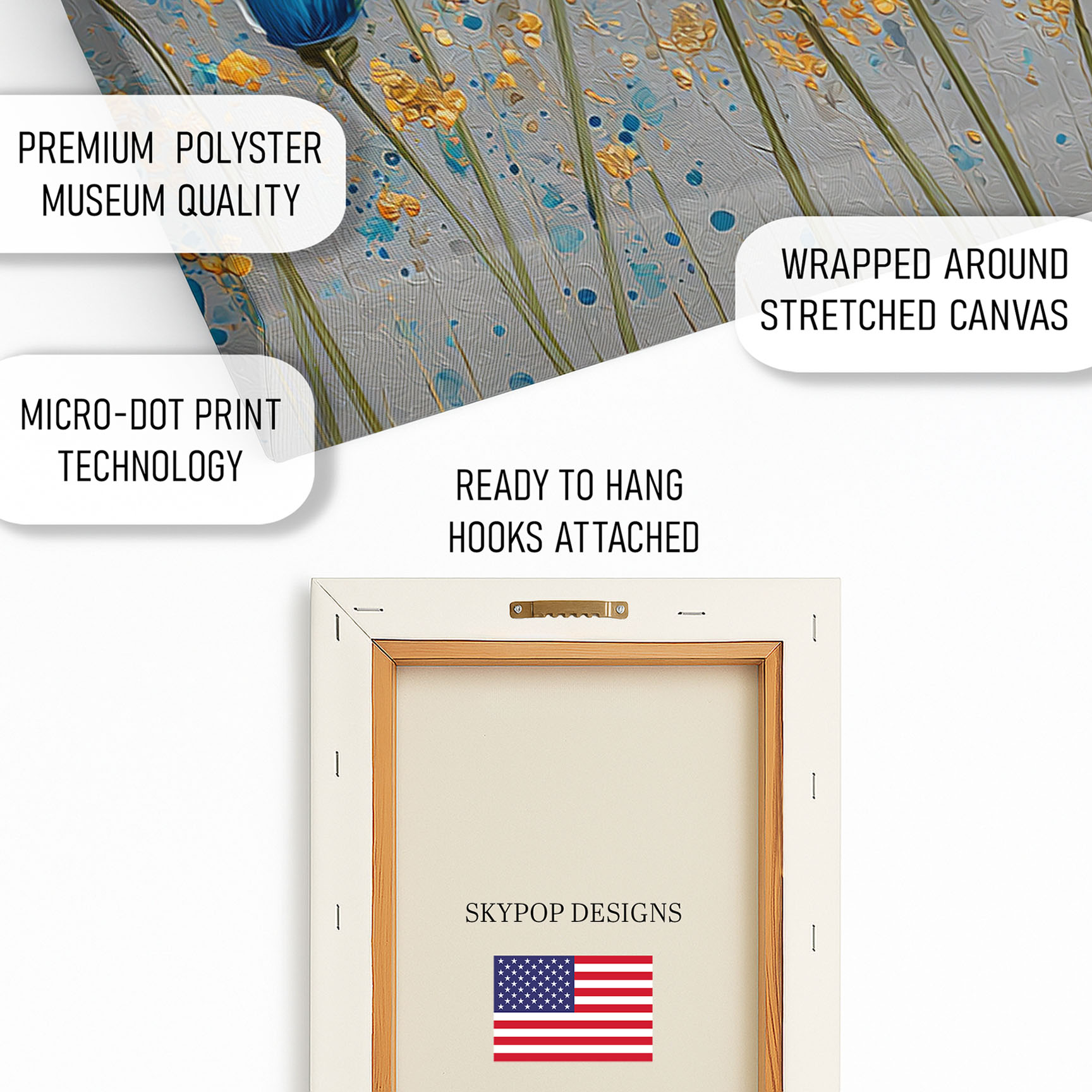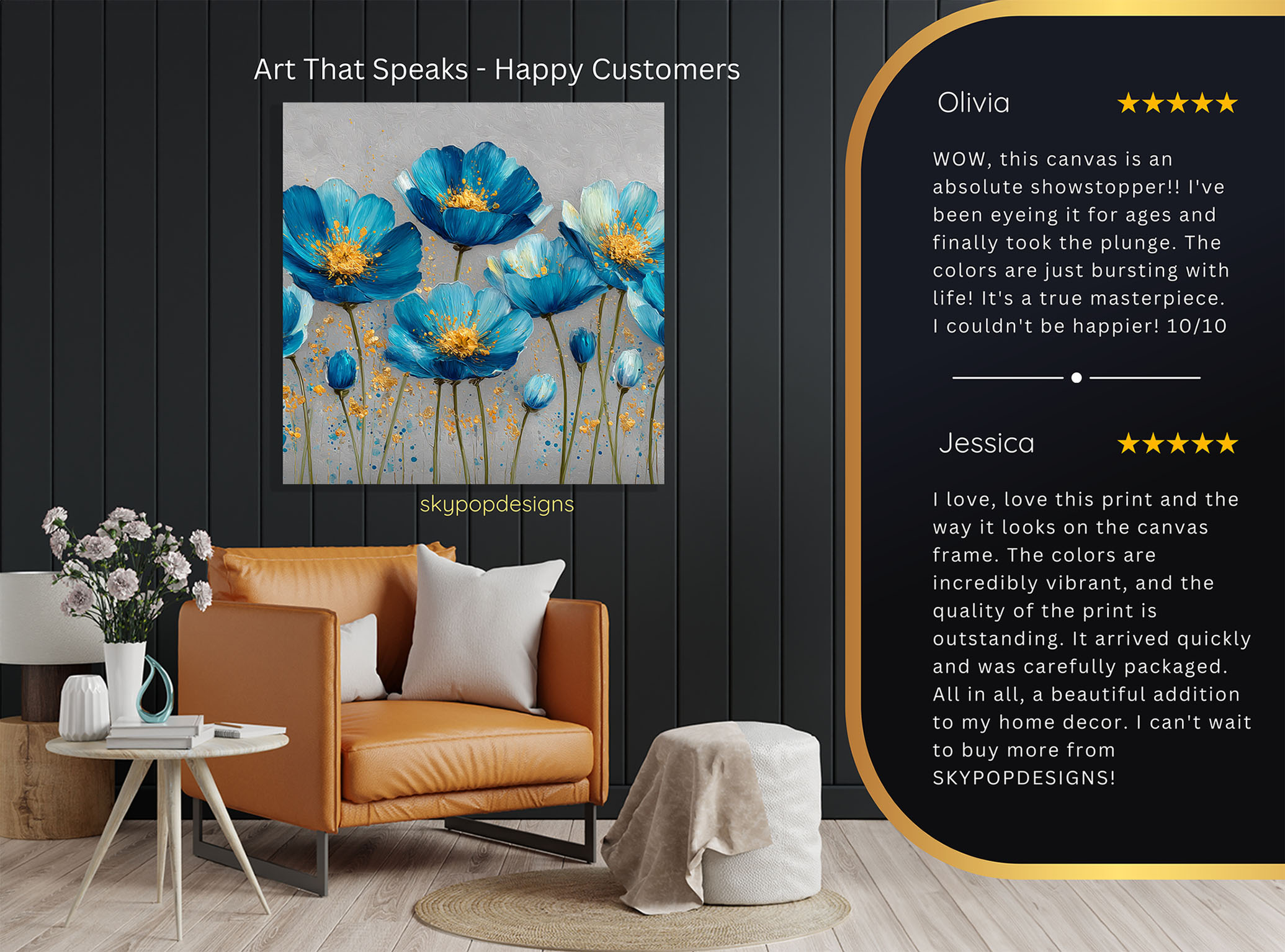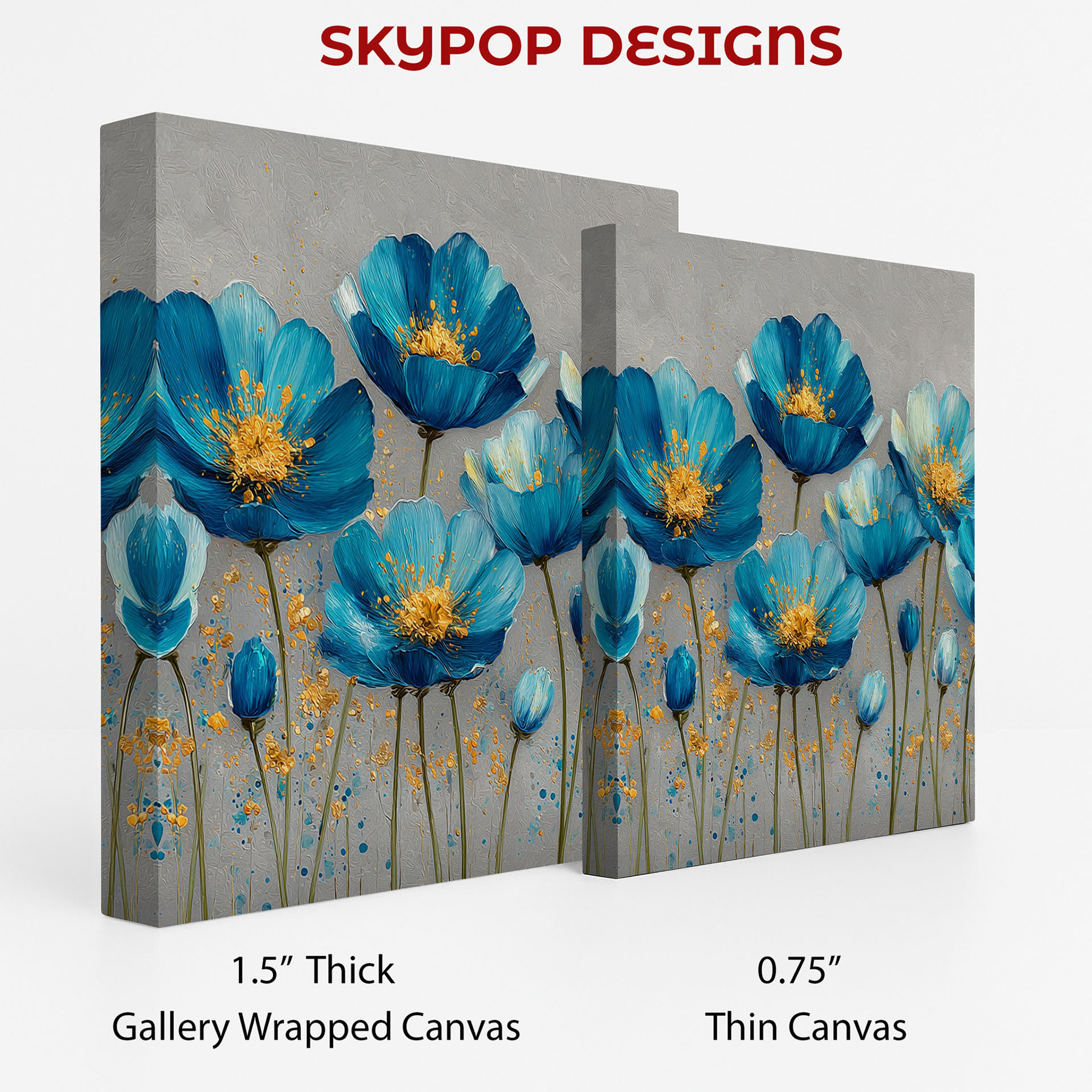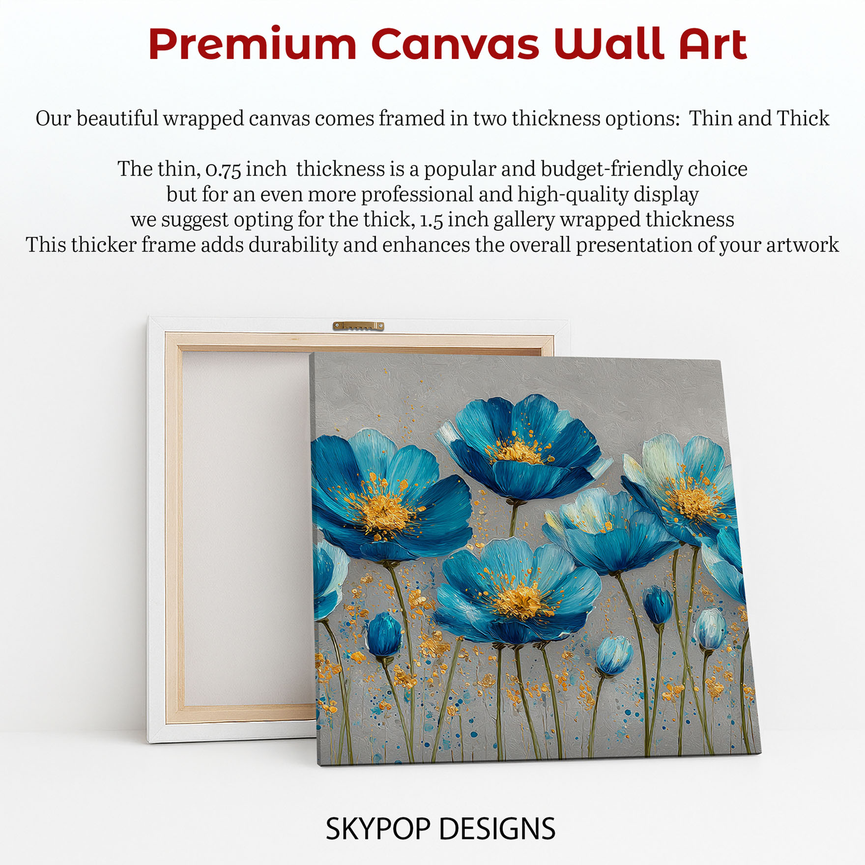 Elevate your home with this stunning blue poppy canvas wall art, a captivating piece that brings the beauty of nature indoors. This poster or canvas wall art features vibrant blue poppies with striking gold accents against a soft grey background, creating a modern and sophisticated look. The contemporary abstract floral art style makes it perfect for adding a pop of color to minimalist living rooms or enhancing Scandinavian decor in a cozy bedroom. The rich blue hues evoke a sense of calm and tranquility, while the golden specks add a touch of luxury and vibrancy, ideal for an office or entryway. This striking floral artwork is expertly printed on high-quality canvas, ensuring brilliant colors and sharp details that will last for years. Its versatile design makes it a fantastic housewarming gift or a thoughtful present for birthdays and holidays. Whether you’re looking to refresh your wall decor or add a statement piece to your collection, this blue poppy canvas art will transform any space. Experience the uplifting energy of nature-inspired art and bring a breath of fresh air to your home today. This elegant poster art offers both visual appeal and emotional resonance, making it a cherished addition to any decor. Add a touch of timeless beauty with this exquisite floral wall art.