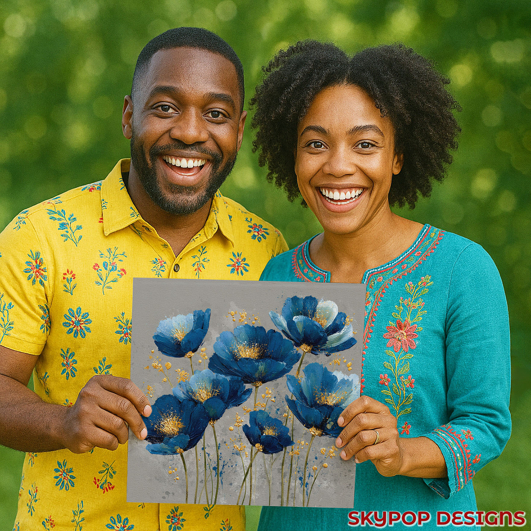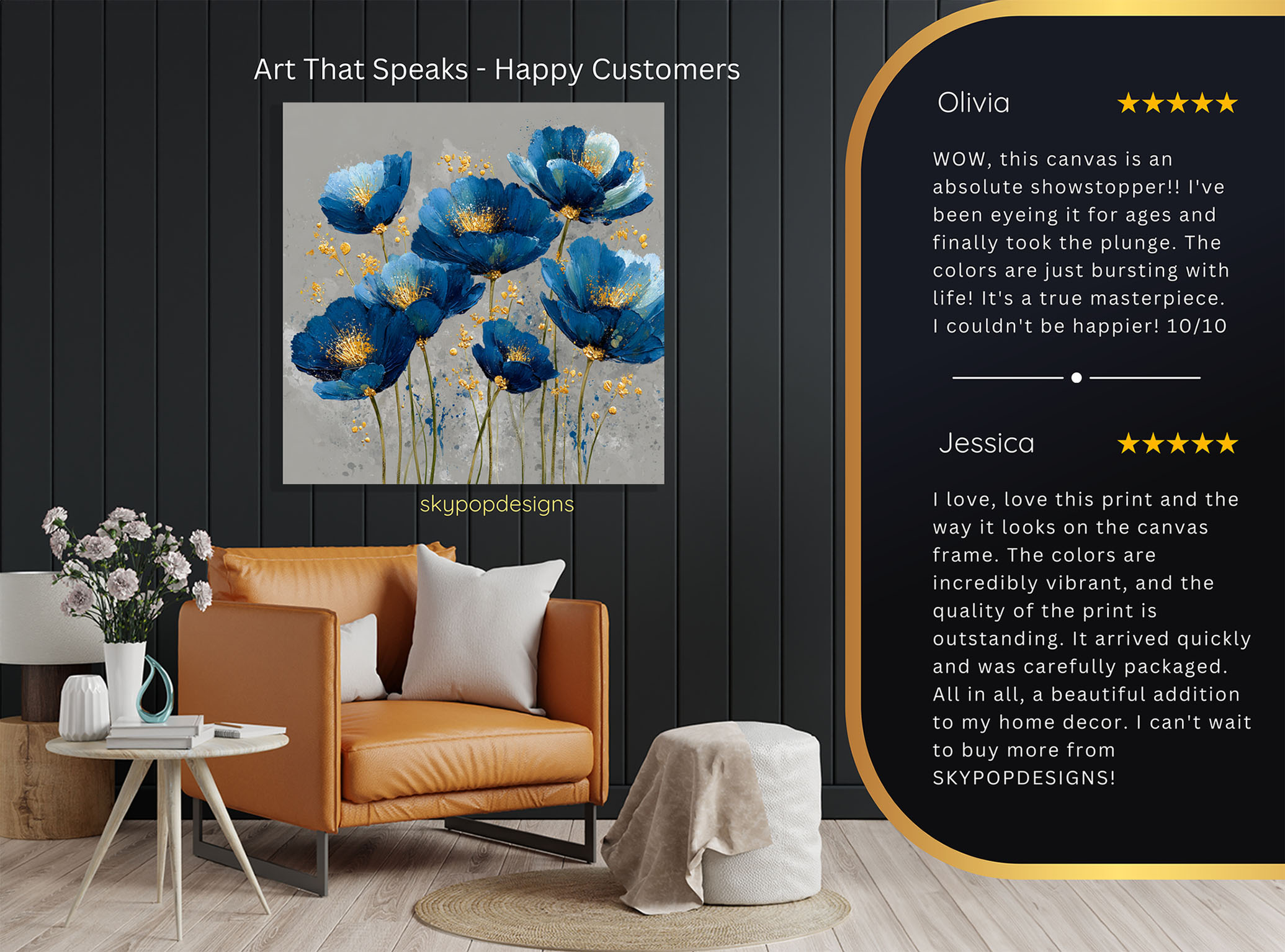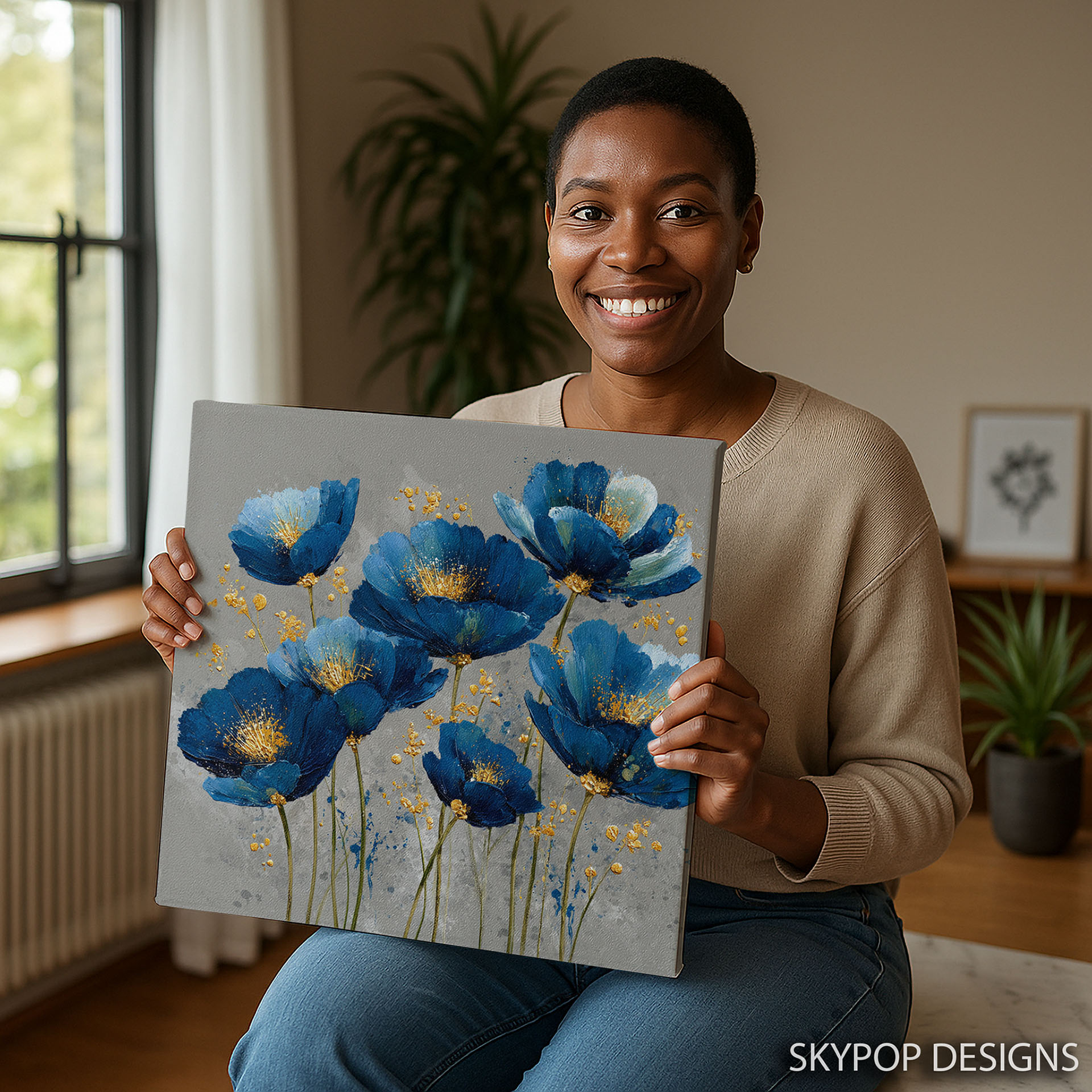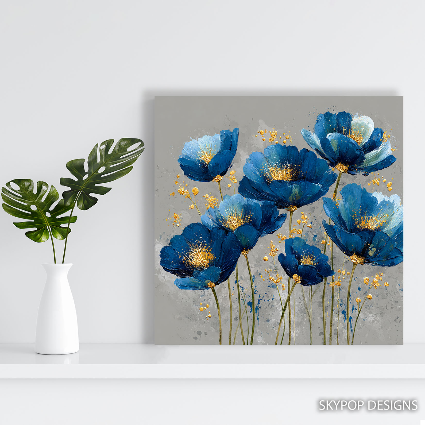 Elevate your living space with this stunning blue poppy canvas wall art, a captivating piece that brings the beauty of nature indoors. This poster or canvas wall art is perfect for transforming any room into a sophisticated sanctuary, ideal for modern living room wall decor or as a striking statement in a glam-themed bedroom. The vibrant blue of the poppies, accented with opulent gold details, creates a luxurious and eye-catching visual. This floral artwork complements contemporary interiors and adds a touch of elegance to minimalist designs. The impressionistic style with thick brushstrokes gives the canvas wall art depth and texture, making each bloom appear lifelike. The cool blue tones are known to promote tranquility and serenity, making this an ideal choice for creating a peaceful atmosphere in your home. Its versatility makes it a perfect addition to a dining room or entryway, welcoming guests with its artistic charm. This high-quality canvas print is also a thoughtful gift idea for housewarmings, birthdays, or any special occasion, bringing lasting beauty and style. Showcase your refined taste with this exquisite poppy wall art, designed to inspire and captivate. Whether you are looking for modern wall decor or a statement floral piece, this canvas wall art offers timeless appeal and artistic brilliance. Transform your home decor today with this breathtaking Blue Poppy Elegance artwork.