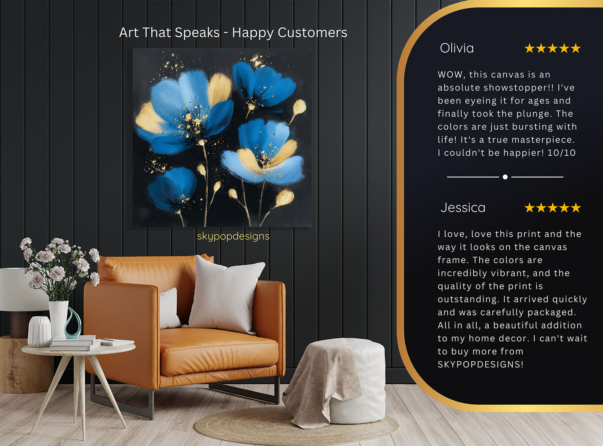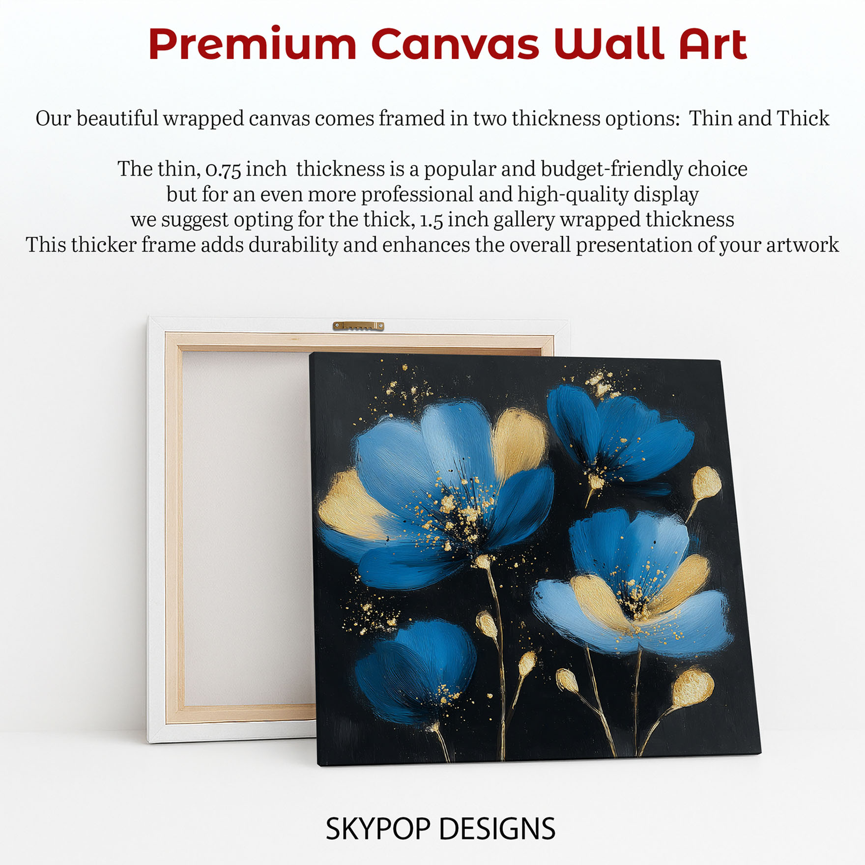 Transform your space with this captivating blue poppy canvas wall art, featuring a striking blend of contemporary art and abstract floral elements. This stunning poster or canvas wall art is perfect for enhancing modern living room decor or adding a touch of glam to your bedroom. The vibrant blue petals contrasted with rich gold accents and deep black background create a sophisticated and elegant focal point. Ideal for minimalist interiors, this floral artwork brings a sense of luxury and visual interest without overwhelming the space. The artistic interpretation of poppies in bloom, highlighted with shimmering gold flecks, symbolizes hope and renewal. High-quality printing ensures every textured brushstroke and golden detail is beautifully preserved on this canvas wall art. This versatile piece works wonderfully in entryways or offices, inspiring creativity and elegance. It’s a perfect housewarming gift or a thoughtful present for birthdays and holidays, offering lasting beauty and a touch of opulence. The dramatic color palette of blue, gold, and black effortlessly complements a variety of decor styles, making this a timeless addition. Elevate your home with abstract floral wall art that merges bold design with refined aesthetics. Showcase this premium canvas art to add a splash of color and captivating artistry to your walls today. This poster and canvas wall art will truly make a statement.