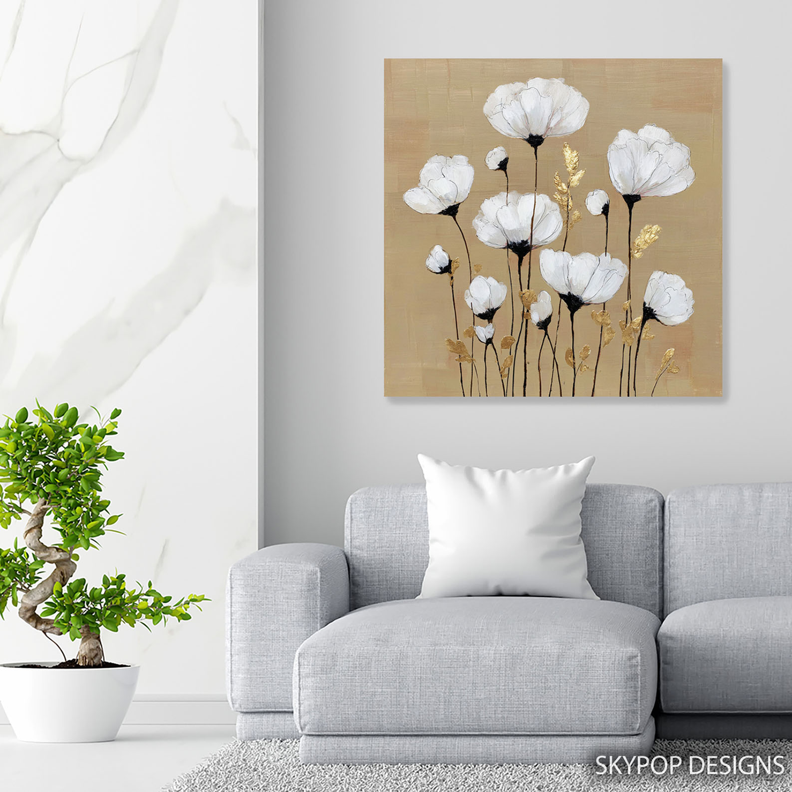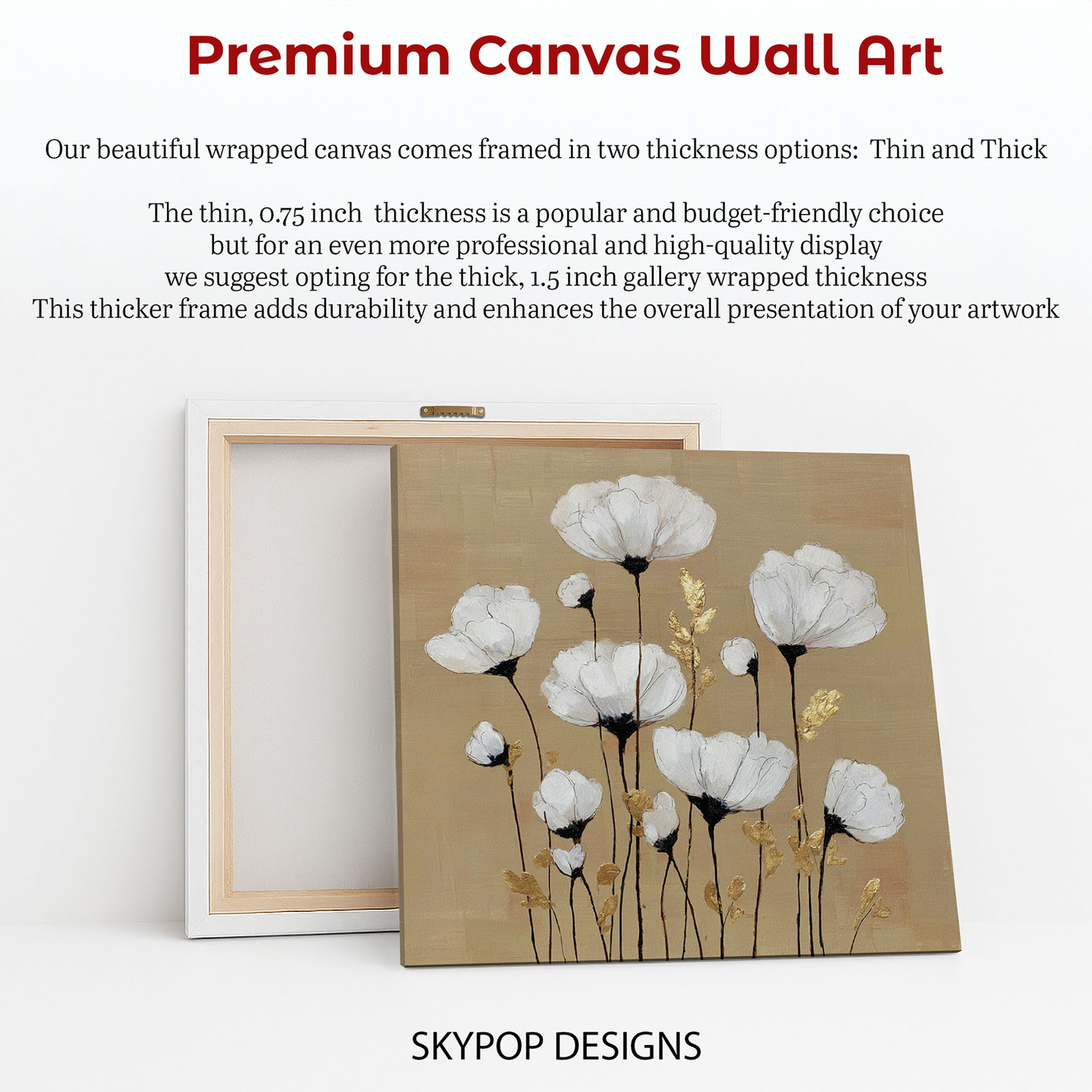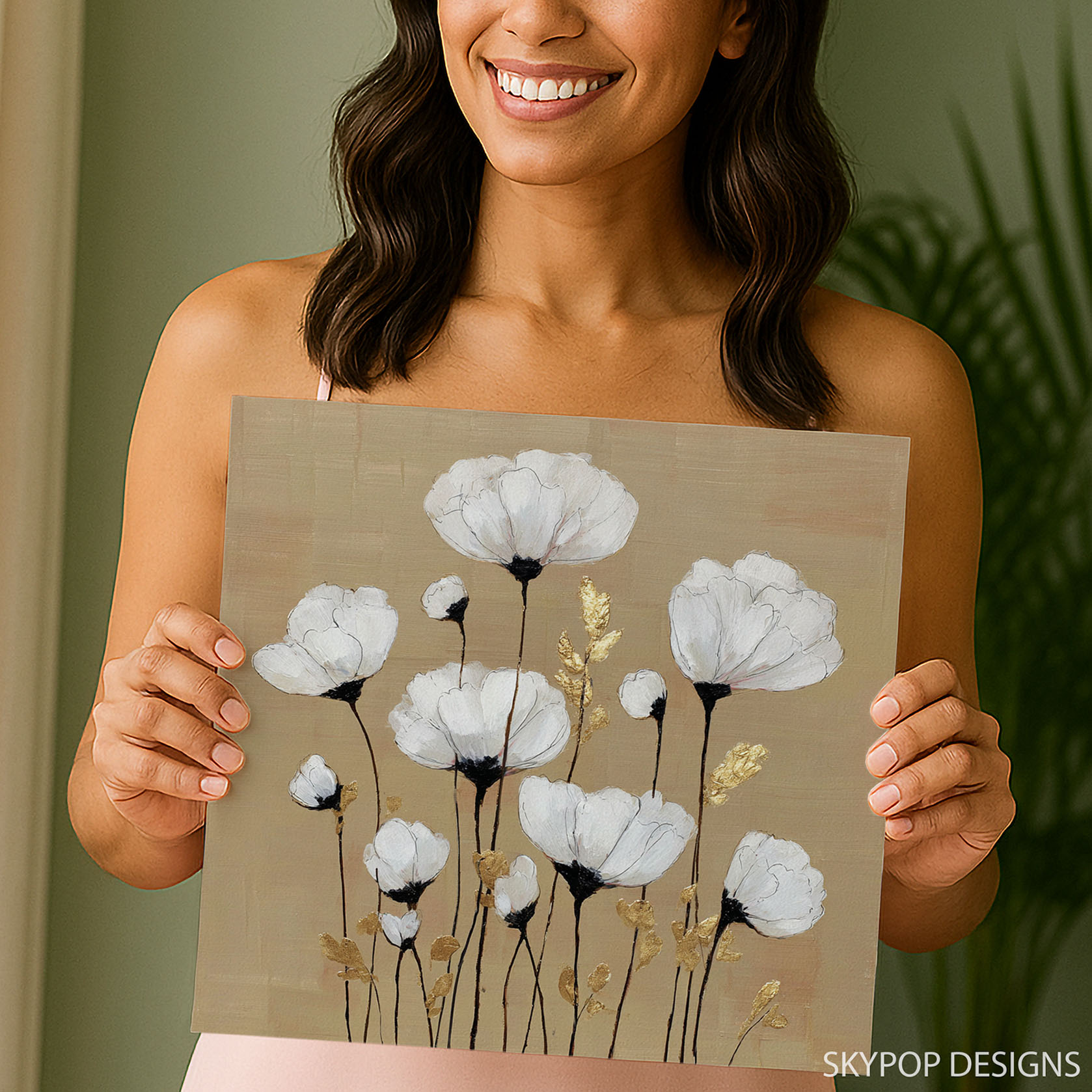 Transform your home with this elegant Poppy canvas wall art, a captivating floral artwork that brings the beauty of a golden meadow indoors. This stunning poster or canvas wall art features delicate white poppies with striking black centers, accented by touches of shimmering gold foliage against a warm beige background. It is the perfect addition for contemporary living room wall decor and adds a touch of serene artistry to modern bedrooms. The minimalist style of this floral art piece effortlessly enhances Scandinavian and Bohemian interiors, creating a calm and uplifting atmosphere. The rich color palette of beige, gold, black, and white evokes a sense of natural tranquility and sophisticated charm. High-quality printing ensures that every brushstroke and textural detail of this canvas wall art is vividly captured, making it a focal point in any space. This versatile wall art is ideal for your entryway or dining room, welcoming guests with its understated elegance and inspiring a peaceful mood. It serves as a thoughtful housewarming gift or a beautiful present for birthdays and holidays, bringing lasting beauty to any home. Elevate your interior design with this exquisite poppy poster that combines timeless floral motifs with modern design sensibilities. Make this breathtaking canvas wall art the centerpiece of your decor collection today.