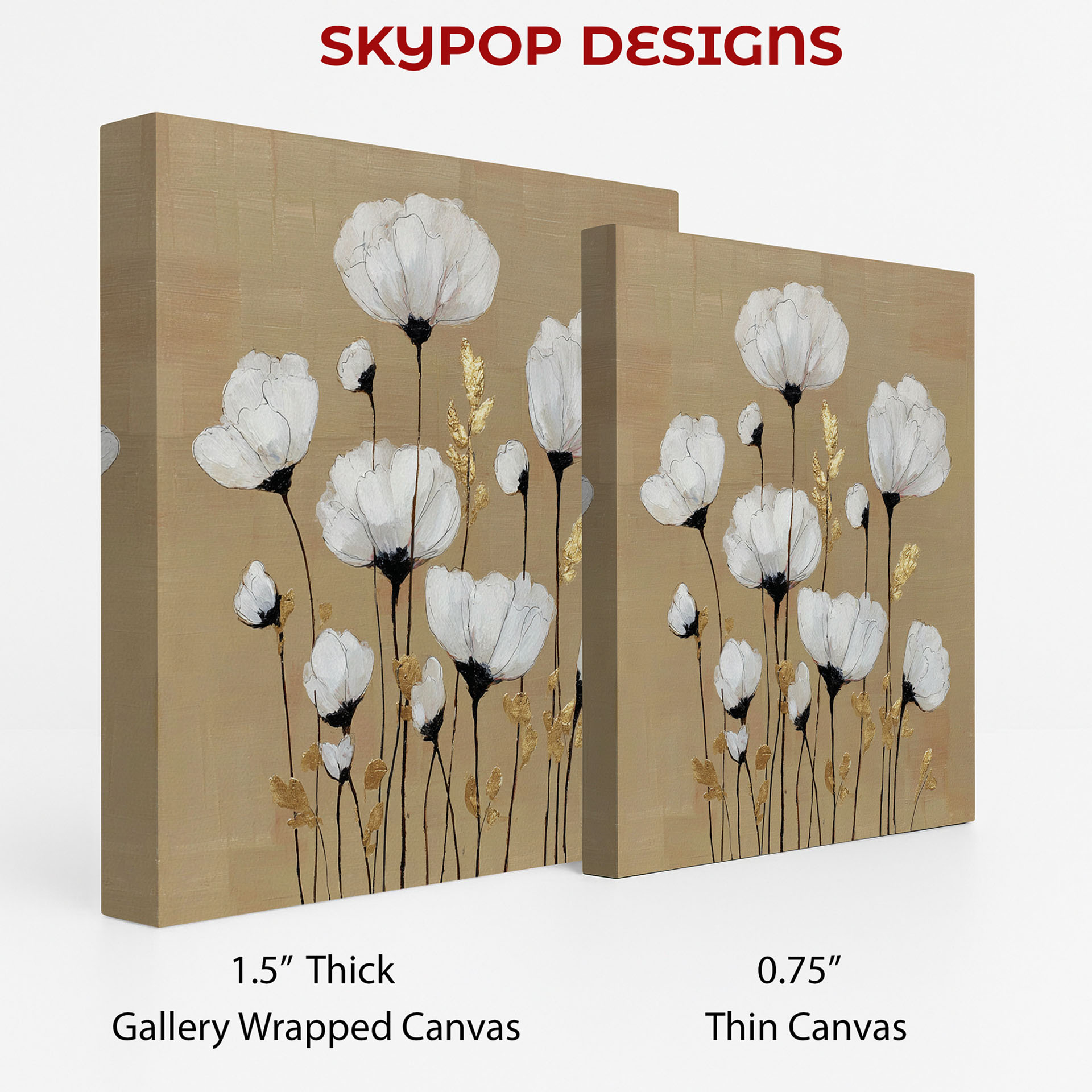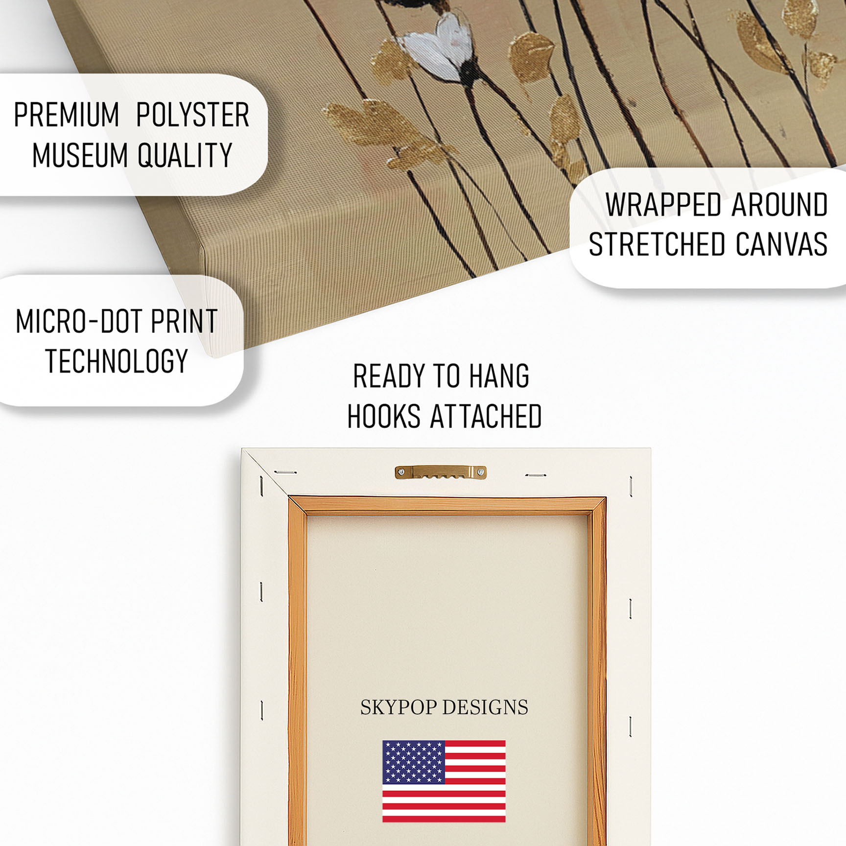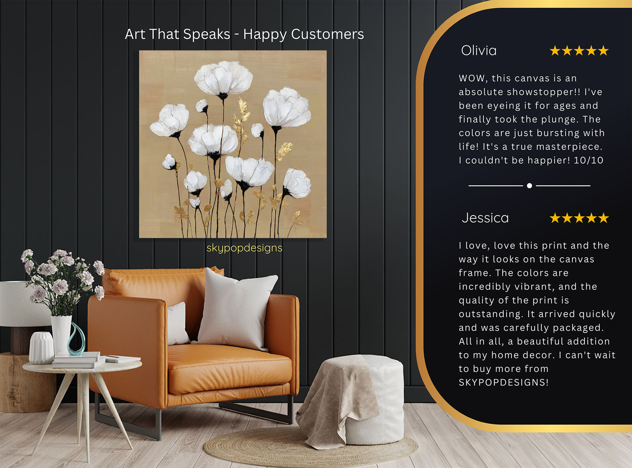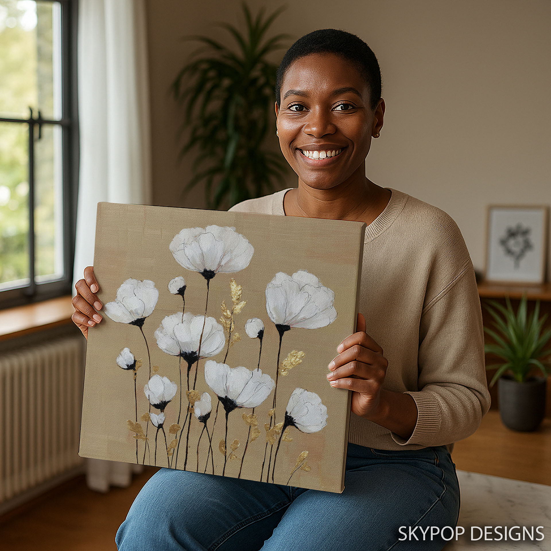 Transform your home with this elegant Poppy canvas wall art, a captivating floral artwork that brings the beauty of a golden meadow indoors. This stunning poster or canvas wall art features delicate white poppies with striking black centers, accented by touches of shimmering gold foliage against a warm beige background. It is the perfect addition for contemporary living room wall decor and adds a touch of serene artistry to modern bedrooms. The minimalist style of this floral art piece effortlessly enhances Scandinavian and Bohemian interiors, creating a calm and uplifting atmosphere. The rich color palette of beige, gold, black, and white evokes a sense of natural tranquility and sophisticated charm. High-quality printing ensures that every brushstroke and textural detail of this canvas wall art is vividly captured, making it a focal point in any space. This versatile wall art is ideal for your entryway or dining room, welcoming guests with its understated elegance and inspiring a peaceful mood. It serves as a thoughtful housewarming gift or a beautiful present for birthdays and holidays, bringing lasting beauty to any home. Elevate your interior design with this exquisite poppy poster that combines timeless floral motifs with modern design sensibilities. Make this breathtaking canvas wall art the centerpiece of your decor collection today.