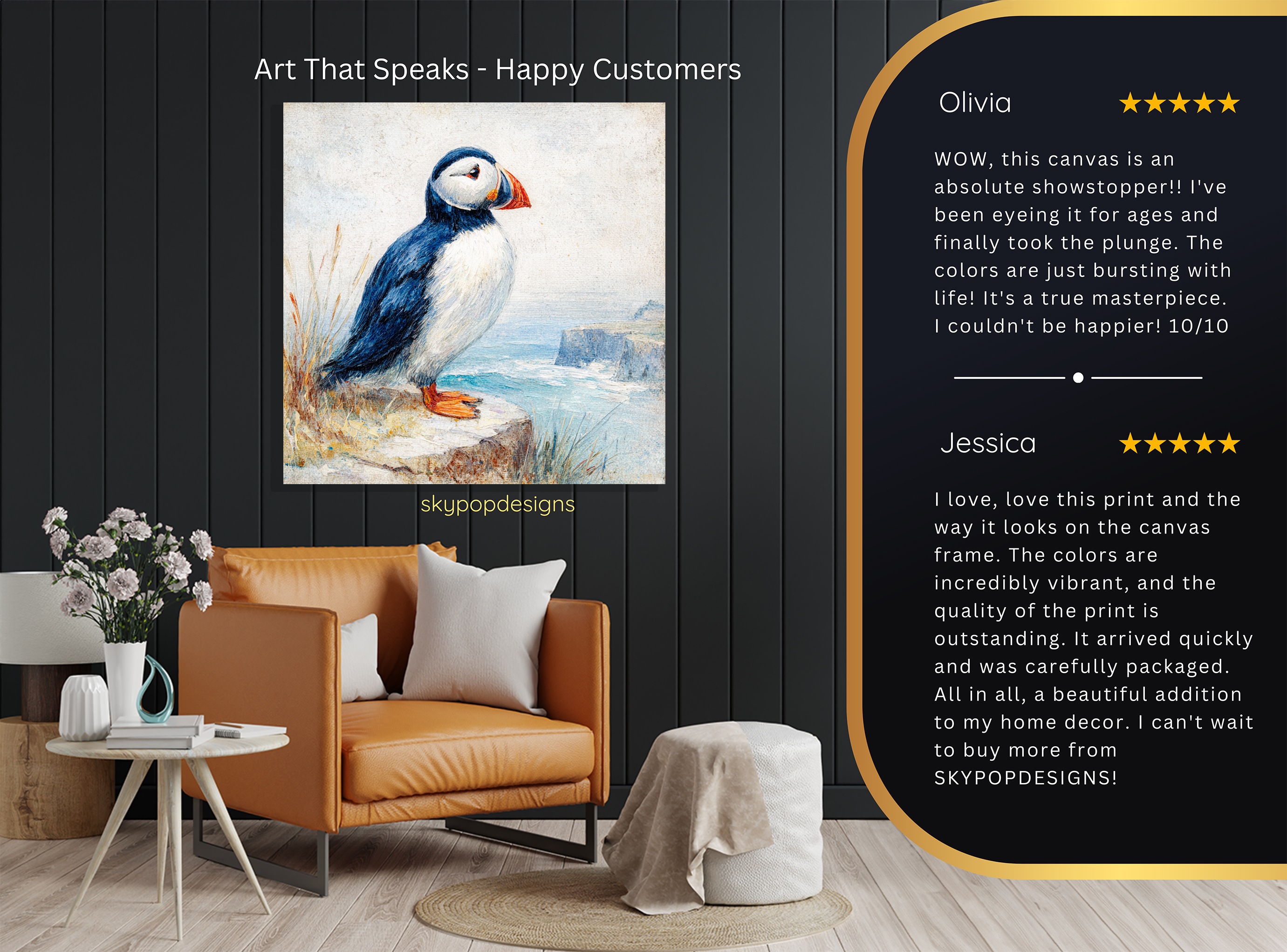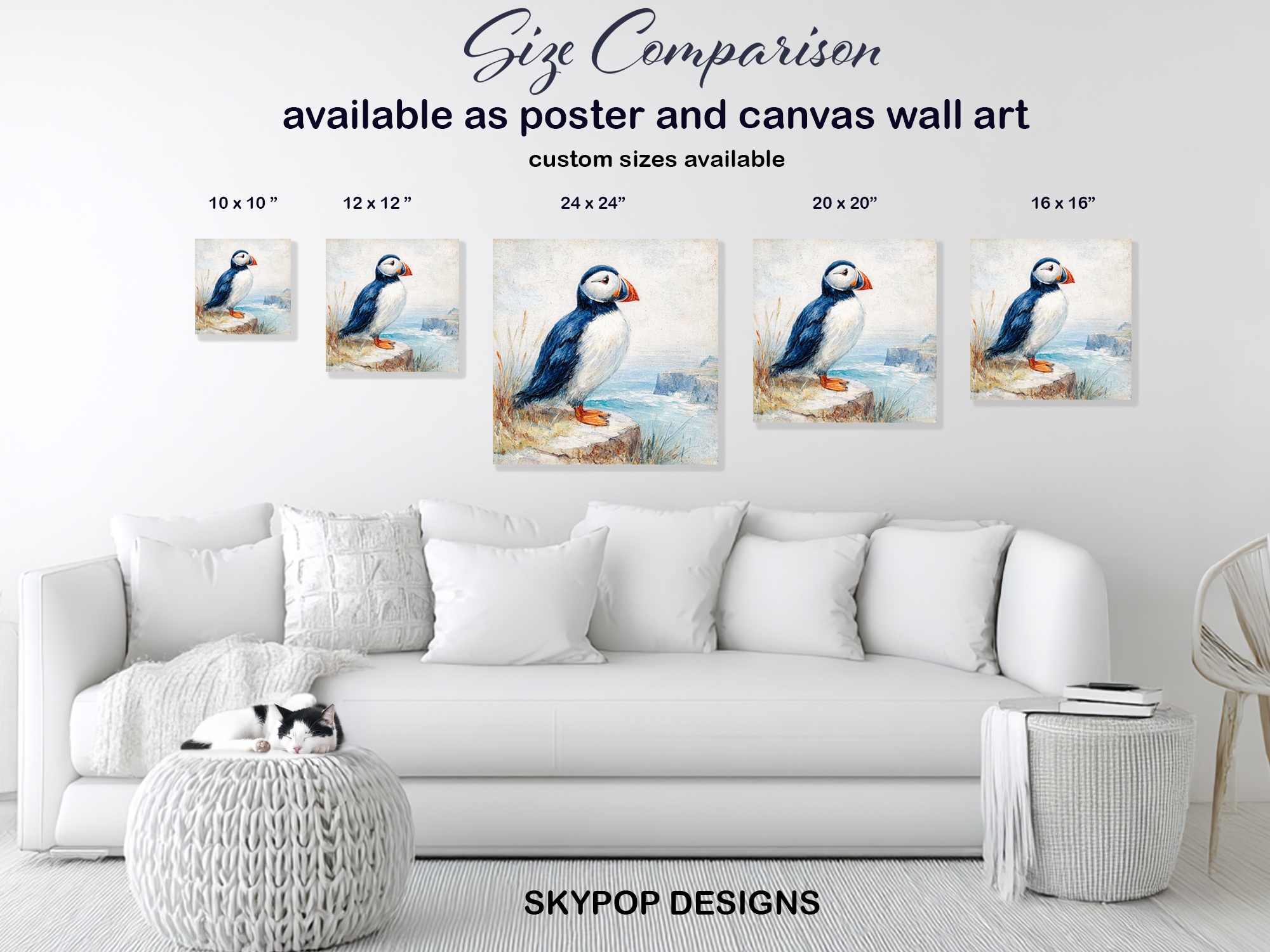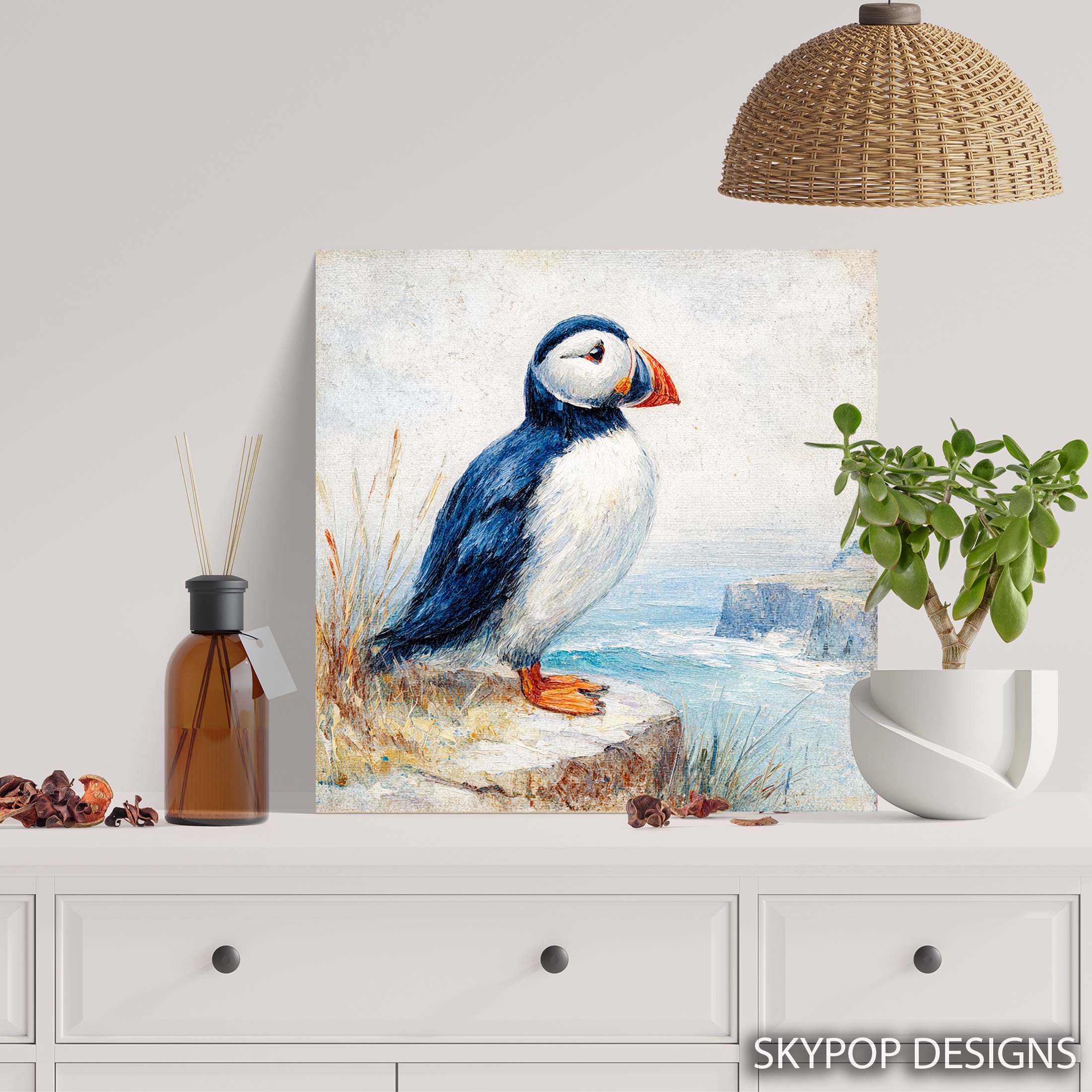 Bring the charm of coastal wildlife into your home with this stunning puffin canvas wall art. This captivating piece showcases a beautifully detailed puffin perched on a rocky cliff, overlooking a serene ocean backdrop. The vibrant colors and lifelike portrayal of the puffin make this poster a perfect addition to any room seeking a touch of nature-inspired elegance. Ideal for coastal-themed decor, this canvas art effortlessly enhances living rooms, bedrooms, bathrooms, or home offices with its calming blue tones and eye-catching orange accents. The realistic brushstrokes capture the puffin’s distinctive features, from its colorful beak to its striking blue and white plumage, creating a focal point that draws the eye and sparks conversation. Whether you’re a bird enthusiast or simply love coastal imagery, this versatile wall art adapts beautifully to various interior styles, from rustic to contemporary. The high-quality printing ensures every detail of the puffin and its seaside habitat is preserved, making it a long-lasting addition to your home decor. Perfect as a thoughtful housewarming gift or to refresh your own space, this puffin artwork brings a sense of serenity and natural beauty to any room. Elevate your wall decor today with this charming piece that celebrates the majesty of coastal wildlife.