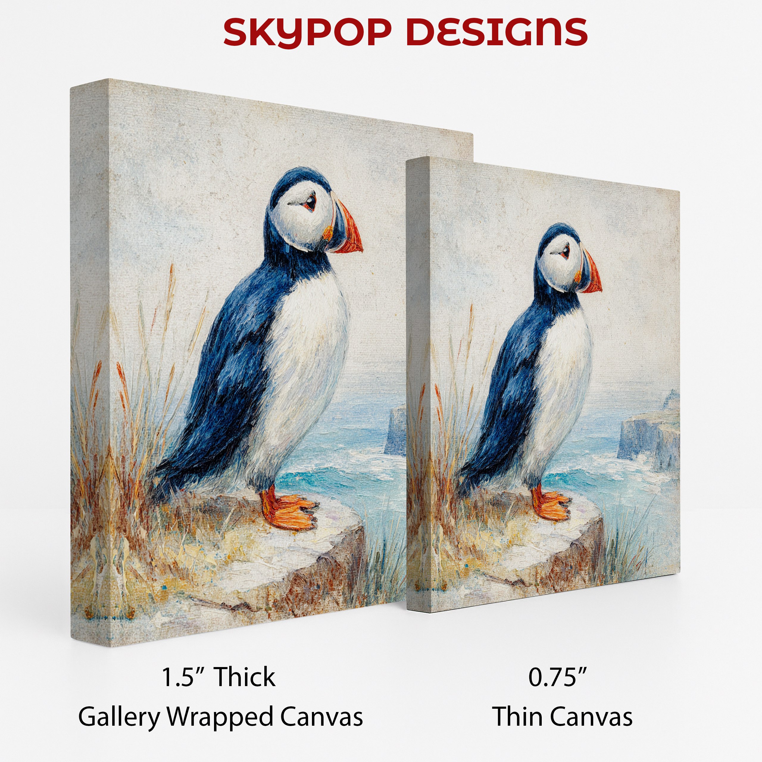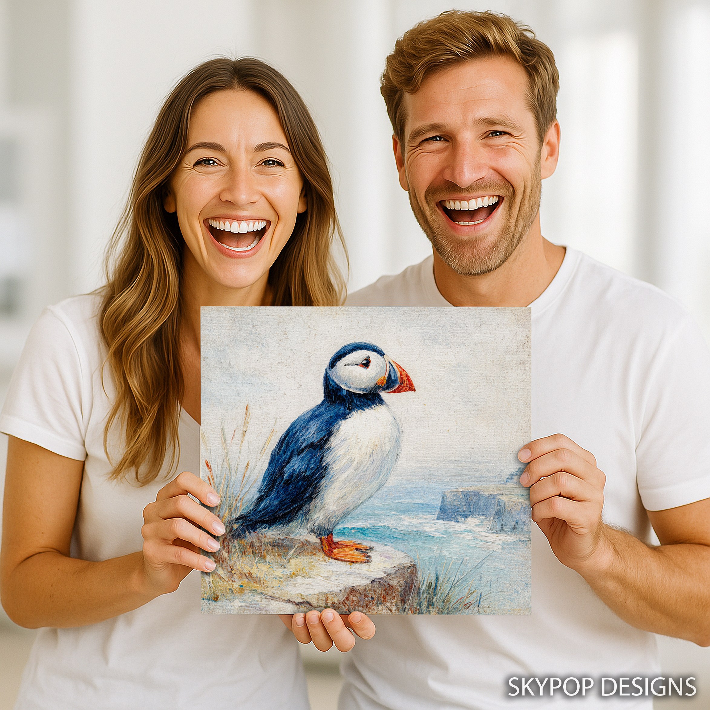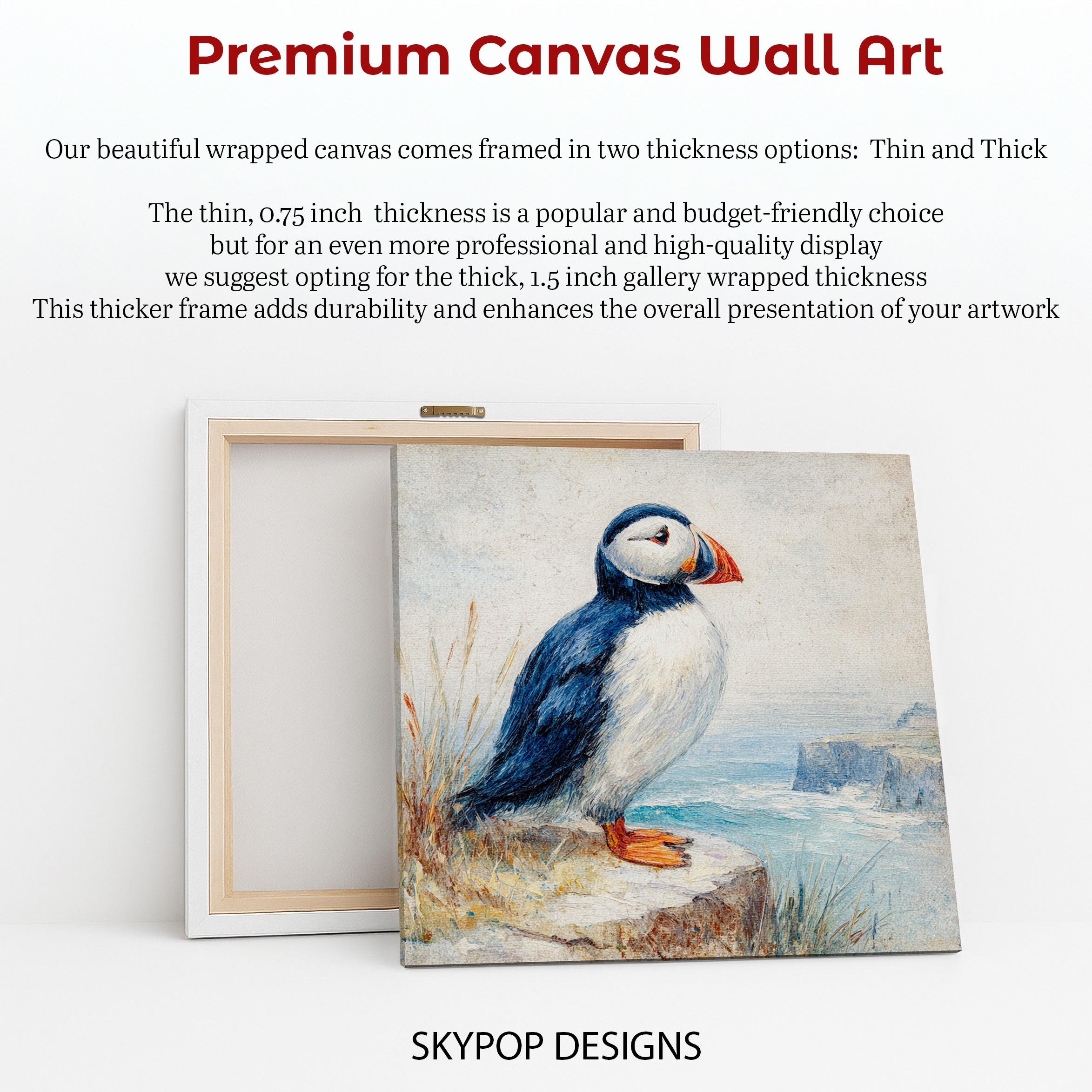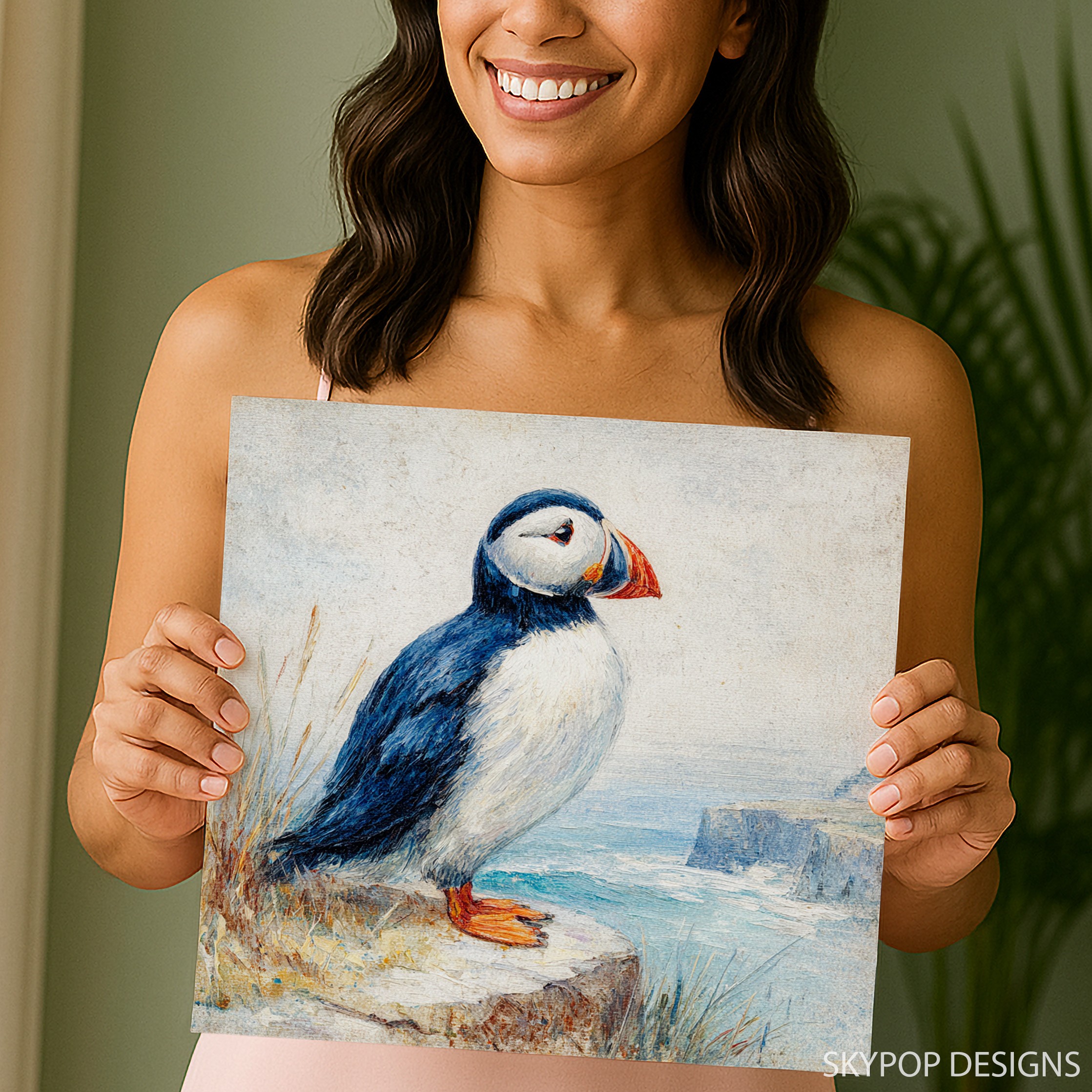 Bring the charm of coastal wildlife into your home with this stunning puffin canvas wall art. This captivating piece showcases a beautifully detailed puffin perched on a rocky cliff, overlooking a serene ocean backdrop. The vibrant colors and lifelike portrayal of the puffin make this poster a perfect addition to any room seeking a touch of nature-inspired elegance. Ideal for coastal-themed decor, this canvas art effortlessly enhances living rooms, bedrooms, bathrooms, or home offices with its calming blue tones and eye-catching orange accents. The realistic brushstrokes capture the puffin’s distinctive features, from its colorful beak to its striking blue and white plumage, creating a focal point that draws the eye and sparks conversation. Whether you’re a bird enthusiast or simply love coastal imagery, this versatile wall art adapts beautifully to various interior styles, from rustic to contemporary. The high-quality printing ensures every detail of the puffin and its seaside habitat is preserved, making it a long-lasting addition to your home decor. Perfect as a thoughtful housewarming gift or to refresh your own space, this puffin artwork brings a sense of serenity and natural beauty to any room. Elevate your wall decor today with this charming piece that celebrates the majesty of coastal wildlife.