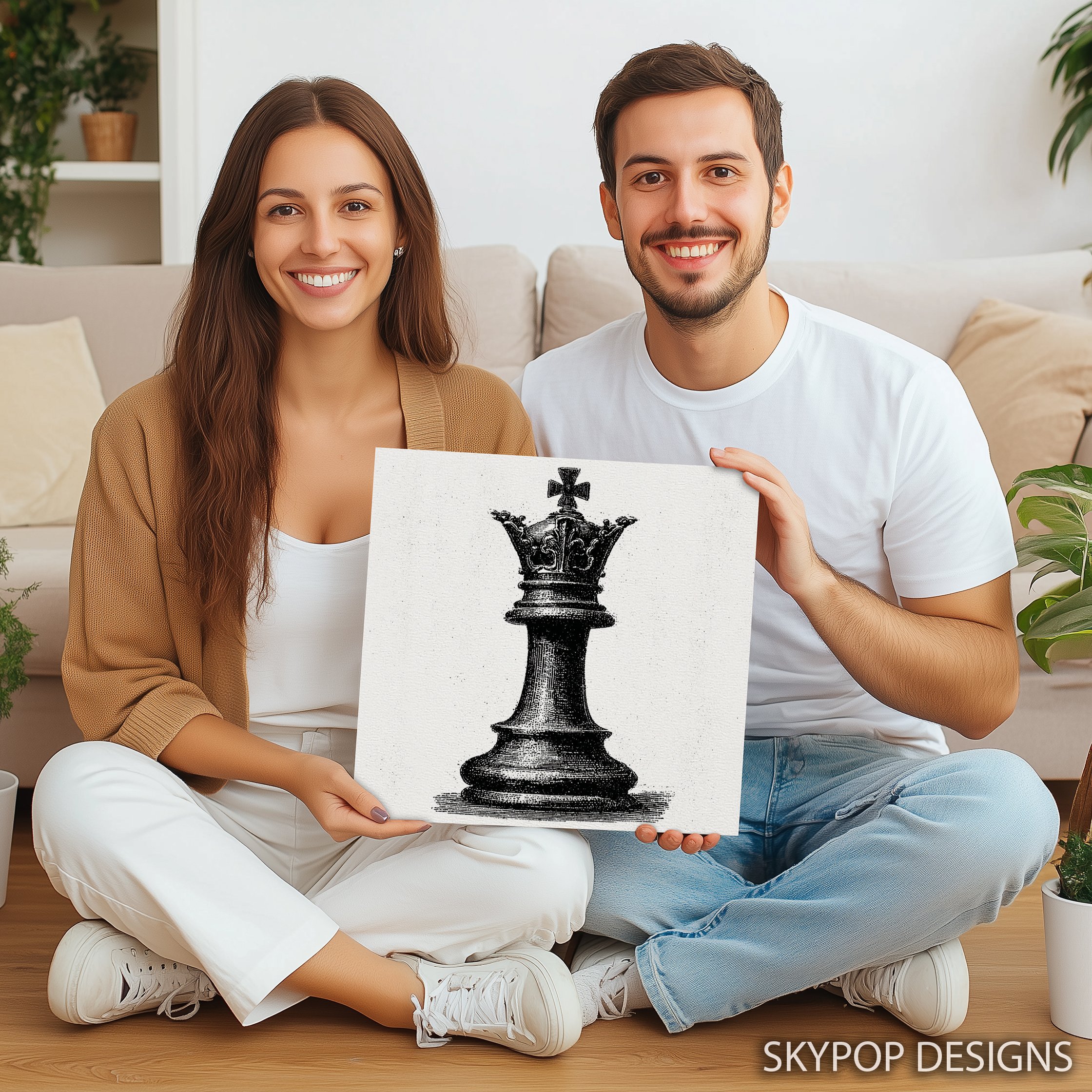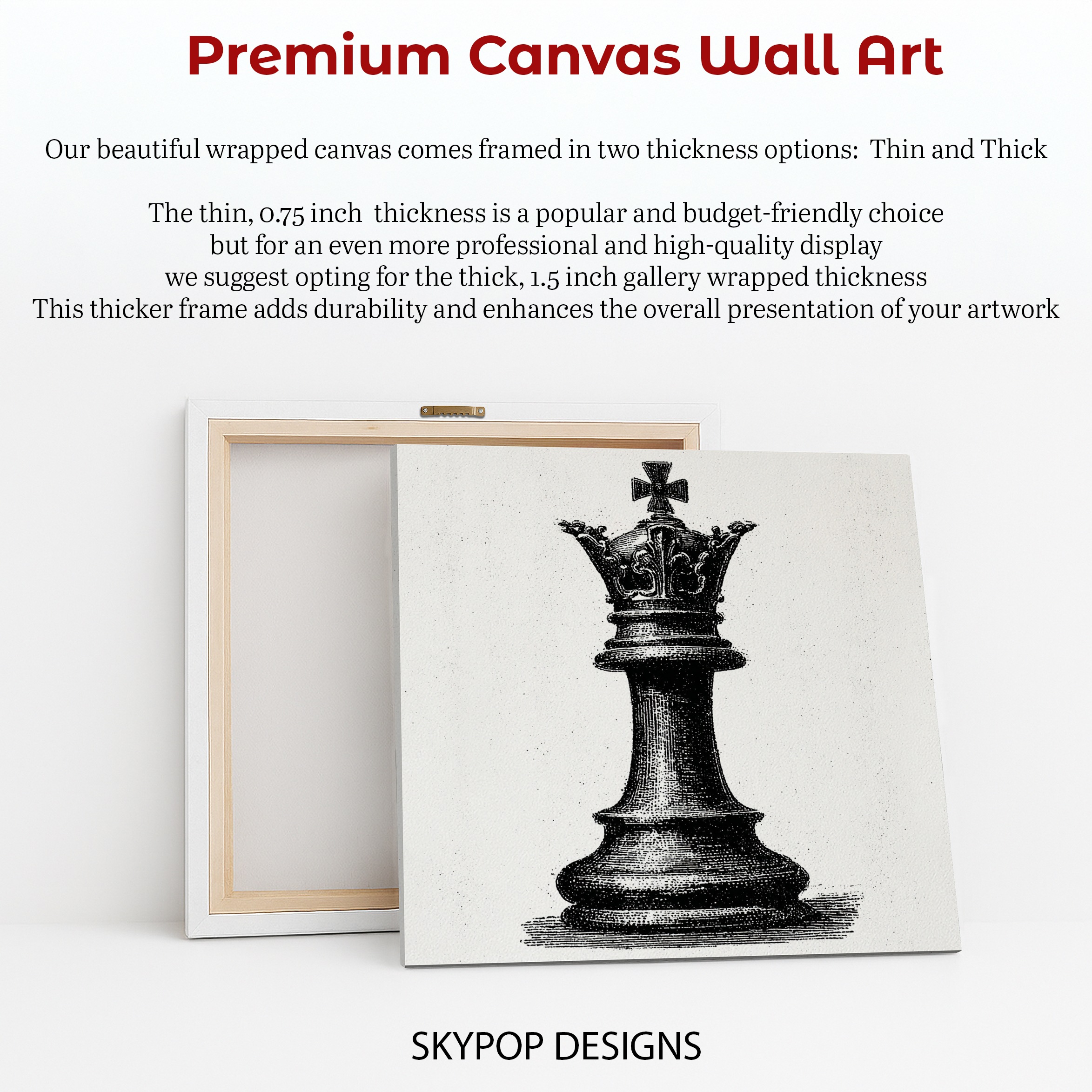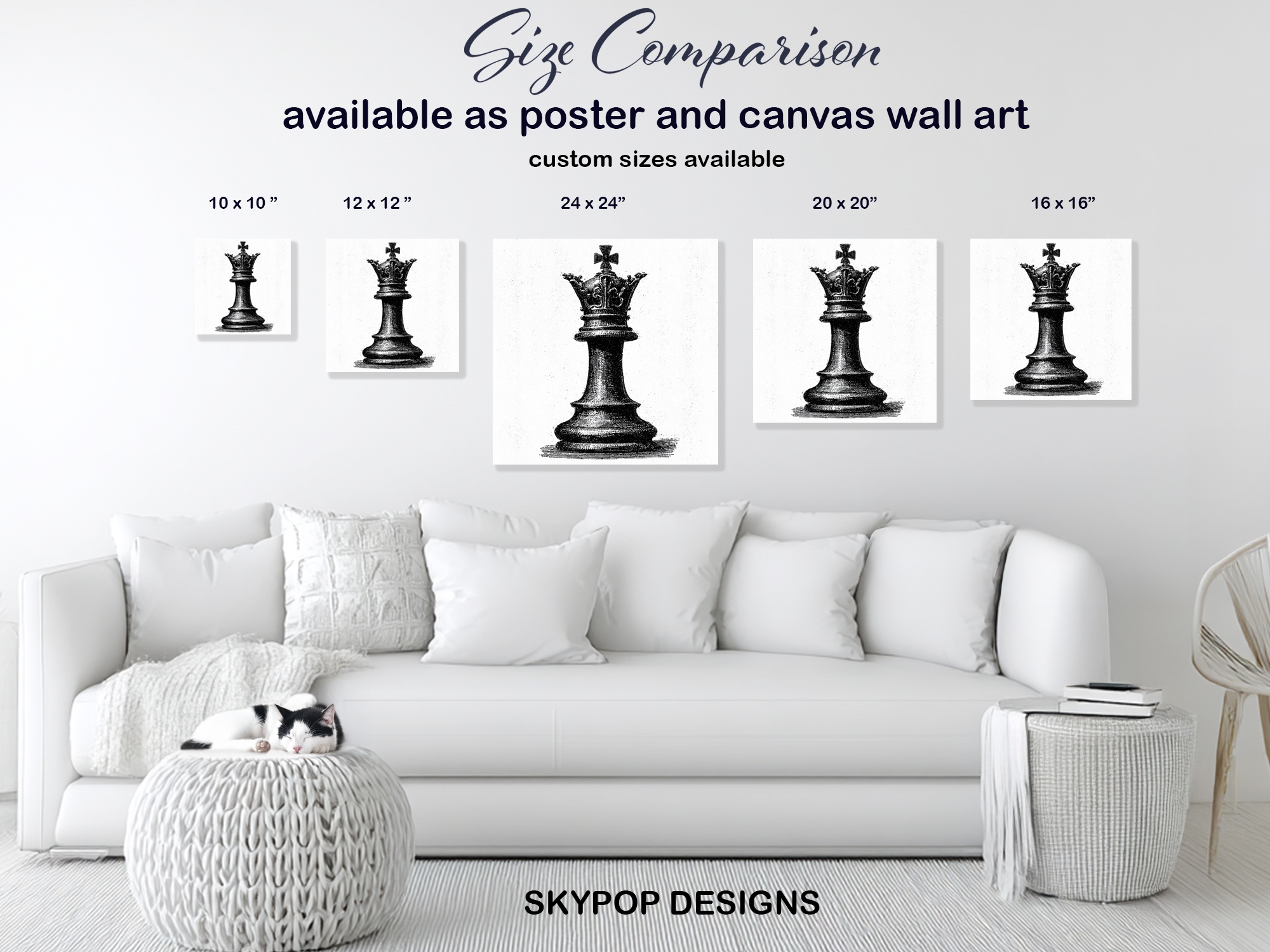 Elevate your space with this striking chess queen canvas wall art, perfect for adding a touch of sophistication to any room. This classic black and white poster showcases the regal queen piece, crowned with an intricate cross, symbolizing strategy and power. Ideal for traditional office decor or as a statement piece in a Victorian-inspired library, this canvas print brings an air of intellect and refinement to your walls. The detailed engraving style captures every nuance of the queen’s ornate design, from the delicate filigree on the crown to the smooth curves of the base. Transform your game room or living area with this timeless chess-themed wall art, celebrating the game’s rich history and enduring appeal. The monochromatic palette with subtle gold accents ensures this piece complements a wide range of color schemes and decor styles. Whether you’re a chess enthusiast or simply appreciate classic design, this versatile artwork serves as a conversation starter and focal point. High-quality printing techniques preserve the intricate lines and textures, making this canvas a lasting addition to your home or office. Perfect as a thoughtful gift for strategy lovers or to enhance your own space, this chess queen art piece adds depth and character to any wall. Embrace the elegance of this traditional game motif and transform your room into a sophisticated retreat today.