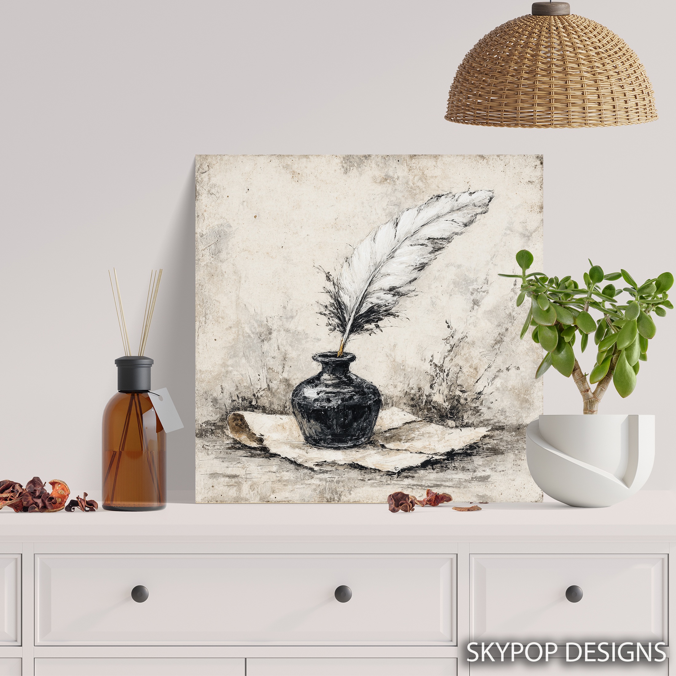Elevate your space with this elegant quill and inkwell canvas wall art, perfect for adding a touch of vintage charm to any room. This striking poster captures the timeless beauty of a white feather quill pen nestled in a classic black inkwell, evoking memories of bygone eras and literary pursuits. Ideal for traditional home offices or rustic living rooms, this canvas art piece brings sophistication and character to your walls. The muted color palette of black, white, and beige creates a versatile artwork that complements a wide range of decor styles. Transform your library or study into a haven of inspiration with this captivating still life composition. The delicate details of the feather quill contrast beautifully with the sturdy inkwell, symbolizing the power of the written word. This canvas wall art makes a thoughtful gift for writers, historians, or anyone who appreciates classic aesthetics. The high-quality printing ensures every brushstroke and texture is faithfully reproduced, bringing depth and interest to your walls. Whether displayed in a cozy reading nook or as a focal point in your bedroom, this artwork adds a sense of timeless elegance to your home. Enhance your space today with this beautiful blend of vintage charm and artistic craftsmanship.
