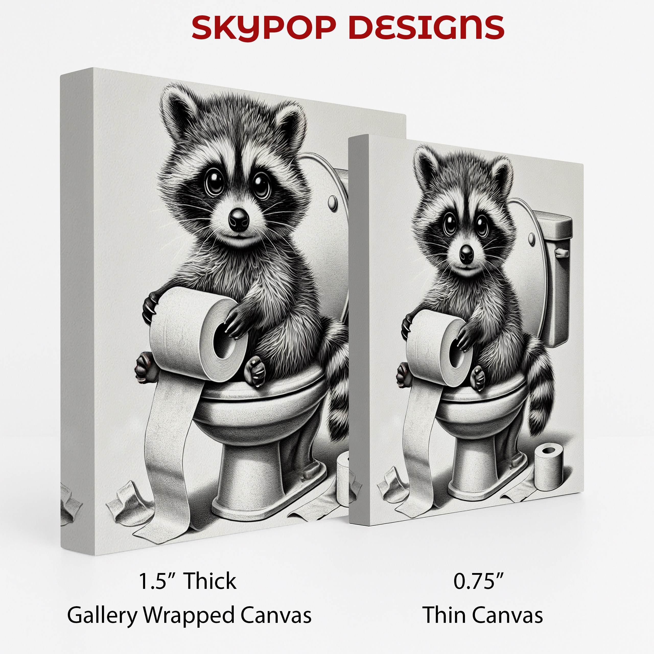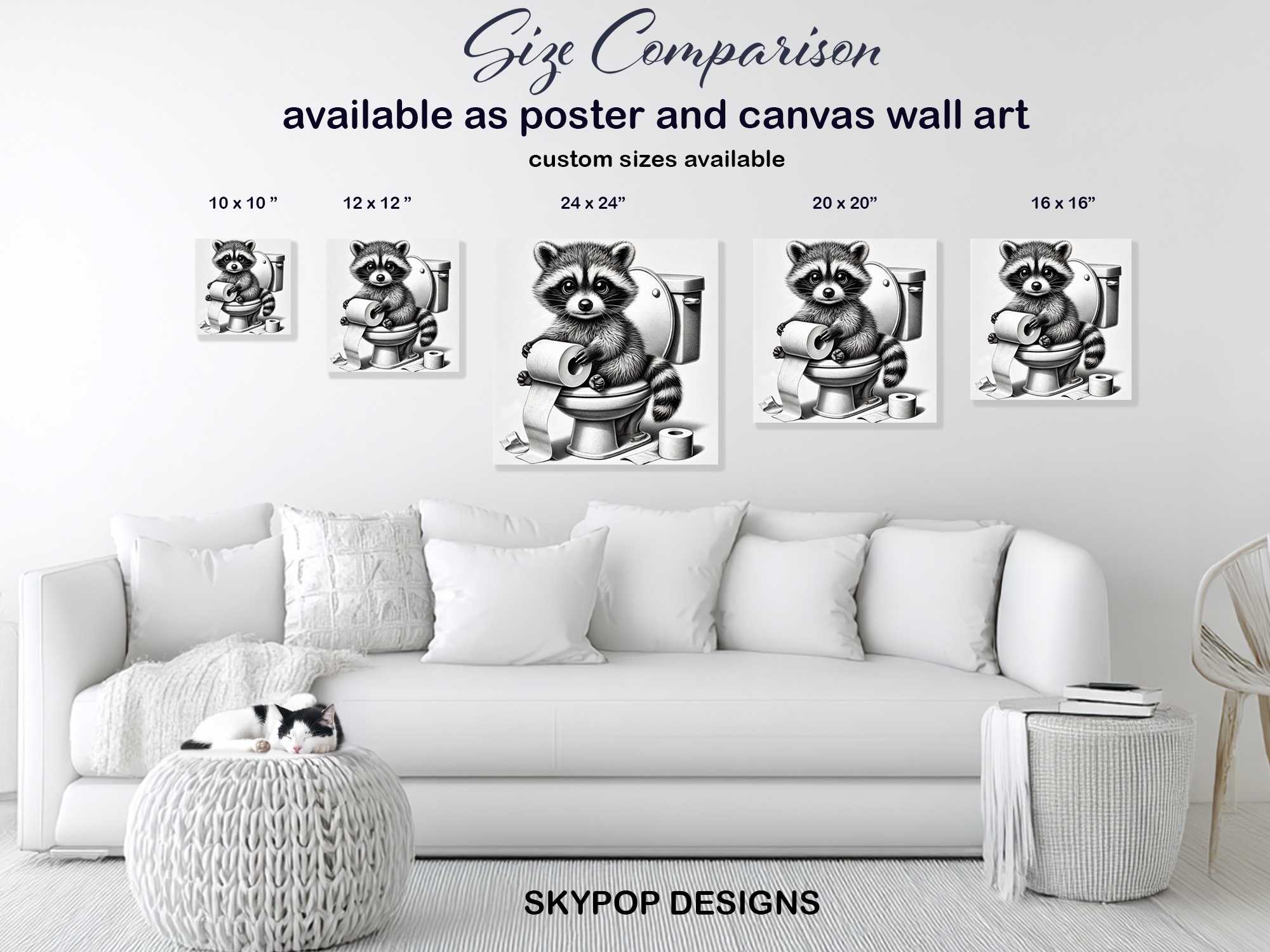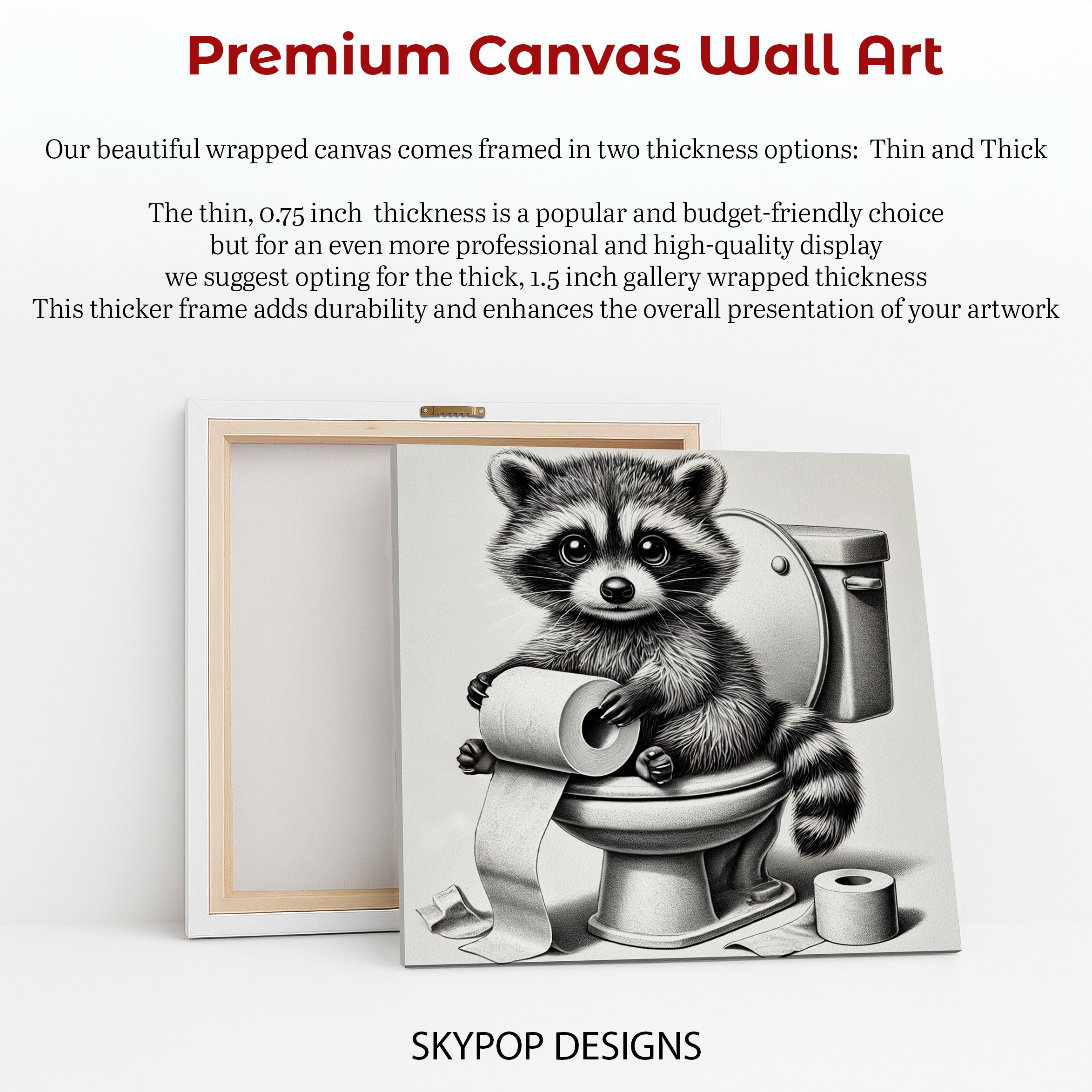 Add a touch of whimsy to your space with this adorable raccoon canvas wall art. This charming poster features a mischievous raccoon perched on a toilet, playfully unrolling toilet paper. Perfect for adding a lighthearted element to your bathroom decor or bringing a smile to your laundry room walls. The striking black and white design with subtle gray tones makes this piece a versatile addition to modern and minimalist interiors. Ideal for animal lovers and those with a sense of humor, this canvas art transforms ordinary spaces into conversation starters. The detailed illustration captures the raccoon’s curious expression and soft fur texture, making it a captivating focal point. Great as a housewarming gift or to spruce up a child’s bathroom, this artwork combines cuteness with practicality. The high-quality print ensures every whisker and toilet paper fold is crisp and clear. Whether displayed in a small powder room or spacious office, this raccoon wall art adds personality and fun to any setting. Elevate your home’s character with this unique blend of animal art and bathroom humor that’s sure to delight guests and family alike. Bring a touch of the wild indoors and make your space more entertaining with this playful raccoon canvas today.