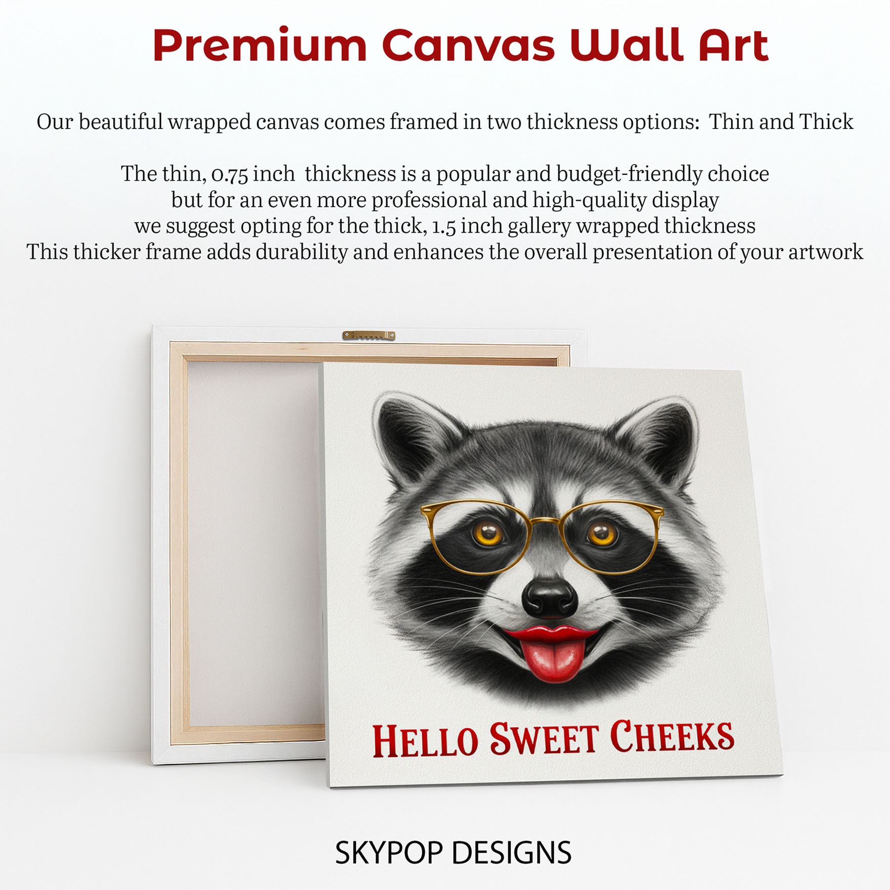 Add a playful touch to your home with this vibrant Raccoon canvas wall art, featuring a cheeky raccoon sporting golden glasses and red lips. This eye-catching poster or canvas wall art is perfect for transforming your living room, bedroom, or office into a fun and engaging space. The striking black and white of the raccoon contrasts beautifully with the pop of red lips and gold accents, creating a captivating visual that sparks conversation and smiles. Ideal for bohemian or contemporary decor styles, this animal art piece adds personality and quirky charm to any room. The bold graphic style of this pop art makes it a standout addition to modern wall decor, offering a fresh take on animal portraits. This canvas wall art is a fantastic way to inject humor and character into your personal space, making it feel more inviting and unique. Whether you’re looking for whimsical wall art or a unique conversation piece, this raccoon artwork delivers. It’s perfect for adding a splash of color and fun to a children’s room or a creative office space. High-quality printing ensures the detail of the raccoon’s fur and the sharp lines of the glasses and lips are rendered flawlessly. This versatile poster or canvas wall art is a great gift for friends, family, or anyone who appreciates a touch of quirky art. Elevate your home decor with this fun and memorable Raccoon canvas wall art that celebrates individuality and joy. Make a statement with this unique animal art and brighten your walls today.