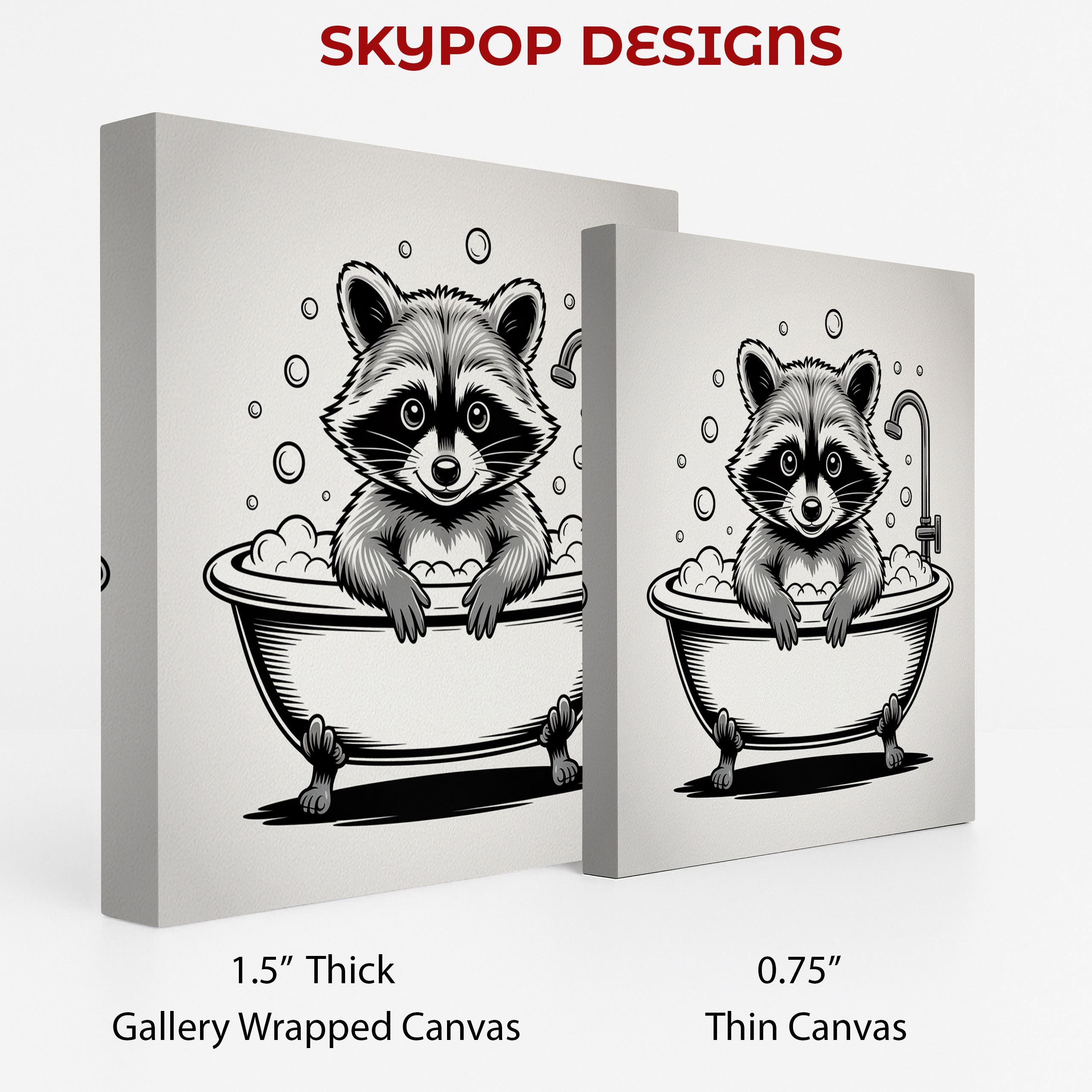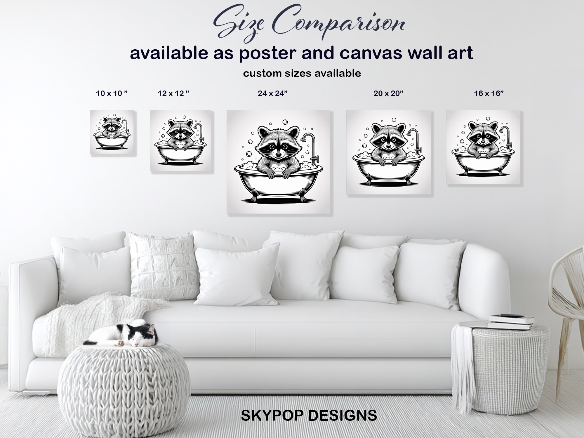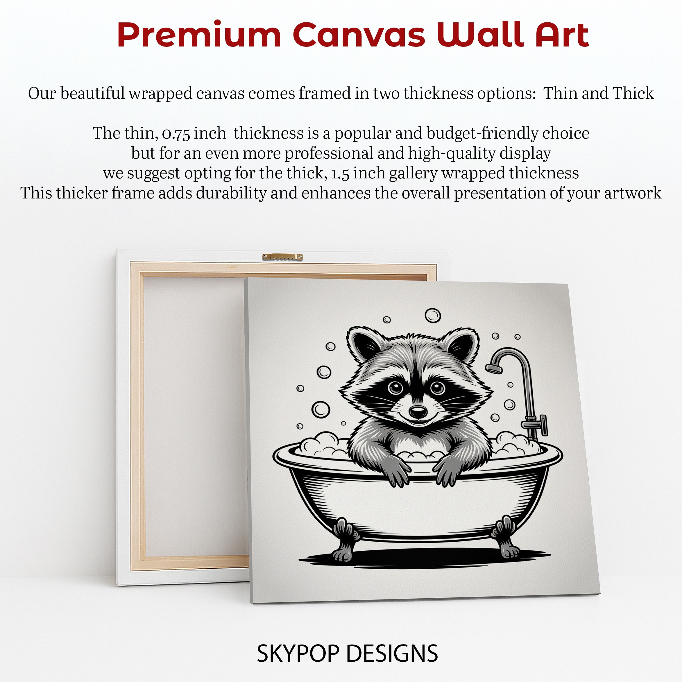 Add a playful touch to your space with this adorable raccoon bath time canvas wall art. This charming poster features a mischievous raccoon enjoying a bubble bath, perfect for adding a whimsical element to your bathroom decor or kids’ room walls. The black and white design with subtle grey tones creates a modern, minimalist look that complements various interior styles. Ideal for Scandinavian-inspired homes, this canvas art brings a touch of nature indoors while maintaining a clean, contemporary aesthetic. The raccoon’s expressive eyes and cute pose capture the heart, making this piece a delightful conversation starter. Transform your laundry room or nursery with this fun and stylish artwork that celebrates the joy of bath time. The high-quality print ensures every detail, from the raccoon’s furry texture to the floating bubbles, is crisp and clear. This versatile wall art works well in small spaces, adding character without overwhelming the room. Whether you’re decorating a new home or refreshing your current decor, this raccoon bath art is sure to bring smiles and warmth to any space. It’s also a perfect gift for animal lovers or new parents looking for unique nursery decor. Elevate your home’s personality with this adorable raccoon artwork that blends cuteness with contemporary design.