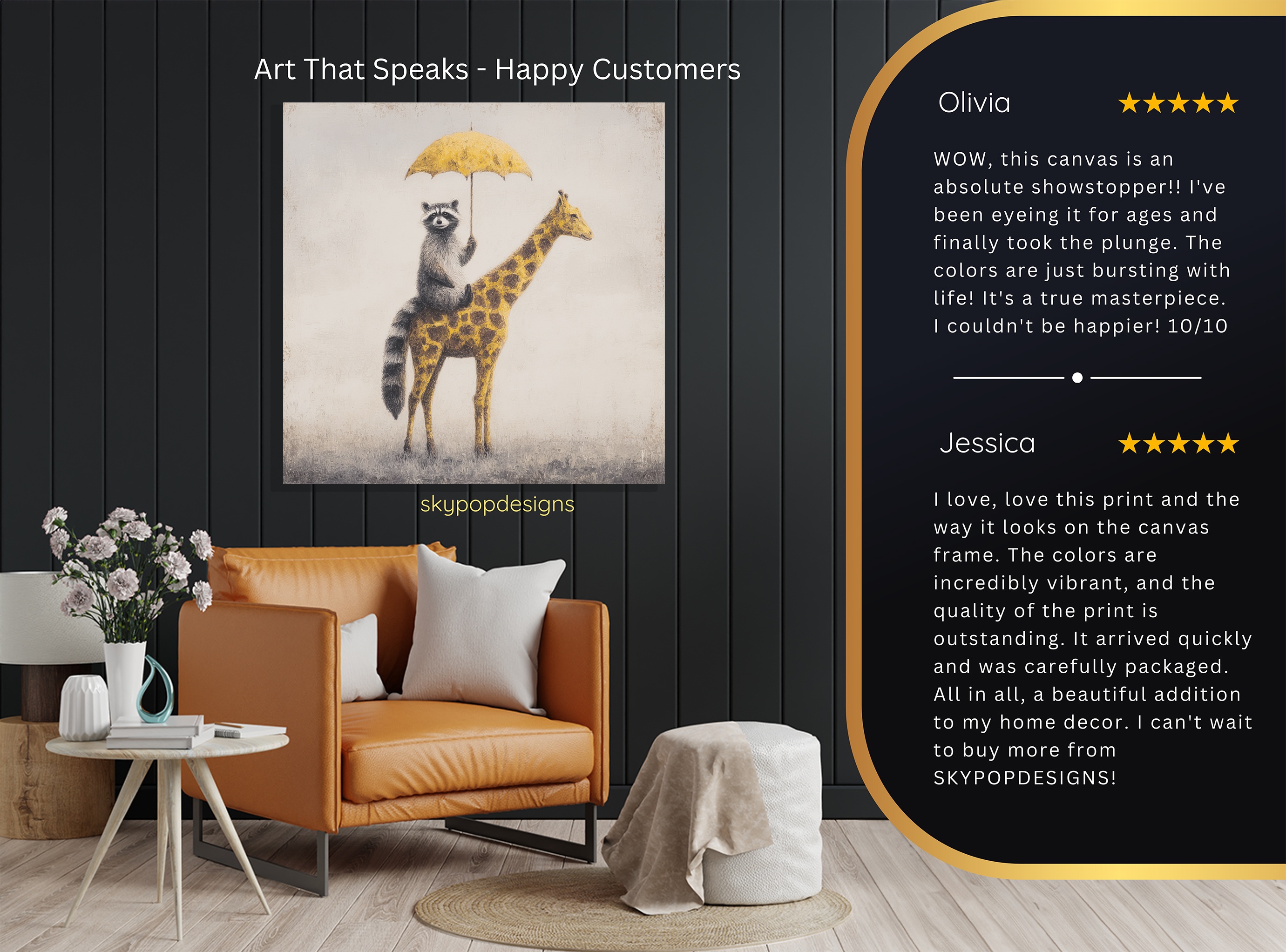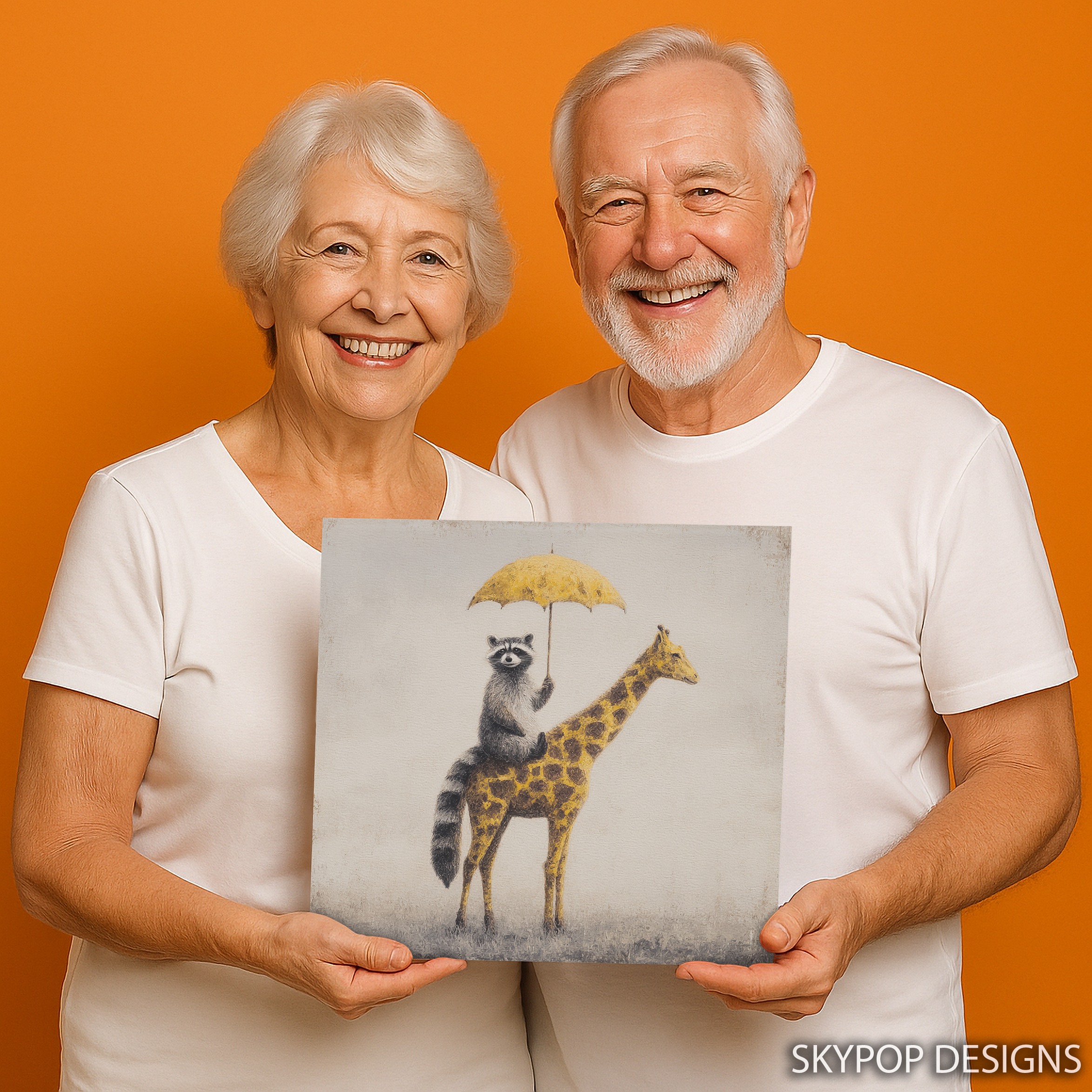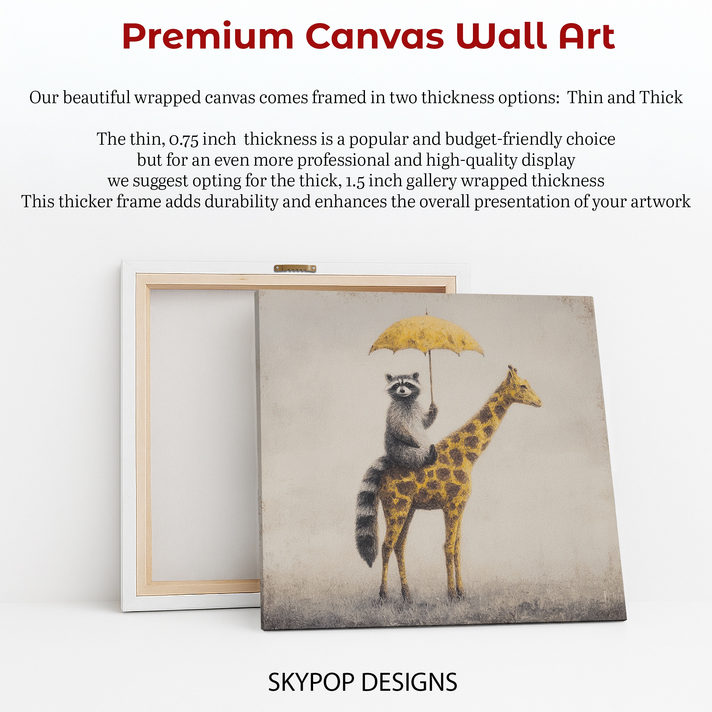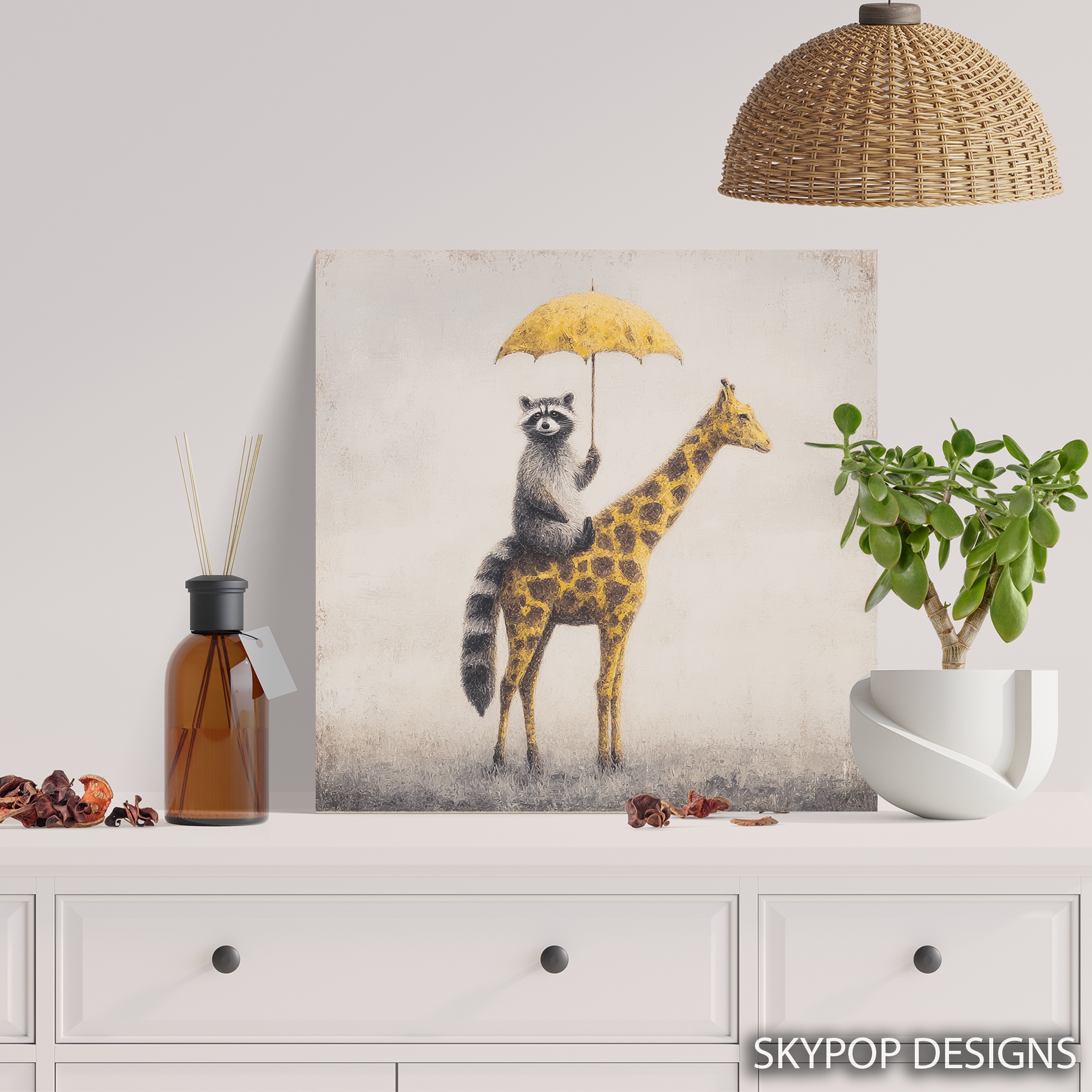 Bring a touch of whimsy to your space with this delightful canvas wall art featuring an unexpected animal duo. This charming poster showcases a clever raccoon perched atop a tall giraffe, holding a bright yellow umbrella. Perfect for modern living room wall decor or as a playful addition to a child’s bedroom, this unique piece sparks joy and imagination. The soft, textured brushstrokes give the artwork a dreamy quality, while the contemporary style keeps it fresh and relevant. Ideal for animal lovers and those with an eclectic taste in home decor, this canvas art effortlessly blends humor with artistic flair. The striking contrast between the grey raccoon, yellow umbrella, and brown giraffe creates a visually appealing composition that draws the eye. Whether you’re looking to add a conversation starter to your office or a whimsical touch to a nursery, this versatile piece fits various interior styles. The artwork’s quirky nature makes it a great gift for birthdays or housewarming parties. Available in multiple sizes, this high-quality canvas print ensures every charming detail is captured. Transform your room with this playful and imaginative animal art that’s sure to bring smiles and spark conversations. Add a dash of creativity to your walls and elevate your space with this unique raccoon and giraffe artwork today!
