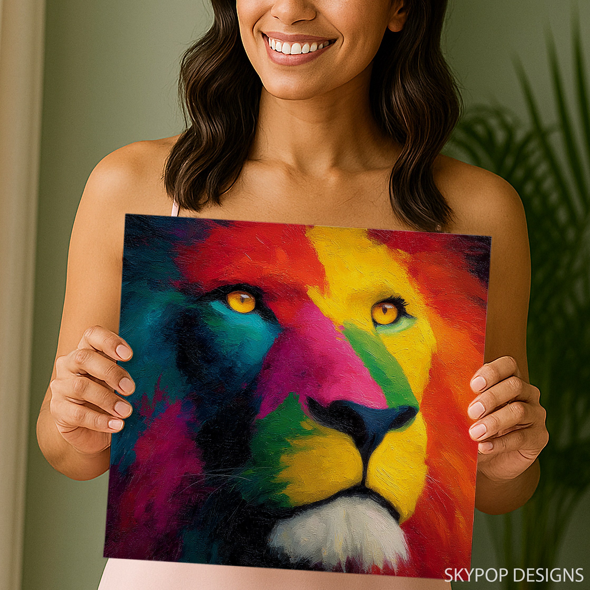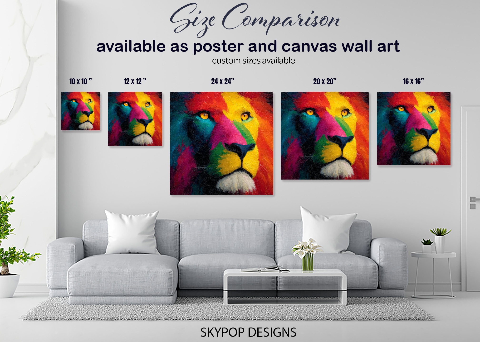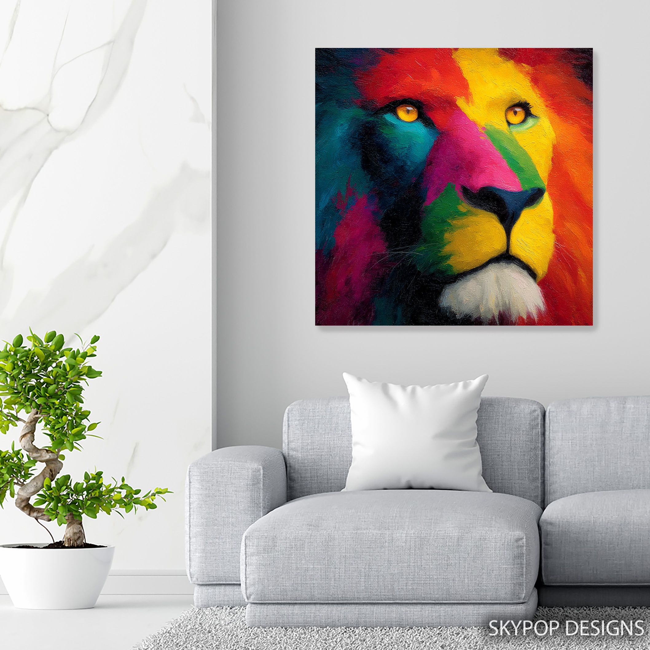 Bring vibrant energy to your space with this striking rainbow lion canvas wall art. This eye-catching poster features a majestic lion’s face composed of bold, colorful brushstrokes that instantly command attention. Perfect for modern living rooms or bohemian bedrooms, this contemporary animal art piece adds a splash of color and personality to any wall. The lion’s piercing yellow eyes draw you in, while the kaleidoscope of reds, blues, and greens creates a mesmerizing effect that sparks creativity and conversation. Ideal for art enthusiasts looking to make a statement, this canvas art transforms plain walls into captivating focal points. The abstract style blends seamlessly with minimalist decor, adding depth and character without overwhelming the space. Whether displayed in a home office for inspiration or in a dining room for a touch of whimsy, this versatile artwork adapts to various interior styles. The high-quality printing captures every vibrant hue and textured brushstroke, ensuring this lion wall art remains a stunning centerpiece for years to come. Gift this unique piece to animal lovers or those who appreciate bold, contemporary design. Elevate your home decor with this powerful and playful lion canvas that celebrates color, strength, and artistic expression. Make a lasting impression and transform your room with this eye-catching rainbow lion art today.