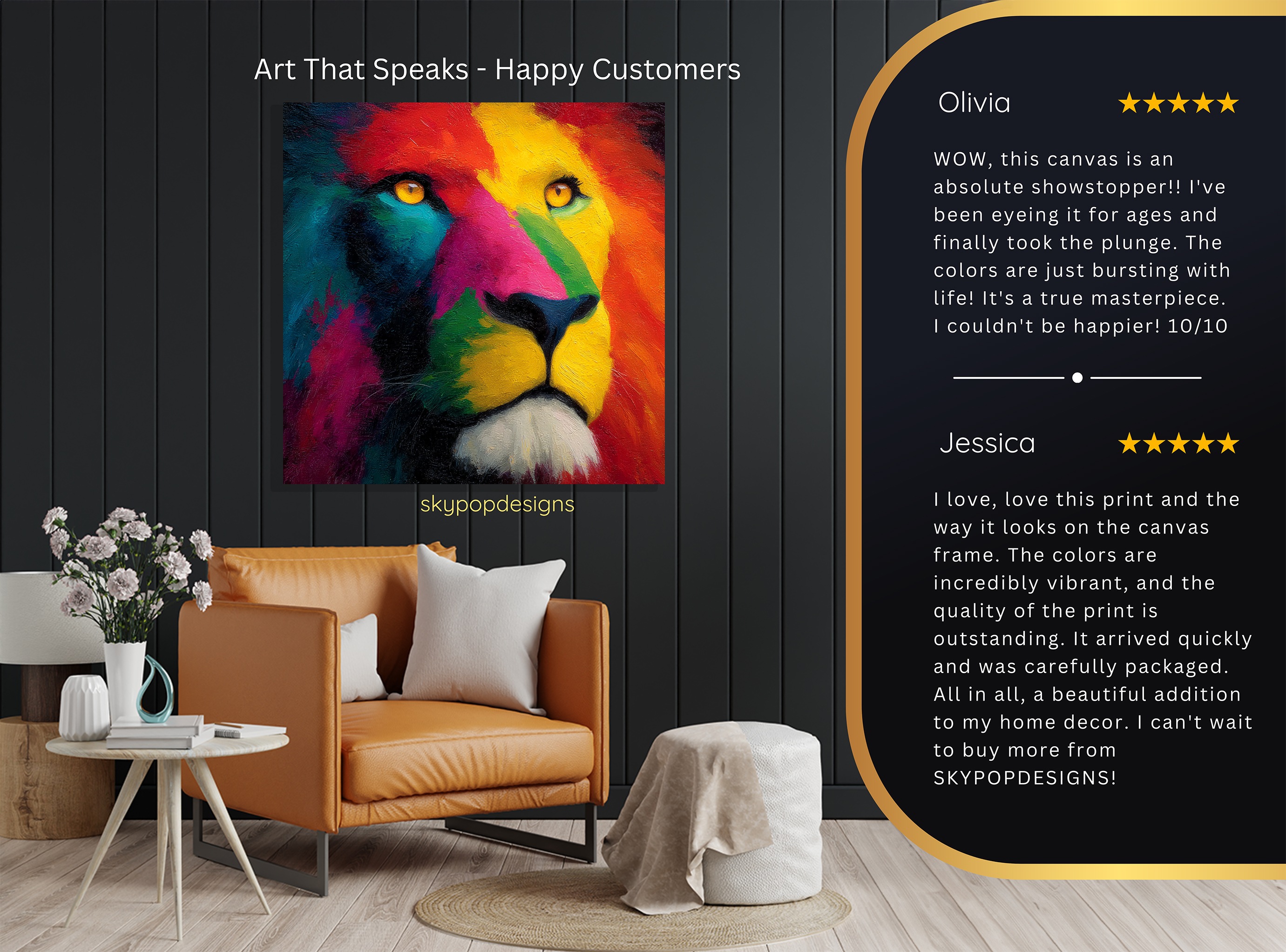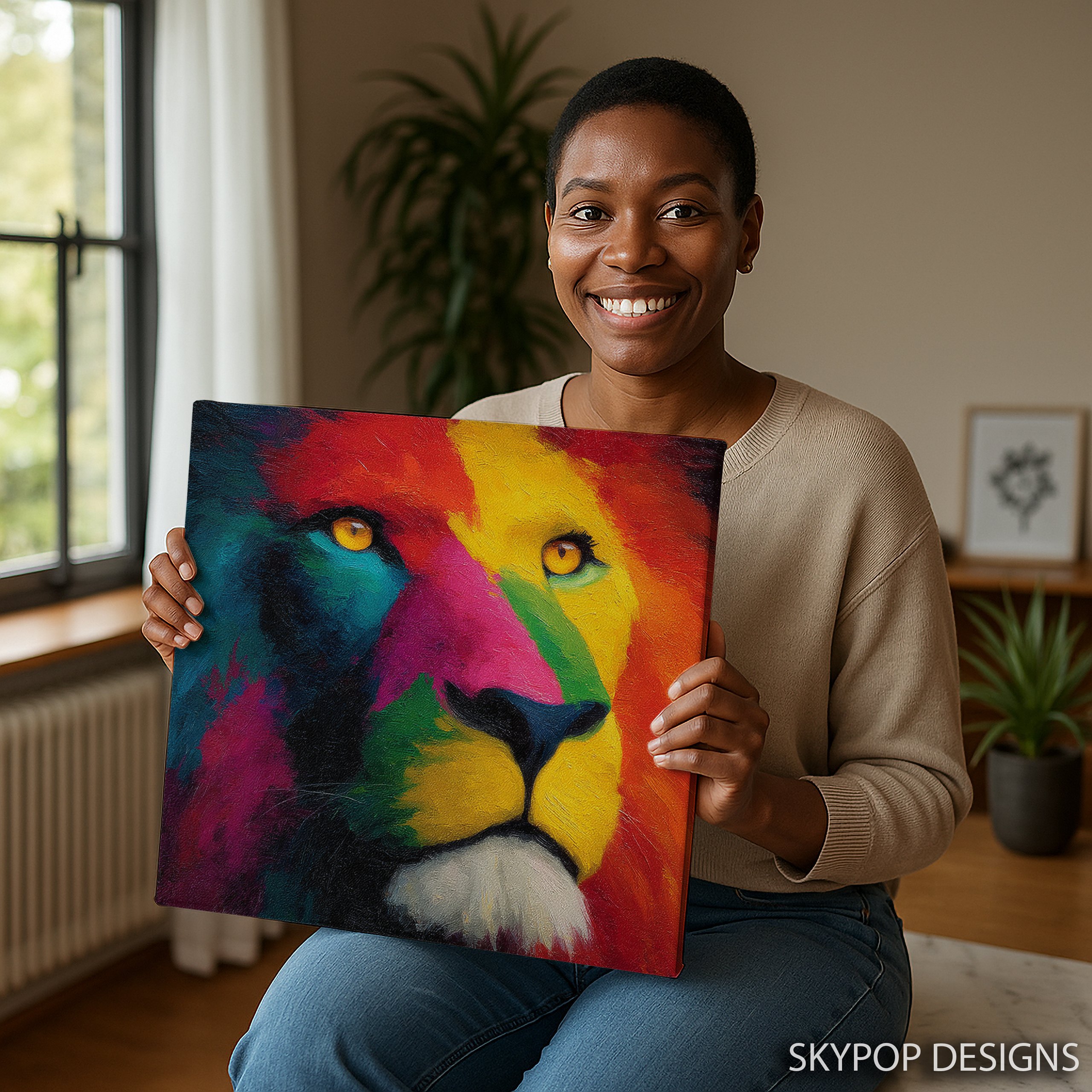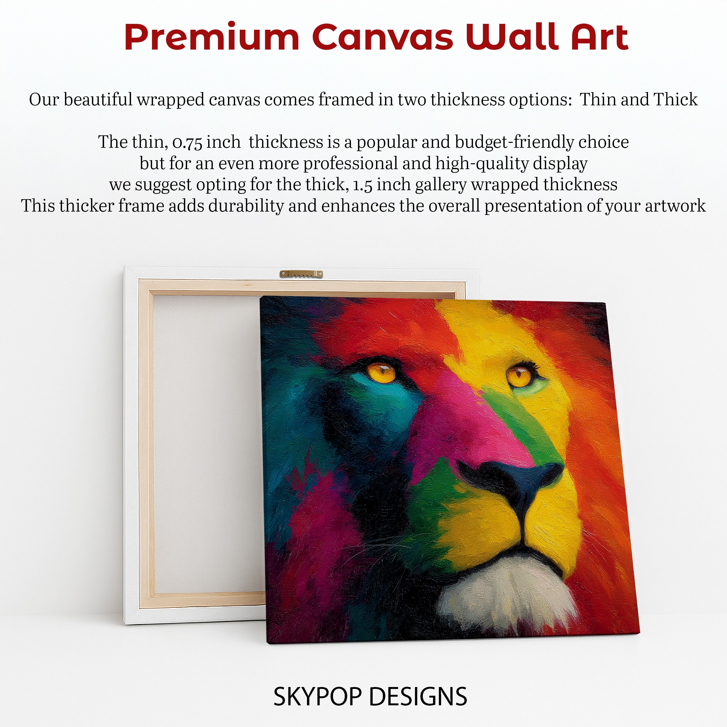Bring vibrant energy to your space with this striking rainbow lion canvas wall art. This eye-catching poster features a majestic lion’s face composed of bold, colorful brushstrokes that instantly command attention. Perfect for modern living rooms or bohemian bedrooms, this contemporary animal art piece adds a splash of color and personality to any wall. The lion’s piercing yellow eyes draw you in, while the kaleidoscope of reds, blues, and greens creates a mesmerizing effect that sparks creativity and conversation. Ideal for art enthusiasts looking to make a statement, this canvas art transforms plain walls into captivating focal points. The abstract style blends seamlessly with minimalist decor, adding depth and character without overwhelming the space. Whether displayed in a home office for inspiration or in a dining room for a touch of whimsy, this versatile artwork adapts to various interior styles. The high-quality printing captures every vibrant hue and textured brushstroke, ensuring this lion wall art remains a stunning centerpiece for years to come. Gift this unique piece to animal lovers or those who appreciate bold, contemporary design. Elevate your home decor with this powerful and playful lion canvas that celebrates color, strength, and artistic expression. Make a lasting impression and transform your room with this eye-catching rainbow lion art today.