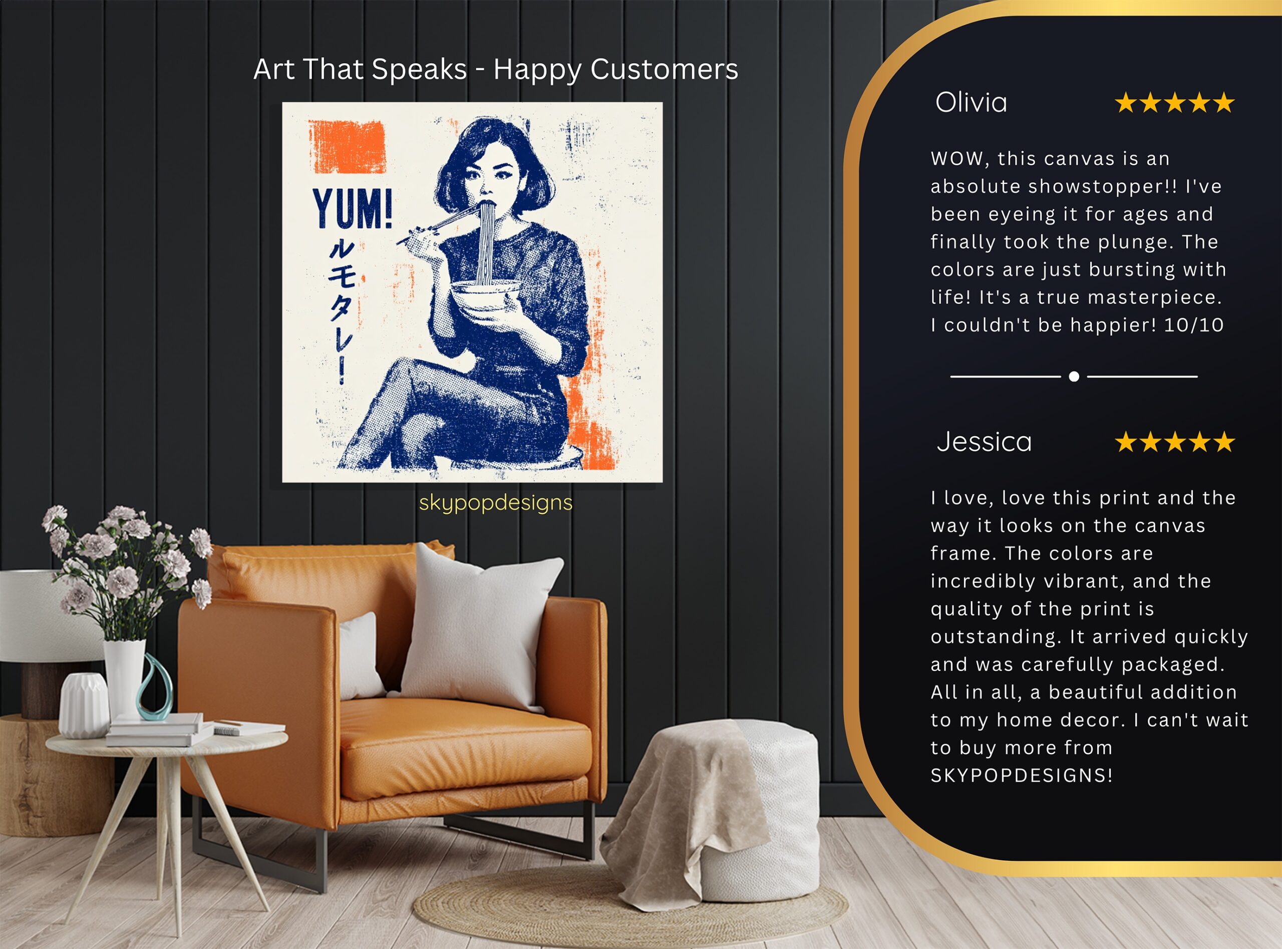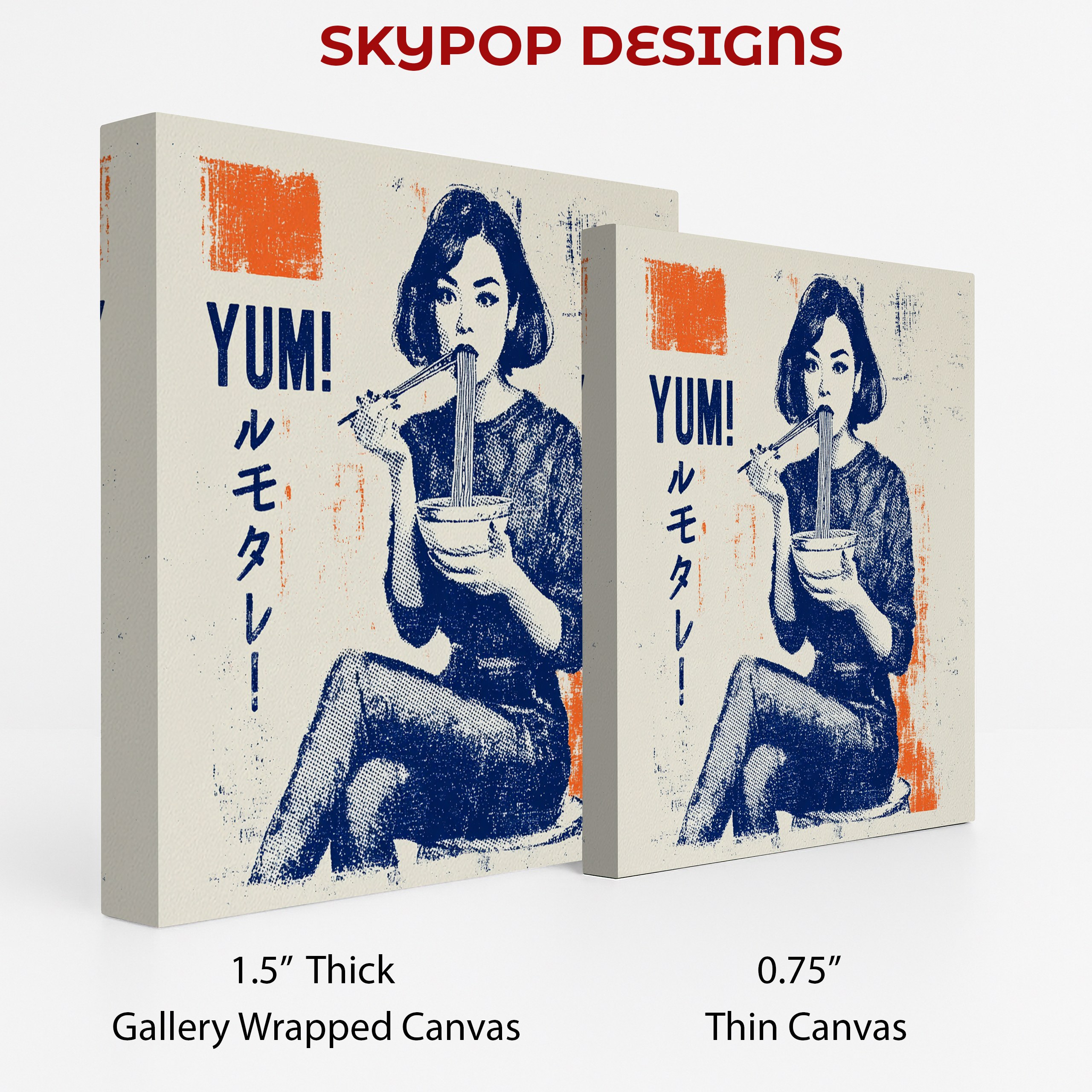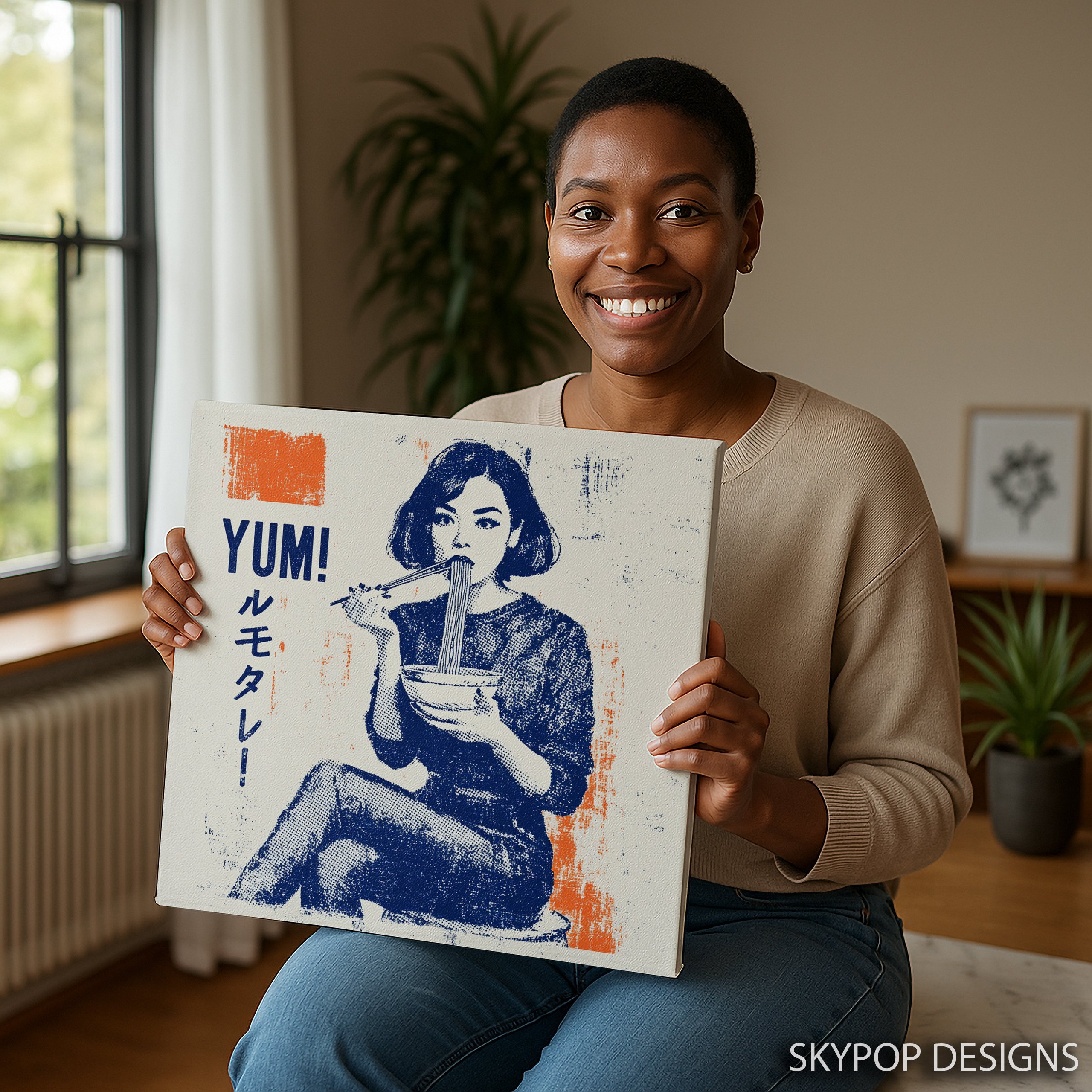 Elevate your space with this eye-catching ramen noodle canvas wall art that brings a splash of retro-cool to any room. The striking blue and orange color palette instantly draws the eye, making this poster a standout piece for contemporary kitchens or dining areas. Perfect for food lovers and Asian cuisine enthusiasts, this canvas art celebrates the beloved comfort food with a stylish twist. The vintage-inspired illustration features a woman enjoying a hearty bowl of ramen, capturing the essence of mid-century modern design. This versatile wall art works beautifully in modern living rooms, adding a pop of personality and conversation-starting appeal. The bold “YUM!” text and Japanese characters add authenticity and visual interest, making it ideal for those who appreciate Asian-inspired decor. Whether you’re creating a funky kitchen gallery wall or looking for unique office decor, this ramen-themed artwork delivers. The high-quality printing ensures vibrant colors and crisp details, bringing the retro aesthetic to life. Gift this canvas to the noodle aficionado in your life or use it to inject some fun into your own space. With its blend of vintage charm and contemporary appeal, this ramen art poster is sure to satisfy your craving for stylish, food-themed wall decor. Transform your room with this delicious slice of pop art today!